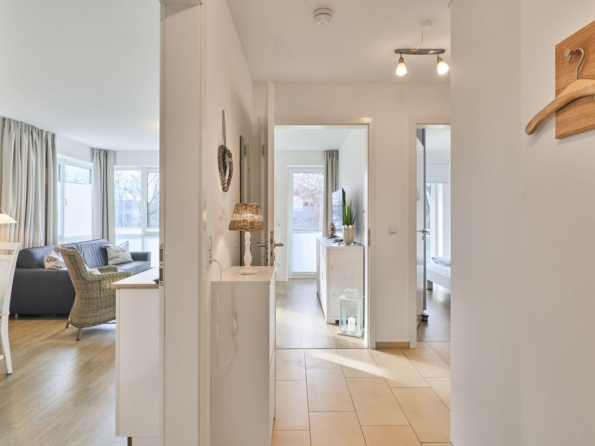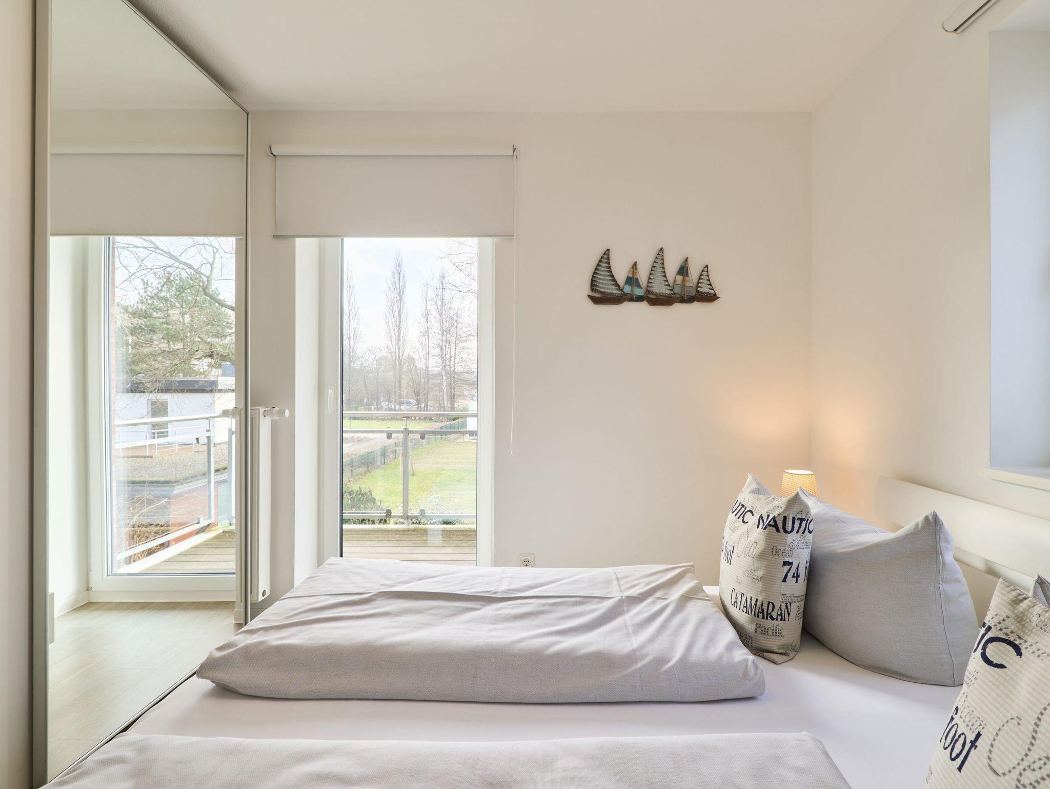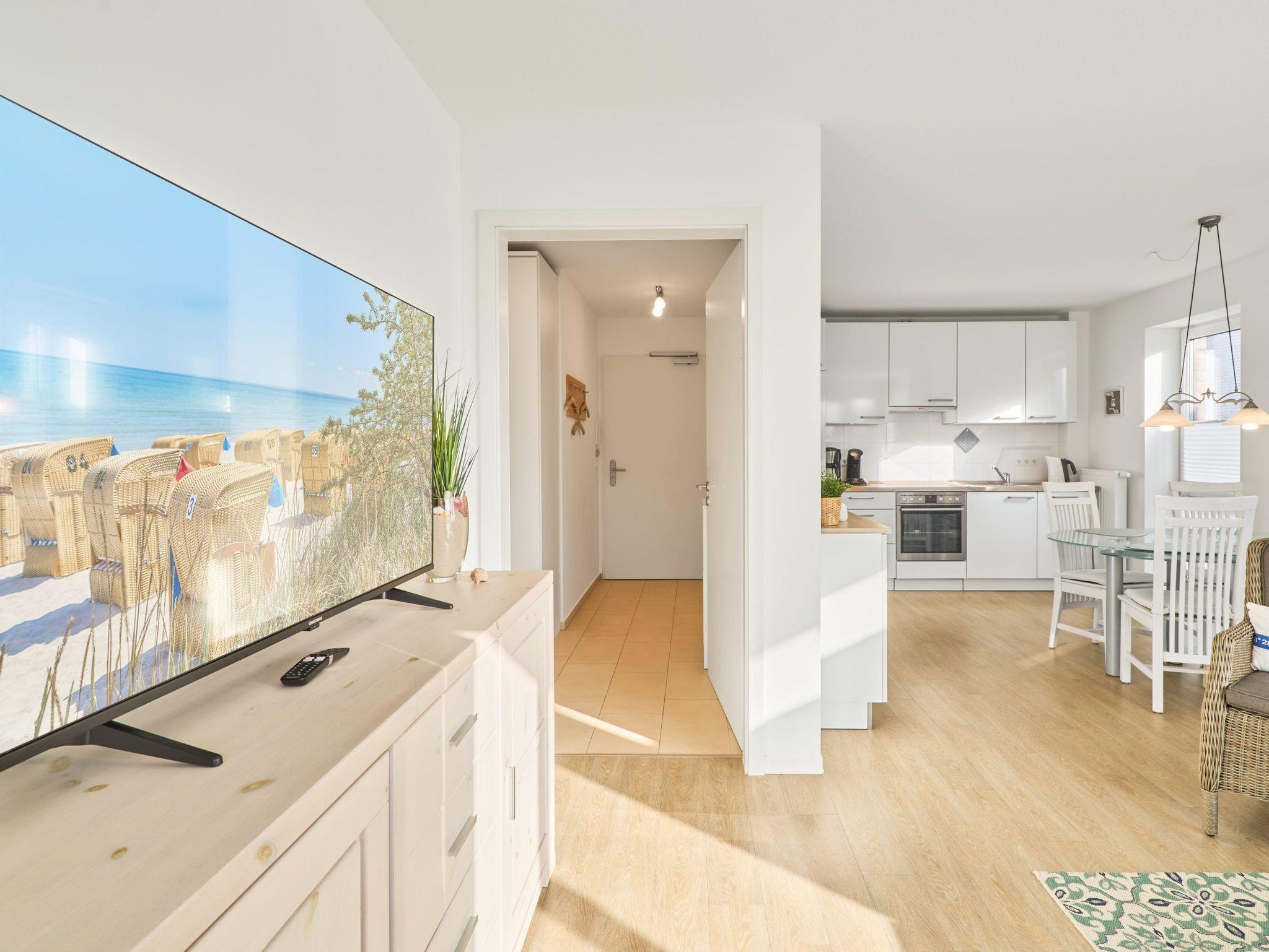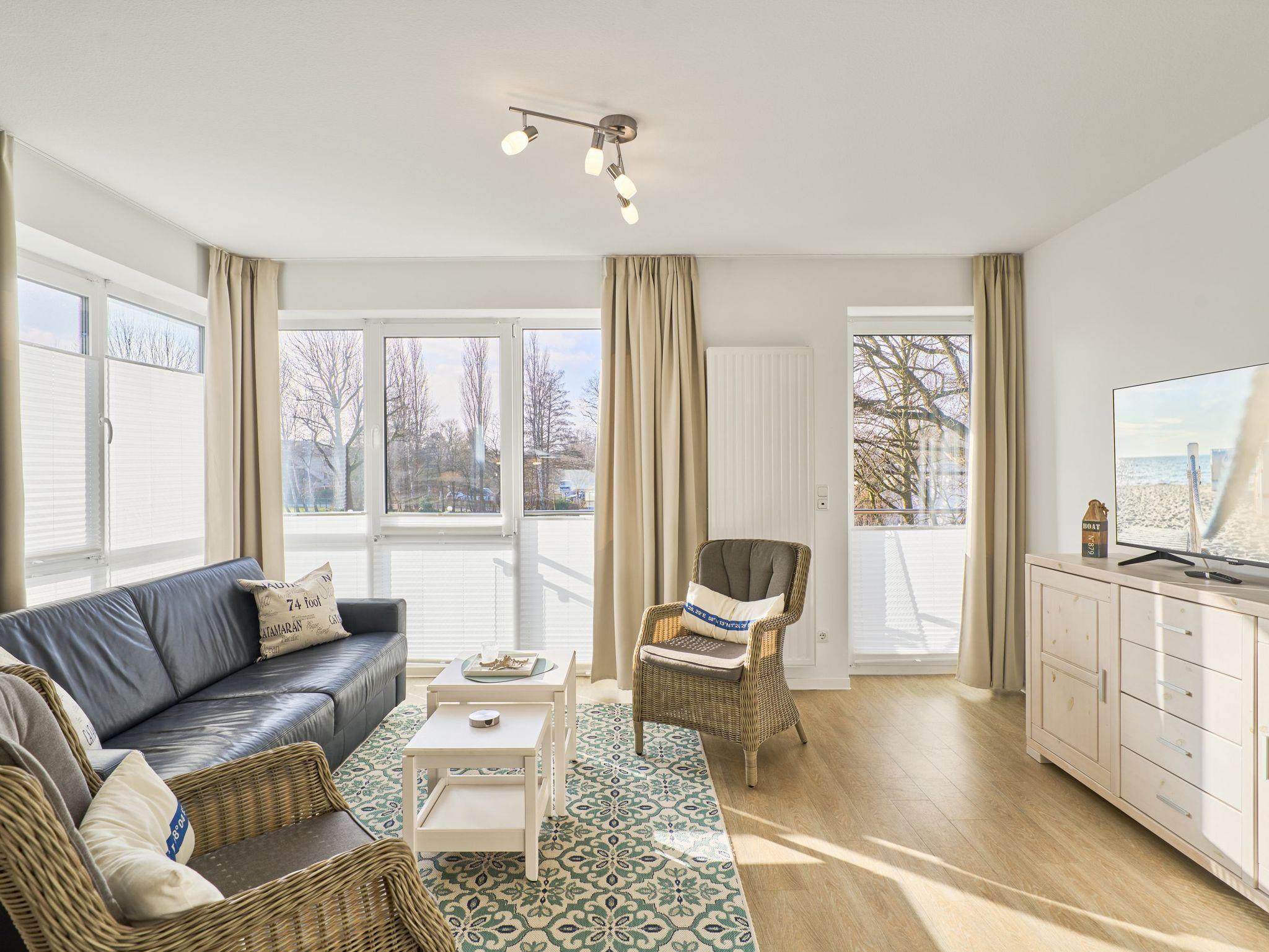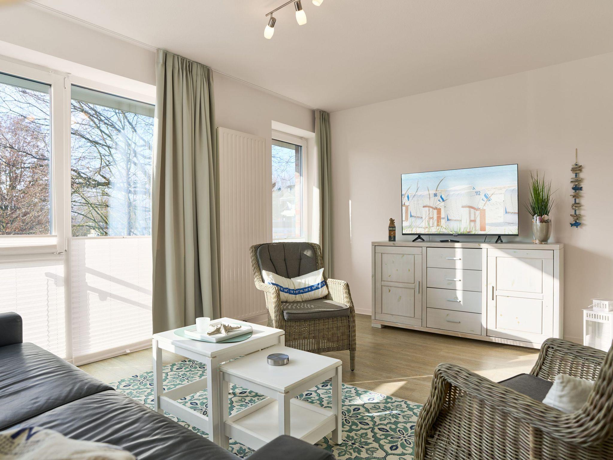 Die Ferienwohnung verzaubert mit ihrem, im maritimen Stil gehaltenen, Wohnzimmer und ist mit hochwertigen Möbeln eingerichtet. Es erwarten Sie dort eine bequeme Couch, 2 Sessel und ein Sat-Flachbildschirmfernseher. Die moderne, offene Küche ist voll ausgestattet und perfekt in den Wohnraum integriert. Ihnen stehen eine Filterkaffeemaschine, eine Senseo-Kaffeepadmaschine, ein Wasserkocher sowie ein Toaster zur Verfügung. Zudem verfügt die Küche über ein Cerankochfeld, einen Backofen und einen Geschirrspüler. Der Essbereich bietet ausreichend Platz für ein ausgiebiges Frühstück oder einen gemütlichen Spieleabend. Das helle Schlafzimmer ist mit einem Doppelbett (1,80 × 2,00 m) und einem großen Kleiderschrank ausgestattet und hat direkten Zugang zu dem Balkon.