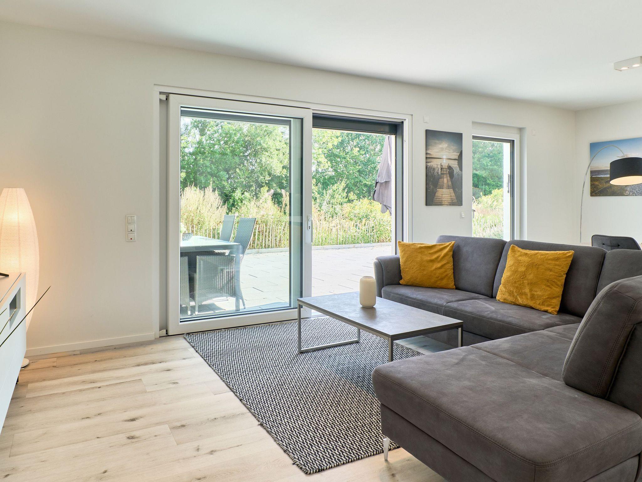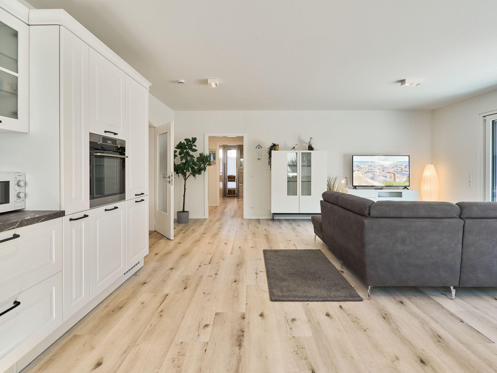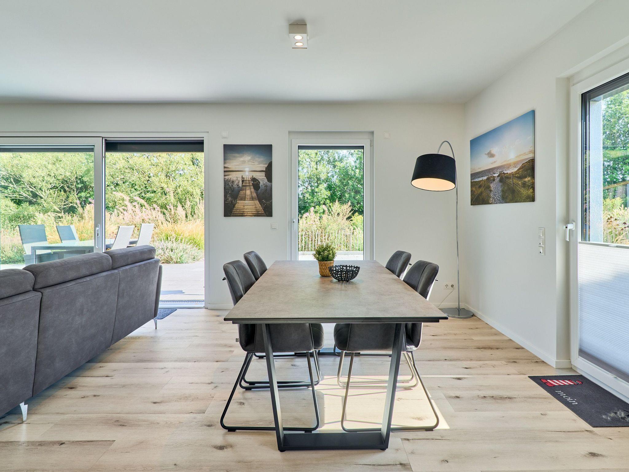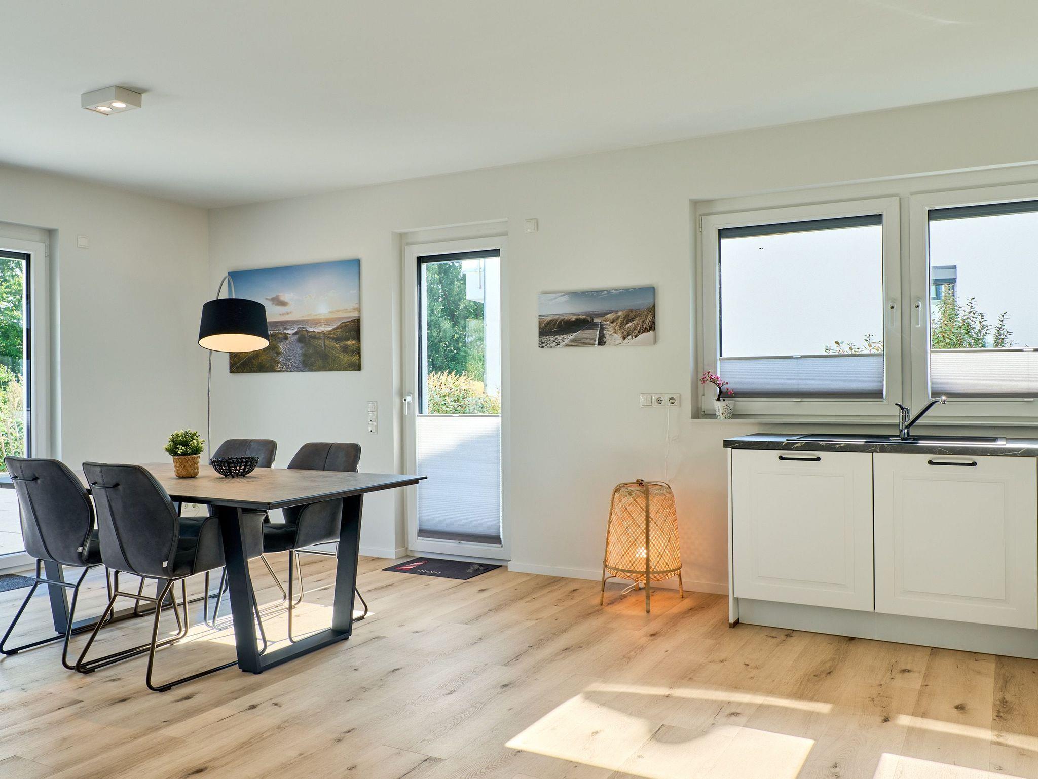 Das große Wohnzimmer mit integrierter Küchenzeile, einem Esstisch ( Platz für 6 Personen ) sowie einem Wohlfühlwohnbereich. [nbsp] Rollläden
