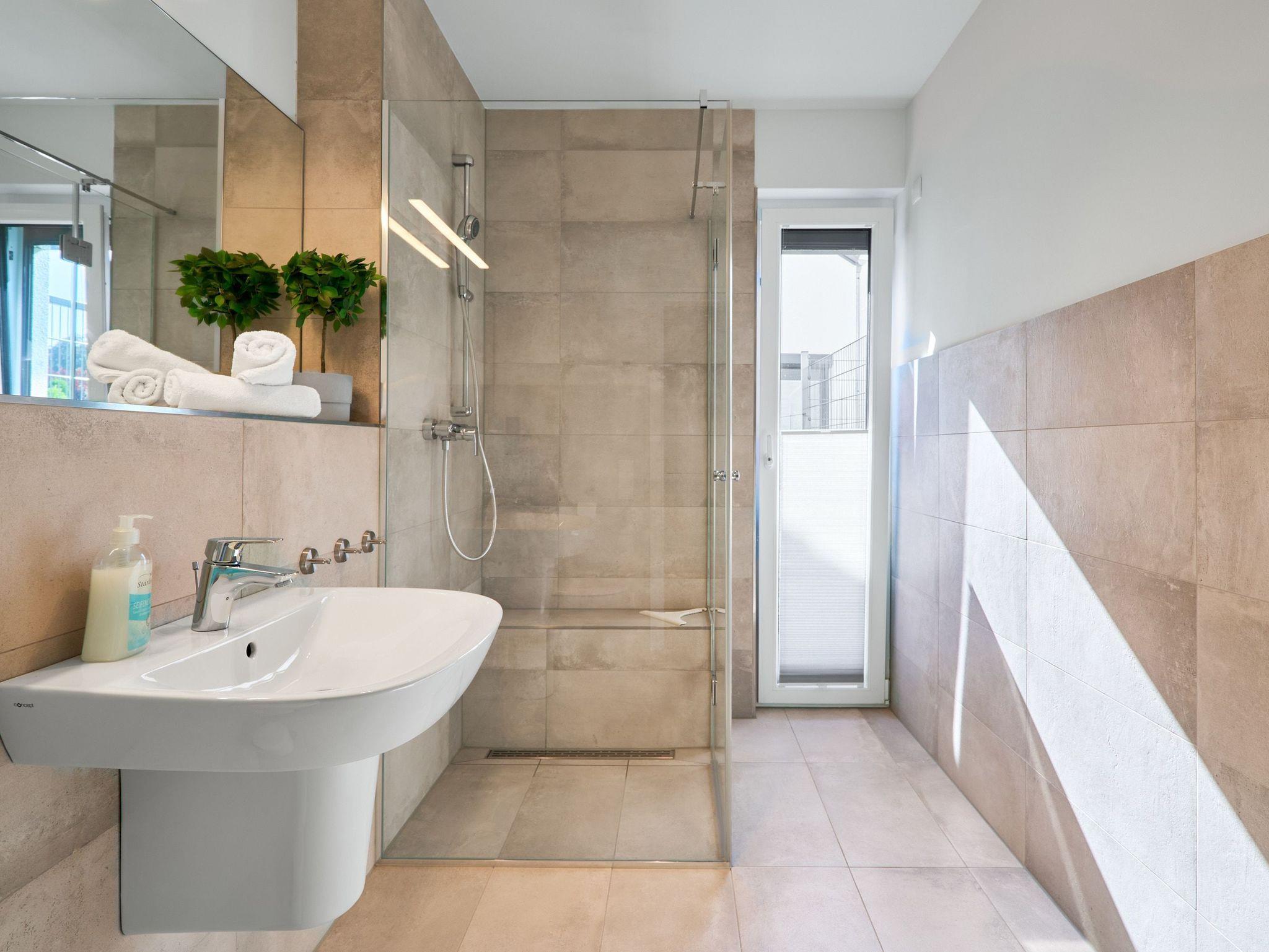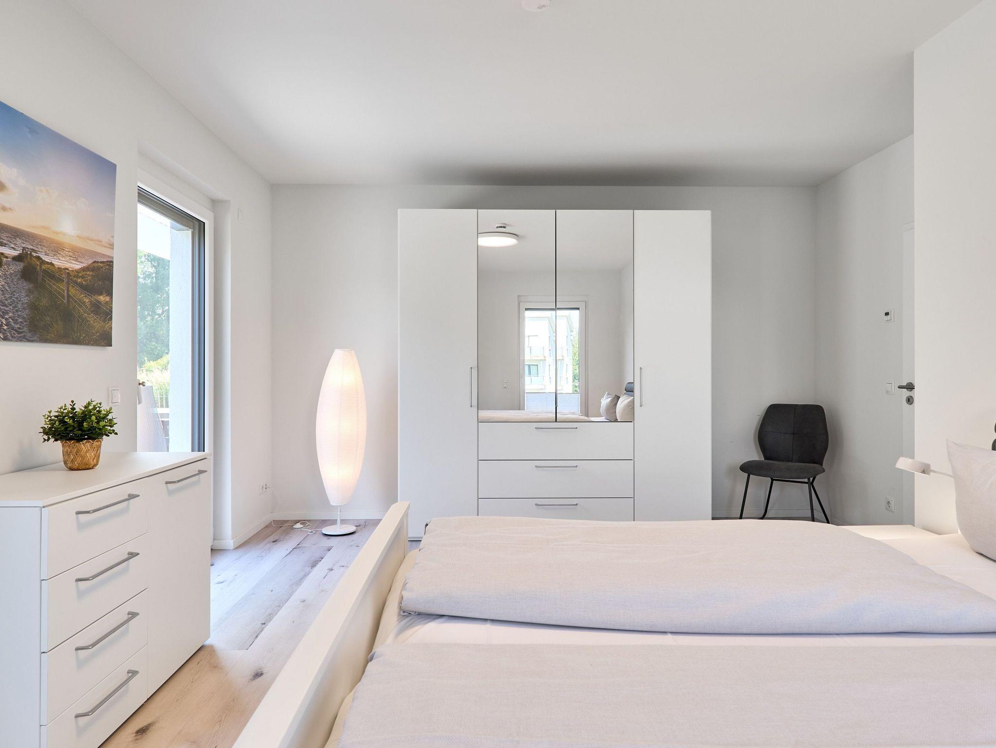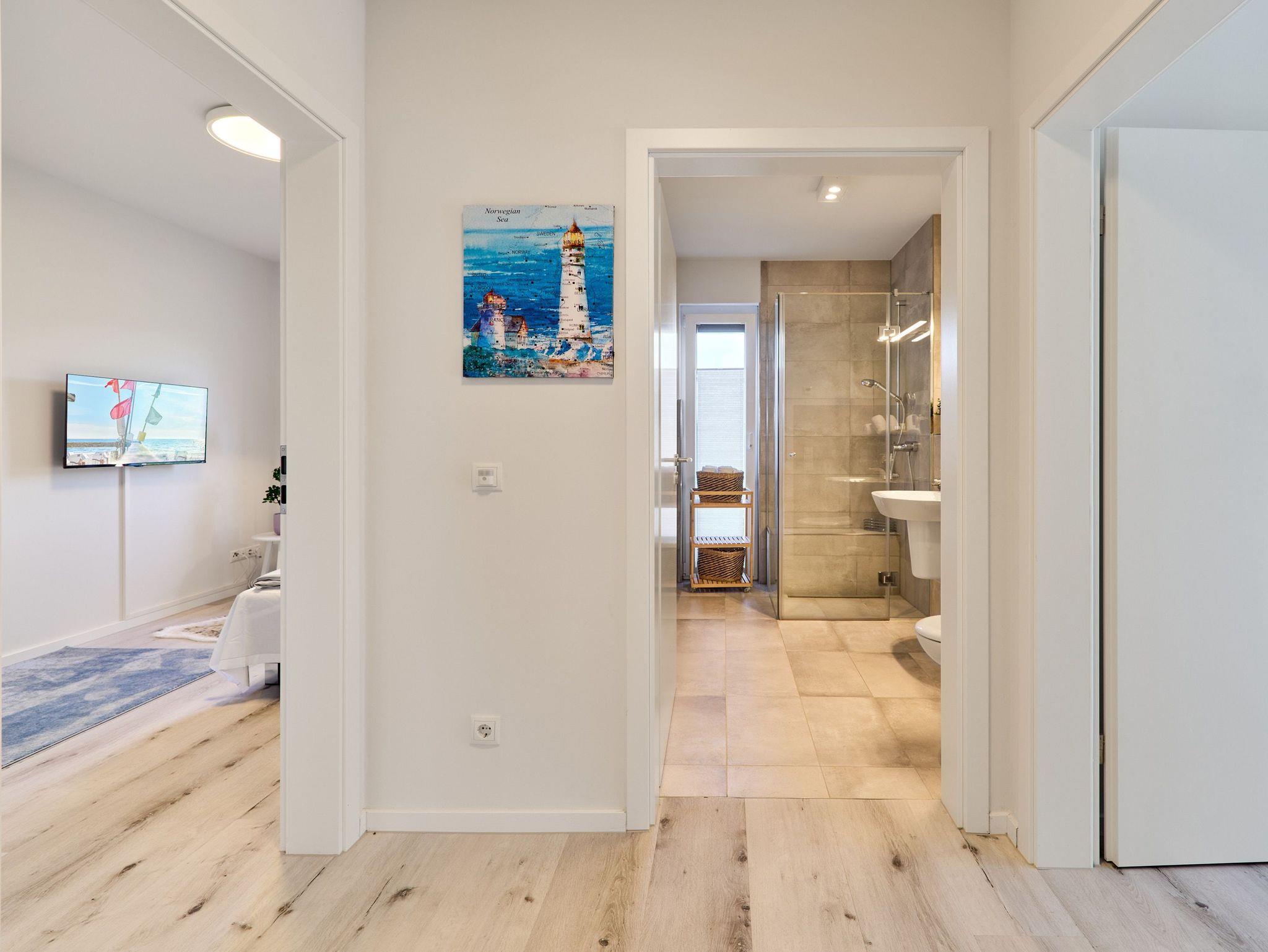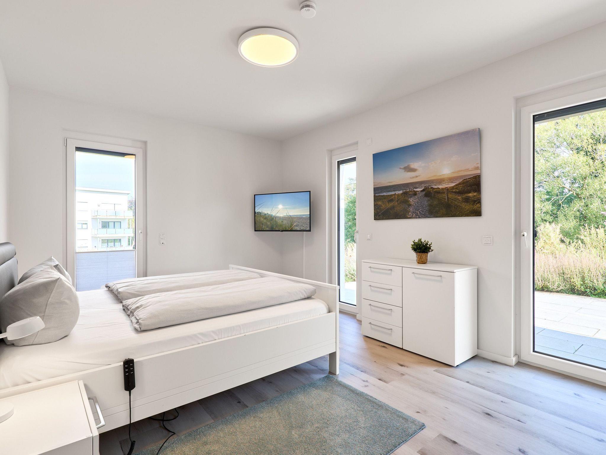Genießen Sie Ihren Urlaub in dieser lichtdurchfluteten Ferienwohnung. Das Elternschlafzimmer ist geräumig und mit einem Doppelbett (Einzelmatratzen) mit verstellbarem Kopf- und Fußteil, zwei Nachttischen, einem Kleiderschrank und einem TV ausgestattet. Außenrollläden. 2 Tageslichtbäder mit bodengleicher Dusche.