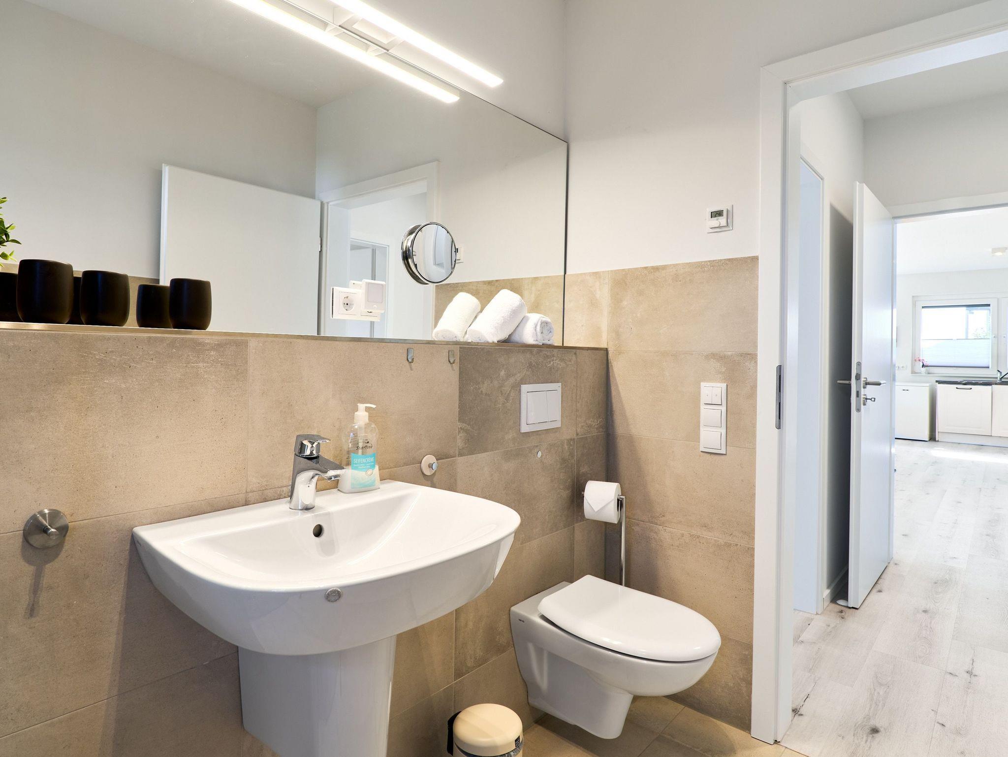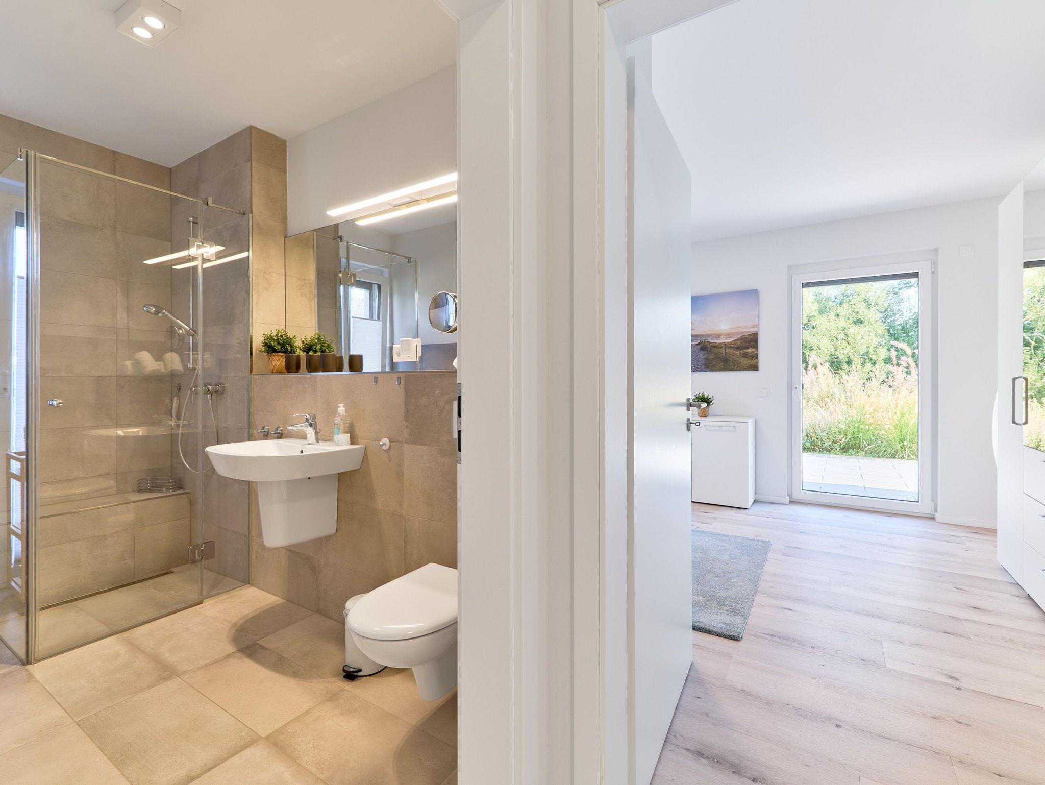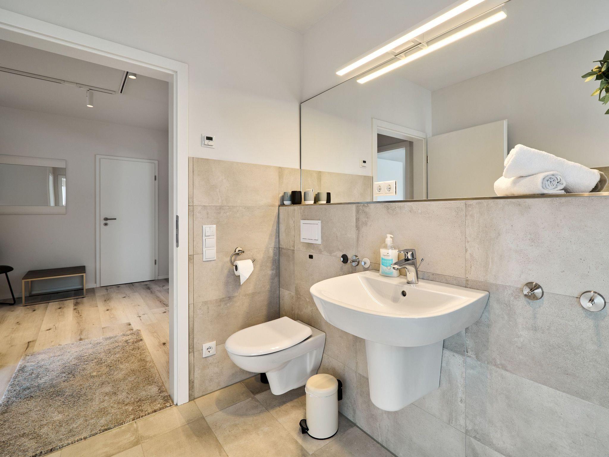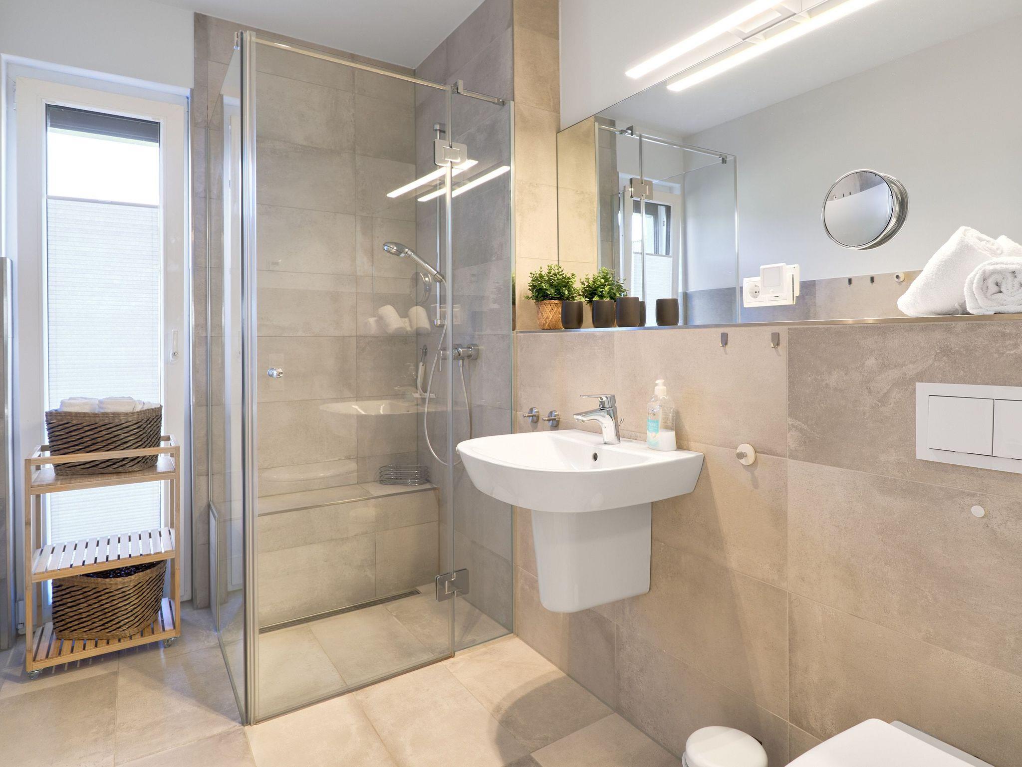Genießen Sie Ihren Urlaub in dieser lichtdurchfluteten Ferienwohnung. Das Elternschlafzimmer ist geräumig und mit einem Doppelbett (Einzelmatratzen) mit verstellbarem Kopf- und Fußteil, zwei Nachttischen, einem Kleiderschrank und einem TV ausgestattet. Außenrollläden. 2 Tageslichtbäder mit bodengleicher Dusche.