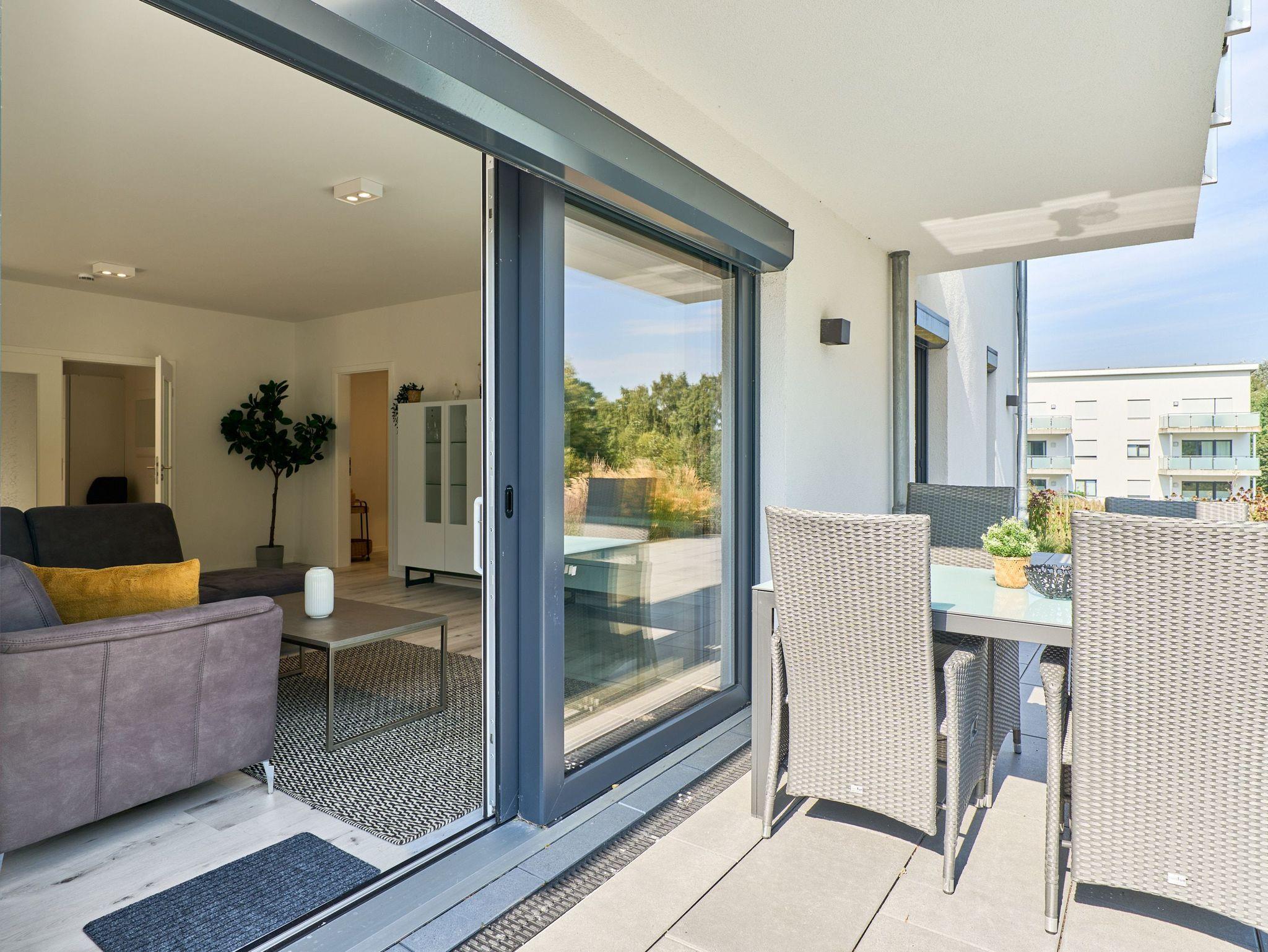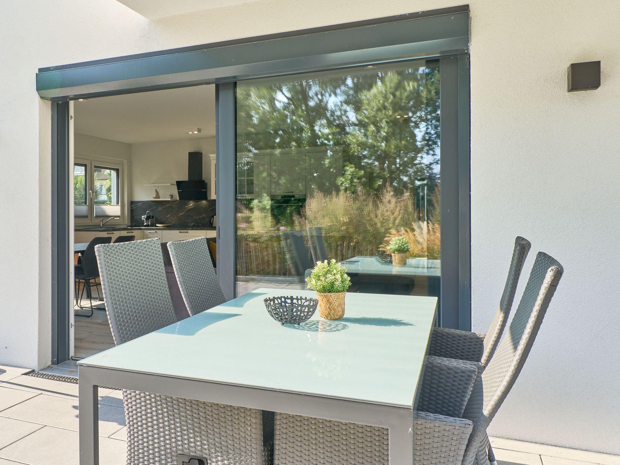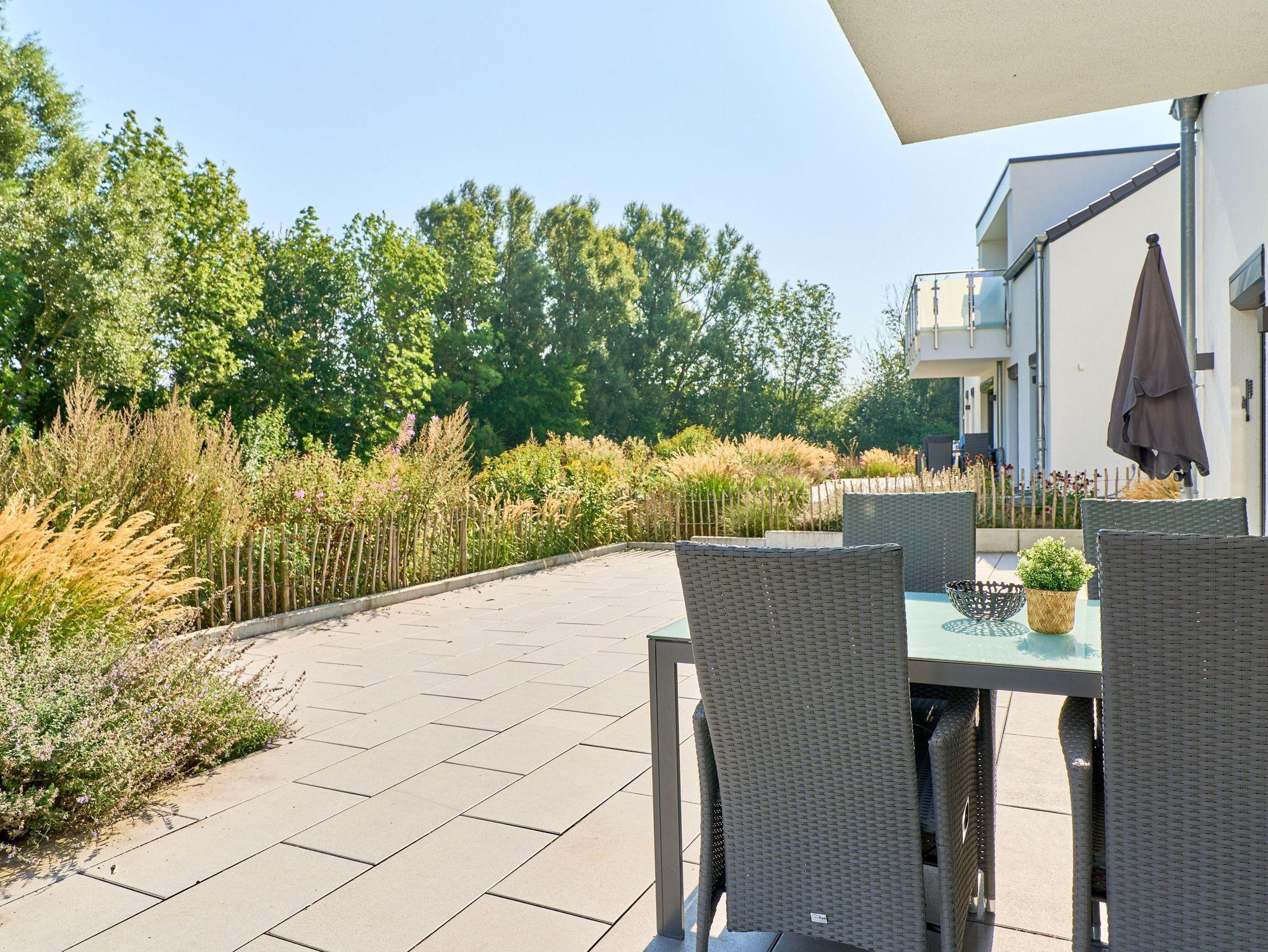 Auf der eingezäunten, großen Terrasse stehen Ihnen Tisch und Stühle zur Verfügung, Blick ins Grüne.