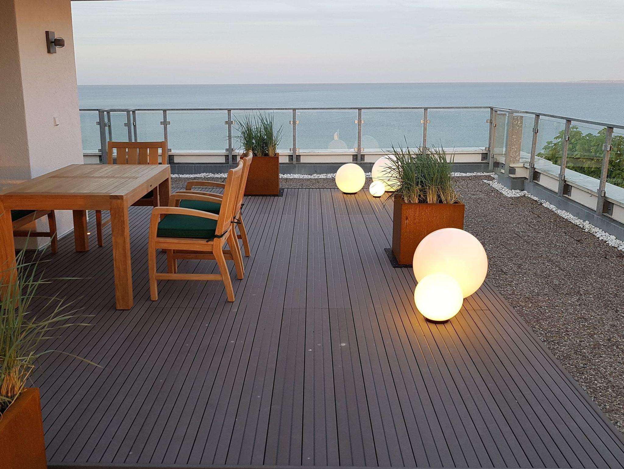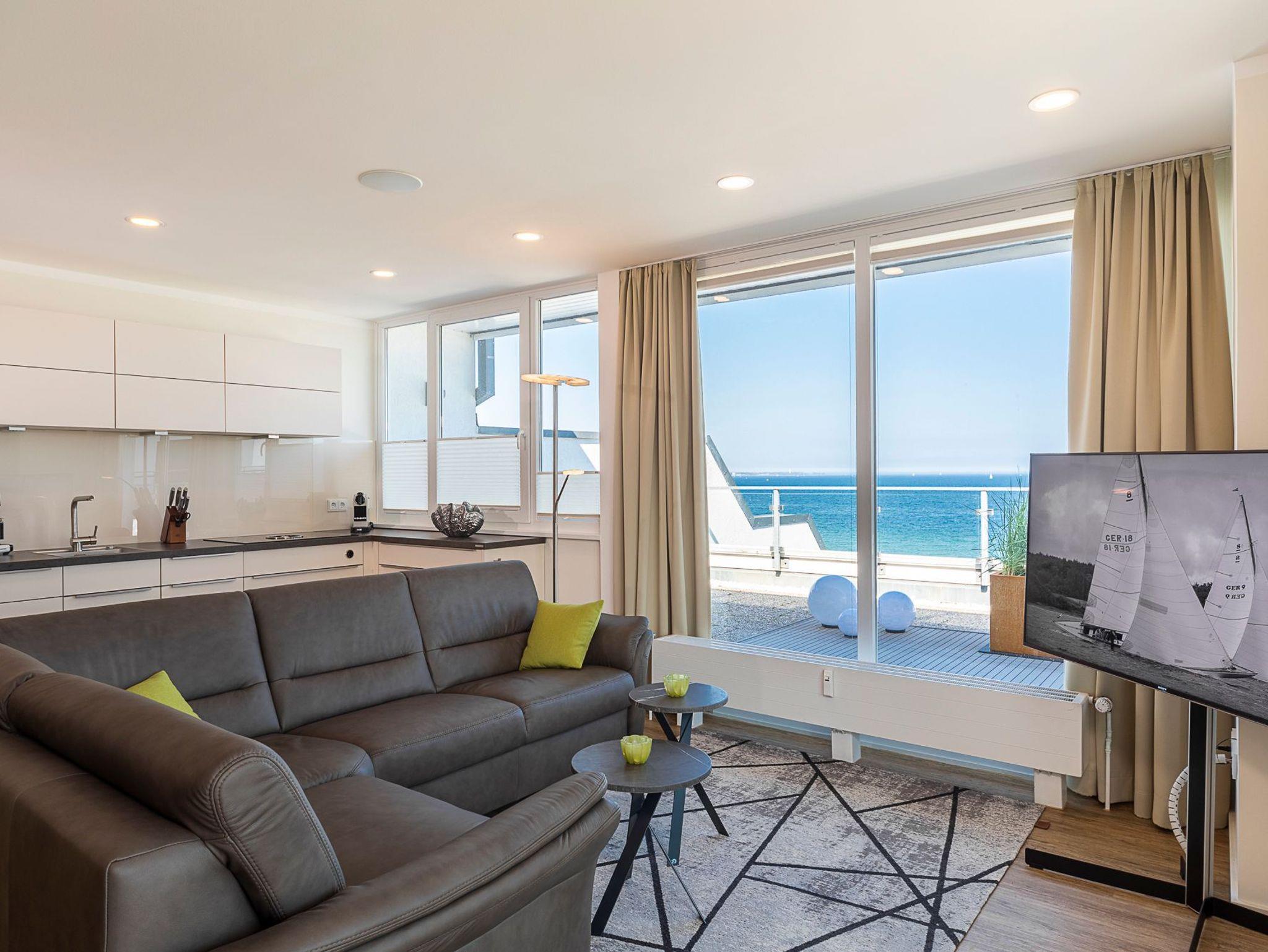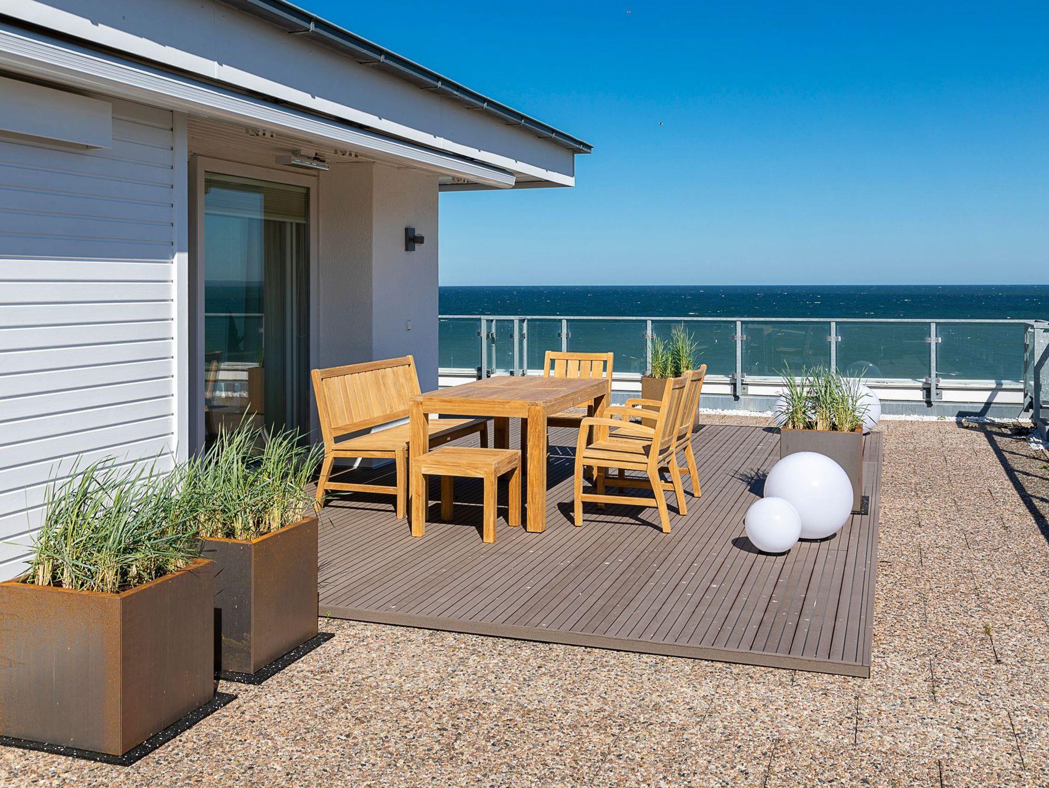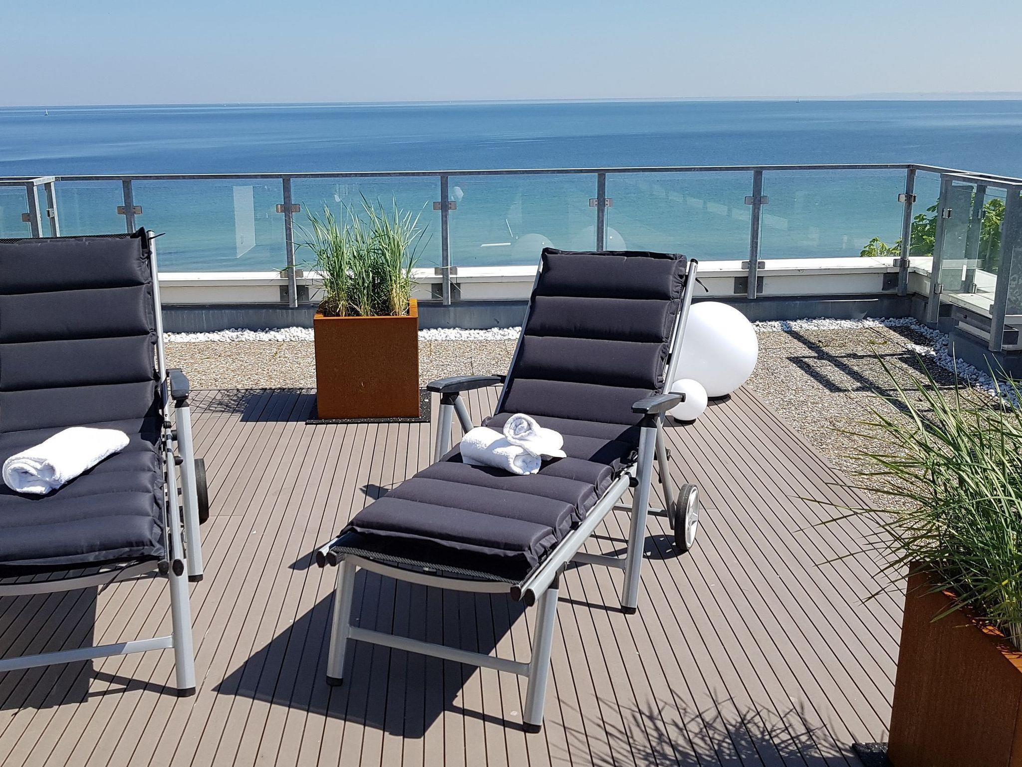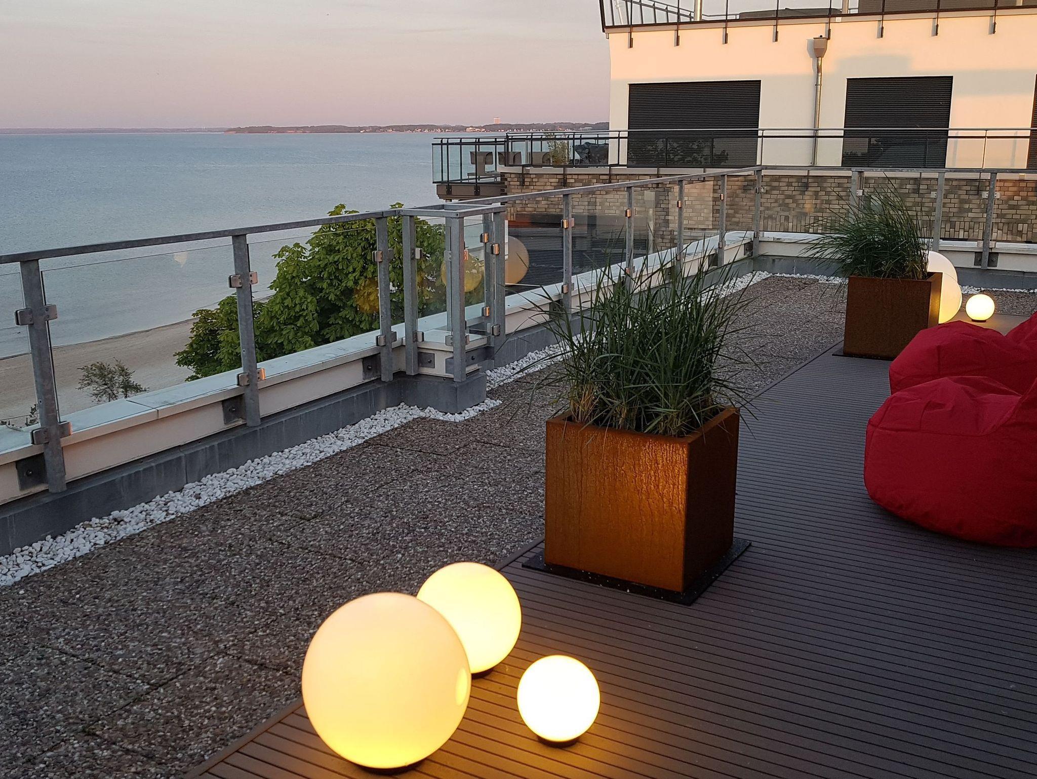 Mit dieser Penthousewohnung bieten wir unseren Gästen eine Wohlfühlwohnung der Oberklasse. Ein herrlicher Blick über die Lübecker Bucht empfängt Sie beim Eintreten ins Wohnzimmer. Die große Dachterrasse rund um das Apartment lädt zum Verweilen und Entspannen ein. Hier finden Sie garantiert Ihren Lieblingsort - im Ess- oder Sitzbereich mit Ostseeblick und Meeresrauschen, auf den Sonnenliegen zum Relaxen oder auf den gemütlichen Sitzsäcken, mit Blick in den Sonnenuntergang. In der Wohnung sind der Wohn- und Essbereich geschmackvoll eingerichtet und verfügen über ein bequemes Sofa sowie einen Esstisch mit einer Bank und Stühlen für 5 Personen. Selbstverständlich alles mit Ostseeblick. Auch beim Kochen in der komplett ausgestatteten Einbauküche bleibt Ihnen der Blick auf die Ostsee nicht verwehrt.