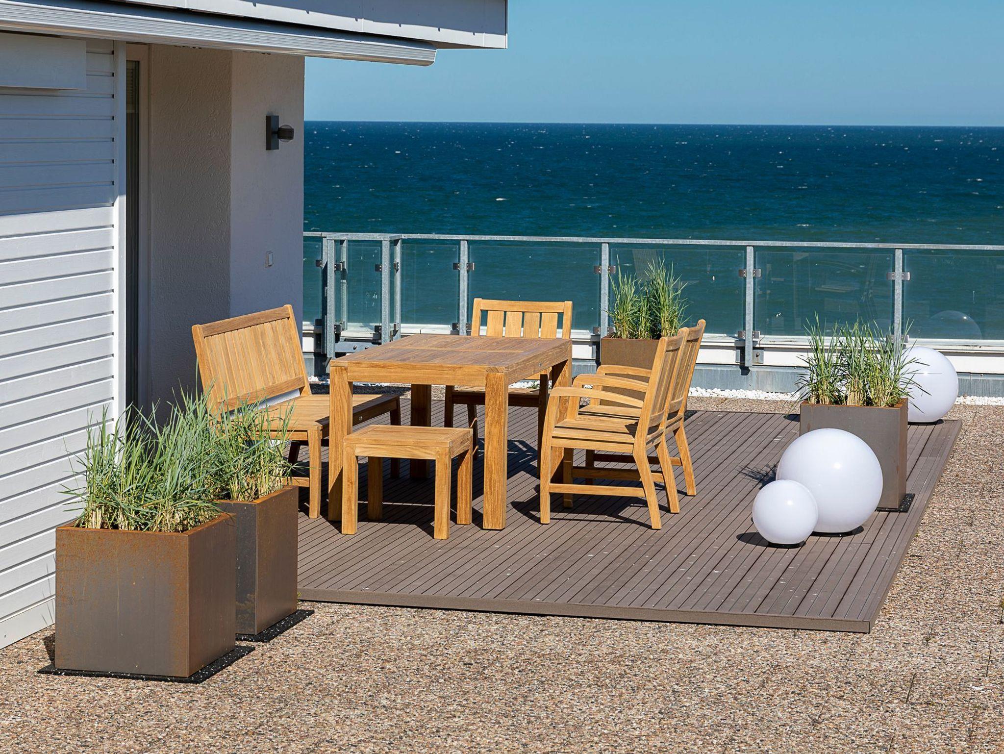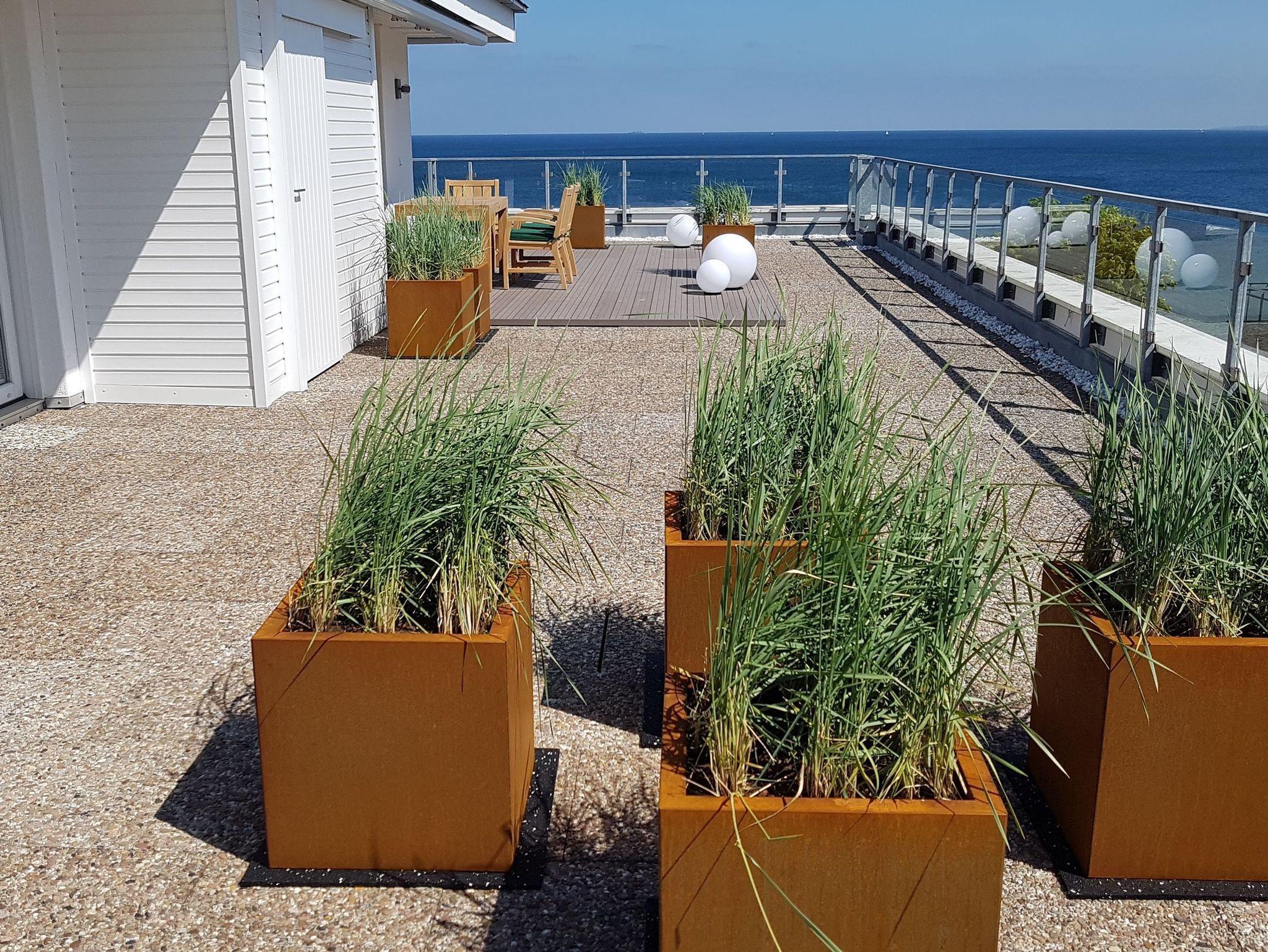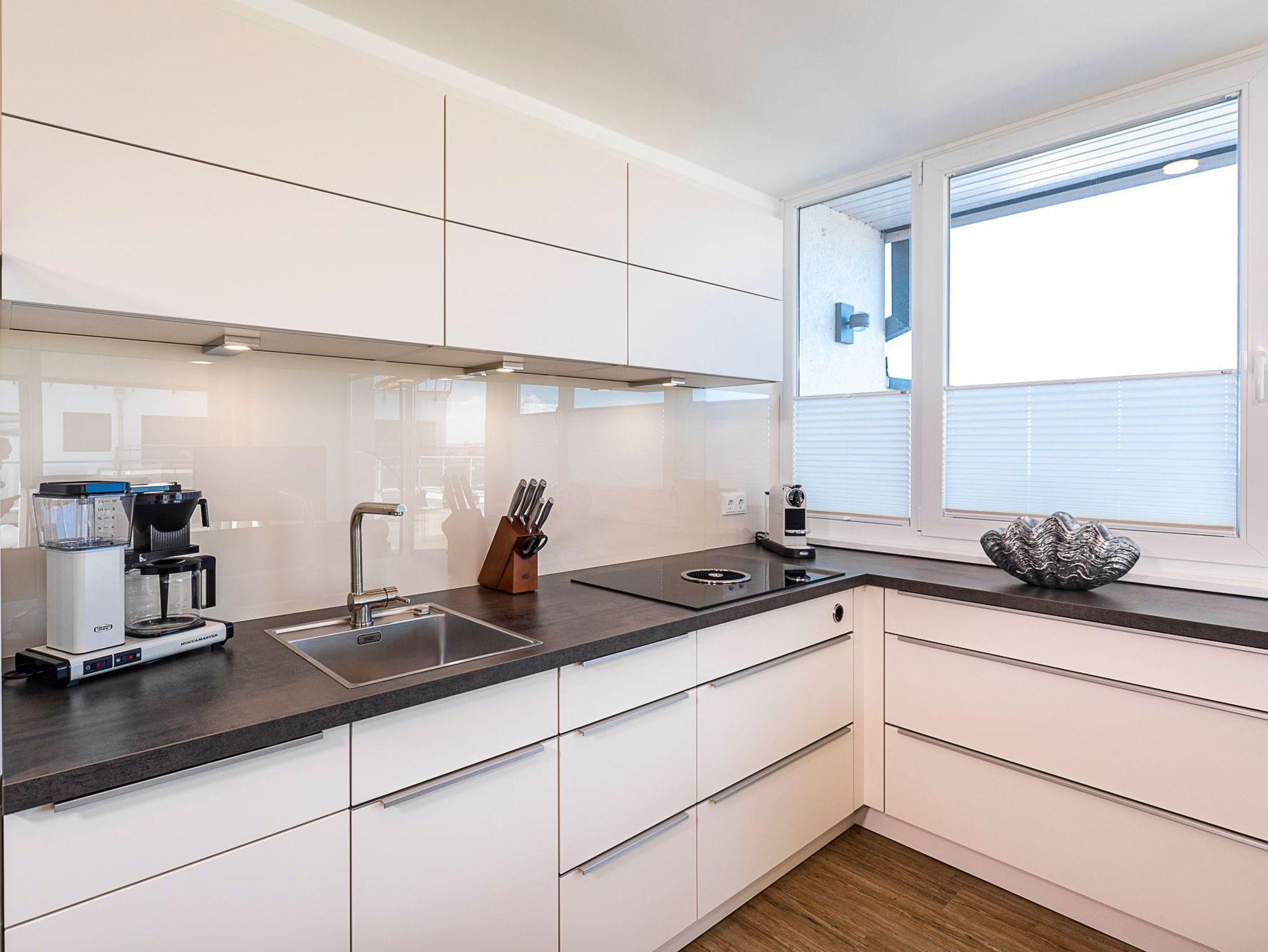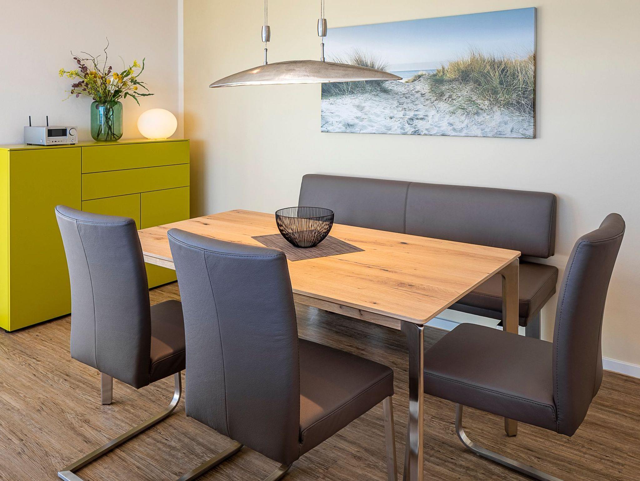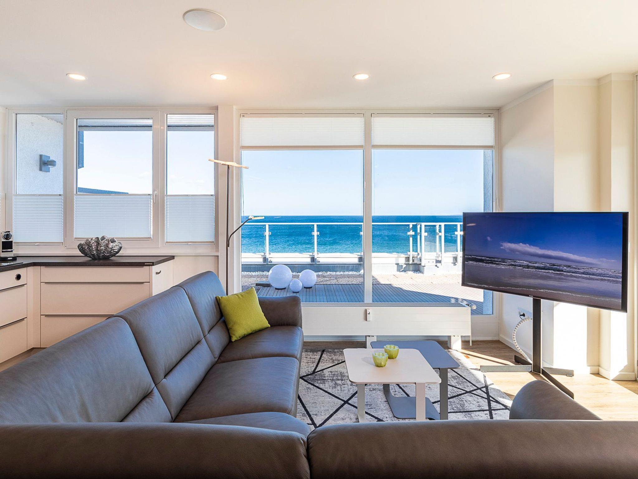 Mit dieser Penthousewohnung bieten wir unseren Gästen eine Wohlfühlwohnung der Oberklasse. Ein herrlicher Blick über die Lübecker Bucht empfängt Sie beim Eintreten ins Wohnzimmer. Die große Dachterrasse rund um das Apartment lädt zum Verweilen und Entspannen ein. Hier finden Sie garantiert Ihren Lieblingsort - im Ess- oder Sitzbereich mit Ostseeblick und Meeresrauschen, auf den Sonnenliegen zum Relaxen oder auf den gemütlichen Sitzsäcken, mit Blick in den Sonnenuntergang. In der Wohnung sind der Wohn- und Essbereich geschmackvoll eingerichtet und verfügen über ein bequemes Sofa sowie einen Esstisch mit einer Bank und Stühlen für 5 Personen. Selbstverständlich alles mit Ostseeblick. Auch beim Kochen in der komplett ausgestatteten Einbauküche bleibt Ihnen der Blick auf die Ostsee nicht verwehrt.