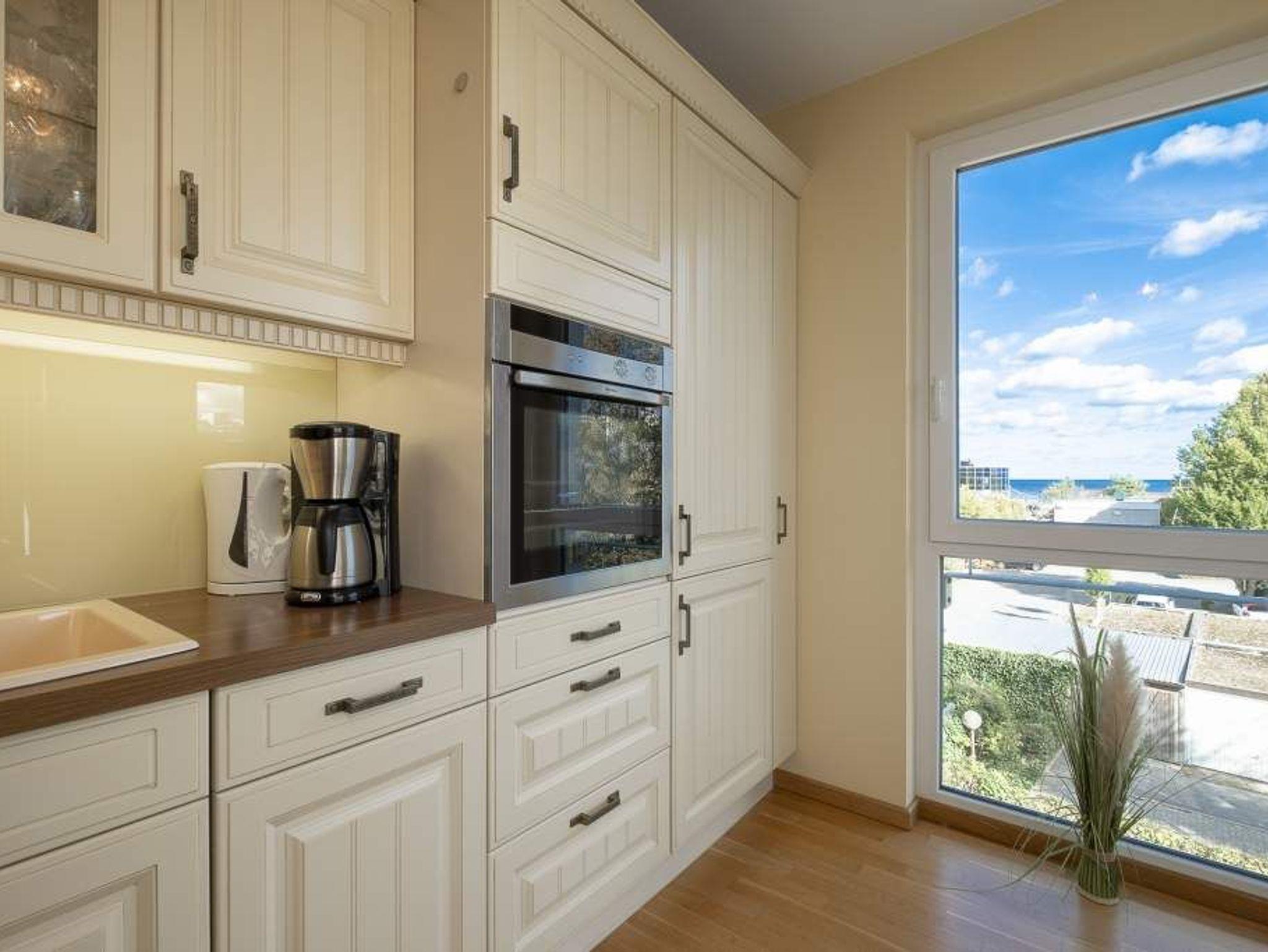 Diese modern und mit Liebe zum Detail eingerichtete Ferienwohnung, bietet Ihnen einen gemütlichen Wohn-Essbereich. Neben dem modernen Flachbildfernseher steht Ihnen eine HiFi-Anlage mit CD-Player zur Verfügung. Kostenloses WLAN ist selbstverständlich. Der überdachte Balkon mit Blick auf die Ostsee ist mit Tisch, Stühlen und einem Sonnenschirm ausgestattet. Die helle Küche im Landhausstil ist komplett ausgestattet und lädt zum aktiven Kochen ein.[nbsp] Neben einer Filterkaffeemaschine lädt eine Nespresso-Kapselmaschine zu einem perfekten Kaffeegenuss ein. Hier steht auch eine Waschmaschine zur Verfügung.