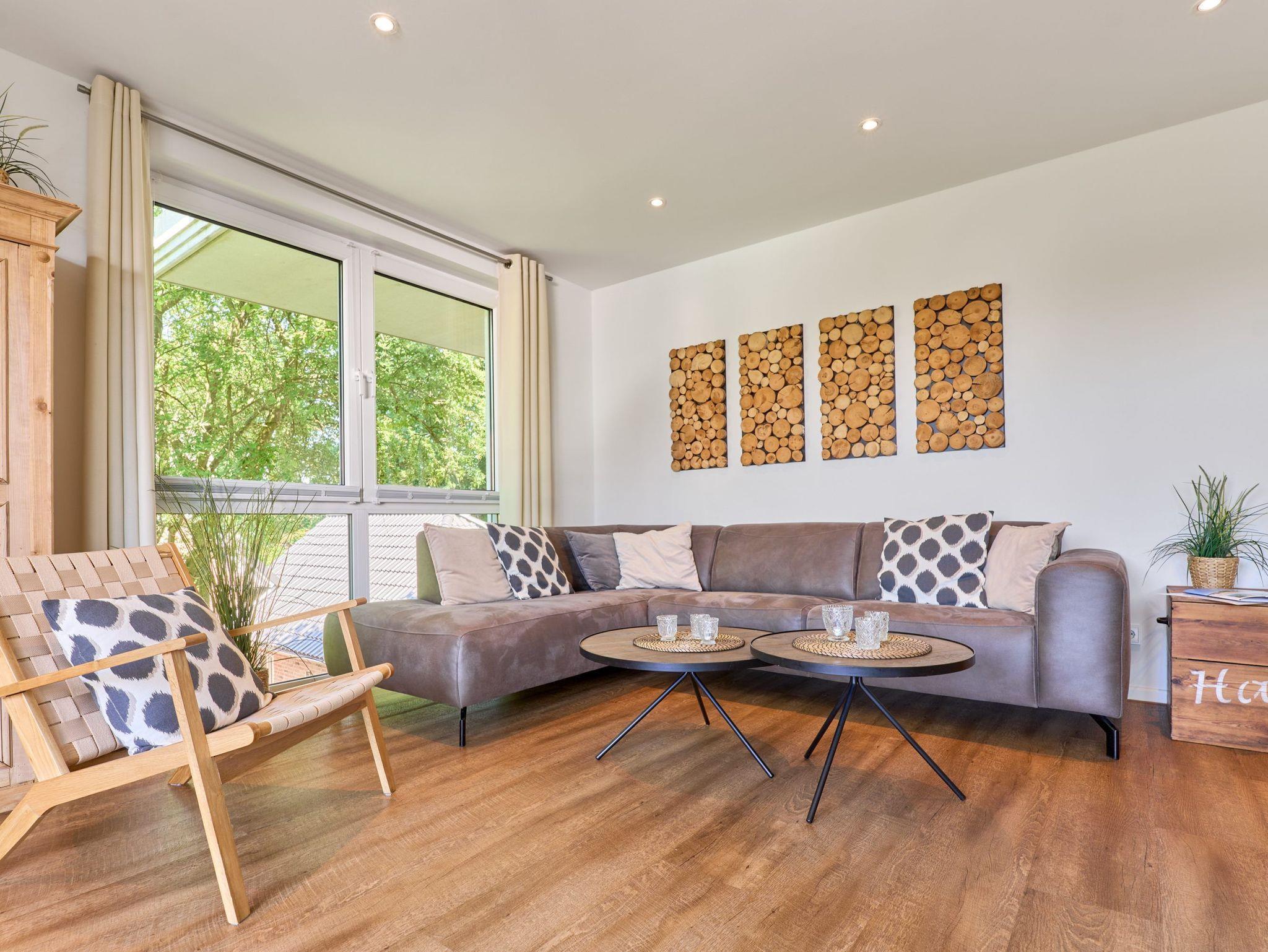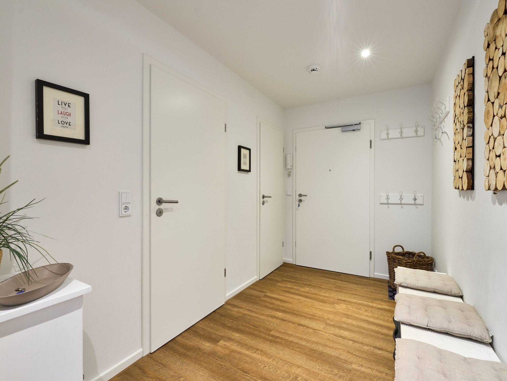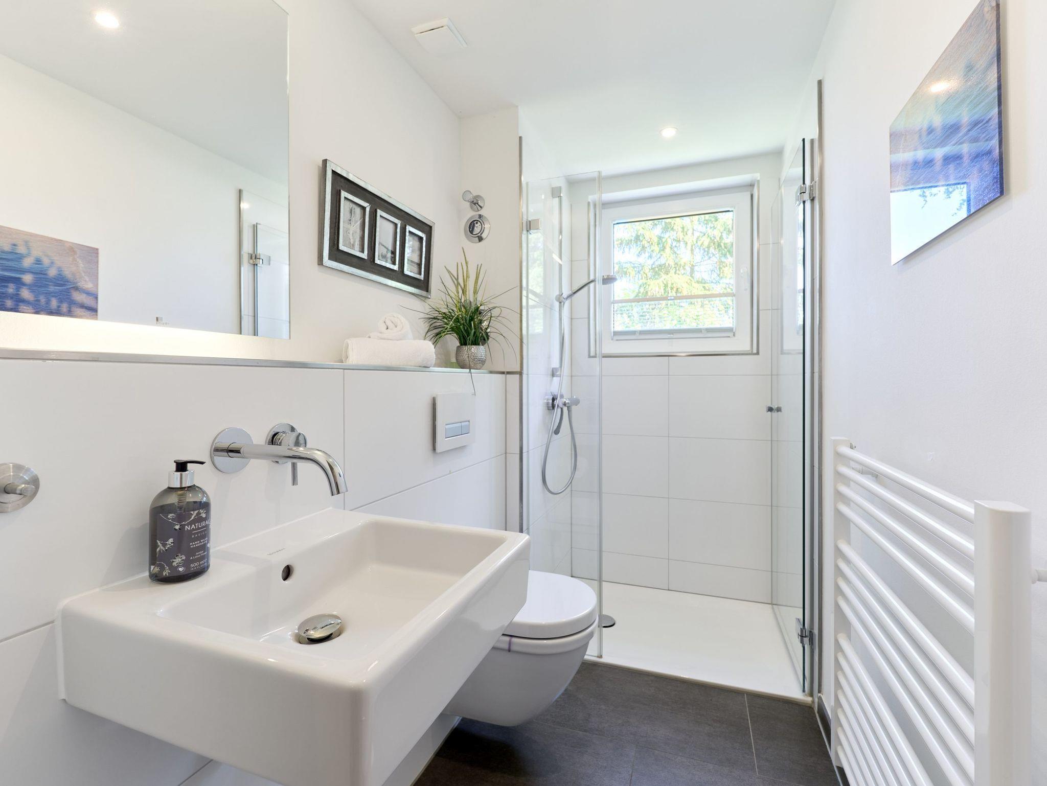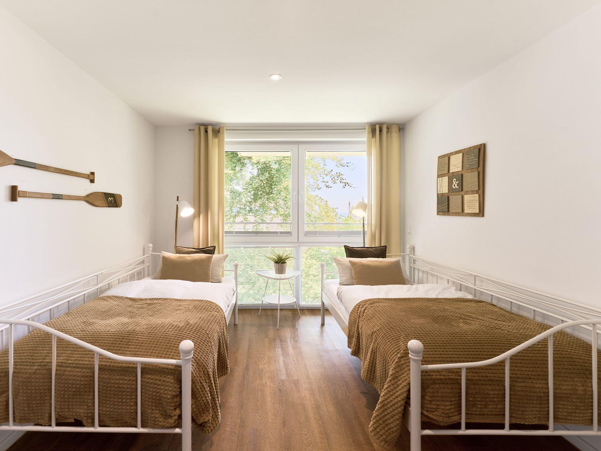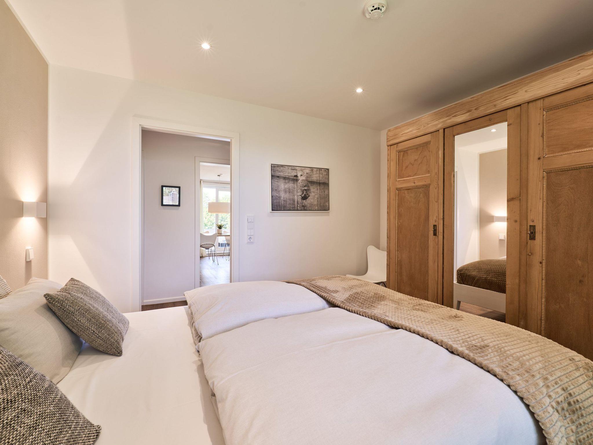 Genießen Sie Ihren Urlaub in dieser lichtdurchfluteten Ferienwohnung, die Ihnen mit ihren zwei geräumigen Schlafzimmern und dem großen Wohnzimmer, mit integrierter Küche, großem Esstisch und gemütlicher Fernsehecke, inklusive Musikanlage, viel Raum zum Entspannen bietet. WLAN steht Ihnen kostenlos zur Verfügung. Der nach Südwesten ausgerichtete Balkon ist mit Lounge-Möbeln ausgestattet. Im ersten Schlafzimmer steht ein bequemes Doppelbett (1,60 x 2,00m), im 2. Schlafzimmer warten 2 Einzelbetten auf Sie. Hier befindet sich auch ein Flachbildfernseher. In beiden Schlafzimmern sind zur Verdunkelung elektrische Rollläden angebracht. Die hellen Badezimmer mit Tageslicht verfügen über bodentiefe Duschen und neben der Fußbodenheizung steht Ihnen hier ein Handtuchheizkörper zur Verfügung.