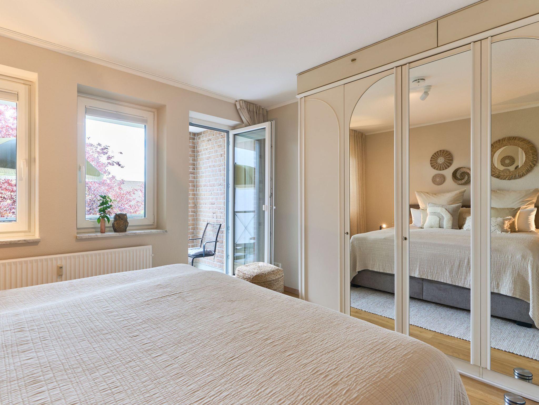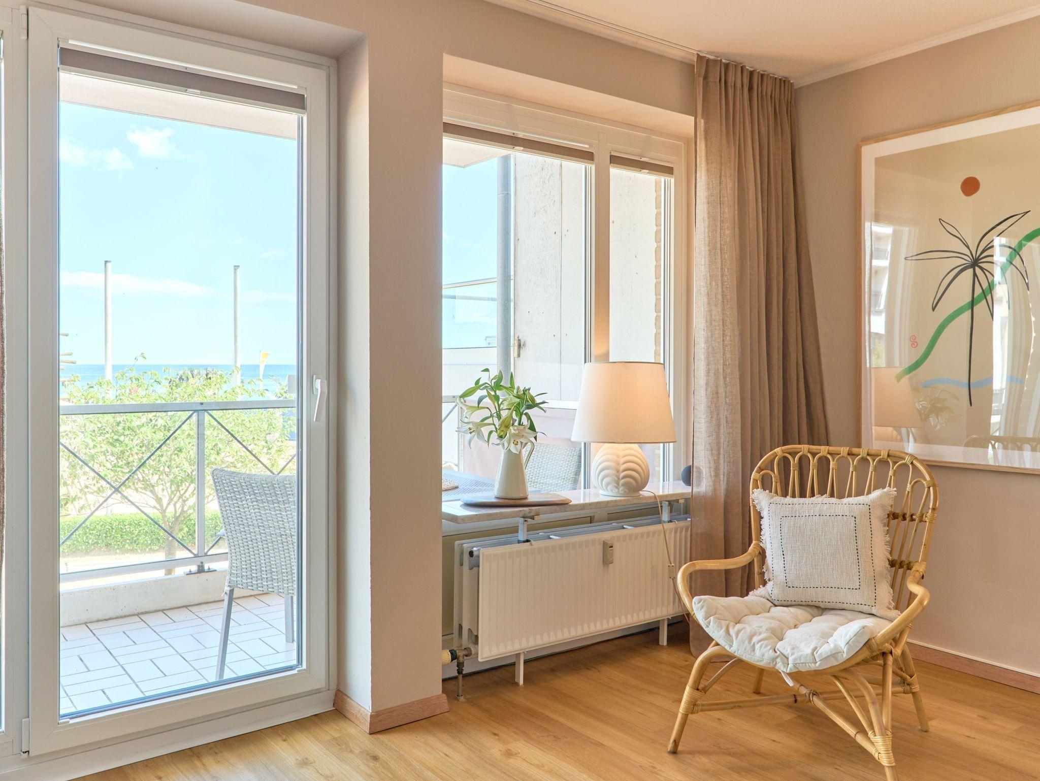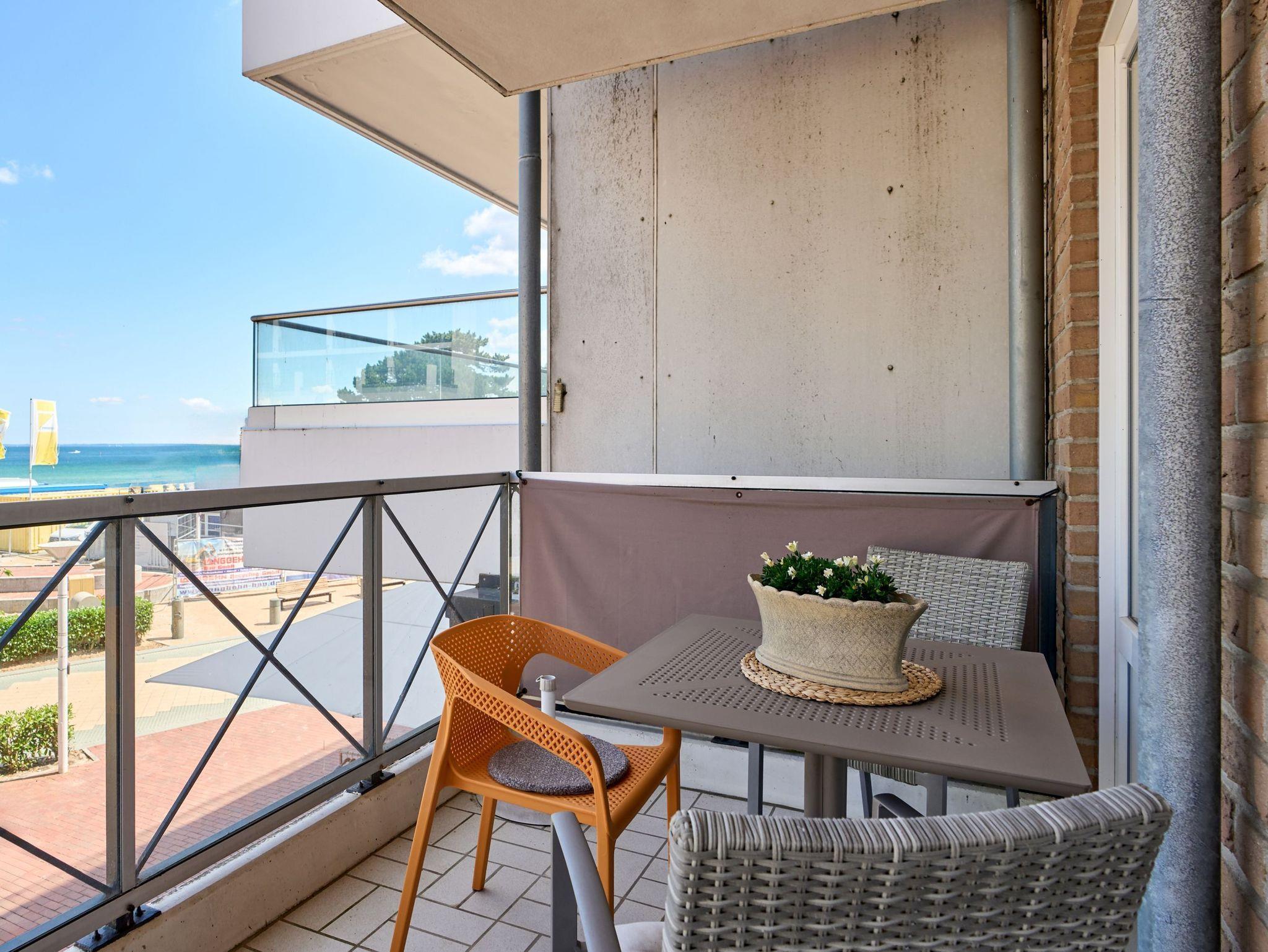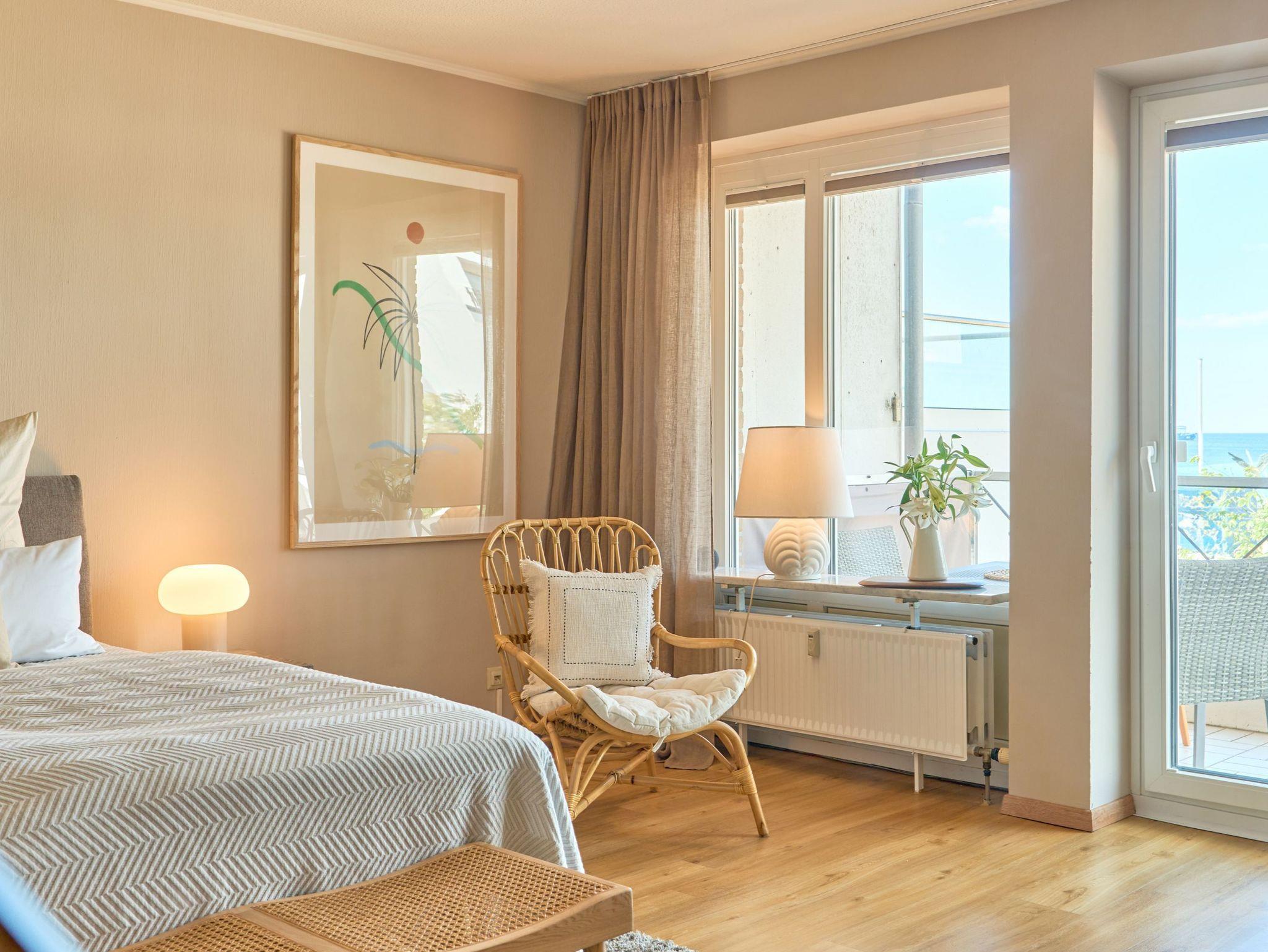 Charmante 3-Zimmer-Ferienwohnung, ca. 101 m², im 1.OG.[nbsp] Strandnah mit Meerblick, lichtdurchflutet mit 3 Loggien, 2 Loggien nach Westen, mit Blick ins Grüne, lebendiges Treiben auf der Loggia nach Osten, mit Meerblick, ohne Fahrstuhl