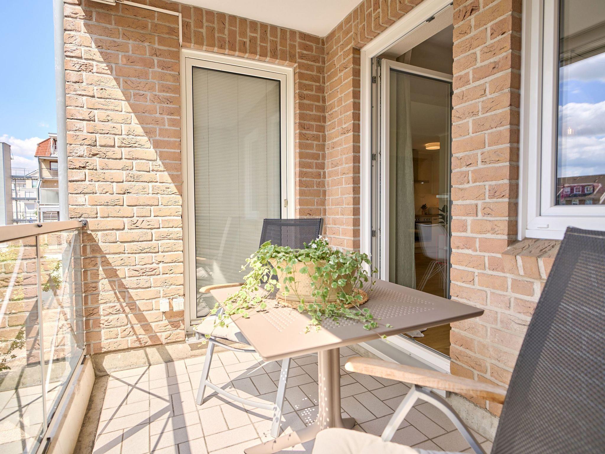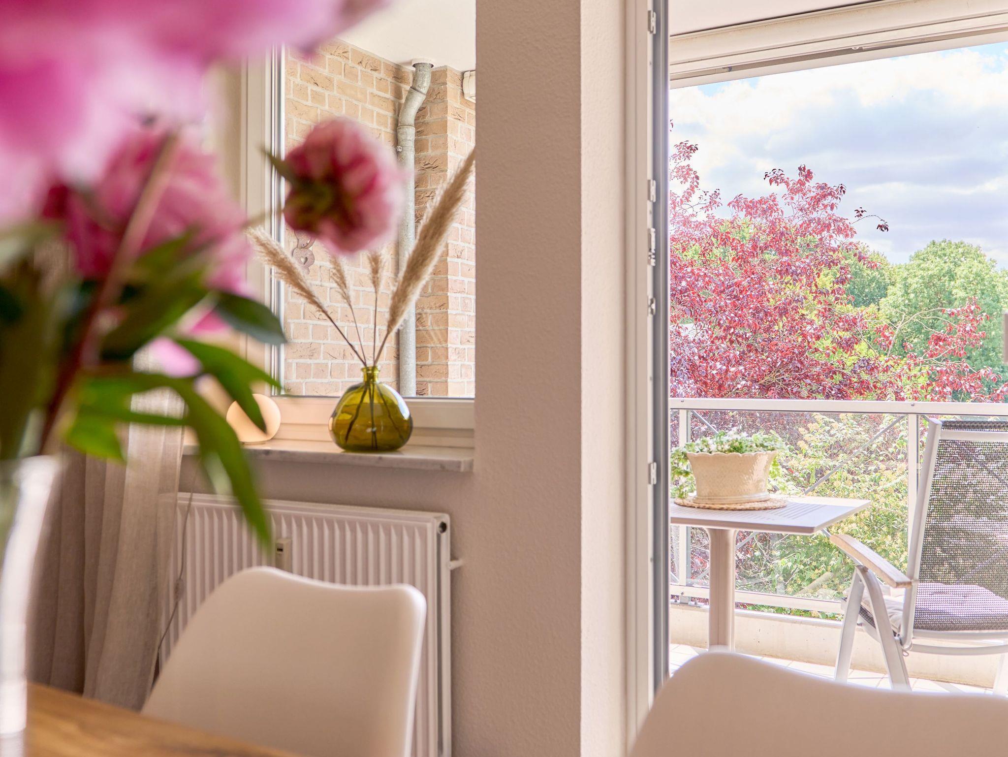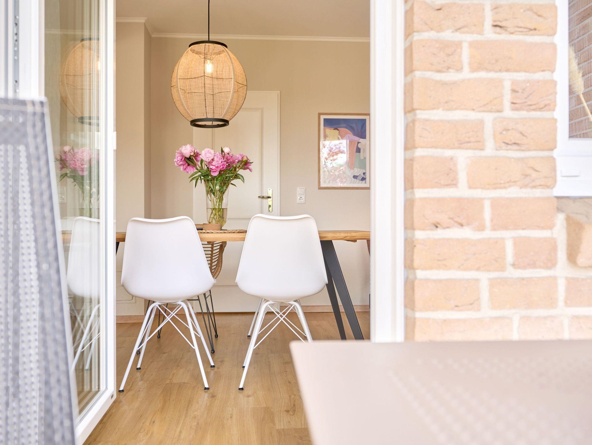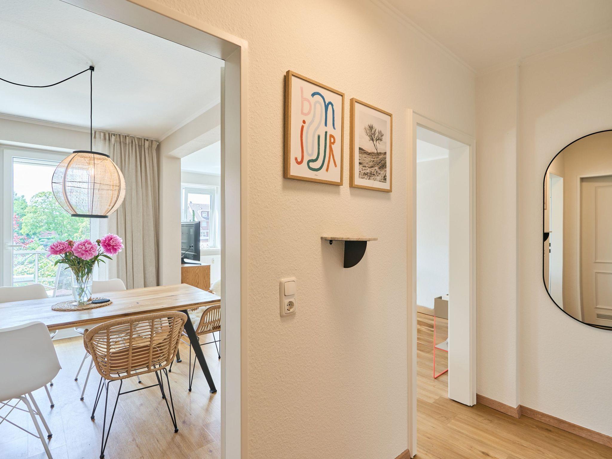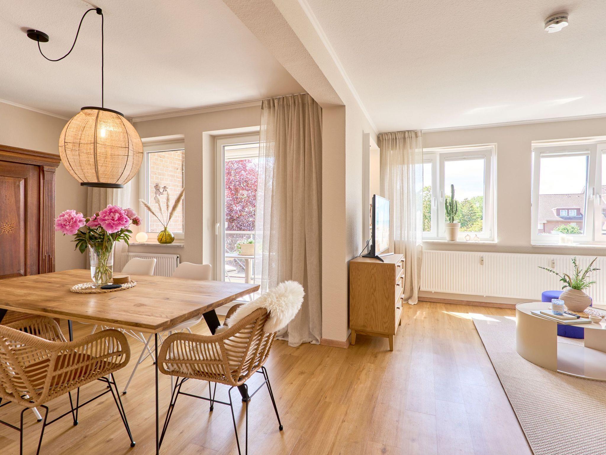 Charmante 3-Zimmer-Ferienwohnung, ca. 101 m², im 1.OG.[nbsp] Strandnah mit Meerblick, lichtdurchflutet mit 3 Loggien, 2 Loggien nach Westen, mit Blick ins Grüne, lebendiges Treiben auf der Loggia nach Osten, mit Meerblick, ohne Fahrstuhl