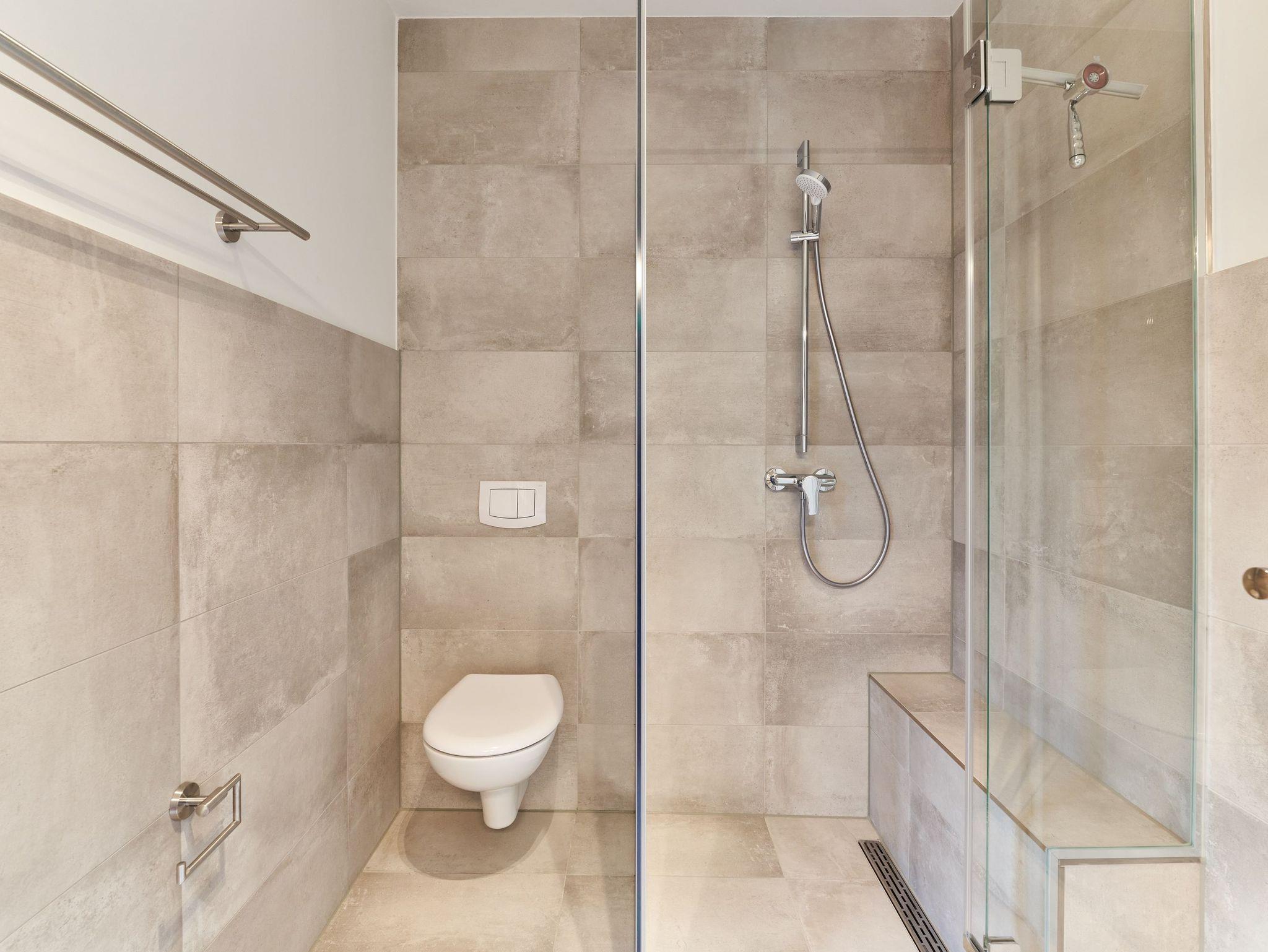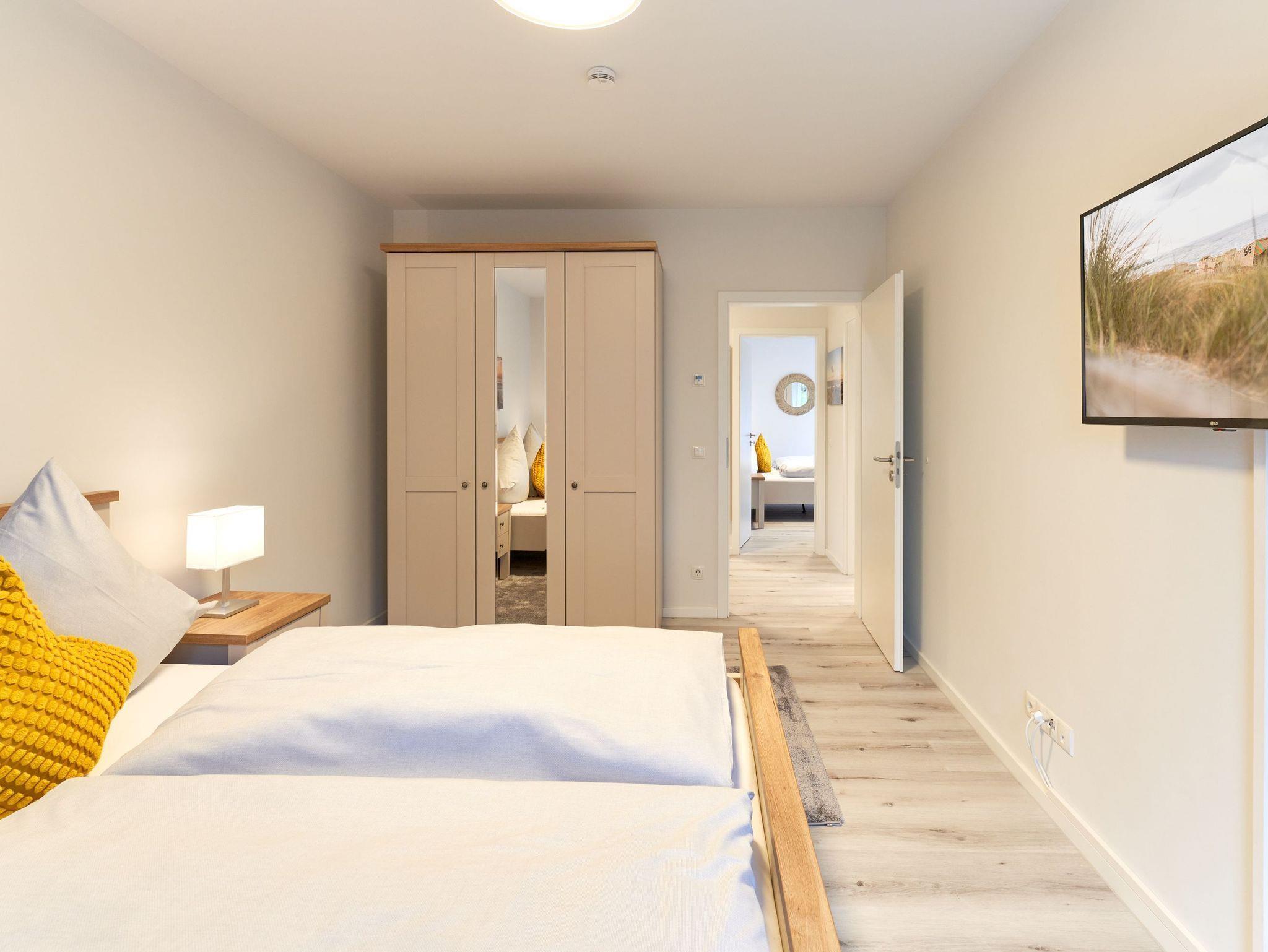 Im 1. Schlafzimmer stehen Ihnen 1 Doppelbett (Einzelmatratzen) mit verstellbarem Kopf- und Fußteil, zwei Nachttische, ein Kleiderschrank sowie ein Wand-TV zur Verfügung. Das Tageslicht-Duschbad en suite ist mit einer bodengleichen Dusche ausgestattet.