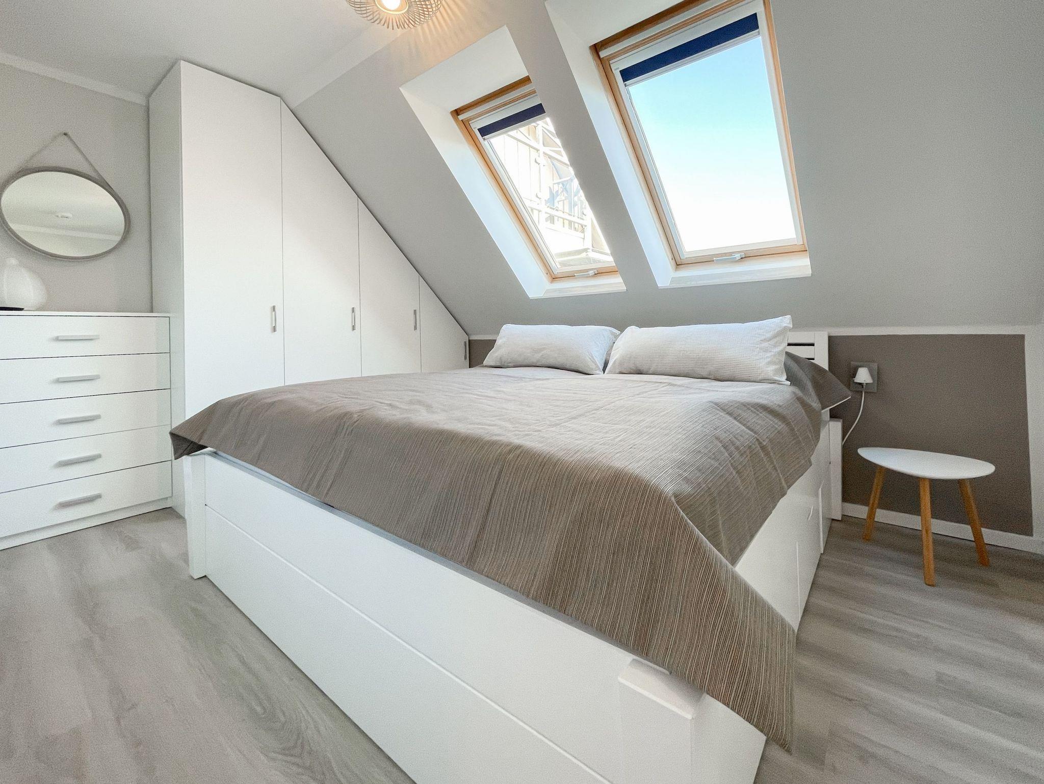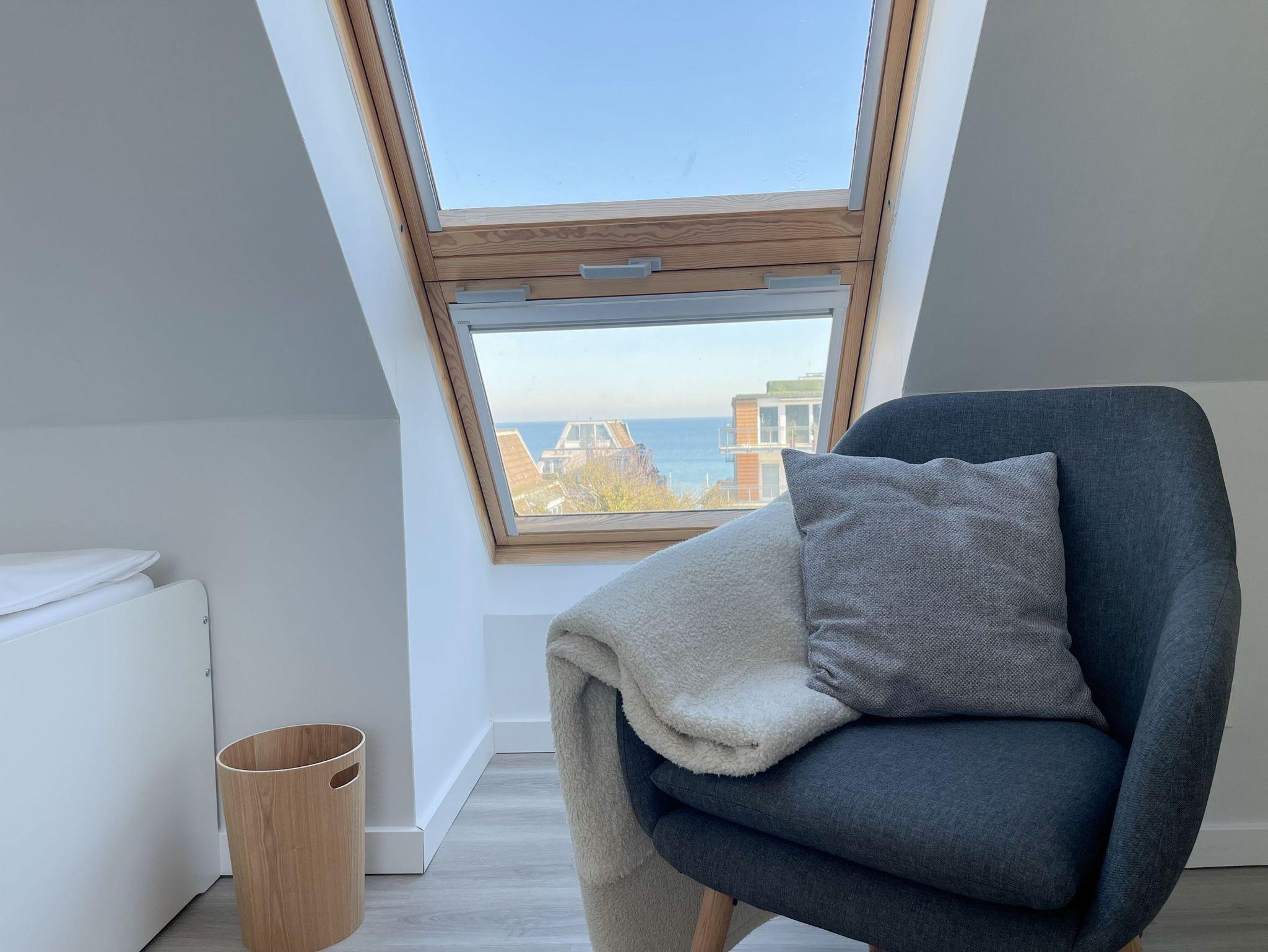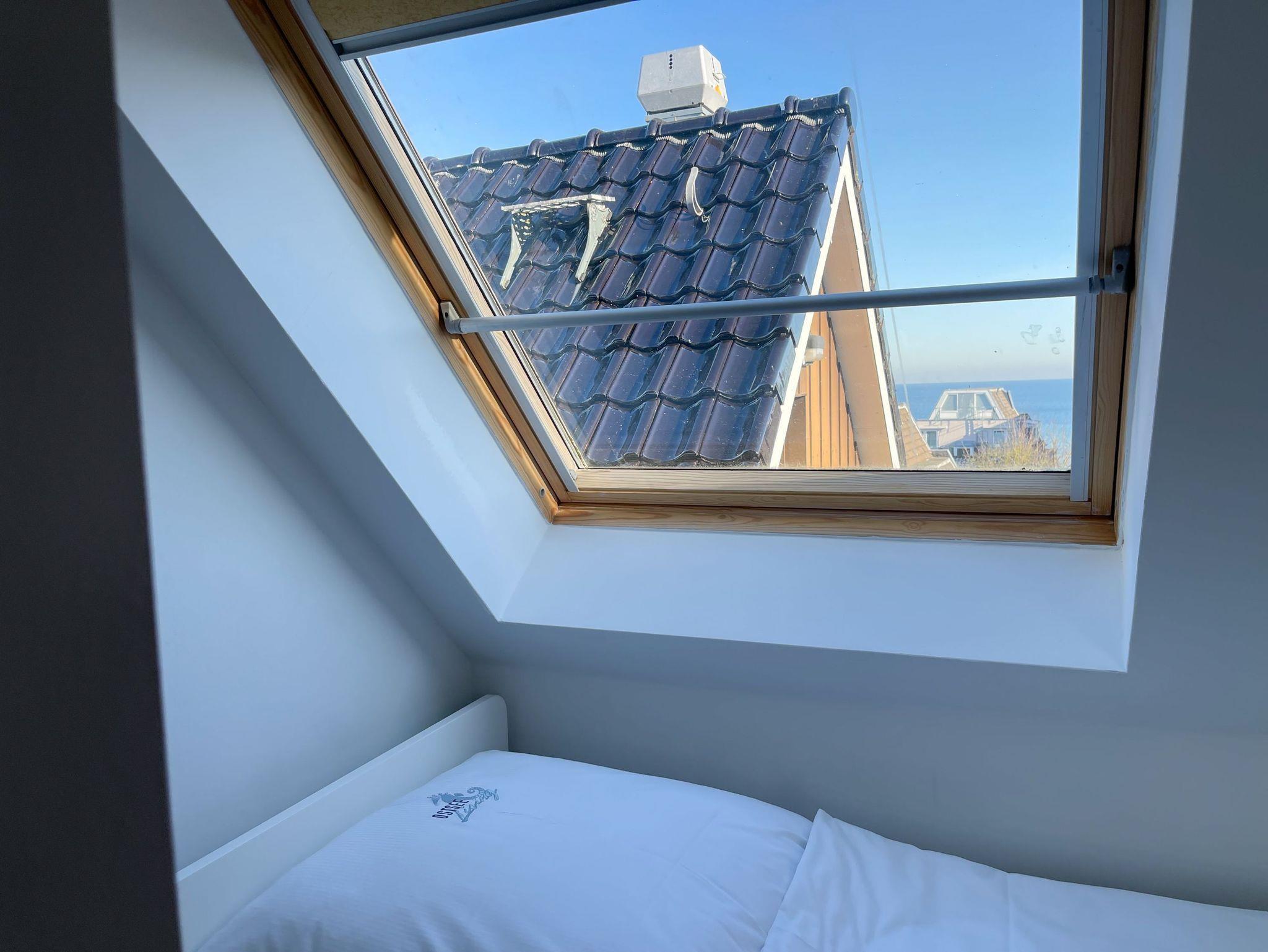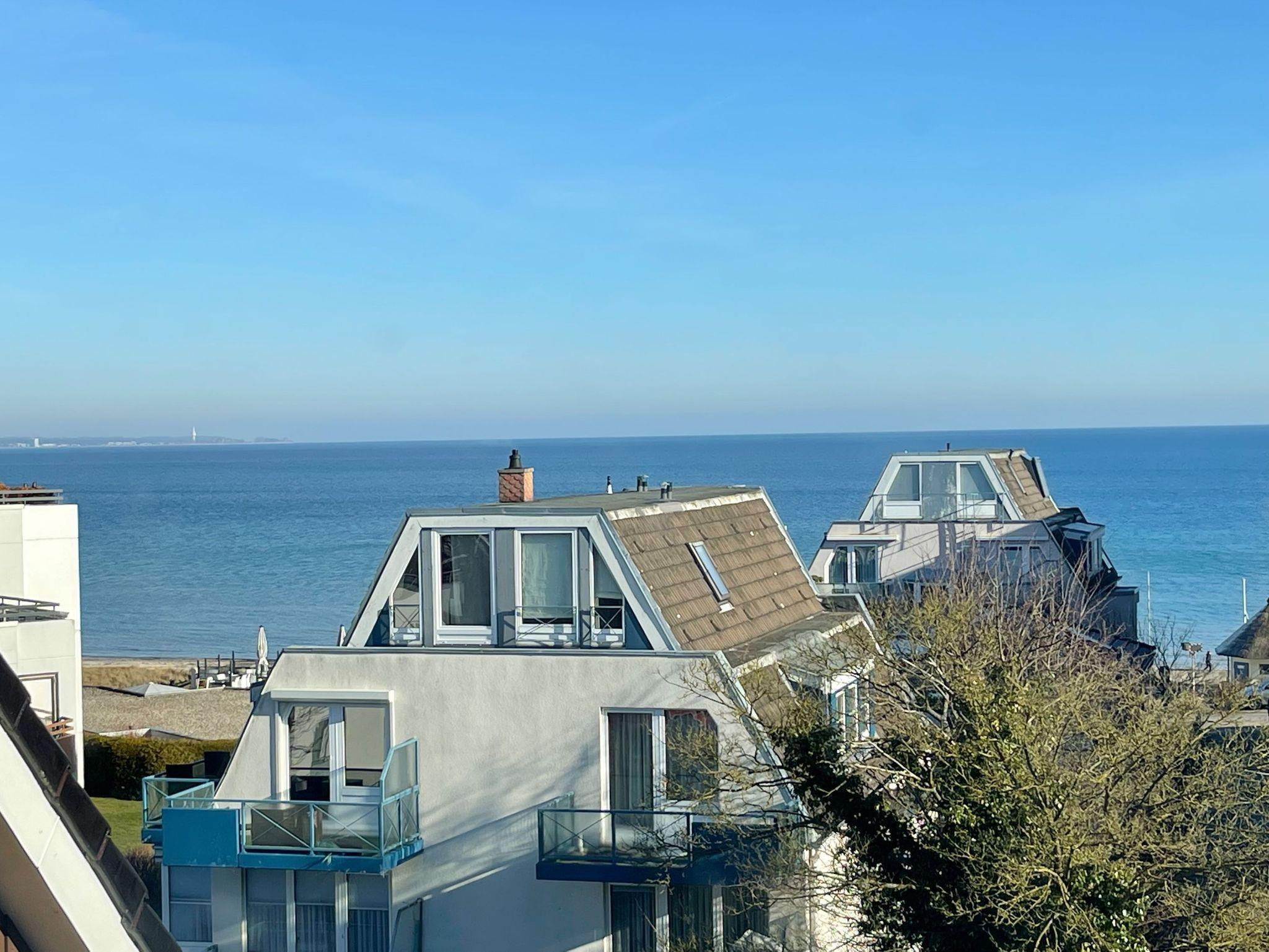 Die Ferienwohnung liegt ganz oben im 3. Obergeschoss zur lichtdurchfluteten Südseite und erstreckt sich über 2 Ebenen. Der herrliche Sonnenbalkon in Südwestausrichtung liegt direkt vor dem Wohnbereich und ist mit Gartenmöbeln und einer elektrischen Markise ausgestattet.[nbsp] Die frisch renovierte Wohnung verfügt über ein gelungenes Raumkonzept mit geschmackvollen Details sowie eine hochwertige Ausstattung und lädt 4 Personen zum Wohlfühlen in Strandnähe ein. Es erwartet Sie ein heller, freundlicher Wohnraum mit bodentiefen Fensterflächen, geschmackvoll gestaltet und hochwertig eingerichtet mit einem Sofa, TV, Bluetoothradio und einem Essbereich für 4 Personen. WLAN steht selbstverständlich zur kostenlosen Nutzung zur Verfügung. Die integrierte Küche ist bestens ausgestattet, unter anderem mit Spülmaschine, Backofen, Nespressomaschine und vielem mehr. Die Wohnung bietet 2 separate Schlafzimmer, die beide mit einem Kleiderschrank, einem zusätzlichen TV und Verdunkelungsrollos ausgestattet sind. Das Schlafzimmer auf der unteren Wohnebene ist mit einem Doppelbett (180x200) eingerichtet. Auf der oberen Wohnebene, die über eine Treppe vom Wohnbereich zu erreichen ist, befindet sich das zweite Schlafzimmer mit sehr schönem Blick auf die Ostsee, ausgestattet mit[nbsp] einem Doppelbett (140x200) und einem Einzelbett (90x200). Das neue Bad verfügt über Dusche, WC, Waschtisch und Handtuchtrockner.