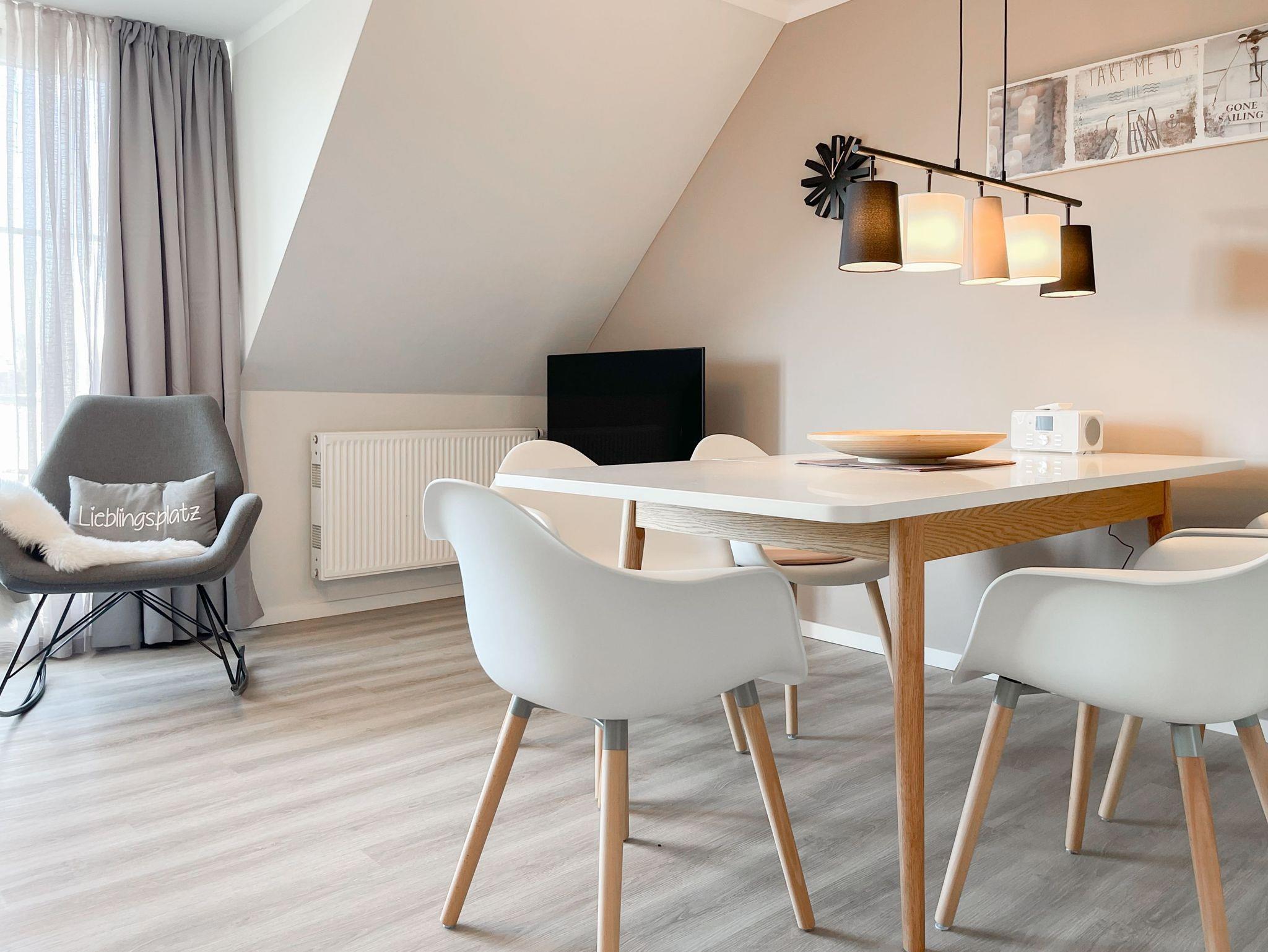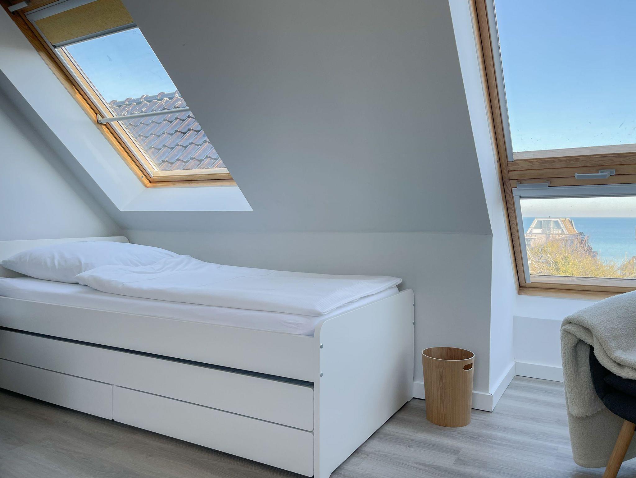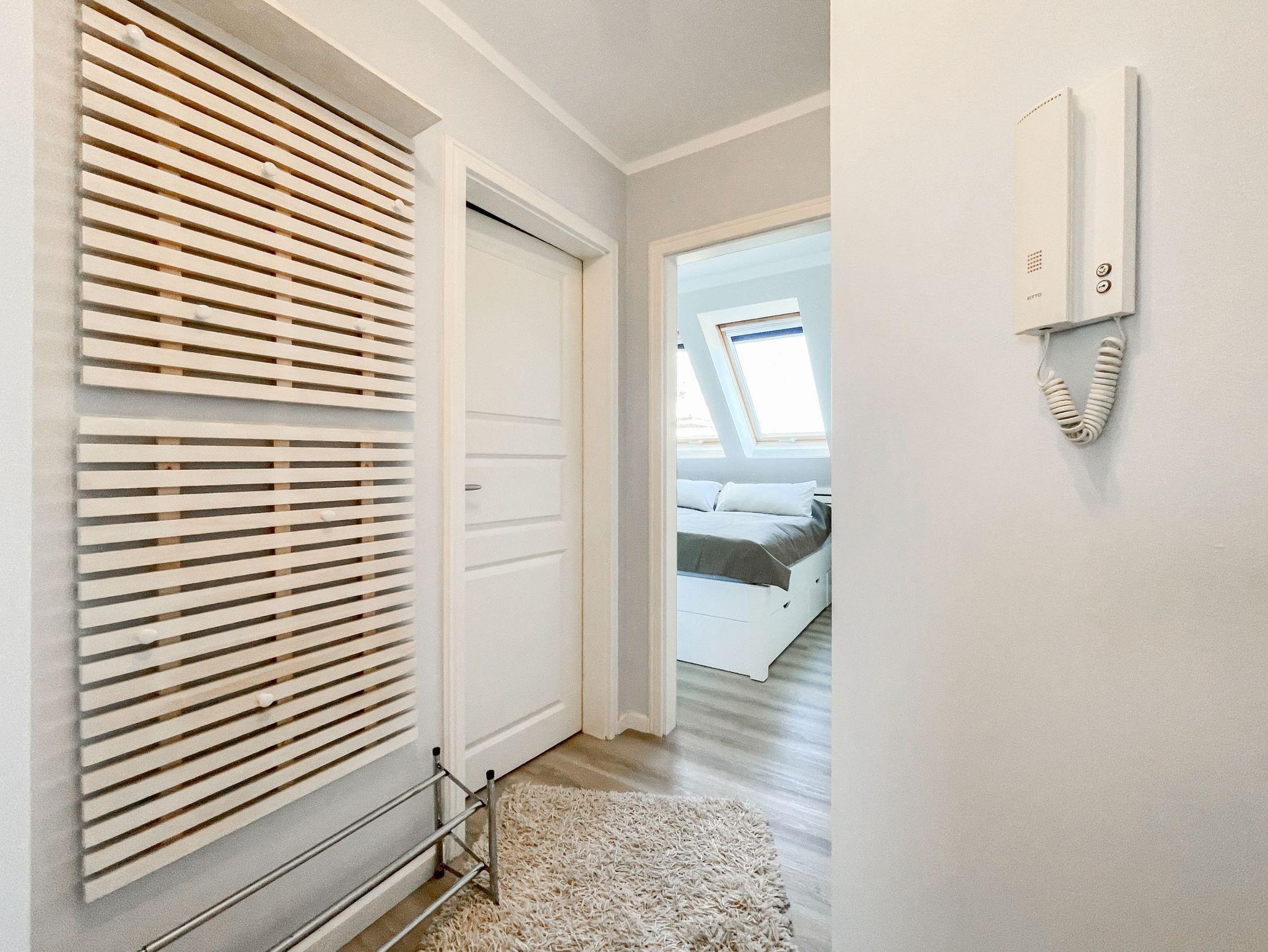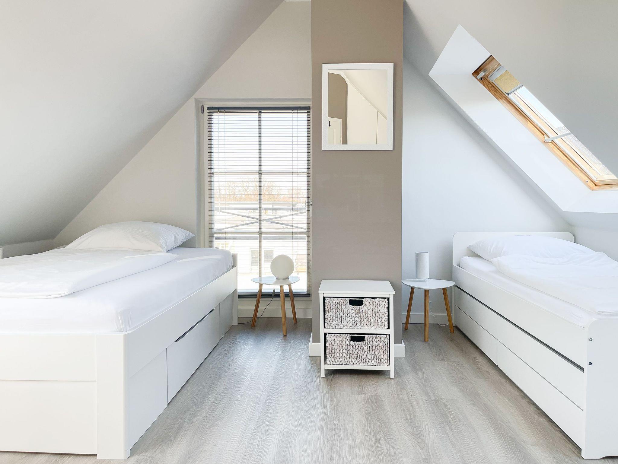 Die Ferienwohnung liegt ganz oben im 3. Obergeschoss zur lichtdurchfluteten Südseite und erstreckt sich über 2 Ebenen. Der herrliche Sonnenbalkon in Südwestausrichtung liegt direkt vor dem Wohnbereich und ist mit Gartenmöbeln und einer elektrischen Markise ausgestattet.[nbsp] Die frisch renovierte Wohnung verfügt über ein gelungenes Raumkonzept mit geschmackvollen Details sowie eine hochwertige Ausstattung und lädt 4 Personen zum Wohlfühlen in Strandnähe ein. Es erwartet Sie ein heller, freundlicher Wohnraum mit bodentiefen Fensterflächen, geschmackvoll gestaltet und hochwertig eingerichtet mit einem Sofa, TV, Bluetoothradio und einem Essbereich für 4 Personen. WLAN steht selbstverständlich zur kostenlosen Nutzung zur Verfügung. Die integrierte Küche ist bestens ausgestattet, unter anderem mit Spülmaschine, Backofen, Nespressomaschine und vielem mehr. Die Wohnung bietet 2 separate Schlafzimmer, die beide mit einem Kleiderschrank, einem zusätzlichen TV und Verdunkelungsrollos ausgestattet sind. Das Schlafzimmer auf der unteren Wohnebene ist mit einem Doppelbett (180x200) eingerichtet. Auf der oberen Wohnebene, die über eine Treppe vom Wohnbereich zu erreichen ist, befindet sich das zweite Schlafzimmer mit sehr schönem Blick auf die Ostsee, ausgestattet mit[nbsp] einem Doppelbett (140x200) und einem Einzelbett (90x200). Das neue Bad verfügt über Dusche, WC, Waschtisch und Handtuchtrockner.