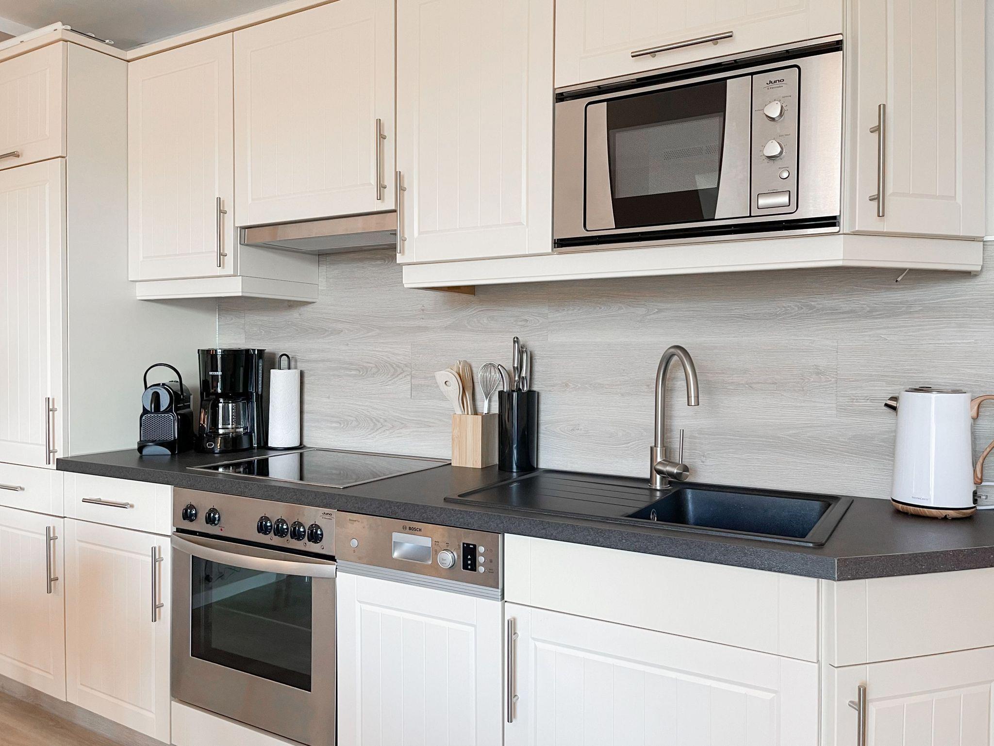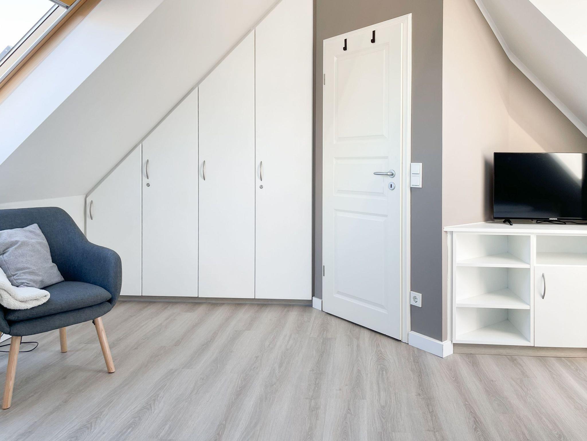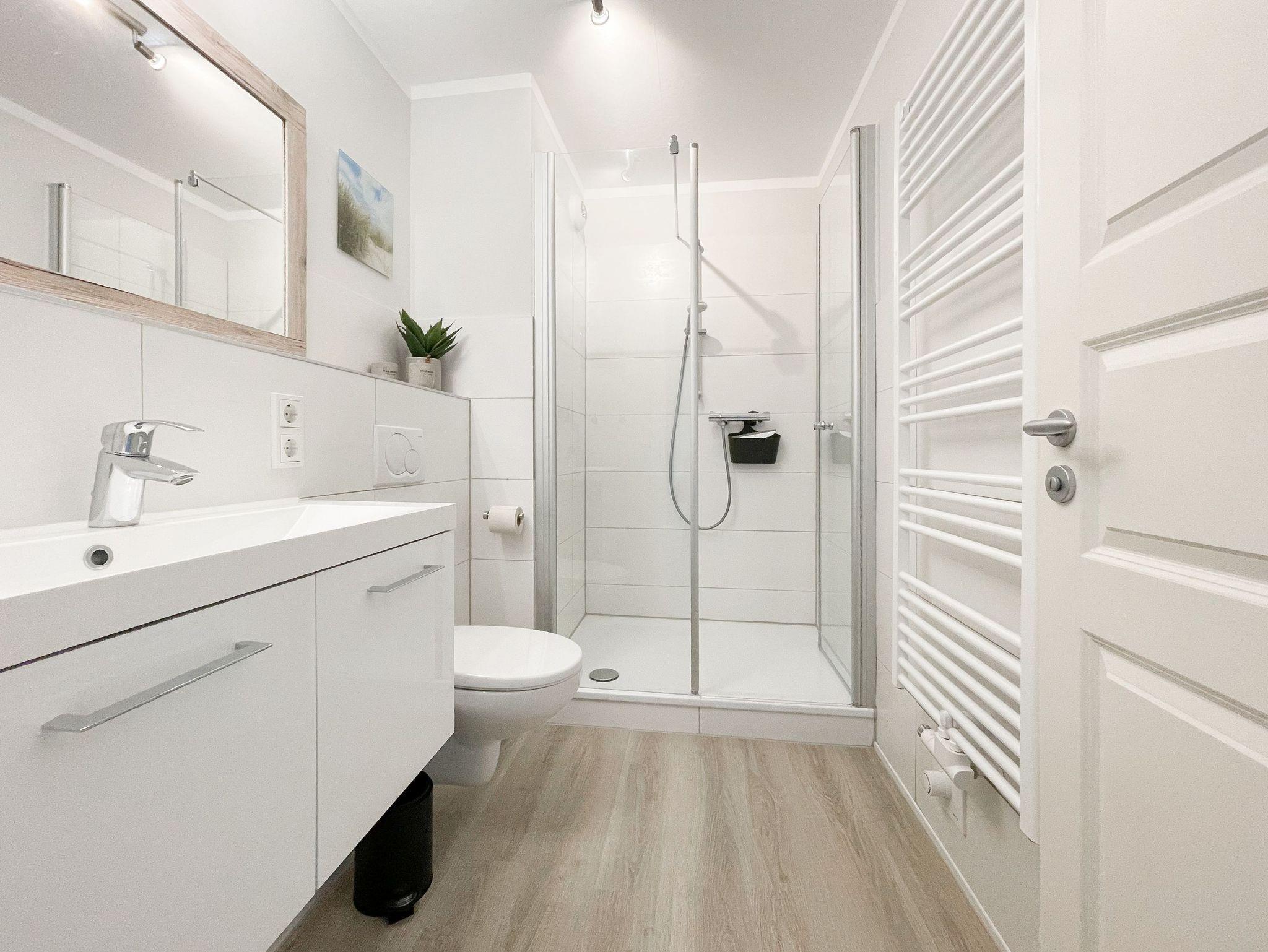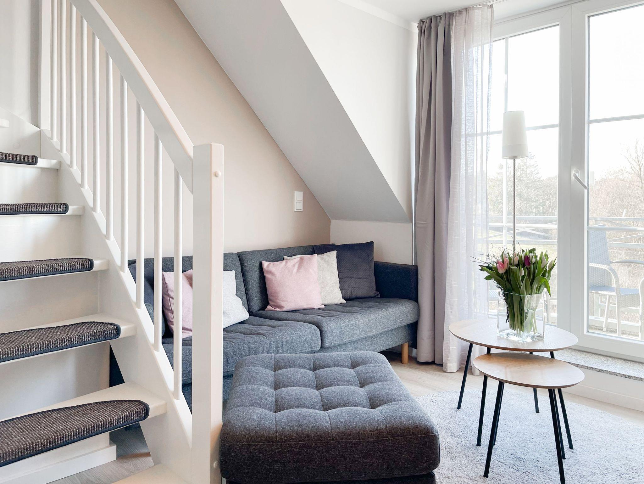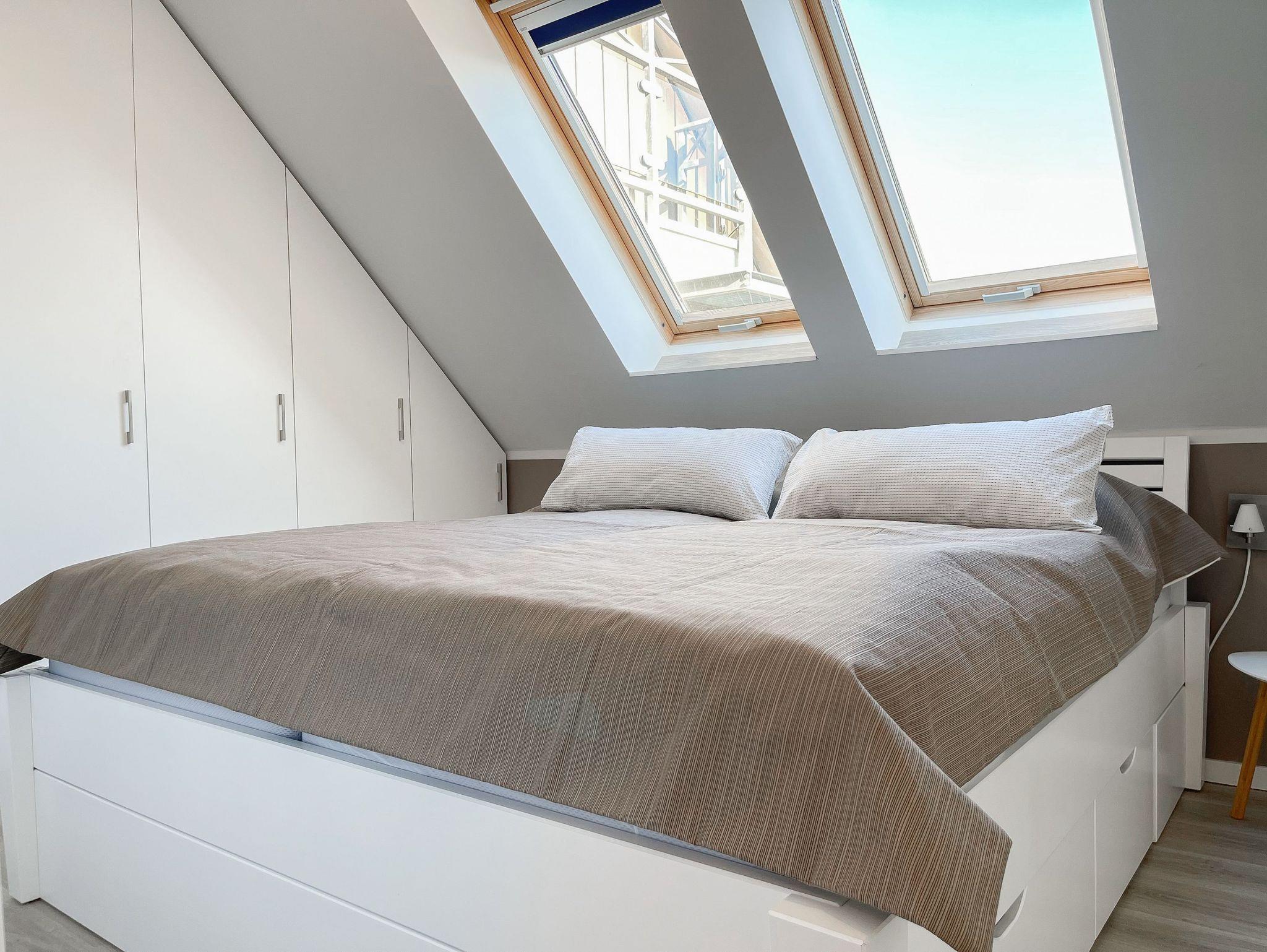Die Ferienwohnung liegt ganz oben im 3. Obergeschoss zur lichtdurchfluteten Südseite und erstreckt sich über 2 Ebenen. Der herrliche Sonnenbalkon in Südwestausrichtung liegt direkt vor dem Wohnbereich und ist mit Gartenmöbeln und einer elektrischen Markise ausgestattet.[nbsp] Die frisch renovierte Wohnung verfügt über ein gelungenes Raumkonzept mit geschmackvollen Details sowie eine hochwertige Ausstattung und lädt 4 Personen zum Wohlfühlen in Strandnähe ein. Es erwartet Sie ein heller, freundlicher Wohnraum mit bodentiefen Fensterflächen, geschmackvoll gestaltet und hochwertig eingerichtet mit einem Sofa, TV, Bluetoothradio und einem Essbereich für 4 Personen. WLAN steht selbstverständlich zur kostenlosen Nutzung zur Verfügung. Die integrierte Küche ist bestens ausgestattet, unter anderem mit Spülmaschine, Backofen, Nespressomaschine und vielem mehr. Die Wohnung bietet 2 separate Schlafzimmer, die beide mit einem Kleiderschrank, einem zusätzlichen TV und Verdunkelungsrollos ausgestattet sind. Das Schlafzimmer auf der unteren Wohnebene ist mit einem Doppelbett (180x200) eingerichtet. Auf der oberen Wohnebene, die über eine Treppe vom Wohnbereich zu erreichen ist, befindet sich das zweite Schlafzimmer mit sehr schönem Blick auf die Ostsee, ausgestattet mit[nbsp] einem Doppelbett (140x200) und einem Einzelbett (90x200). Das neue Bad verfügt über Dusche, WC, Waschtisch und Handtuchtrockner.