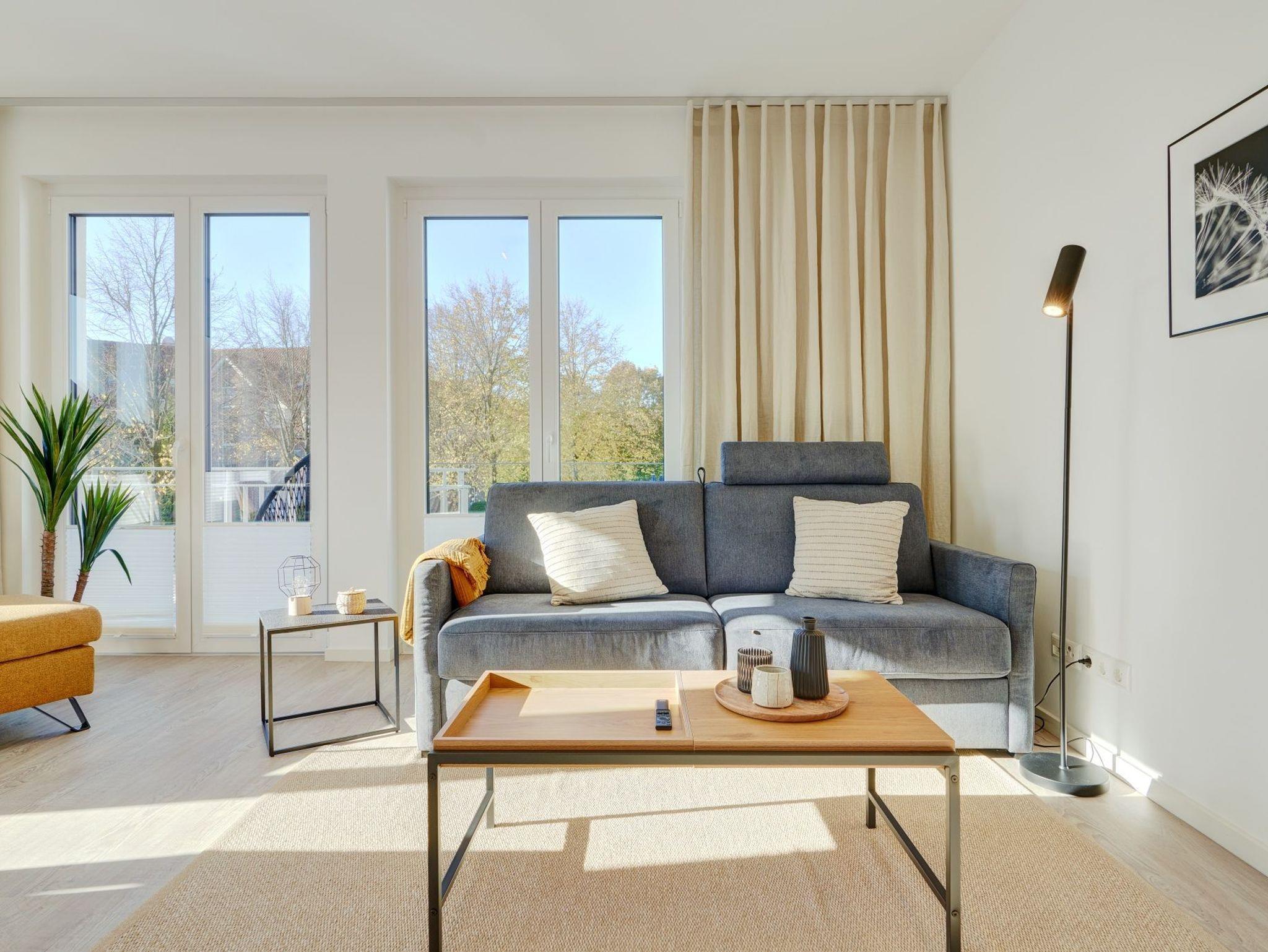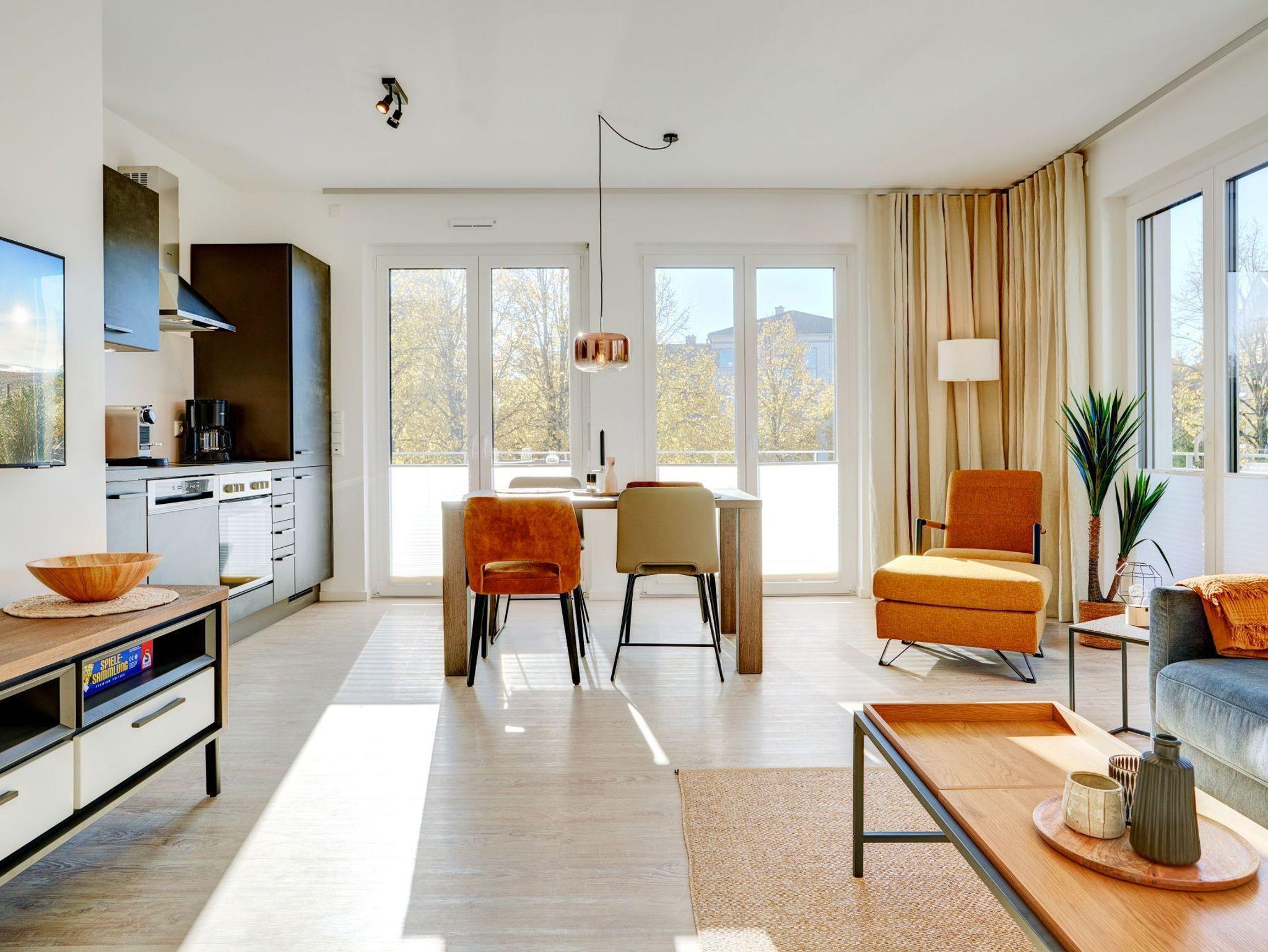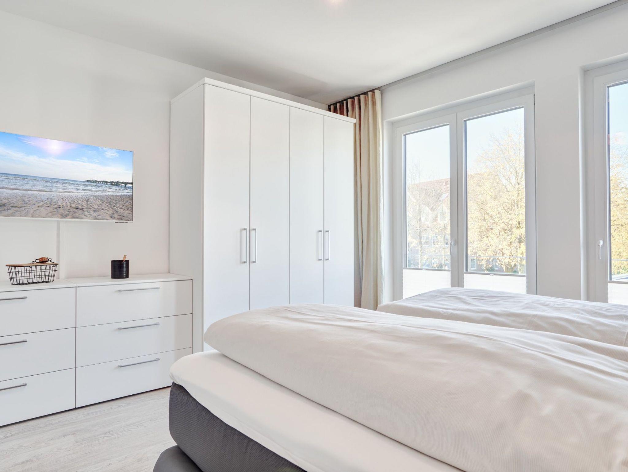 Die Ferienwohnung strahlt mit ihren bodentiefen Fenstern eine helle, behagliche Gemütlichkeit aus. Die Einbauküche im Wohn-Essbereich ist komplett ausgestattet und lässt keine Wünsche offen; Küchenzeile mit Backofen, Ceran-Kochfeld, Elektroherd,[nbsp] Geschirrspüler, Kühlschrank und Gefrierschrank, Filterkaffeemaschine, Krups-Kapsel-Maschine. Der Wohnbereich ist mit einem hochwertigen Sofa (kann mit wenigen leichten Handgriffen zu einem vollwertigen Bett umgebaut werden), einem Wohnzimmertisch, einem großen TV sowie einem Essbereich ausgestattet. Aus dem Wohnbereich gelangen Sie auf den herrlichen Sonnenbalkon nach Südwesten. Hier stehen Ihnen Tisch und Stühle sowie ein Relaxsessel zur Verfügung. Das Schlafzimmer ist mit einem Boxspringbett (180x200) ausgestattet und verfügt über einen Kleiderschrank, 2 Nachttische und einen TV. Sind Sie es gewohnt, im Dunkeln zu schlafen? Kein Problem, denn es stehen Ihnen elektrische Außenrollläden zur Verfügung. Das Duschbad in heller Optik mit bodengleicher Dusche und Handtuchheizkörper, Fön, Kosmetikspiegel. Großer, halb umlaufender Südwestbalkon mit Tisch und Stühlen sowie zwei Relax-Sesseln. Die gesamte Wohnung ist mit einer Fußbodenheizung sowie mit einem Sicht- bzw. Lichtschutz an allen Fenstern und zusätzlichen elektrischen Rollläden ausgestattet.