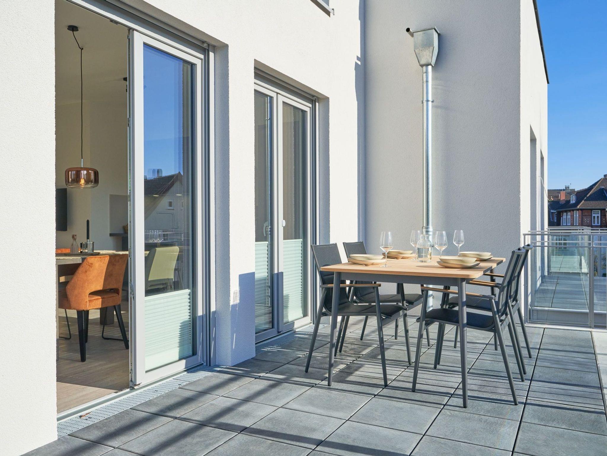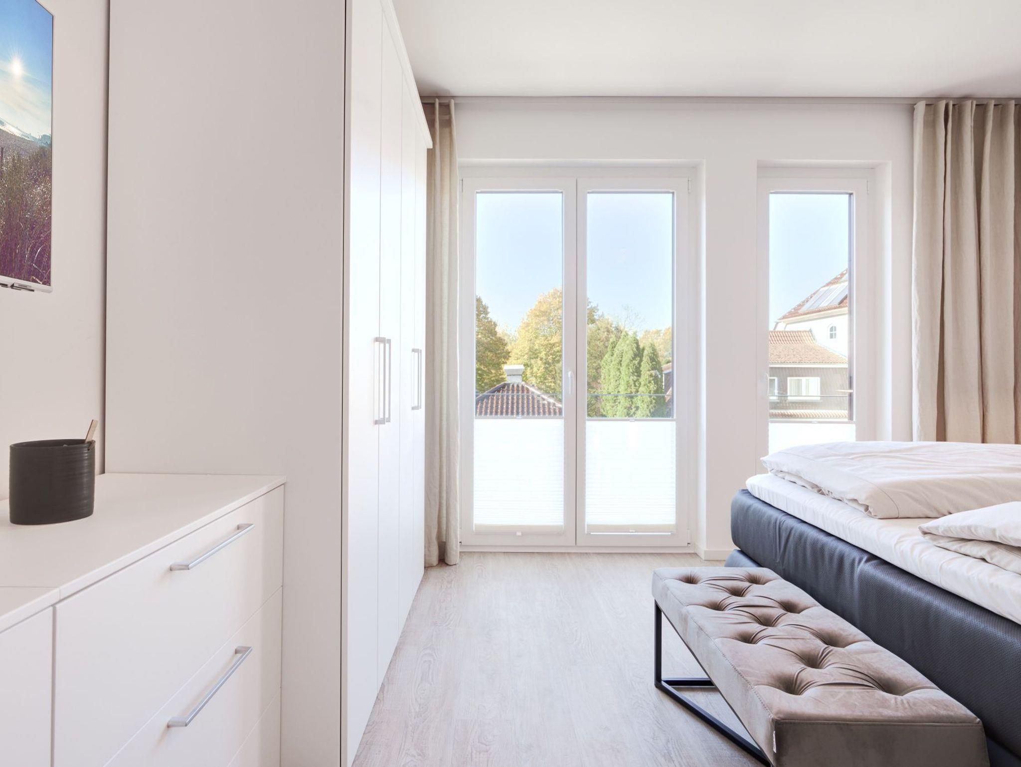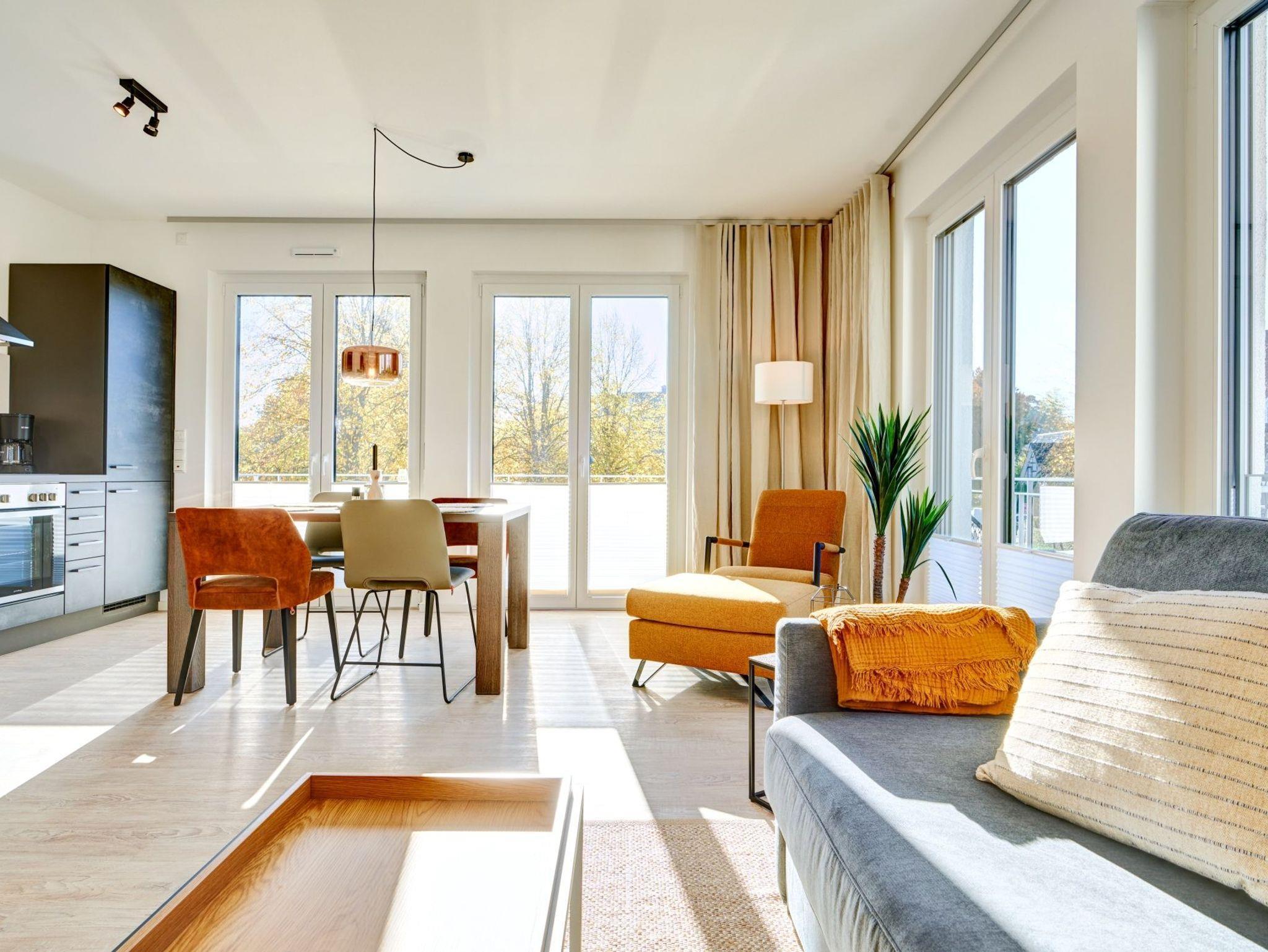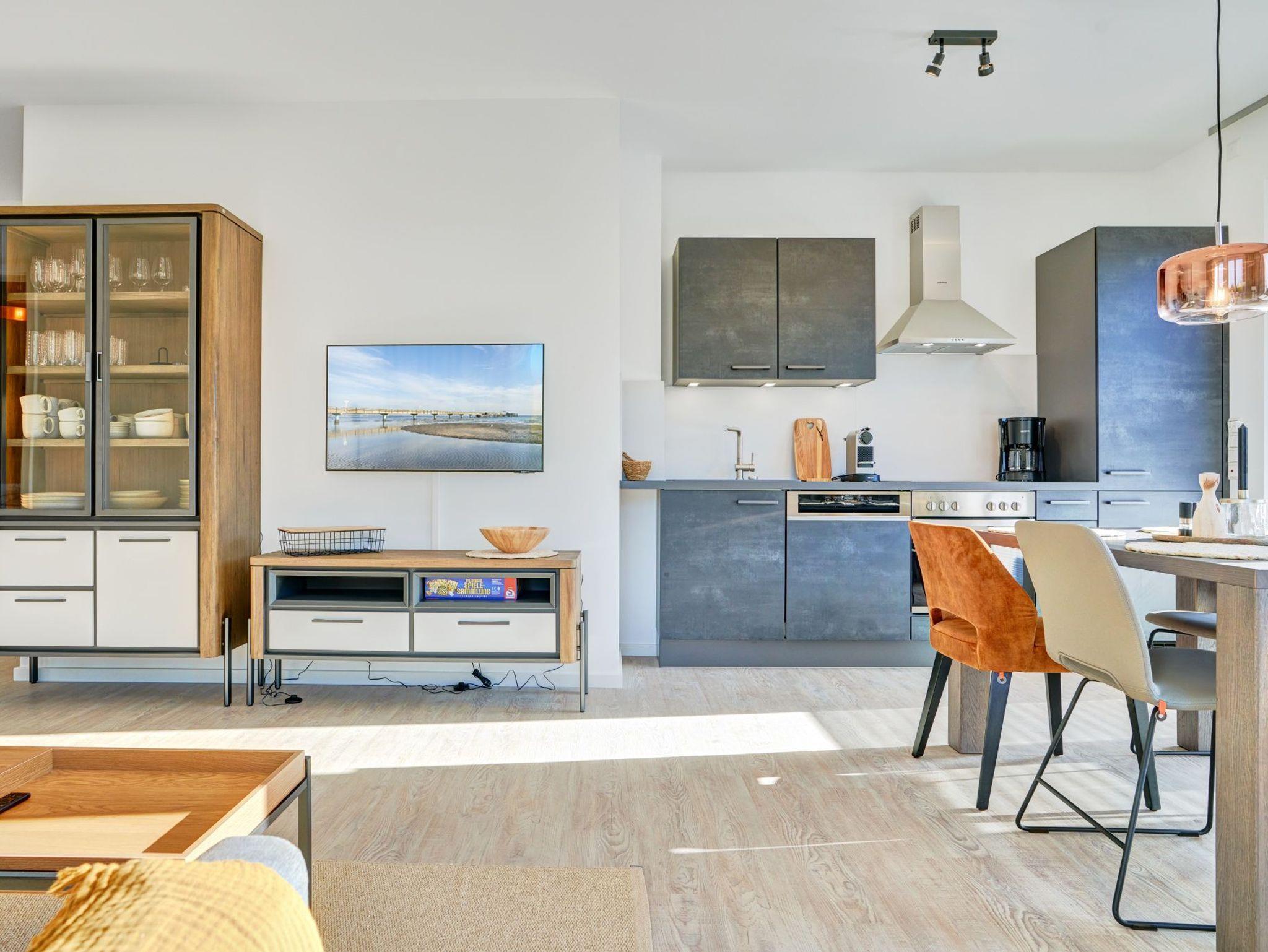 Die Ferienwohnung strahlt mit ihren bodentiefen Fenstern eine helle, behagliche Gemütlichkeit aus. Die Einbauküche im Wohn-Essbereich ist komplett ausgestattet und lässt keine Wünsche offen; Küchenzeile mit Backofen, Ceran-Kochfeld, Elektroherd,[nbsp] Geschirrspüler, Kühlschrank und Gefrierschrank, Filterkaffeemaschine, Krups-Kapsel-Maschine. Der Wohnbereich ist mit einem hochwertigen Sofa (kann mit wenigen leichten Handgriffen zu einem vollwertigen Bett umgebaut werden), einem Wohnzimmertisch, einem großen TV sowie einem Essbereich ausgestattet. Aus dem Wohnbereich gelangen Sie auf den herrlichen Sonnenbalkon nach Südwesten. Hier stehen Ihnen Tisch und Stühle sowie ein Relaxsessel zur Verfügung. Das Schlafzimmer ist mit einem Boxspringbett (180x200) ausgestattet und verfügt über einen Kleiderschrank, 2 Nachttische und einen TV. Sind Sie es gewohnt, im Dunkeln zu schlafen? Kein Problem, denn es stehen Ihnen elektrische Außenrollläden zur Verfügung. Das Duschbad in heller Optik mit bodengleicher Dusche und Handtuchheizkörper, Fön, Kosmetikspiegel. Großer, halb umlaufender Südwestbalkon mit Tisch und Stühlen sowie zwei Relax-Sesseln. Die gesamte Wohnung ist mit einer Fußbodenheizung sowie mit einem Sicht- bzw. Lichtschutz an allen Fenstern und zusätzlichen elektrischen Rollläden ausgestattet.