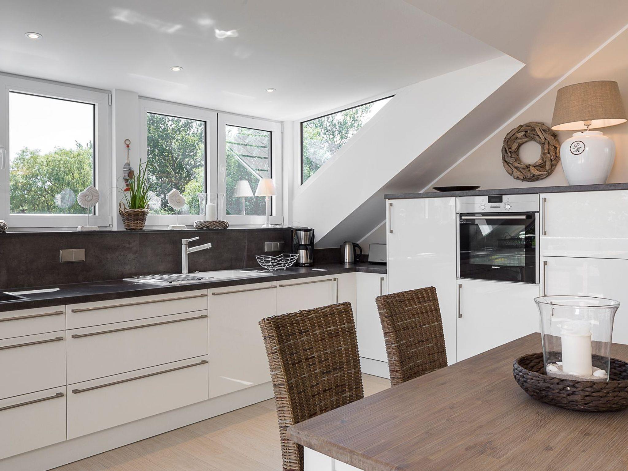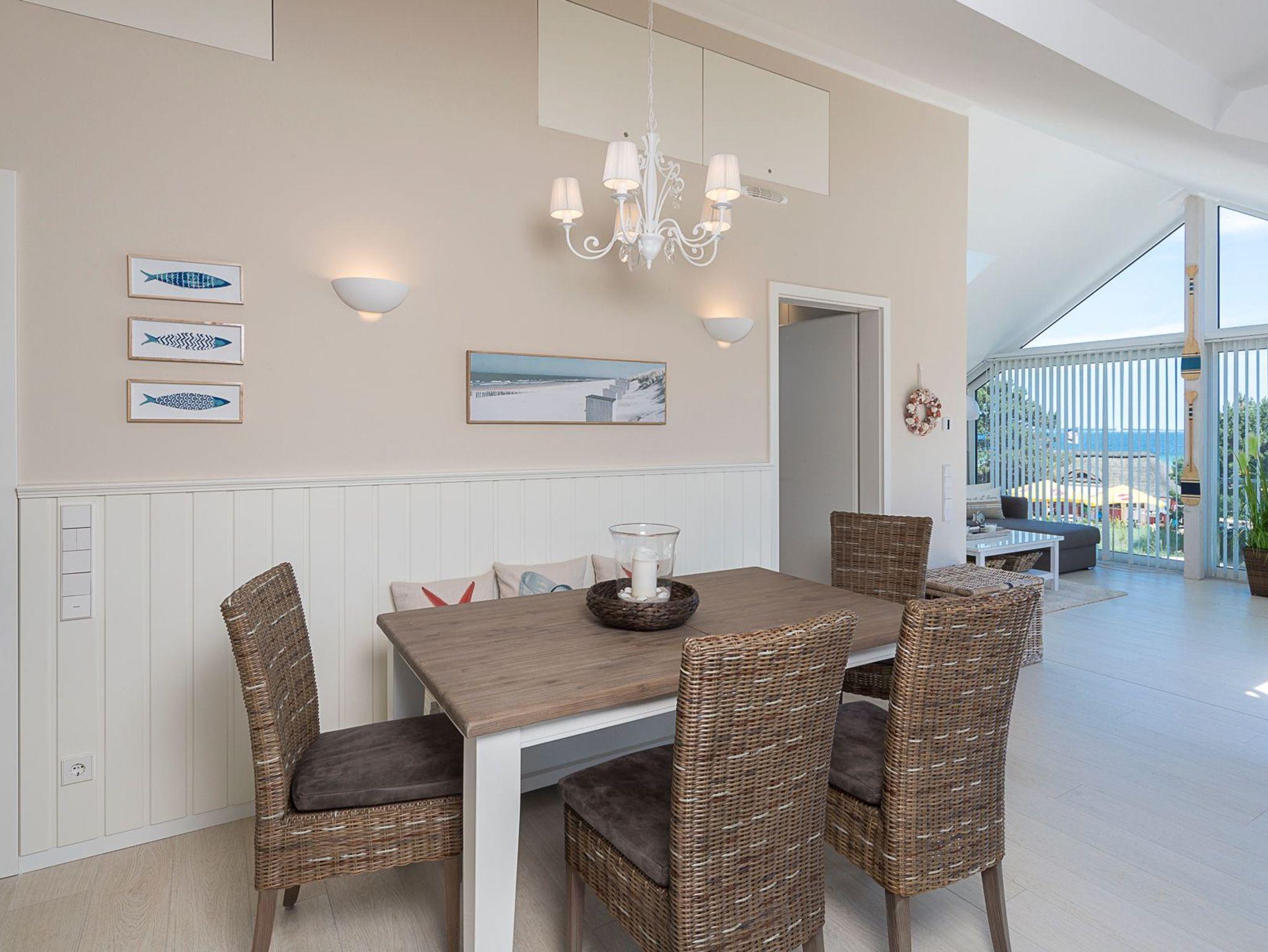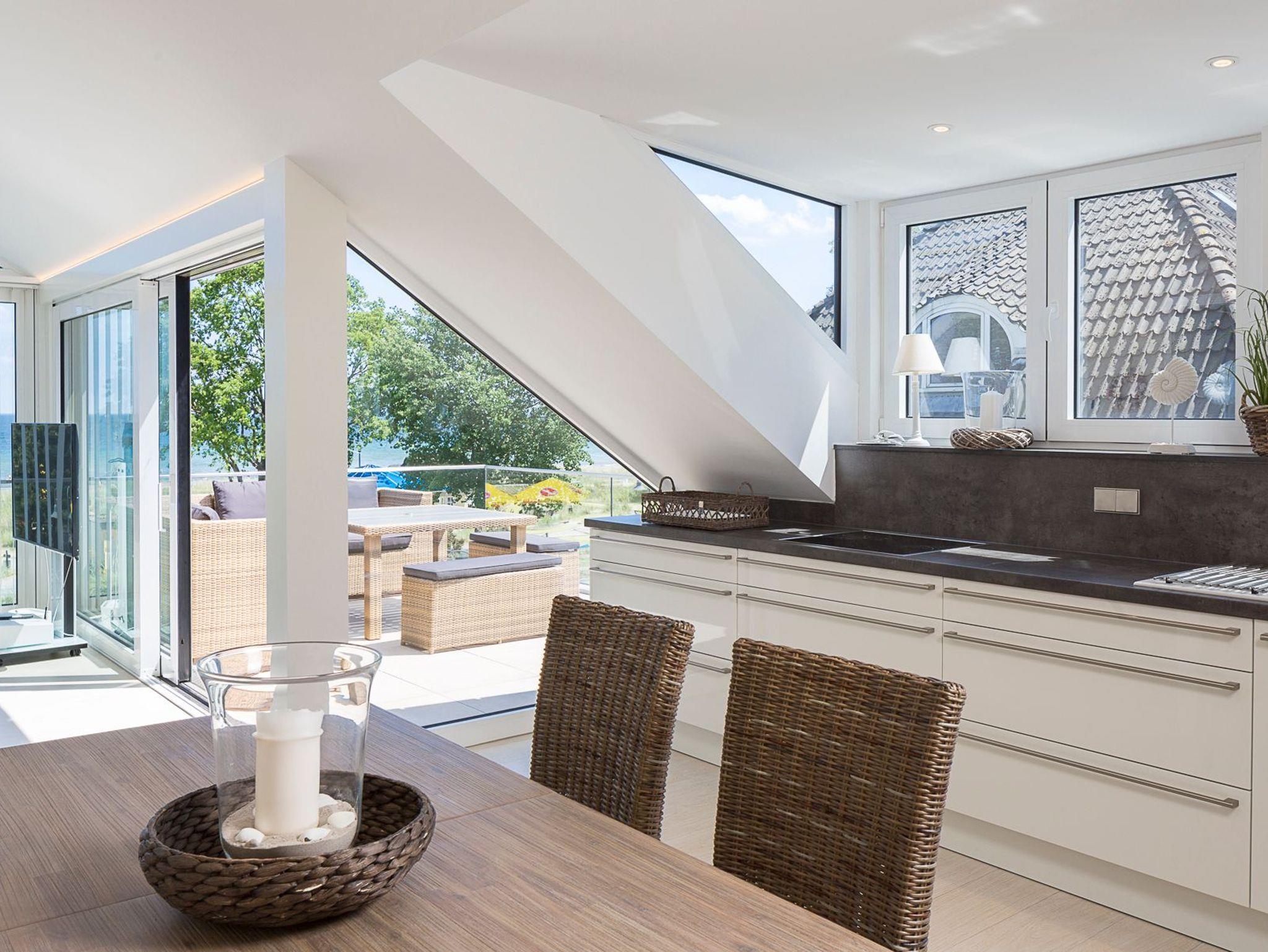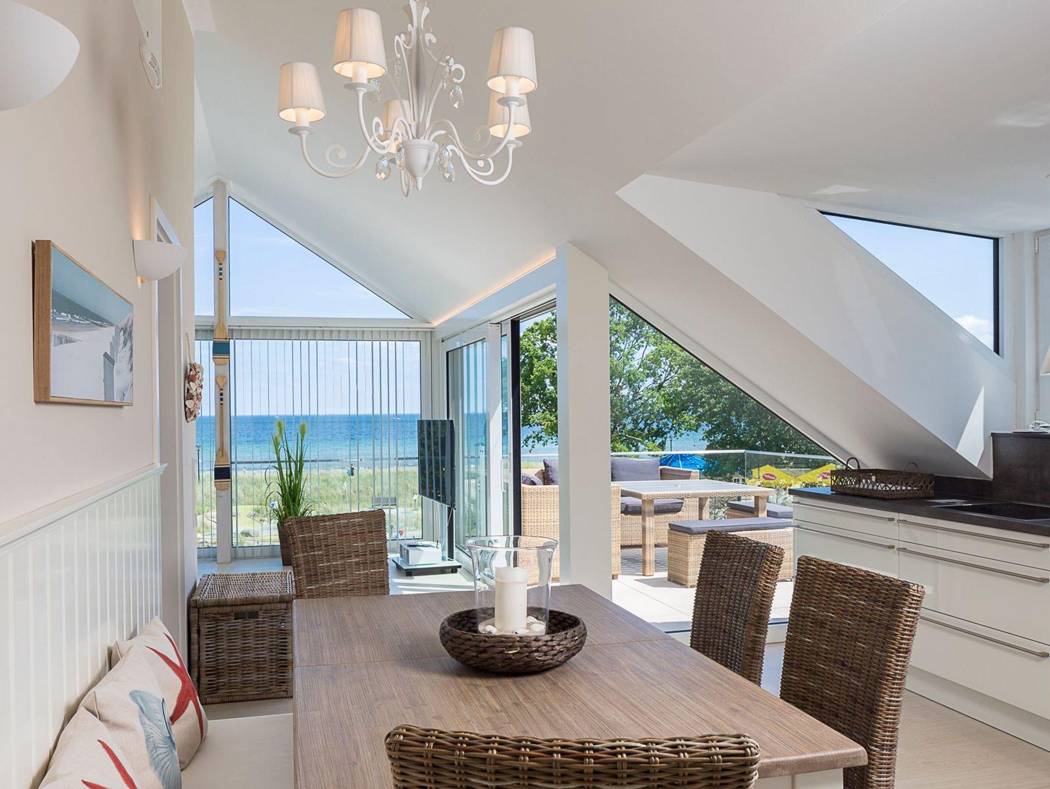Es erwartet Sie schon beim Betreten der Wohnung der herrliche Blick auf die Ostsee. Der Wohnbereich dieser Traumwohnung ist durch die bodentiefen Fenster und großen Dachfenster absolut hell und lichtdurchflutet, selbstverständlich ist bei Bedarf ein Sichtschutz vorhanden. Der moderne Wohnbereich bietet Ihnen einen gemütlichen Essbereich (auch von hier genießen Sie die großartige Sicht auf die Ostsee), mit ausreichend Platz für 5 Personen. Hier können Sie bequem essen sowie gesellige Stunden verbringen. Die moderne Küche ist komplett ausgestattet und lässt keine Wünsche offen.