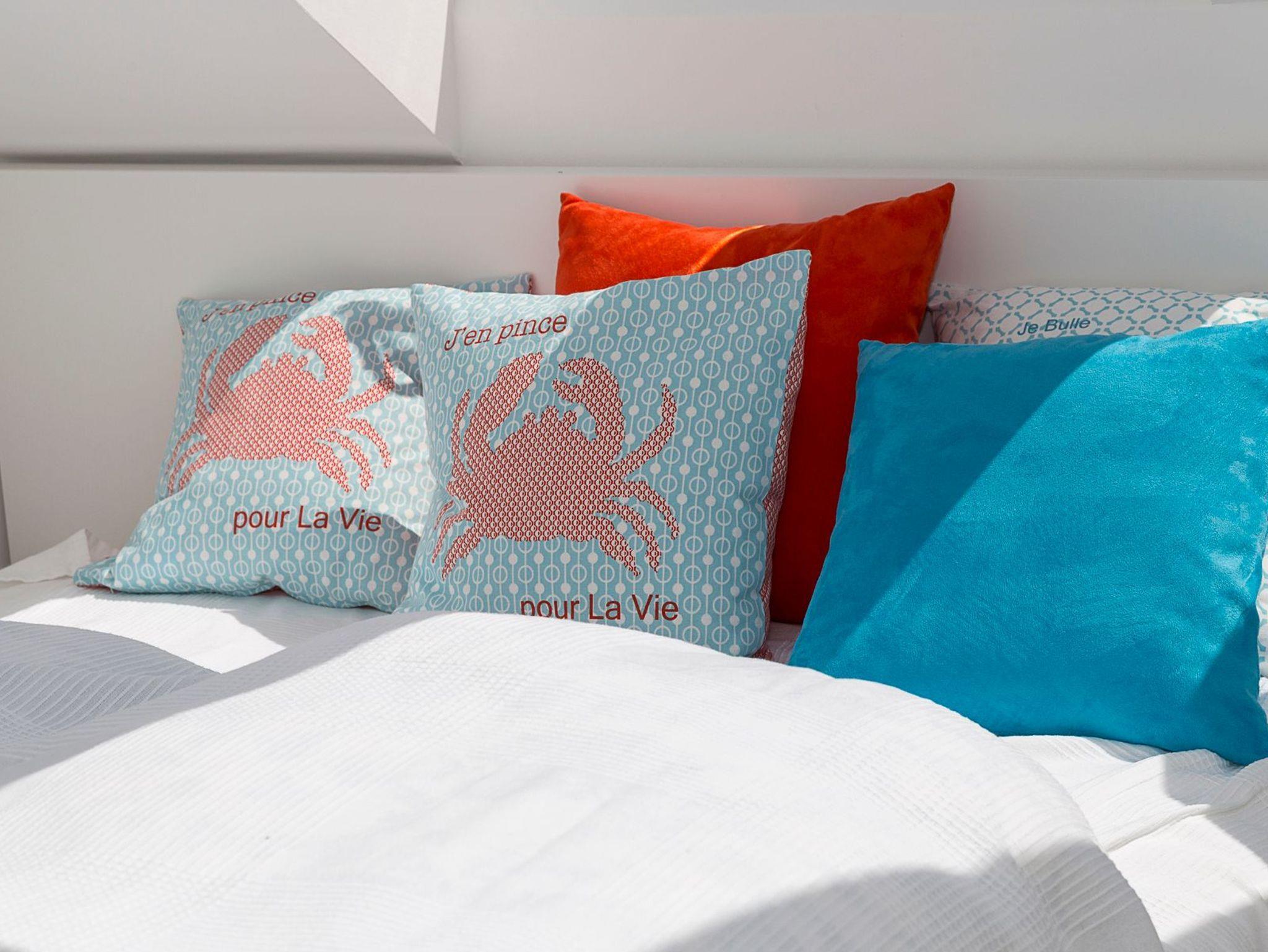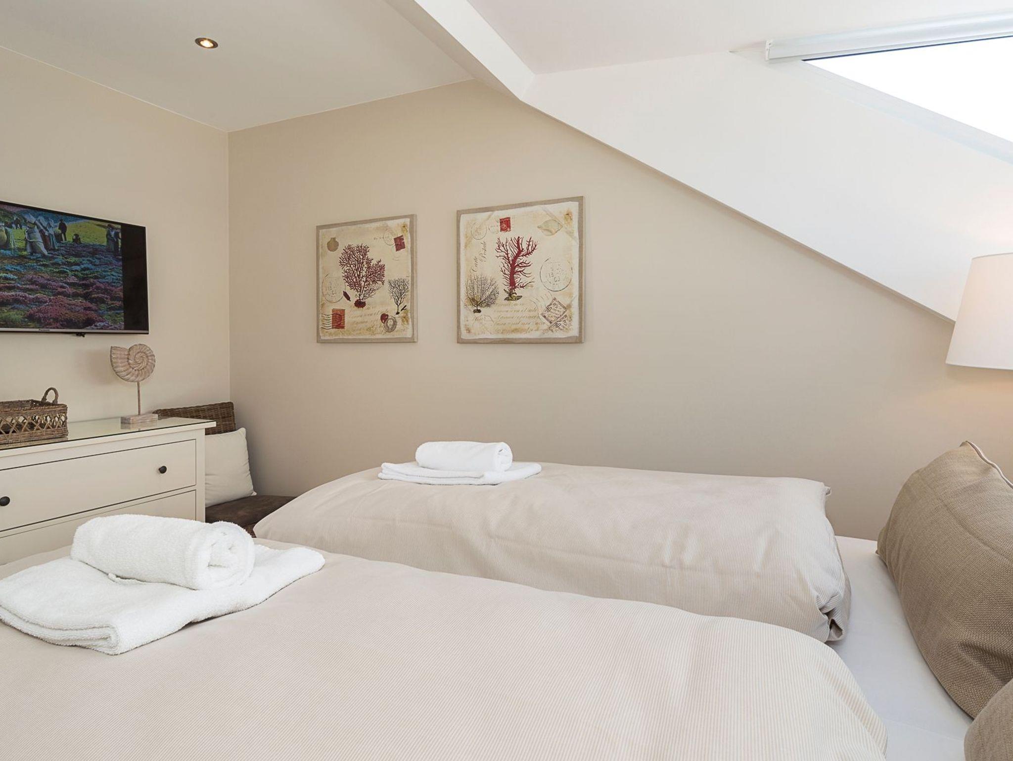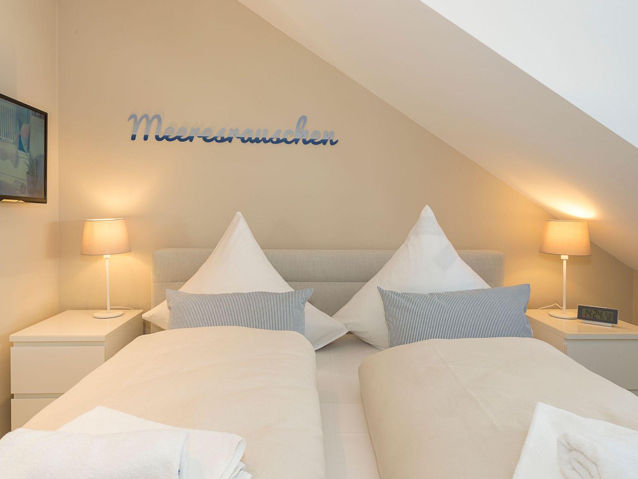 Der Wohnbereich ist mit einem großen Ecksofa und einem Tisch eingerichtet. Neben einem Flach-TV steht Ihnen selbstverständlich kostenloses WLAN zur Verfügung. Das Bad verfügt über Tageslicht, eine bodentiefe Dusche, eine Badewanne und Fußbodenheizung. Die Schlafzimmer sind mit Boxspringbetten (1,80 x 2,00m), Kleiderschrank sowie mit je einem TV ausgestattet.