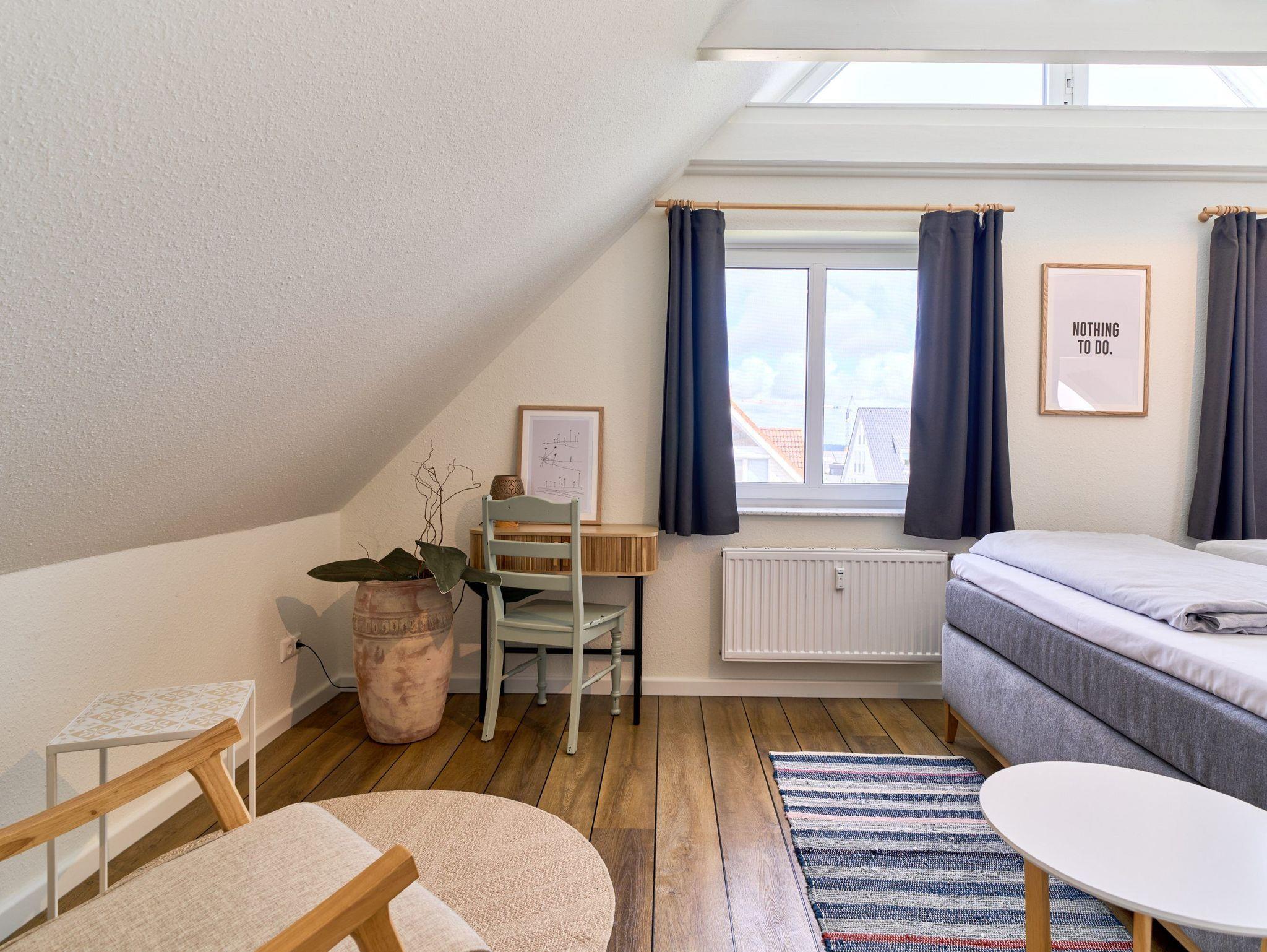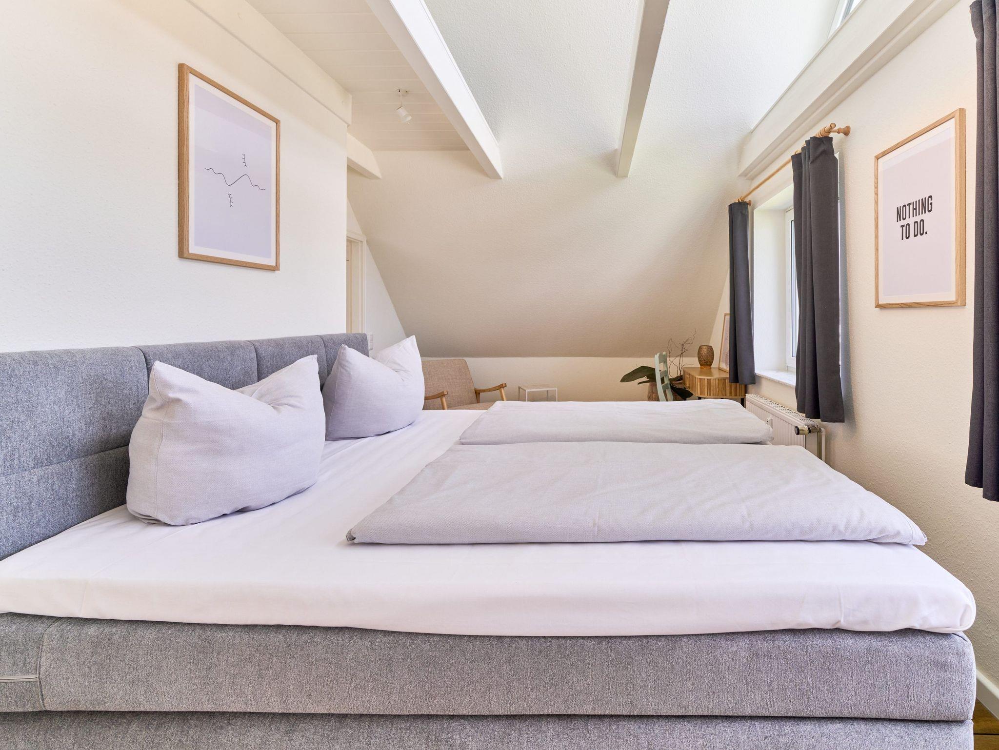 Führen Sie Ihren Rundgang fort und gelangen Sie über einen kleinen Flur in das gemütliche Schlafzimmer mit Boxspringbett (1,80m x2,00m) und Einbauschränken. Angrenzend befindet sich das komplett neu renovierte Badezimmer mit einer ebenerdigen Dusche sowie einer Badewanne für besondere Entspannungsmomente. Kosmetikspiegel und Haartrockner sind selbstverständlich vorhanden.