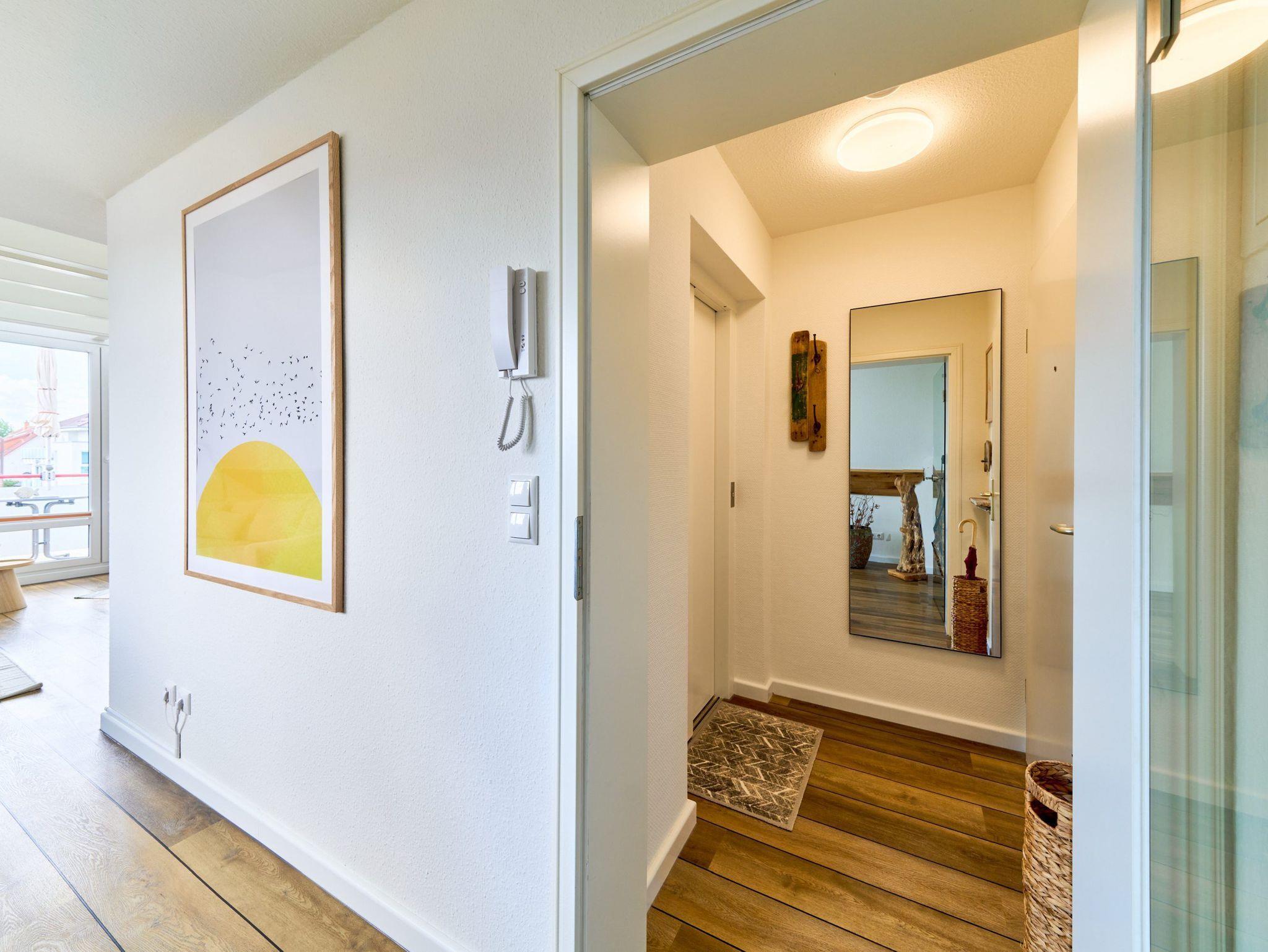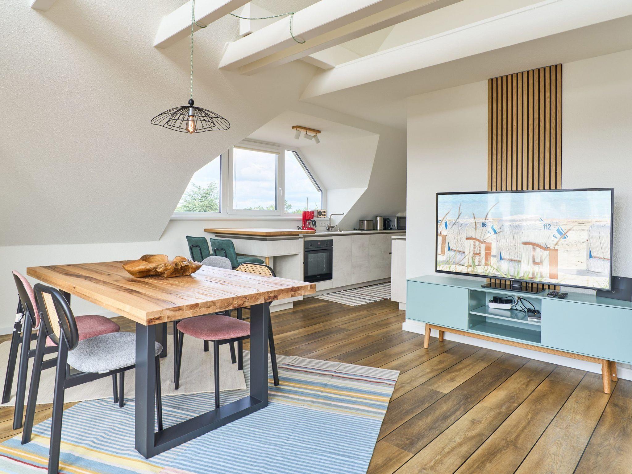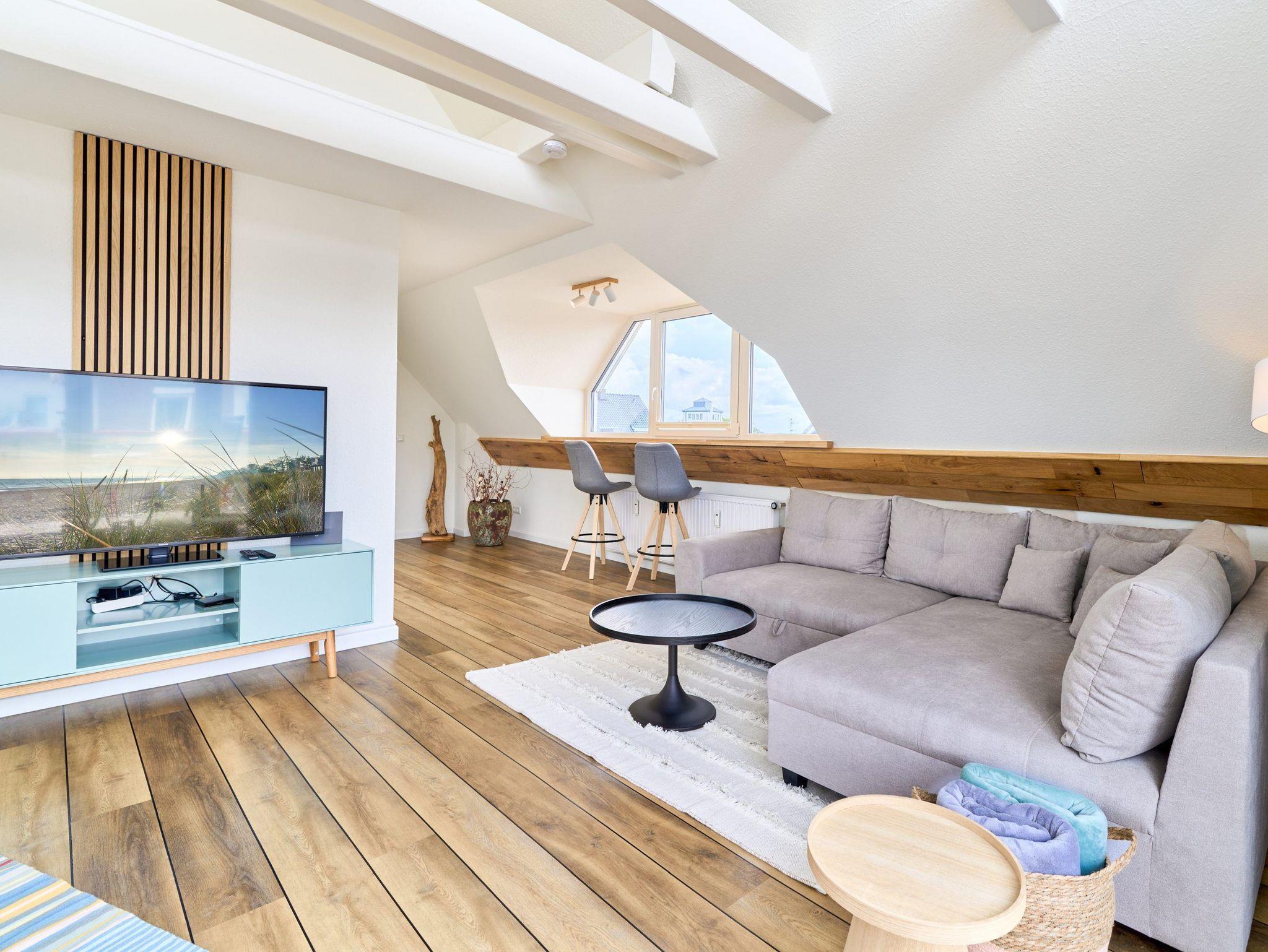 2-Zimmer,[nbsp] 80m², im 3. Obergeschoss, mit Süd-Balkon. Diese moderne Wohnung verzaubert mit ihrem besonderen Grundriss: machen Sie einen Rundgang. Sie gelangen über den Fahrstuhl direkt in die Wohnung und den kleinen Vorflur. Von dort aus gelangen Sie in den schönen Wohn-Essbereich, hier erwartet Sie eine gemütliche Sofalandschaft, ein Smart-TV (58), ein stilvoller Esstisch sowie eine voll ausgestattete Einbauküche mit Spülmaschine, Induktionsherd, Backofen und Mikrowelle. Neben einer Filterkaffeemaschine steht Ihnen auch eine Nespresso-Maschine zur Verfügung. Treten Sie hinaus auf den sonnigen Südbalkon und genießen Sie den Teilmeerblick. WLAN steht Ihnen für Entertainment und digitales Erleben zur Verfügung.