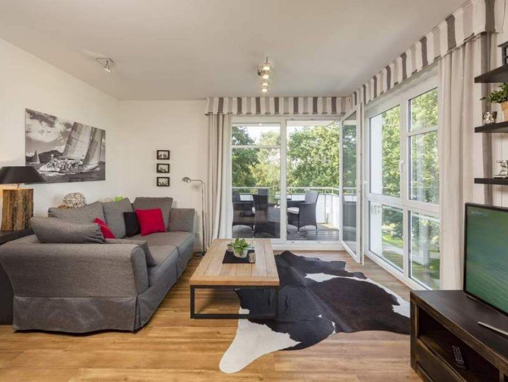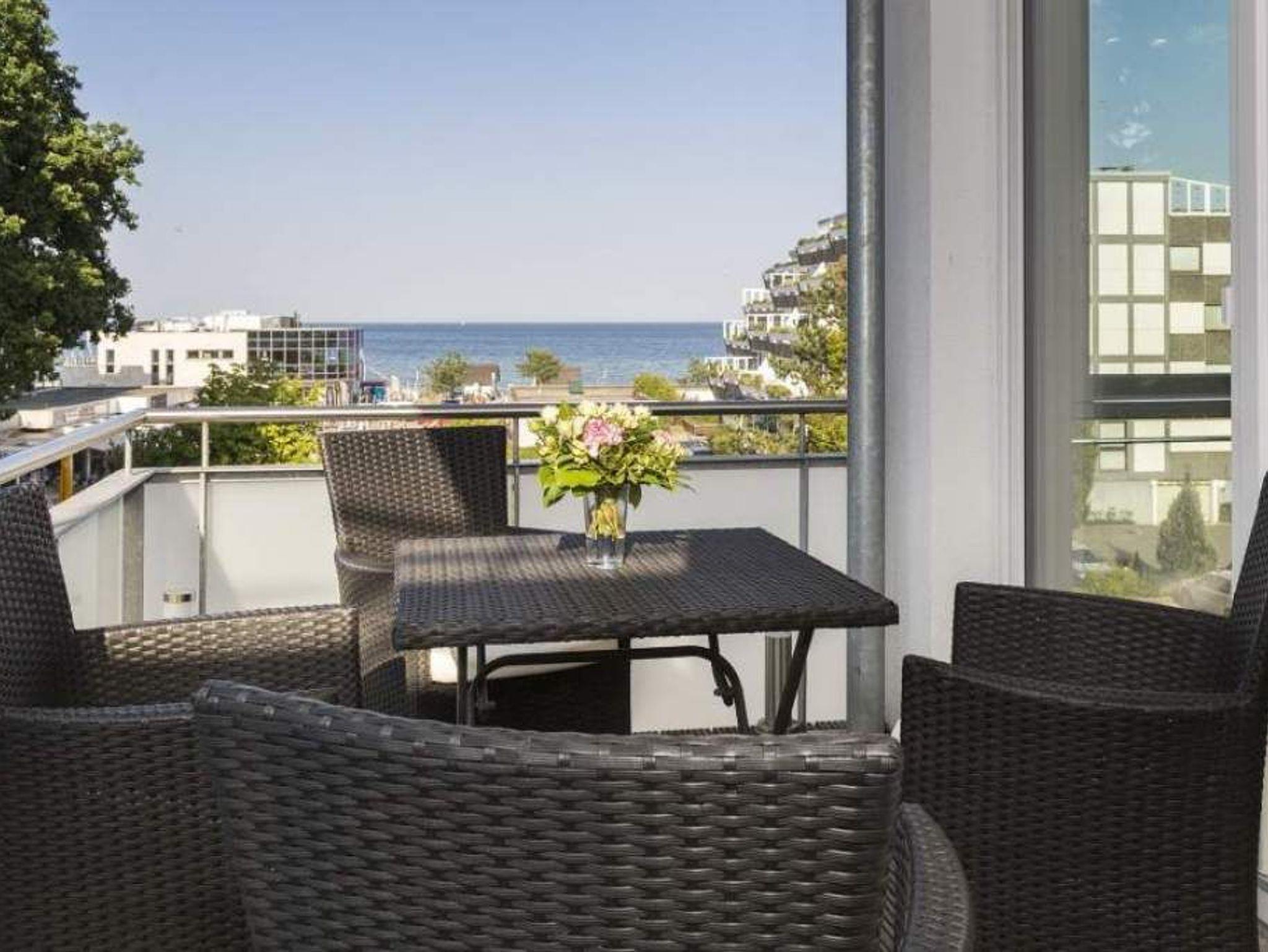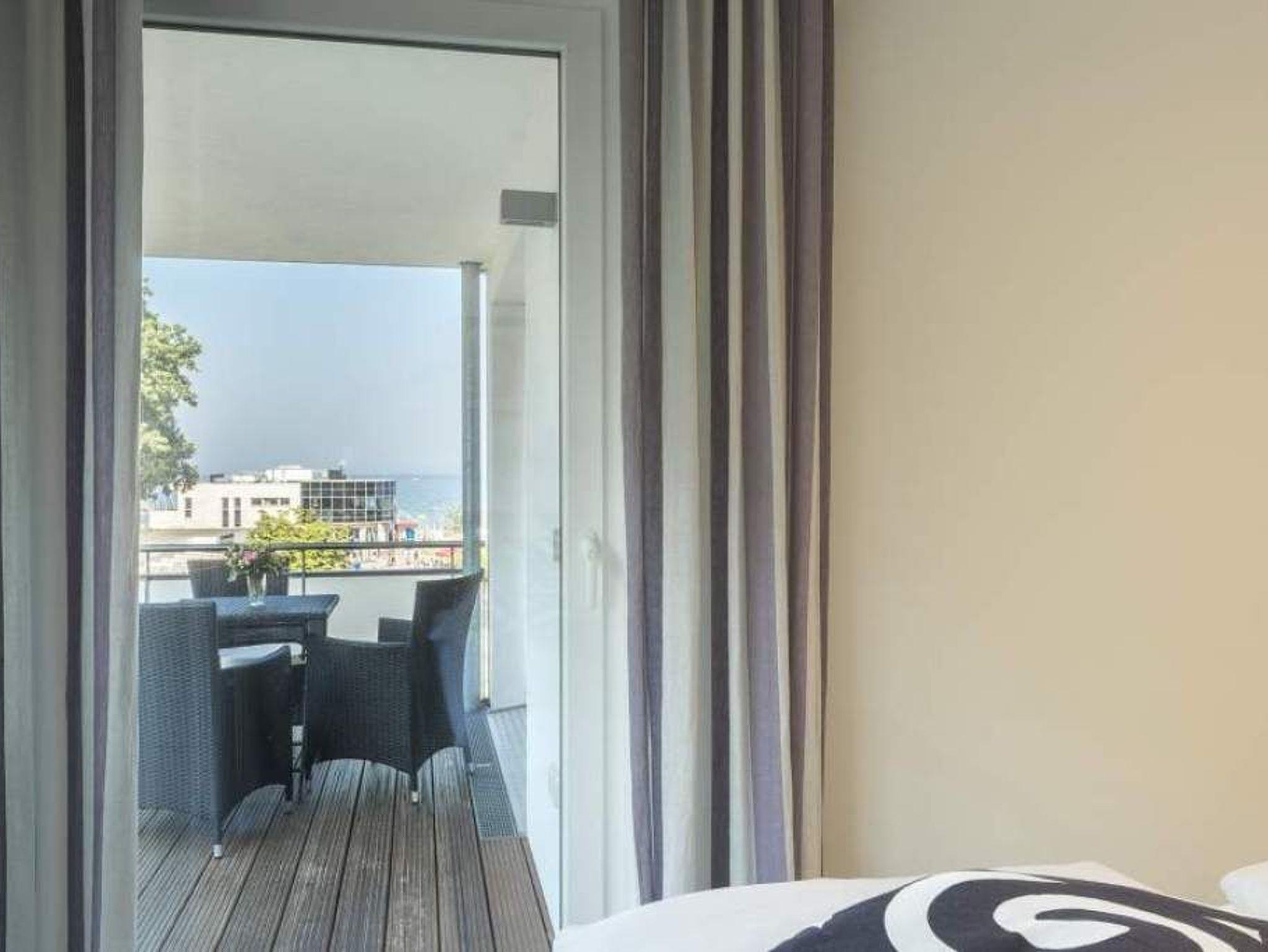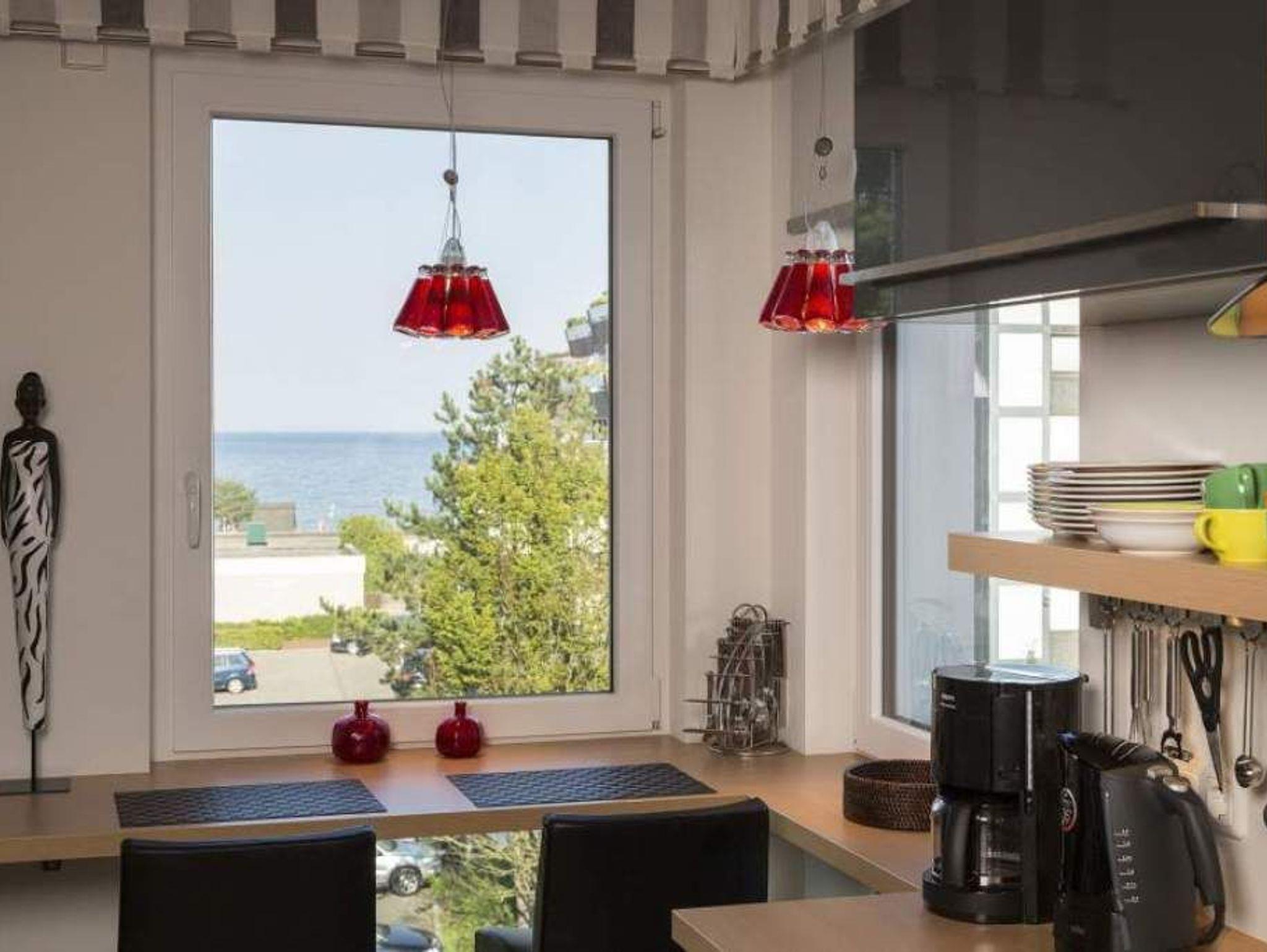 Diese Ferienwohnung mit tollem Blick über die Ostsee lädt Sie zum Entspannen ein. Der gemütliche Wohnbereich mit bodentiefen Fenstern ist mit einem gemütlichen Sofa ausgestattet, von welchem Sie bequem den Blick über die Ostsee genießen können. Neben einem Flachbildfernseher und einem BluRay-Player steht Ihnen selbstverständlich kostenloses WLAN zur Verfügung. Der überdachte Balkon, mit Blick auf die Ostsee oder in den Kurpark, ist mit einem Tisch und Stühlen ausgestattet. Die moderne Küche mit Tresen lässt keine Wünsche offen. Im gemütlichen Schlafzimmer stehen ein bequemes Bett (1,80 x 2,00m, Einzelmatratzen) sowie ein geräumiger Schrank zur Verfügung. Von dem Schreibtisch, der im Flur steht, haben Sie einen schönen Meerblick. Das Badezimmer verfügt über einen Doppelwaschtisch, eine bodentiefe Dusche und einen abgegrenzten WC-Bereich. Neben der Fußbodenheizung ist hier ein zusätzlicher Handtuchheizkörper angebracht.