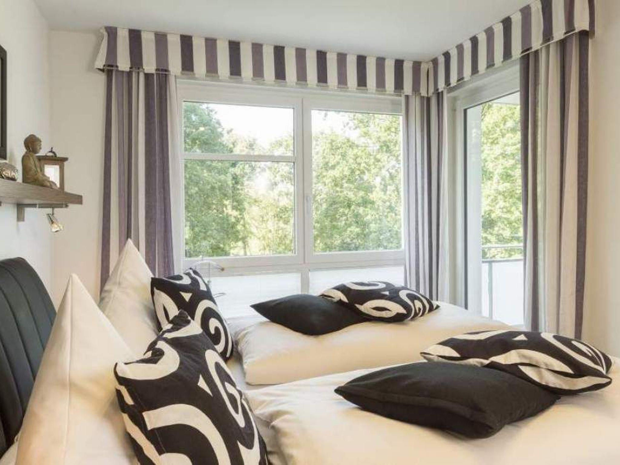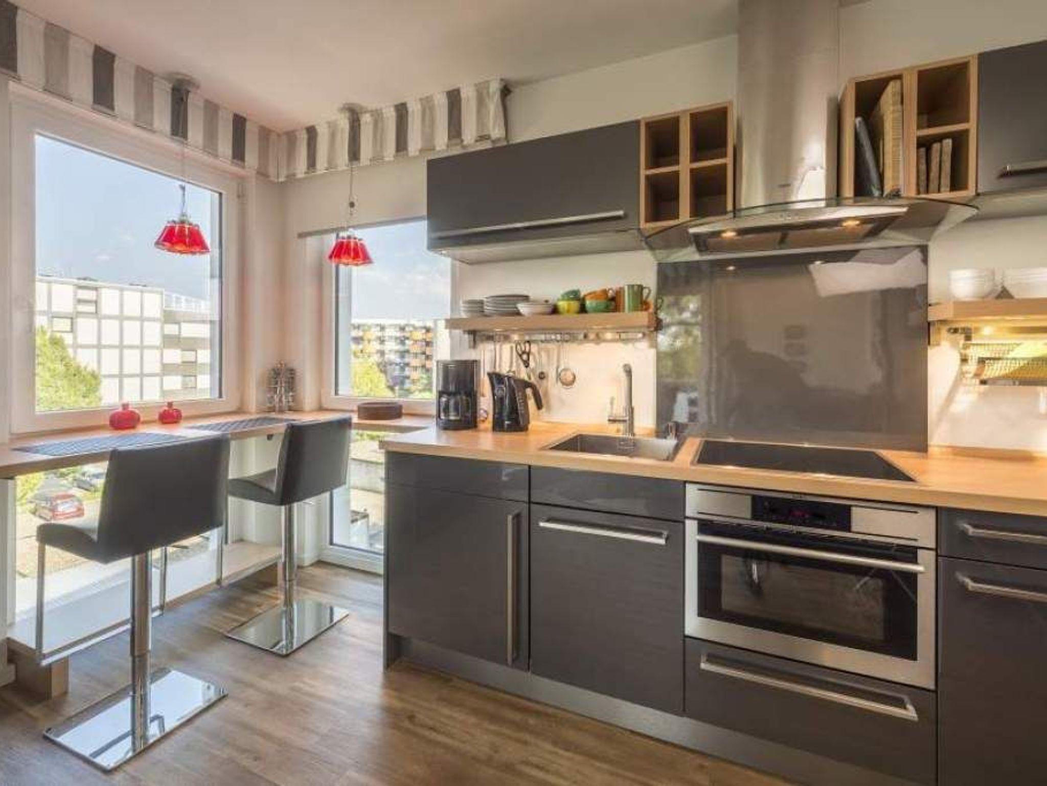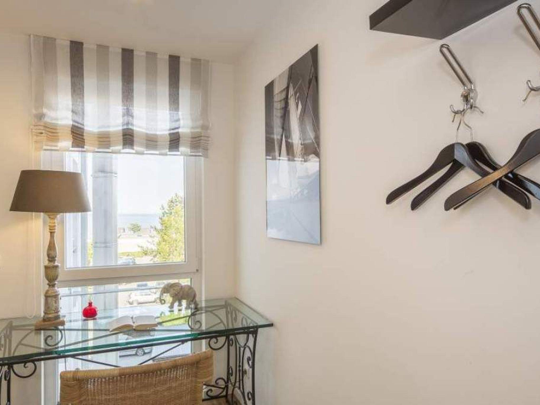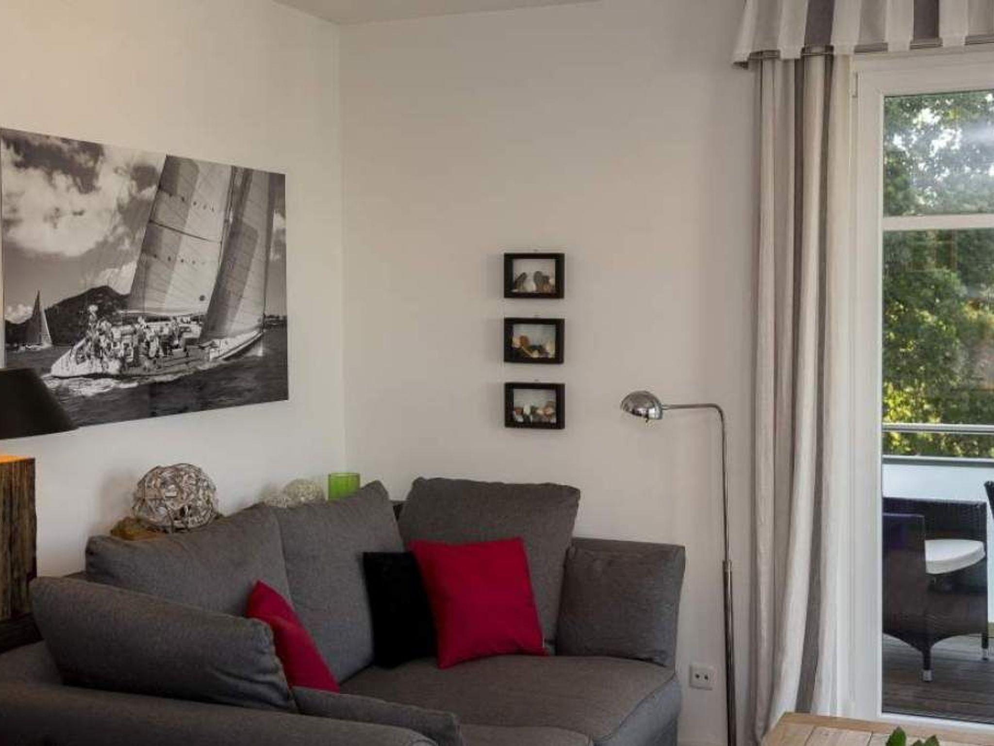 Diese Ferienwohnung mit tollem Blick über die Ostsee lädt Sie zum Entspannen ein. Der gemütliche Wohnbereich mit bodentiefen Fenstern ist mit einem gemütlichen Sofa ausgestattet, von welchem Sie bequem den Blick über die Ostsee genießen können. Neben einem Flachbildfernseher und einem BluRay-Player steht Ihnen selbstverständlich kostenloses WLAN zur Verfügung. Der überdachte Balkon, mit Blick auf die Ostsee oder in den Kurpark, ist mit einem Tisch und Stühlen ausgestattet. Die moderne Küche mit Tresen lässt keine Wünsche offen. Im gemütlichen Schlafzimmer stehen ein bequemes Bett (1,80 x 2,00m, Einzelmatratzen) sowie ein geräumiger Schrank zur Verfügung. Von dem Schreibtisch, der im Flur steht, haben Sie einen schönen Meerblick. Das Badezimmer verfügt über einen Doppelwaschtisch, eine bodentiefe Dusche und einen abgegrenzten WC-Bereich. Neben der Fußbodenheizung ist hier ein zusätzlicher Handtuchheizkörper angebracht.