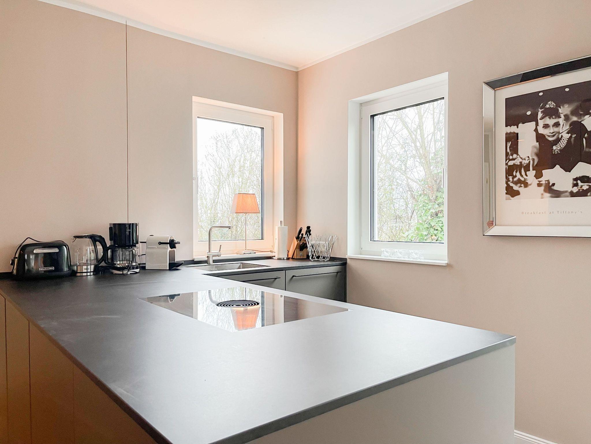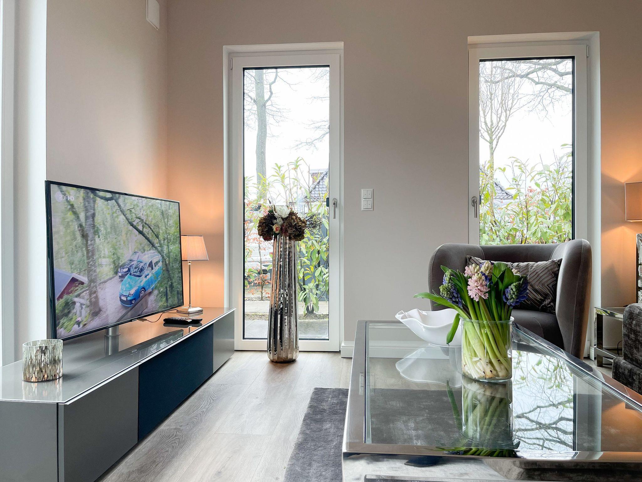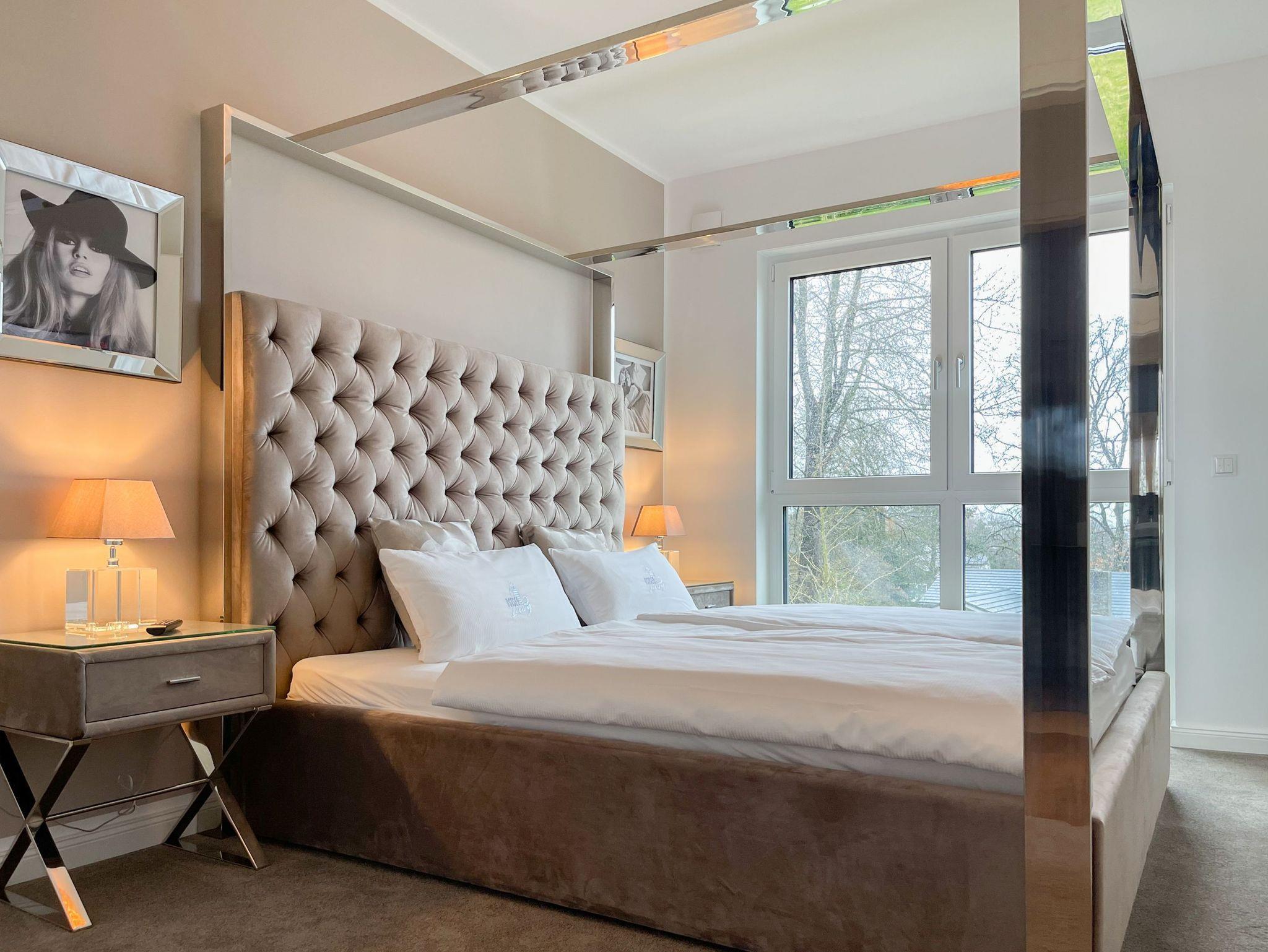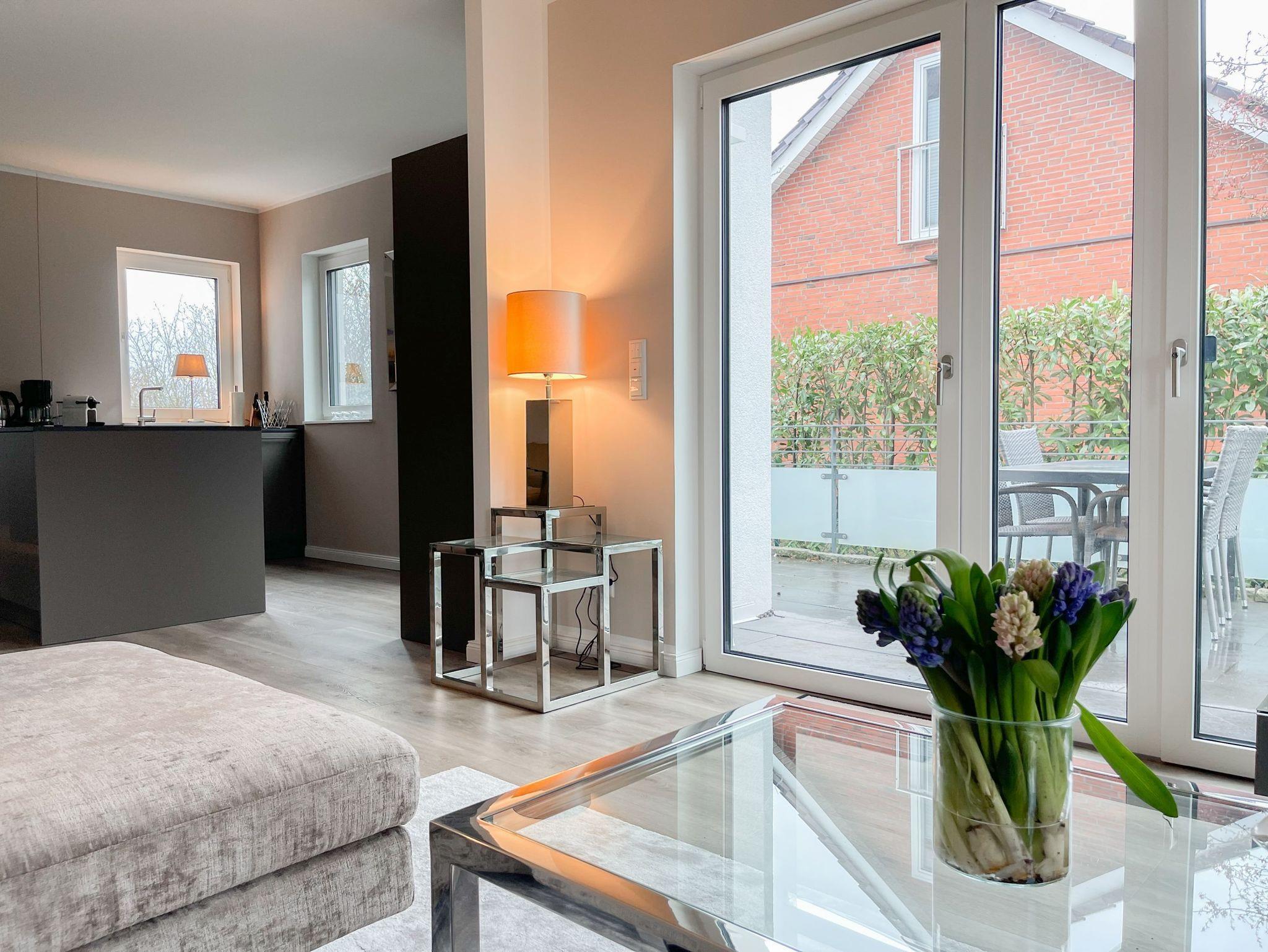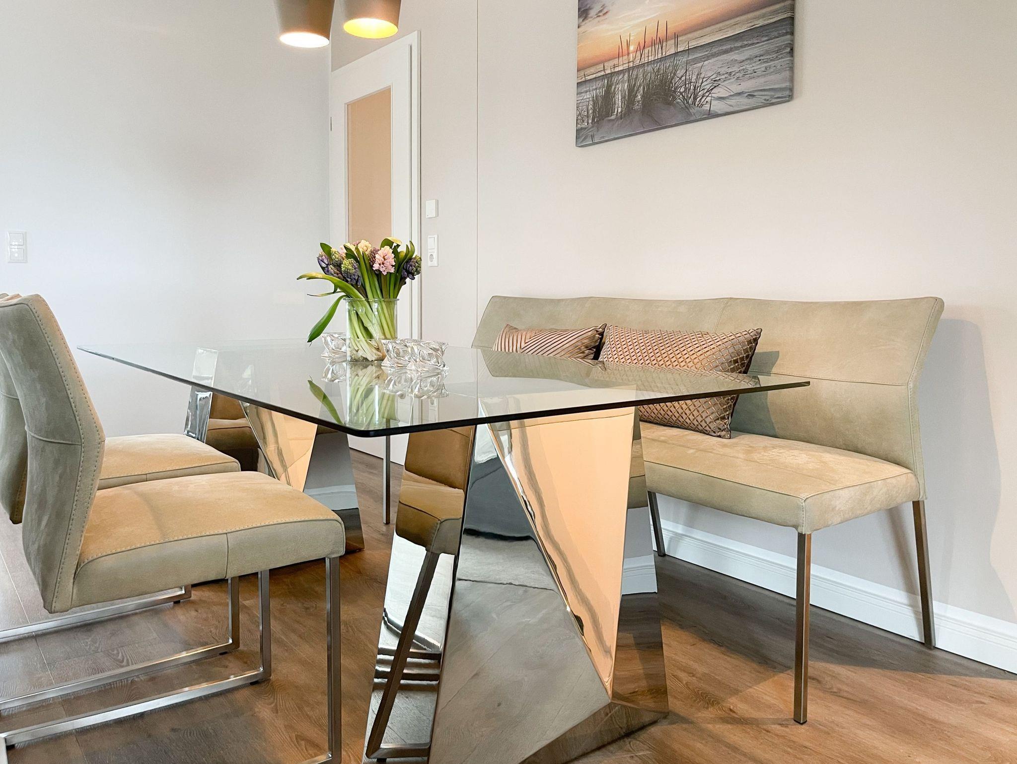 Es erwartet Sie eine äußerst hochwertig ausgestattete und geschmackvoll eingerichtete Ferienwohnung, die mit 2 separaten Schlafzimmern ausreichend Raum für 4 Personen bietet, um einen entspannten Urlaub in einem herrlichen Ambiente zu verleben. Fußbodenheizung, elektrische Außenjalousien und bodentiefe Fensterelemente, die für ein offenes Raumgefühl sorgen, gewährleisten einen hohen Wohnstandard. Mittelpunkt der Ferienwohnung bildet die Siematic Design Küche mit Kochinsel in bester Ausstattung, die zum gemeinsamen Kochen einlädt und der anschließende Essbereich im Hampton Style. Der behagliche Wohnbereich, eingerichtet mit Sofa und TV, bietet Blick und Zugang auf die großzügig angelegte Südostterrasse mit Gartenmöbeln und Sonnenliegen, um den Tag bei einem Glas Wein mit Ostseeblick ausklingen zu lassen. Beide Schlafzimmer bieten einen herrlichen Ausblick bis auf[nbsp] das Meer und sind mit hochwertigem Teppichboden, Doppelbetten (180x200)[nbsp] und einem Kleiderschrank ausgestattet. Eines der Schlafzimmer ist zusätzlich mit einem TV ausgestattet. Im Flur des Eingangsbereichs befindet sich ein weiterer Einbauschrank zum Unterbringen von Jacken Mänteln. Das Bad ist sehr hochwertig und modern, ausgestattet mit einer XXL Walk In Dusche. Waschmaschine und Trockner befinden sich in einem Einbauschrank. WLAN steht selbstverständlich zur kostenlosen Nutzung zur Verfügung.