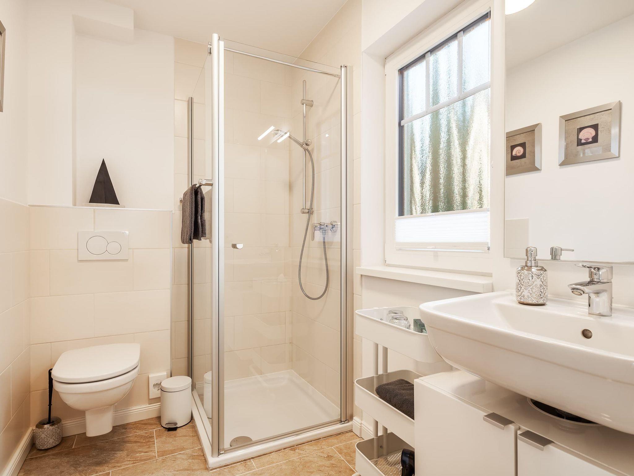 Im geräumigen Duschbad finden Sie nicht nur eine erfrischende Dusche, sondern auch einen großzügigen Schrank für Ihre persönlichen Gegenstände.