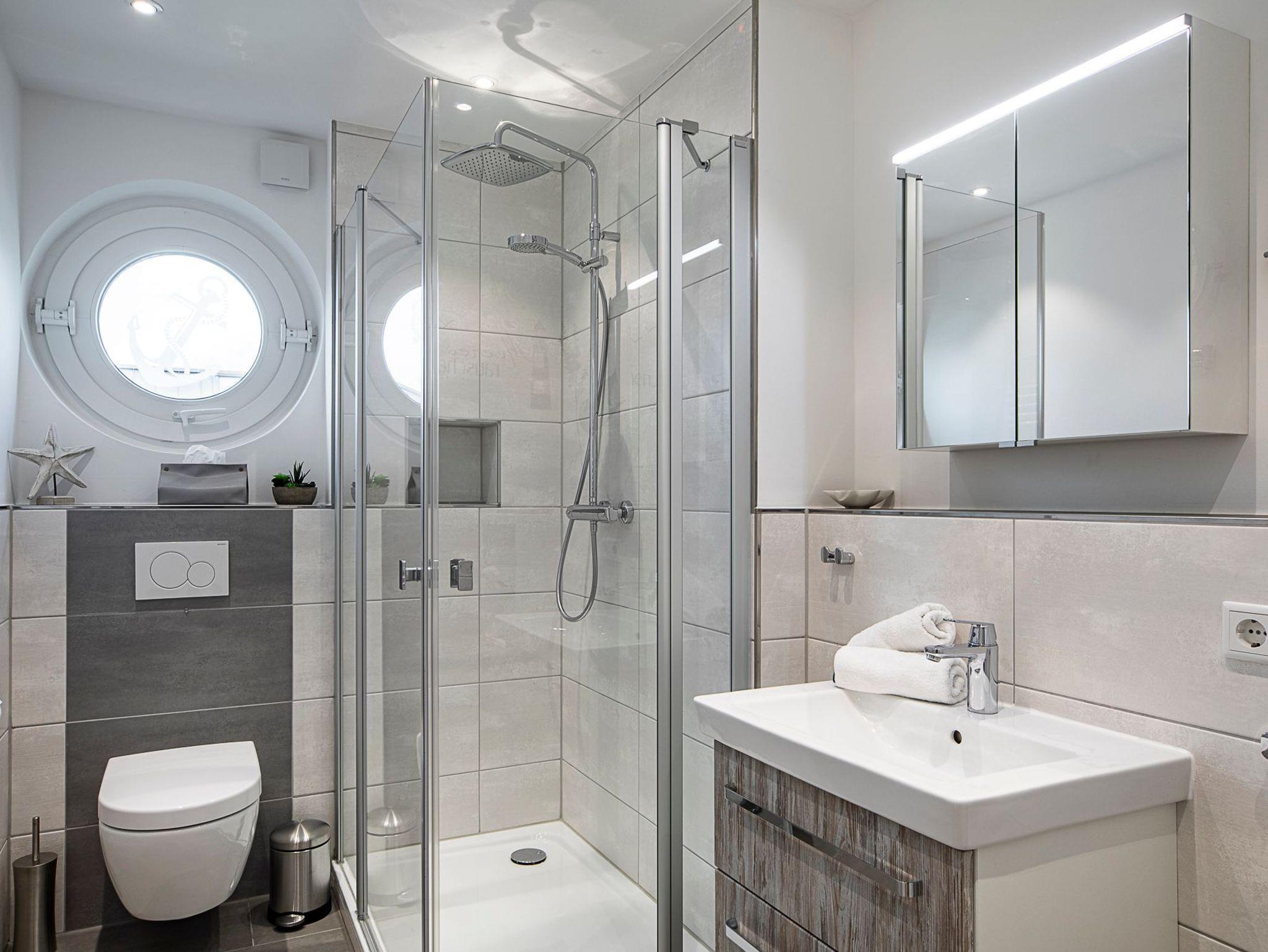 Helles Schlafzimmer, ausgestattet mit einem Boxspringbett von Schlaraffia (1,80 x 2,00m) zwei Nachttischen, einem Kleiderschrank sowie einem TV (40 = 100 cm). Außenrollläden lassen Sie im Dunkeln schlafen. Ein Duschbad mit Dusche, Hand- und Regendusche, Handtuchheizkörper, Fön, Kosmetikspiegel.