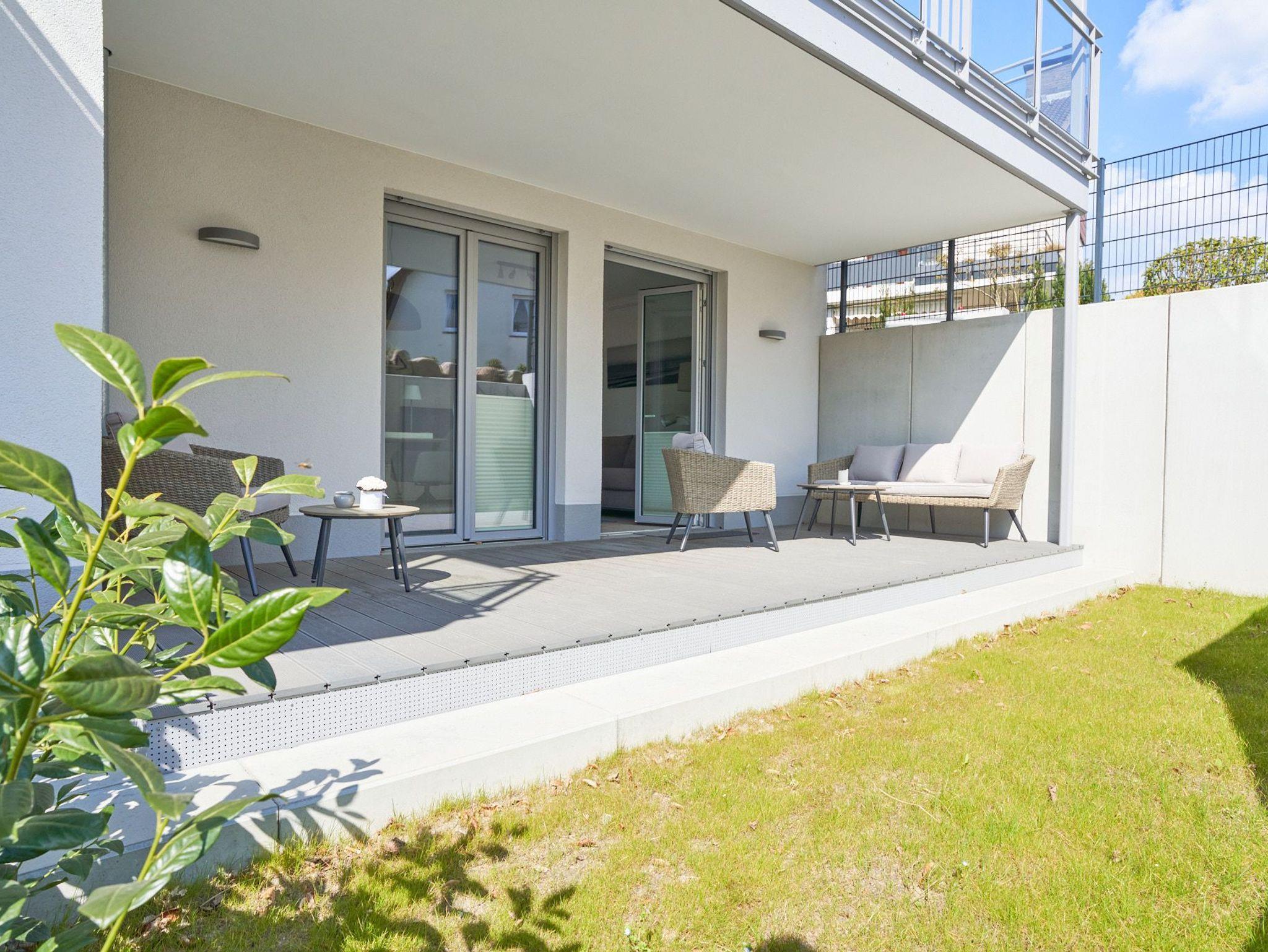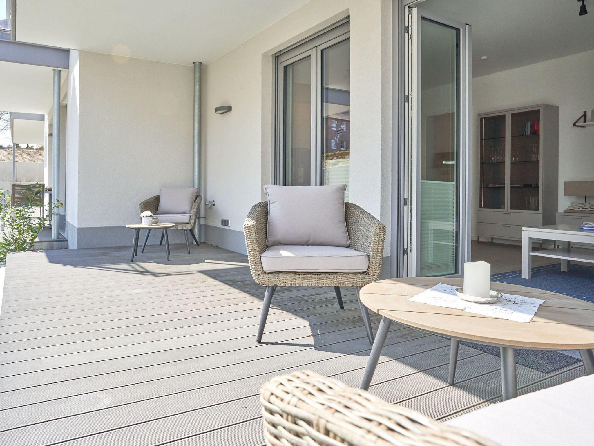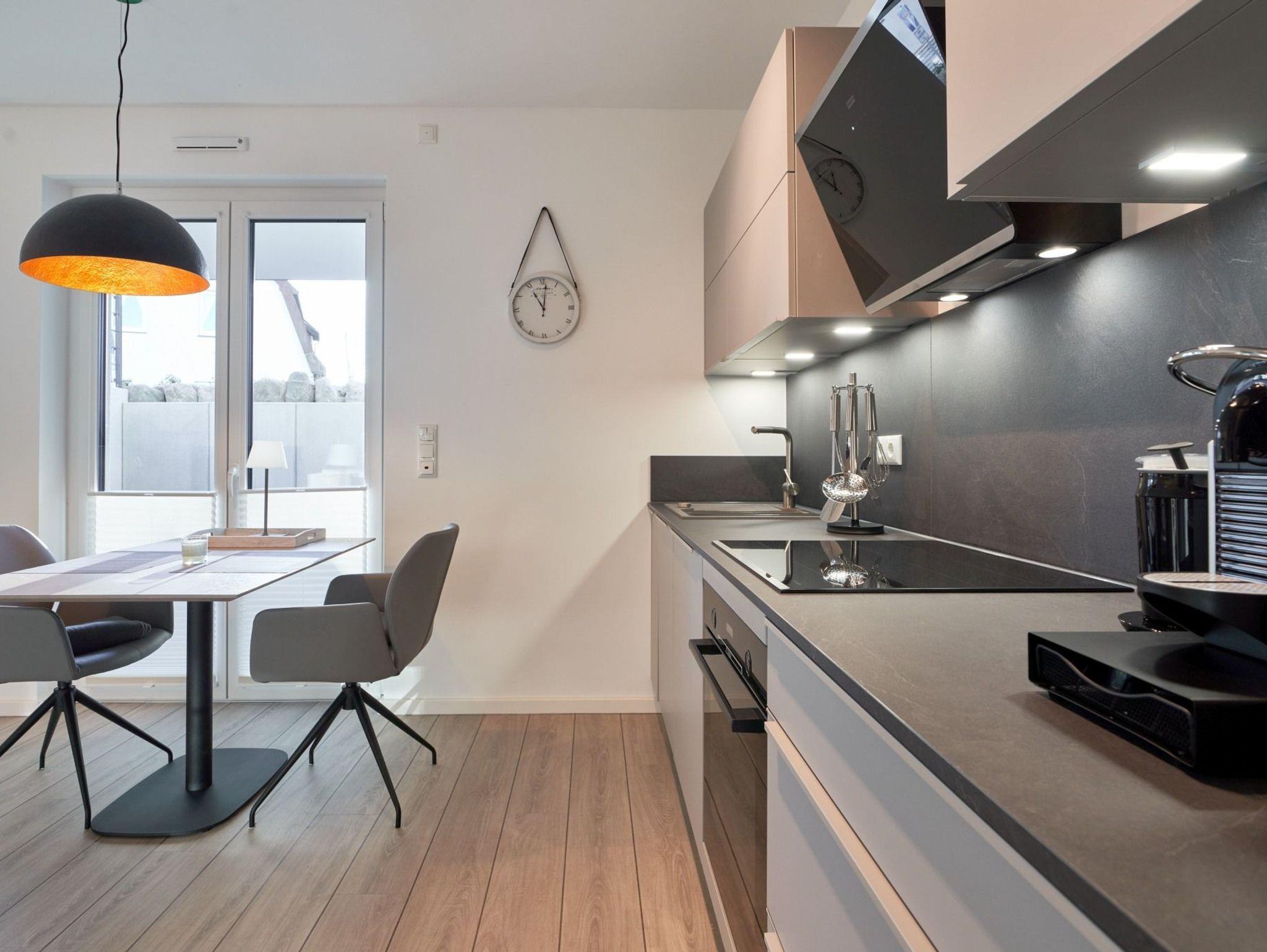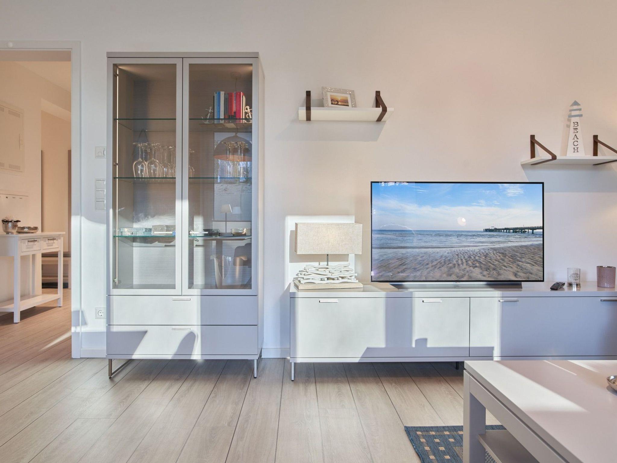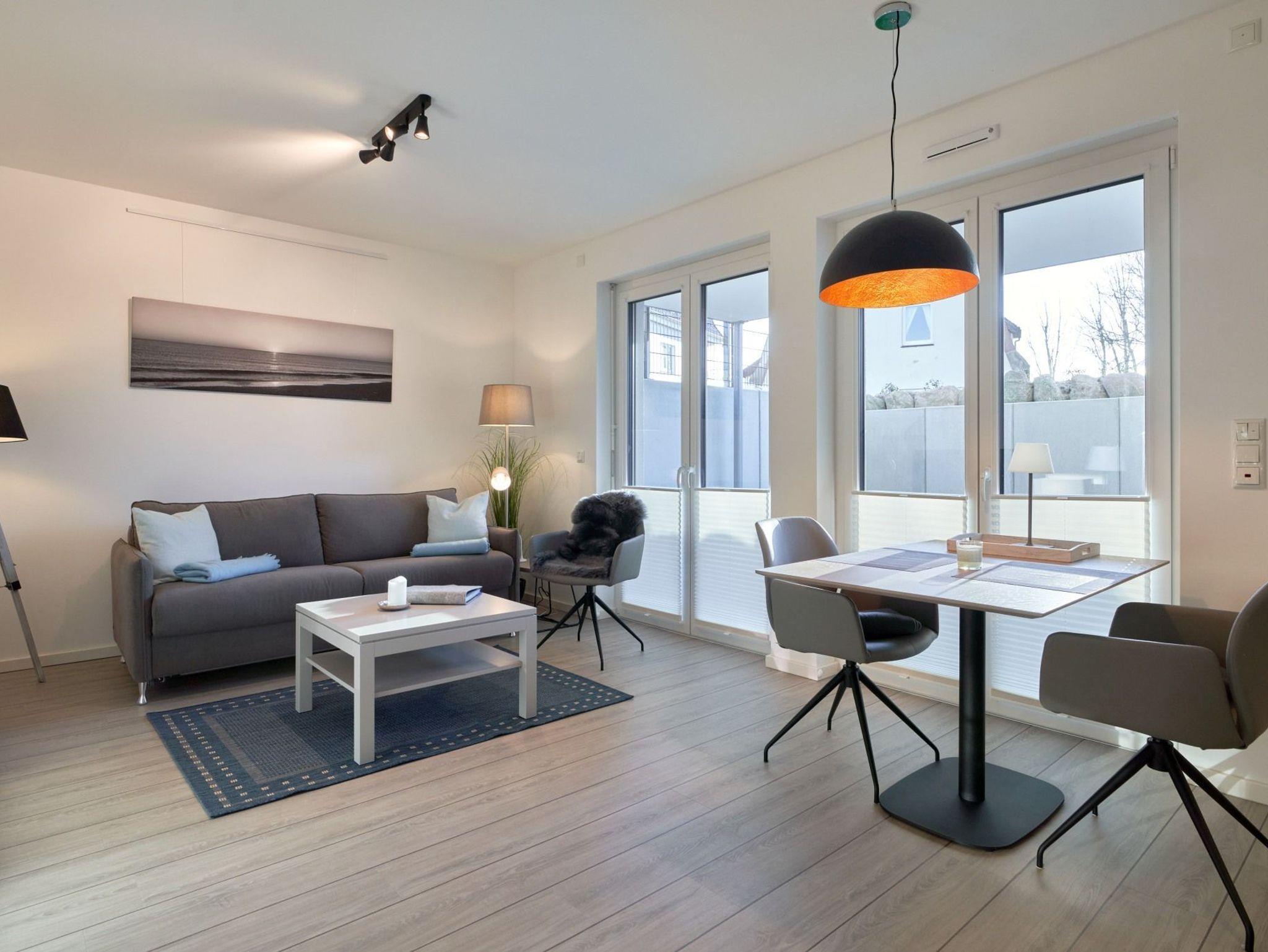 Lichtdurchflutetes Wohnzimmer durch die bodentiefen Fenster, die mit einem Licht- und Sichtschutz versehen sind. Außenrollläden im Wohnzimmer. Hochwertige Einbauküche mit Induktionsherd, Backofen, Kühlschrank mit Gefrierfach, Geschirrspüler, Toaster, Wasserkocher, Eierkocher, Elektro-Tischgrill, Sodastreamer, Espressomaschine, Nespresso-Kaffeemaschine mit Milchaufschäumer. Feiner Essbereich. Der Wohnbereich ist mit einem bequemen Sofa( läßt sich mit wenigen Handgriffen in ein Schlafsofa verwandeln), einem Wohnzimmertisch, einem TV (48 Zoll) sowie einem Internetradio ausgestattet. Aus dem Wohnbereich gelangen Sie auf die Terrasse nach Süden. Hier stehen Ihnen Tisch und zwei Stühle zur Verfügung.