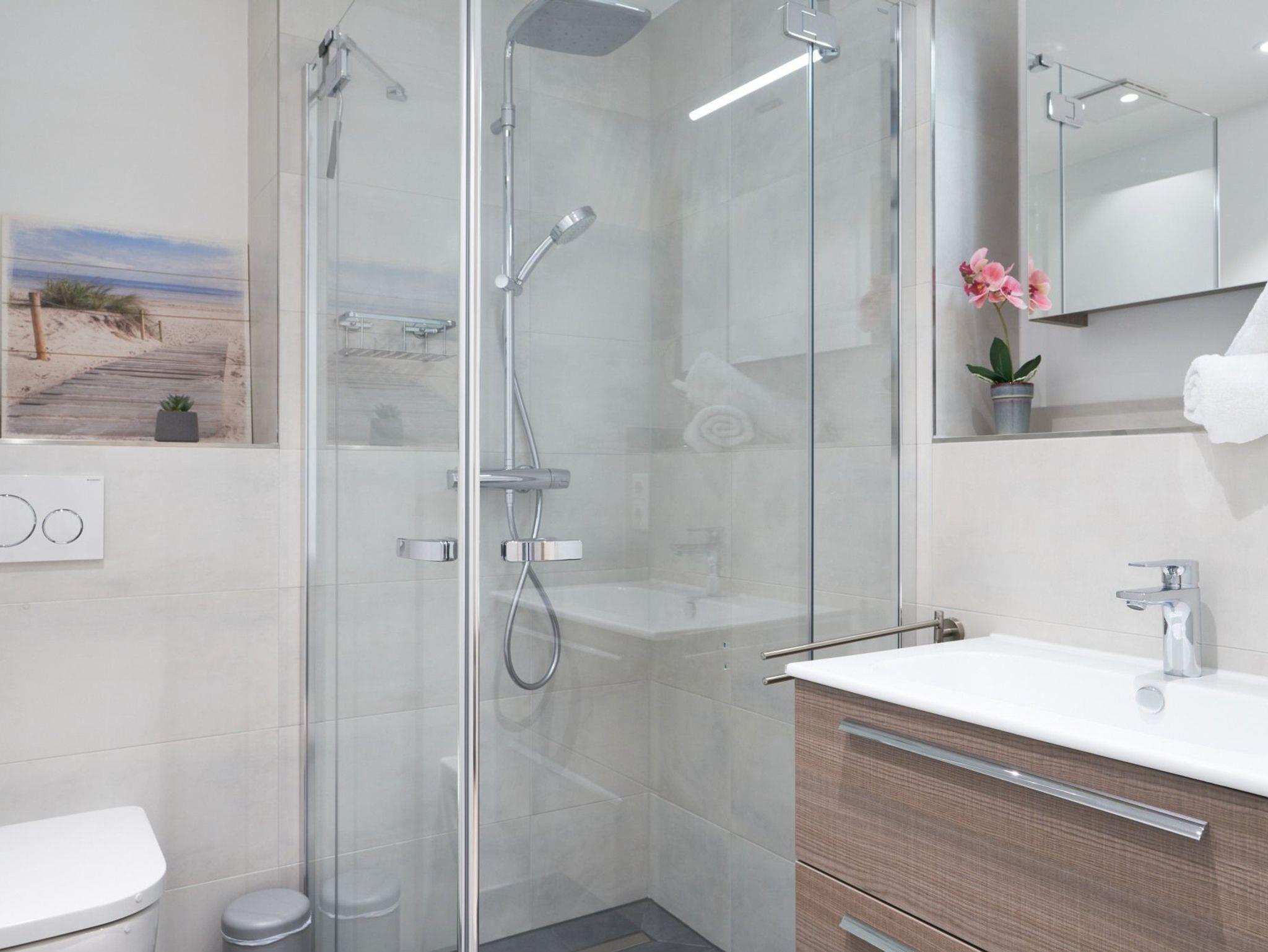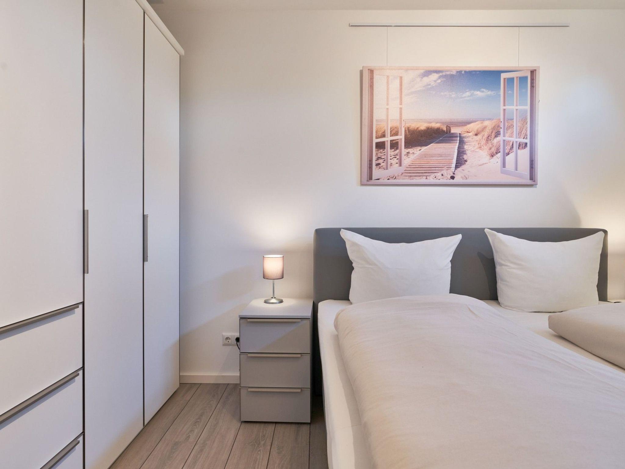 Das Schlafzimmer ist mit einem Boxspringbett (1,80mx2,00m) ausgestattet und verfügt über einen Einbauschrank, 2 Nachttische sowie einen Wand-TV. [nbsp] (43 Zoll). Das Duschbad mit bodengleicher Dusche, Regendusche sowie Handbrause, Handtuchheizkörper, Fön, Kosmetikspiegel. Die ganze Wohnung ist mit einer Fußbodenheizung sowie mit einem Sicht- bzw. Lichtschutz an allen Fenstern ausgestattet.