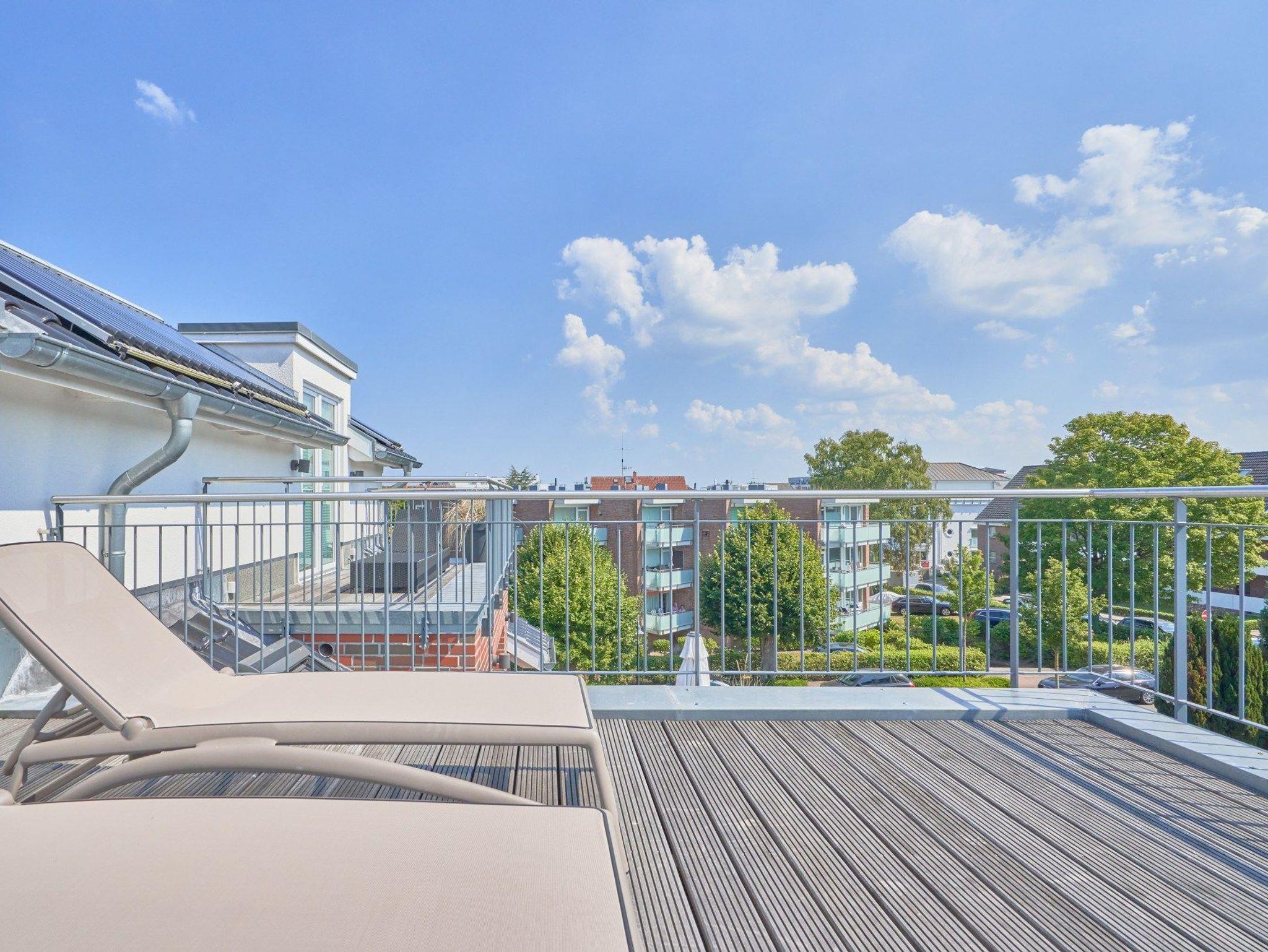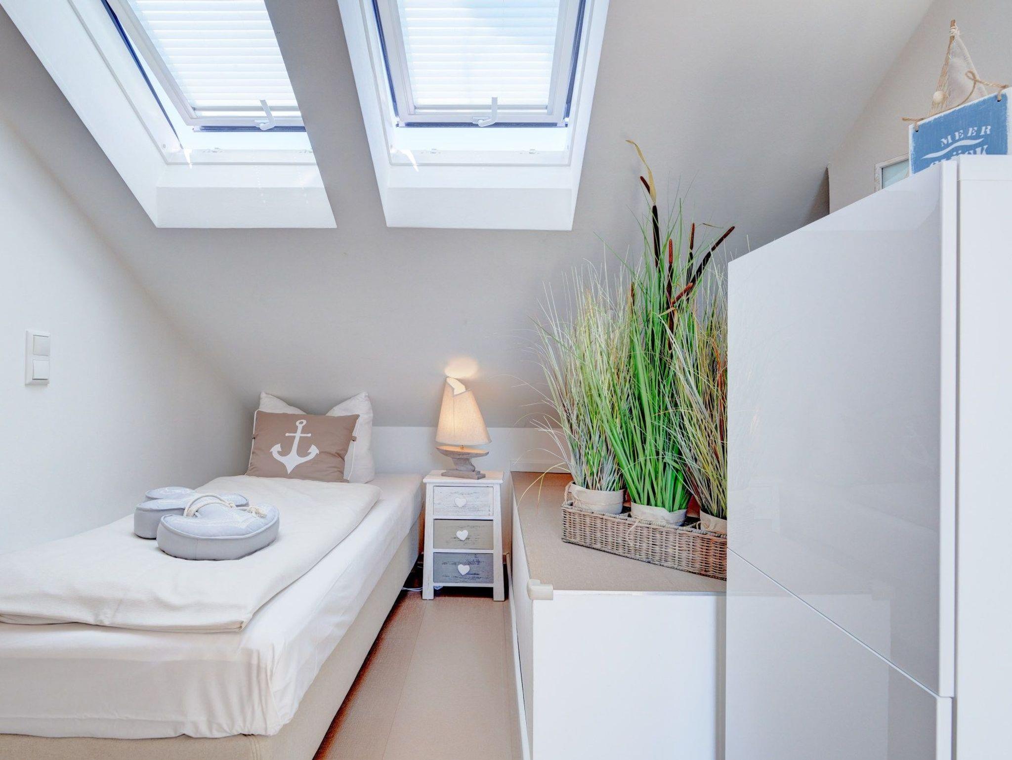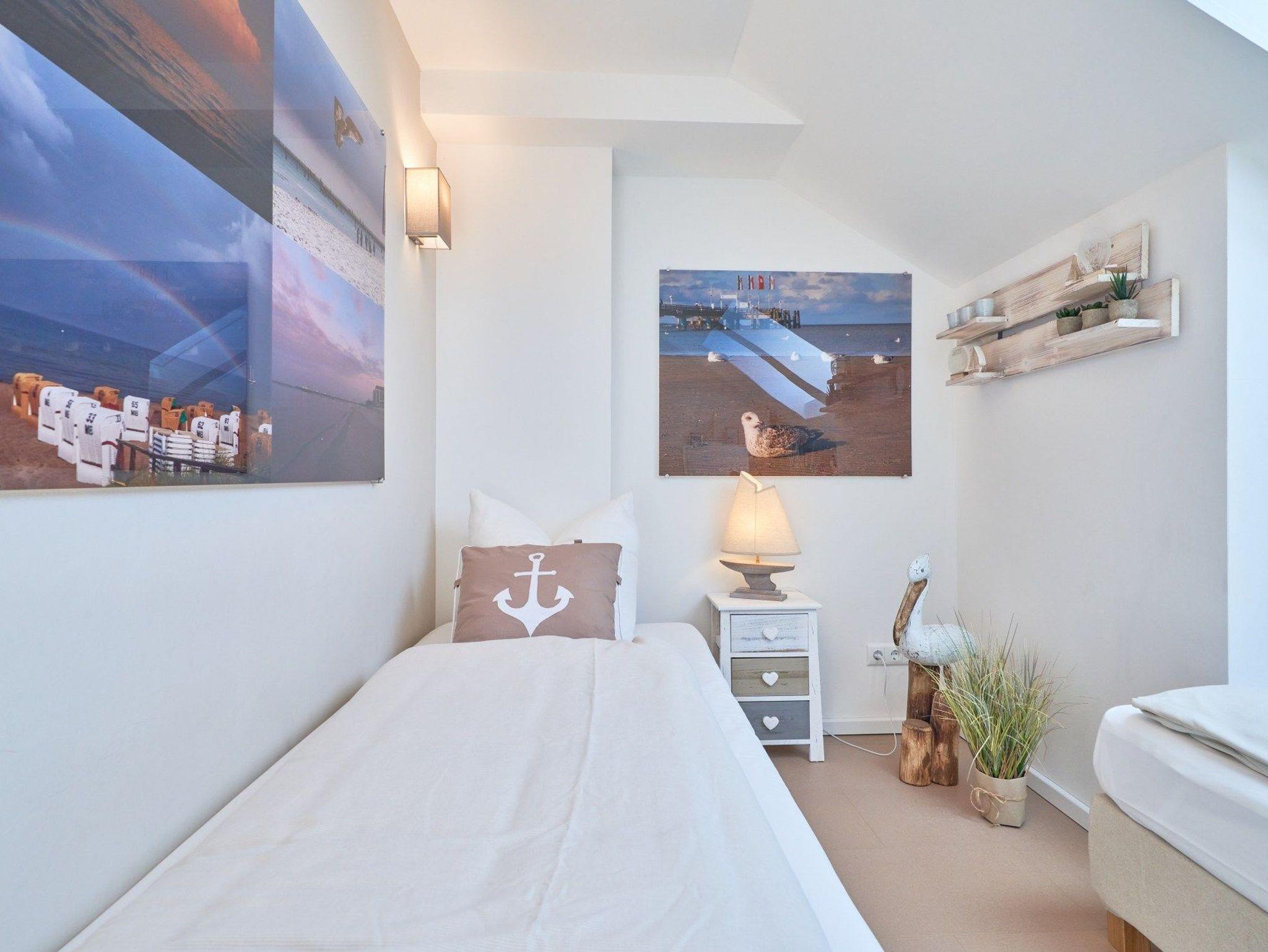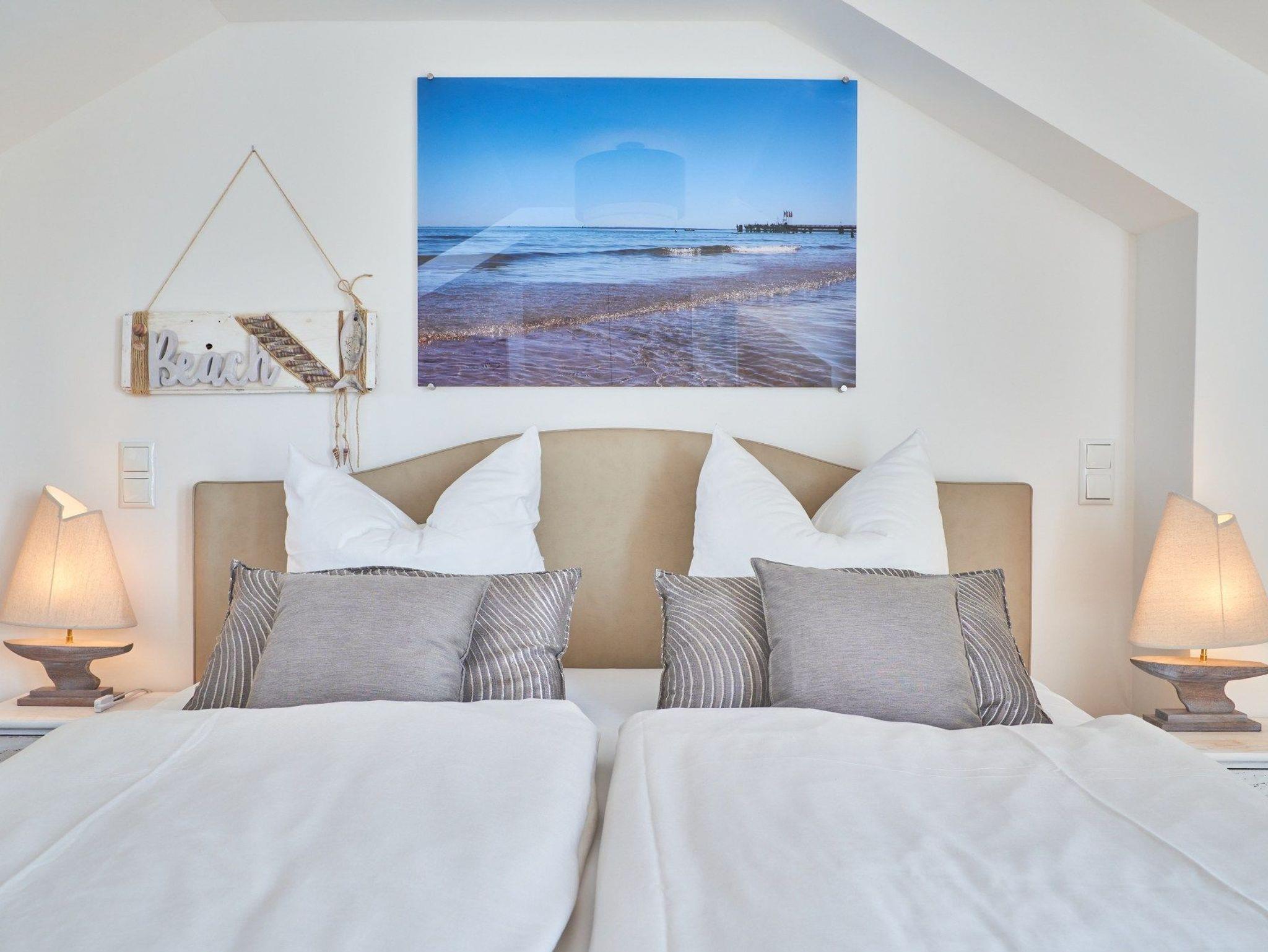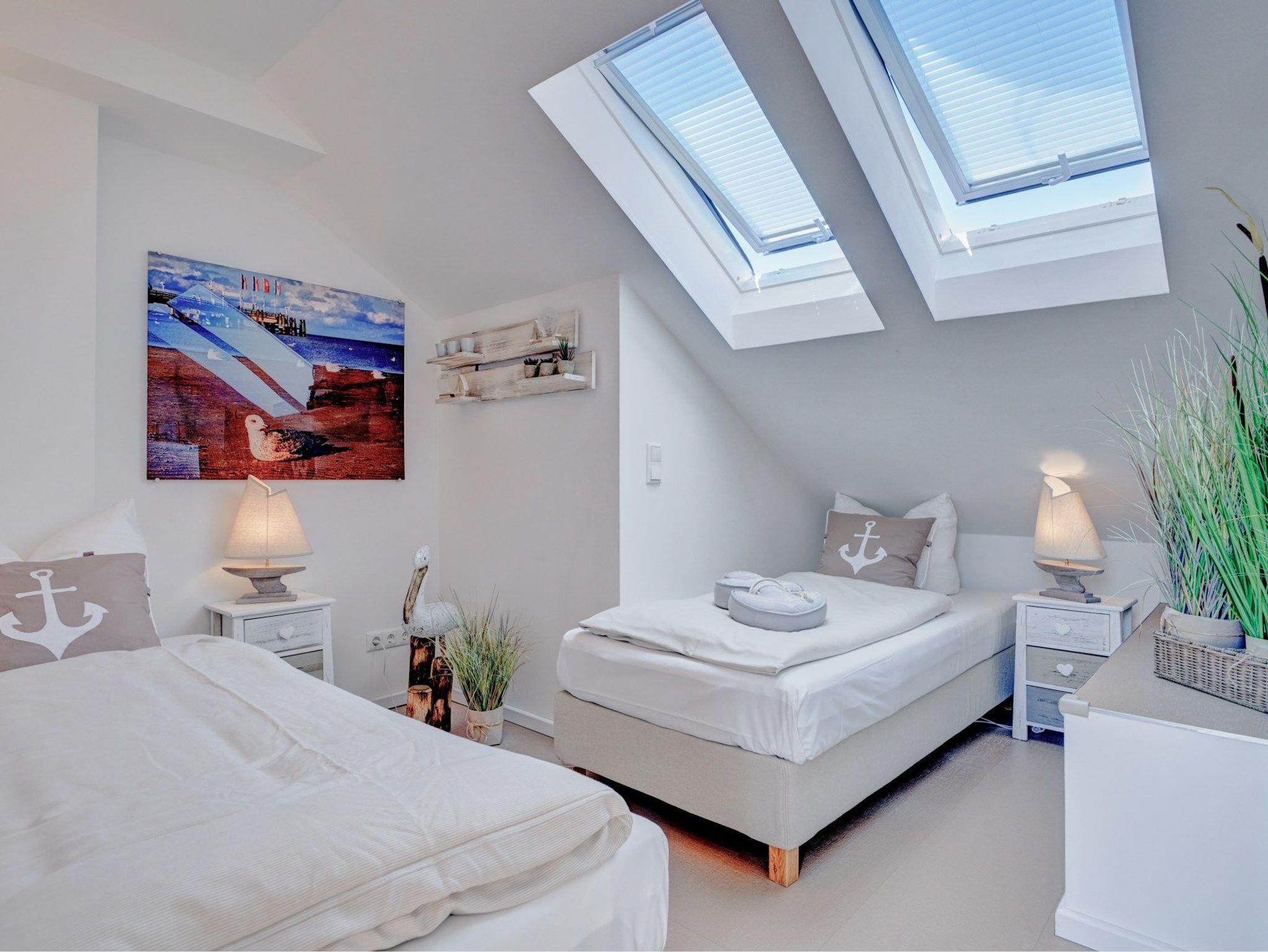 Über eine bequeme Treppe gelangen Sie in das Obergeschoss. Hier eröffnen sich zwei Schlafzimmer sowie eine große Dachterrasse. Das erste Schlafzimmer ist mit zwei Boxspring-Einzelbetten (90 x200m), einer Kommode sowie 2 Nachttischen ausgestattet. Das zweite Schlafzimmer ist mit einem Ruf-Boxspringbett (180 x200m), einem Kleiderschrank, zwei Nachttischen sowie einem Flachbildfernseher ausgestattet. Alle Fenster im Obergeschoss sind mit elektrischen Außenrollläden zu verdunkeln. Auf der großen Dachterrasse stehen Ihnen zwei Liegen zur Verfügung.