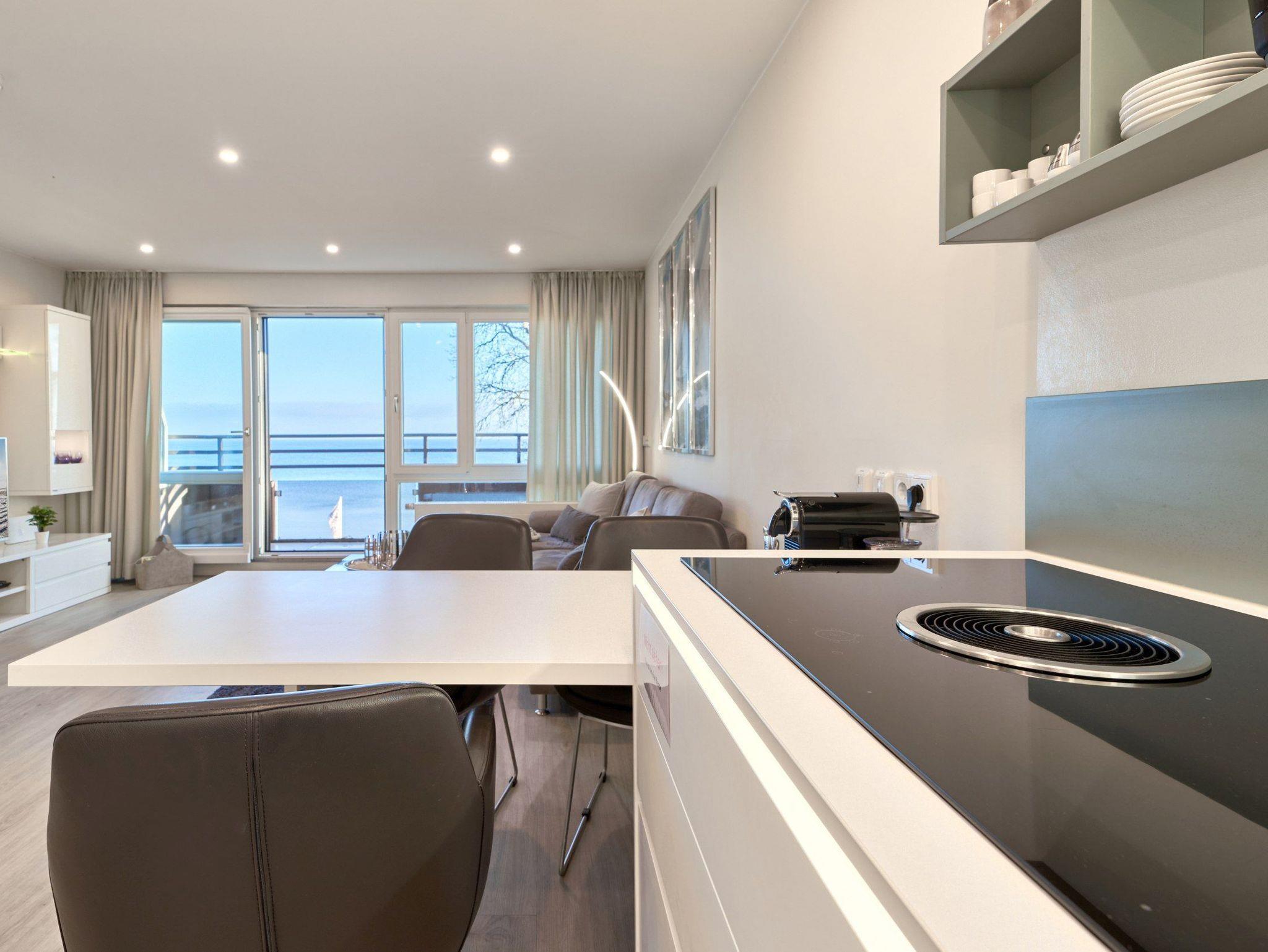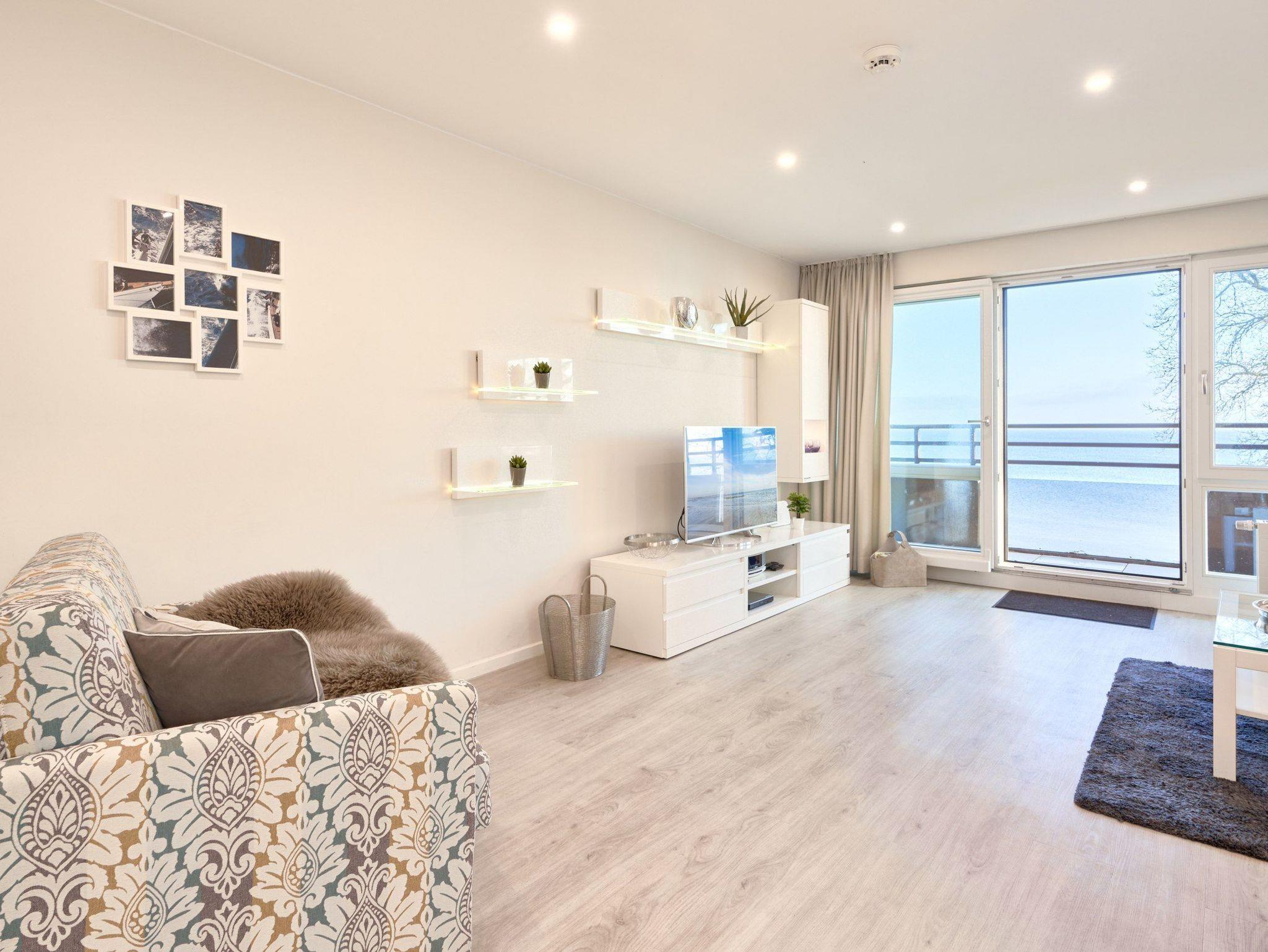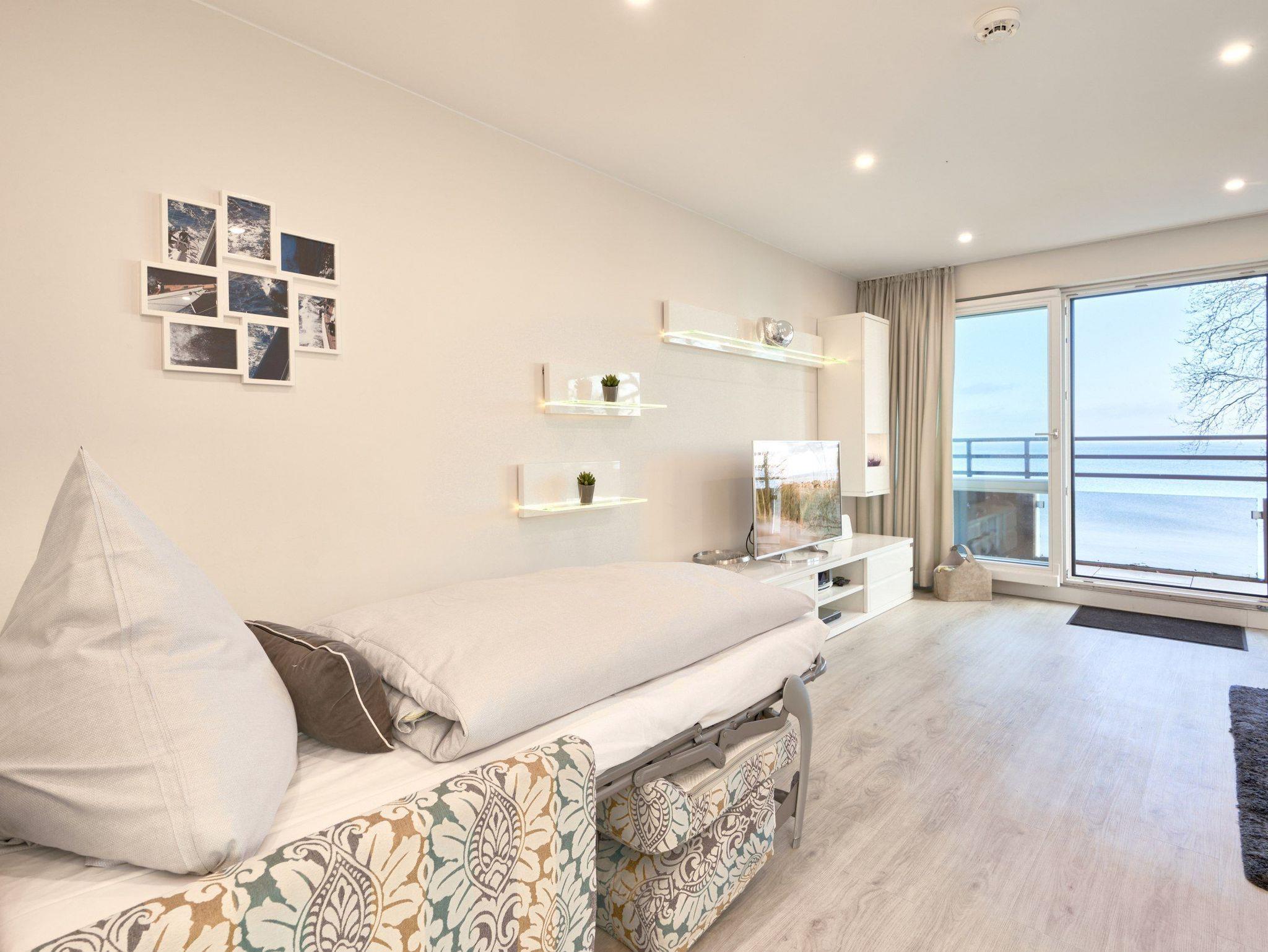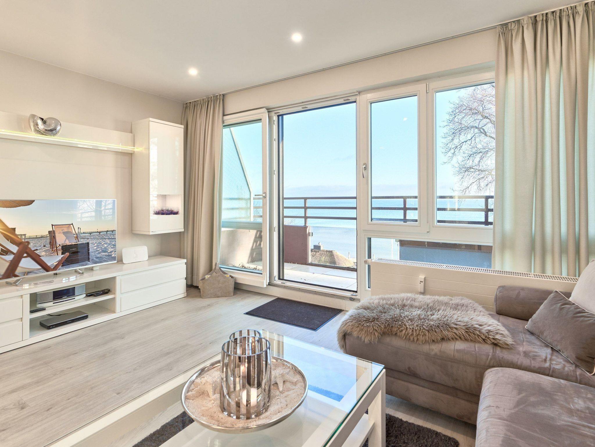 Von dem Eingangsbereich mit einer Garderobe geht es über in den großzügigen Wohnbereich (Schlafsessel 0,90 x 2,00m). Hier finden Sie auch die moderne, offene sowie voll ausgestattete Einbauküche. Durch zwei große Panoramafenster können Sie hier den Blick auf die Ostsee und die gesamte Lübecker Bucht genießen. Die 55 m² große, sonnige Dachterrasse ist mit einem XXL-Strandkorb, Markisen und Terrassenmöbeln bestückt und lädt zum Verweilen ein. Das Schlafzimmer verfügt über ein bequemes Bett in 1,80 x 2,00m mit verstellbaren Lattenrosten und einen Einbauschrank sowie einen SAT-Fernseher. Das helle, sehr ansprechende Badezimmer ist sehr hochwertig ausgestattet. Lassen Sie sich von der Wellness-Dusche und der elektrischen Fußbodenheizung sowie dem Bad-Radio verwöhnen. Selbstverständlich stehen Ihnen ein Föhn und ein beleuchteter Kosmetikspiegel zur Verfügung. In der Saison (15.05. ? 15.09.) steht für Sie am Strand kostenfrei ein Strandkorb bereit.