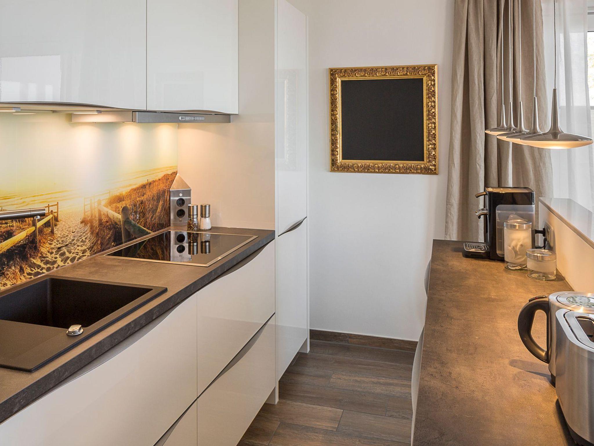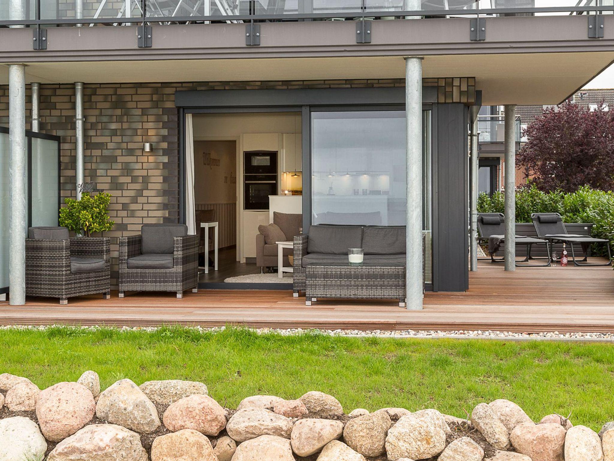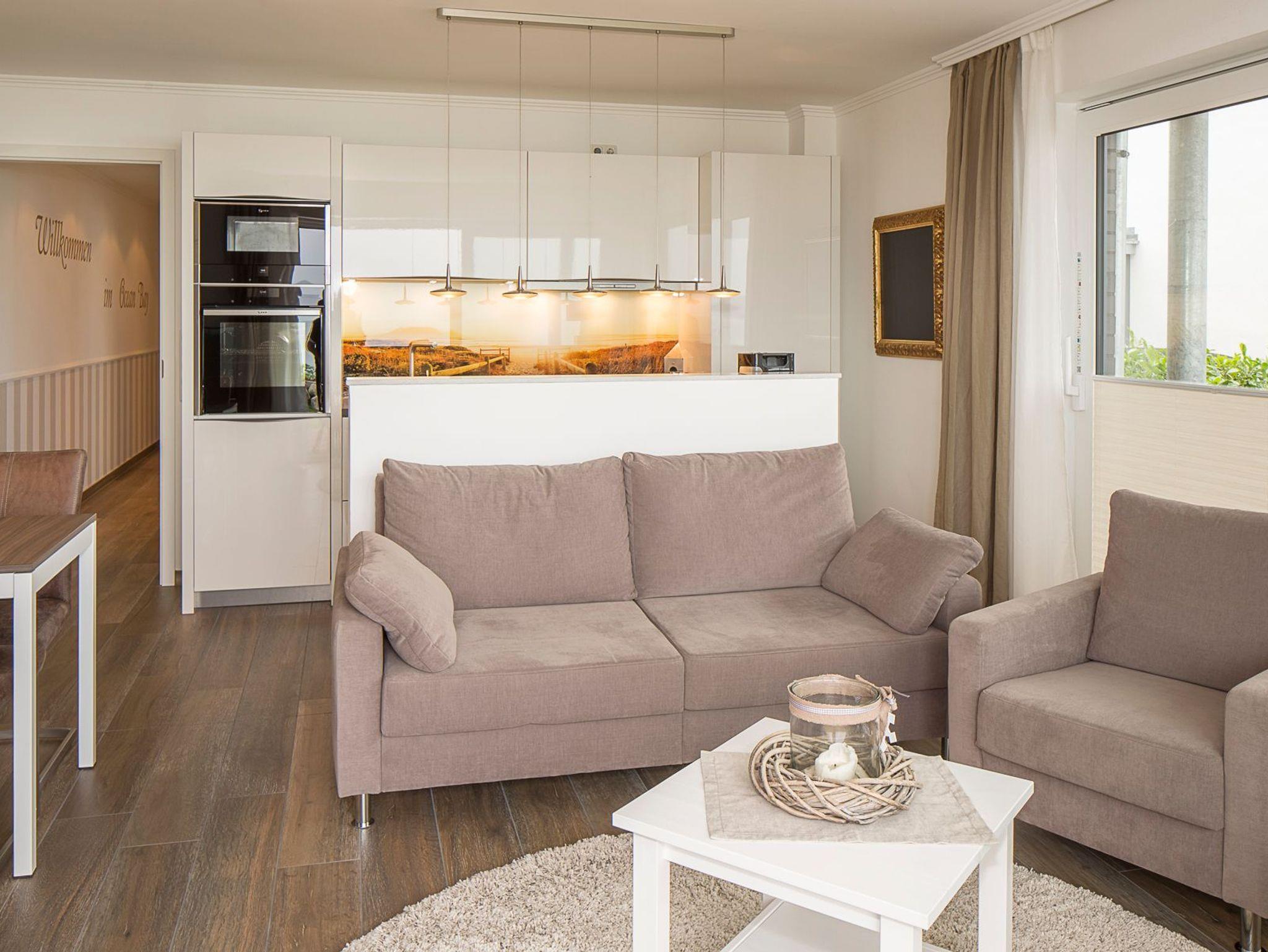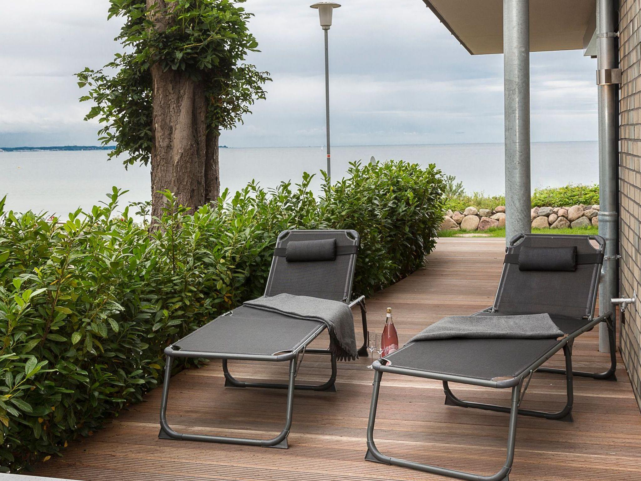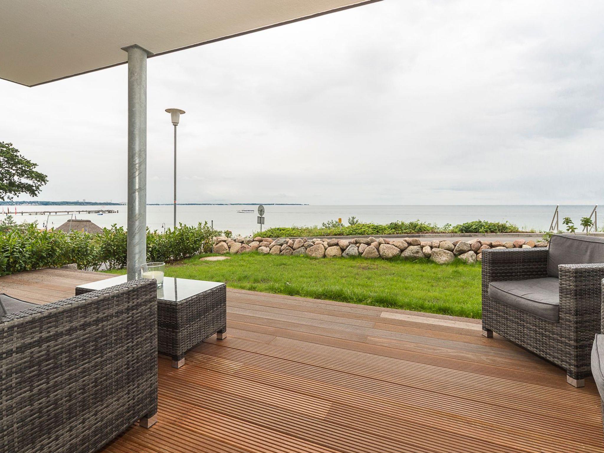 Weitere besondere Komfortmerkmale der Schlafräume sind der jeweilige 40-Zoll-Flach-TV, die Schallschutztüren (SK2) und die Mückenschutznetze vor den Fenstern. Der Mittelpunkt des schönen Wohn-/Essbereichs ist die sehr moderne Rotpunkt-Lackküche, welche mit allen wichtigen Extras ausgestattet ist und keine Wünsche offen lässt. Weitere Wohndetails sind u. a. das komfortable Sofa mit individueller Longchair-Funktion, 48-Zoll-Curved-Flach-TV, Musikanlage sowie ein schöner Essbereich mit ausziehbarem Tisch (1,50m ). Weitere Komfortmerkmale sind sicherlich das große Insektenschutz-Schiebeelement sowie die Sichtschutz verglasten Scheiben (verhindert neugierige Blicke von außen nach innen). Ein weiteres Highlight ist die ca. 40m² große Bankirai-Terrasse mit schöner Sitzlounge sowie dem kleinen Gartenanteil zur alleinigen Nutzung. Der herrliche Blick auf die Lübecker Bucht wird Sie beeindrucken. Gönnen Sie sich einen schönen Urlaub in dieser sehr anspruchsvollen und besonderen Ferienwohnung. Sie haben es sich verdient.