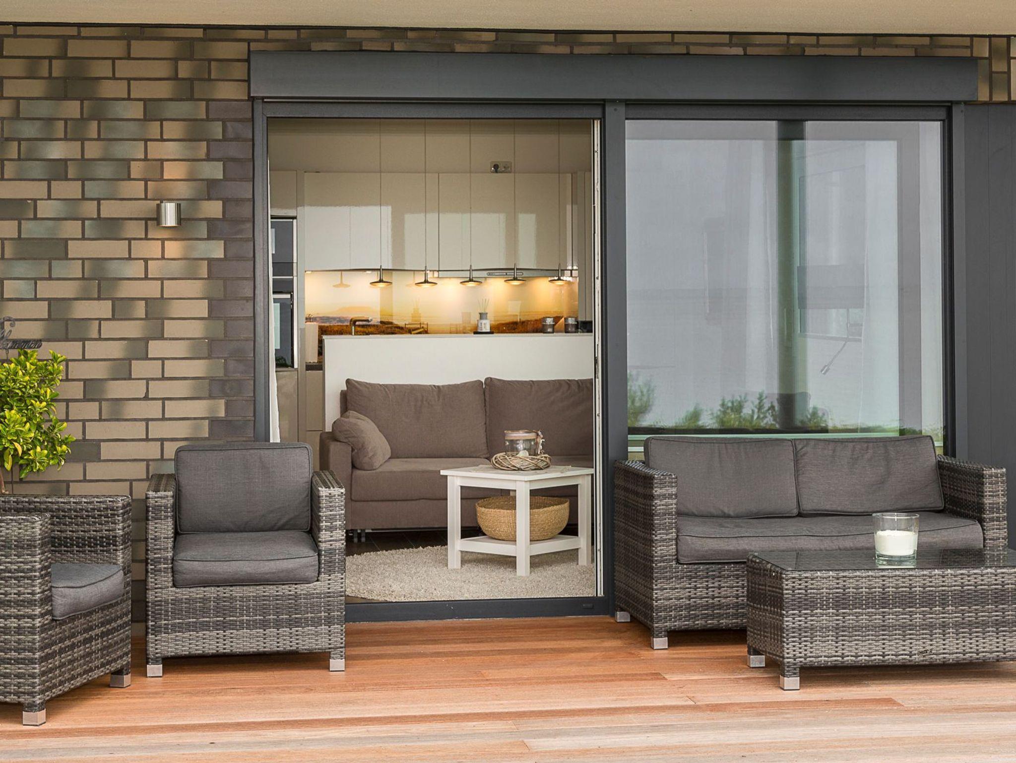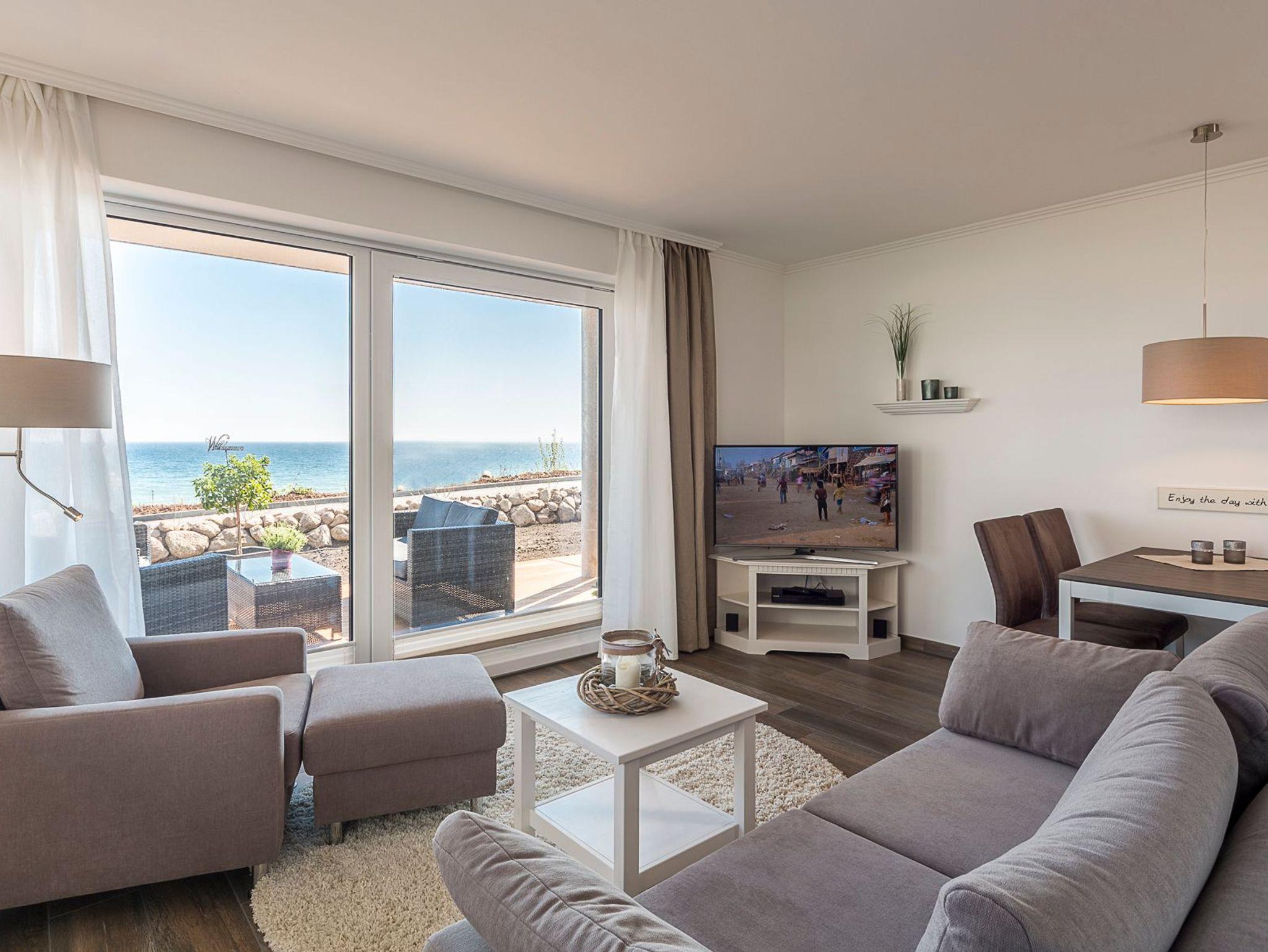 Eine ca. 65 m² große Terrassenwohnung mit kleinem Gartenanteil und 100% Meerblick, 2 Schlafräume, Duschbad und Kfz-Außenstellplatz für 4 Personen.