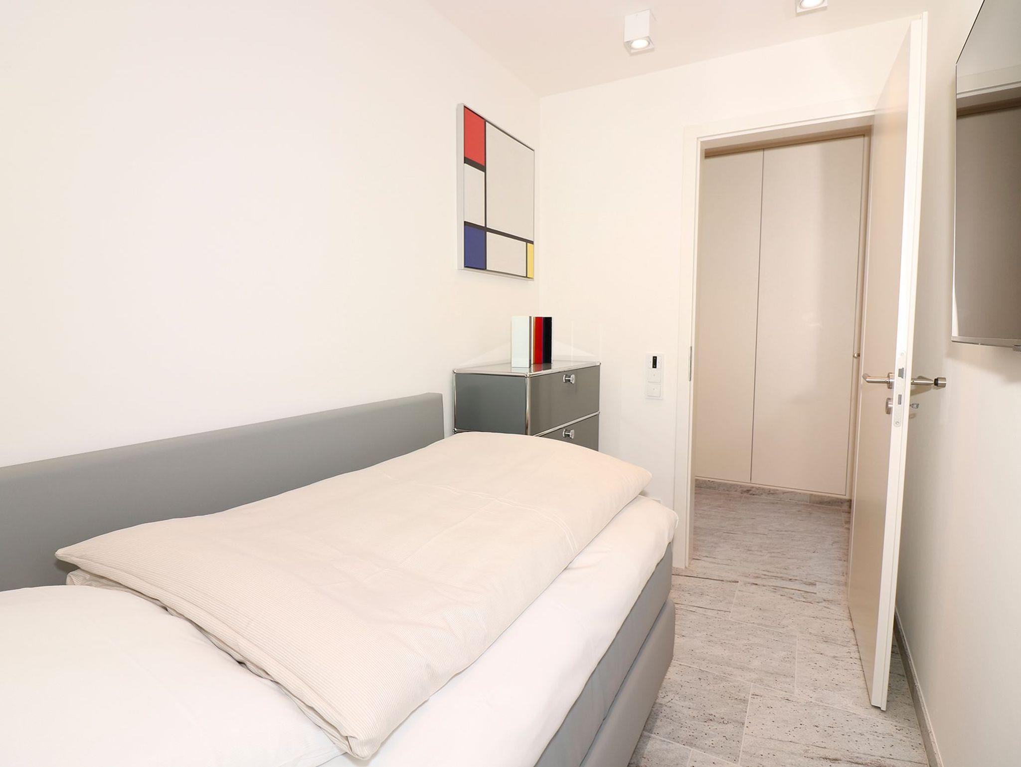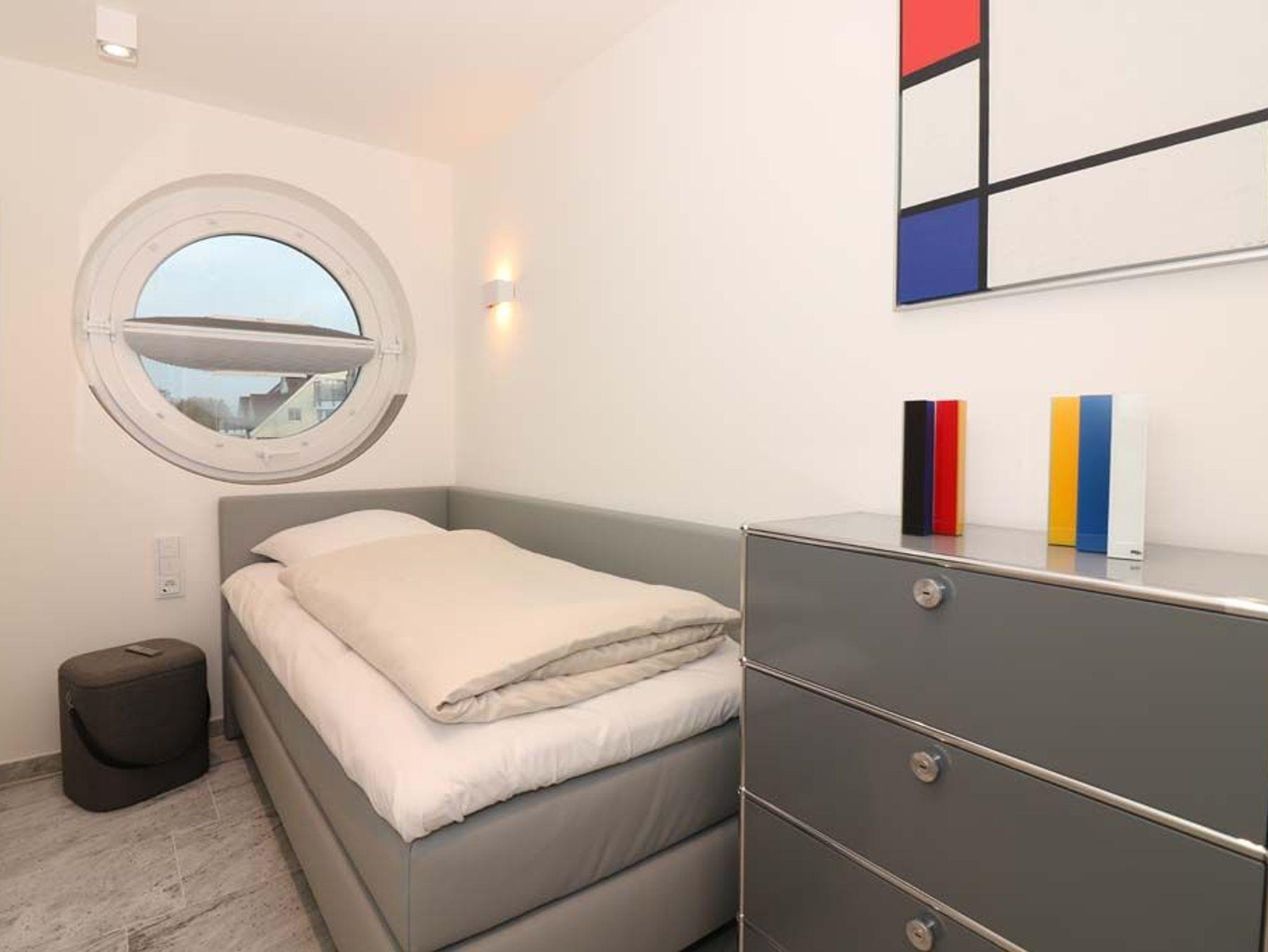 Kinderzimmer: Auch hier erwartet Sie ein hochwertiges Boxspringbett (0,90 x 2,00m) für Ihren erholsamen Schlaf. Ein USM-Schubladenschrank bietet hier zusätzlichen Platz. Zum Lesen oder Spielen liegen diverse Bücher und Spiele bereit. Für bestes Entertainment finden Sie hier einen 49-Samsung-Smart-TV mit LAN-Anschluss.