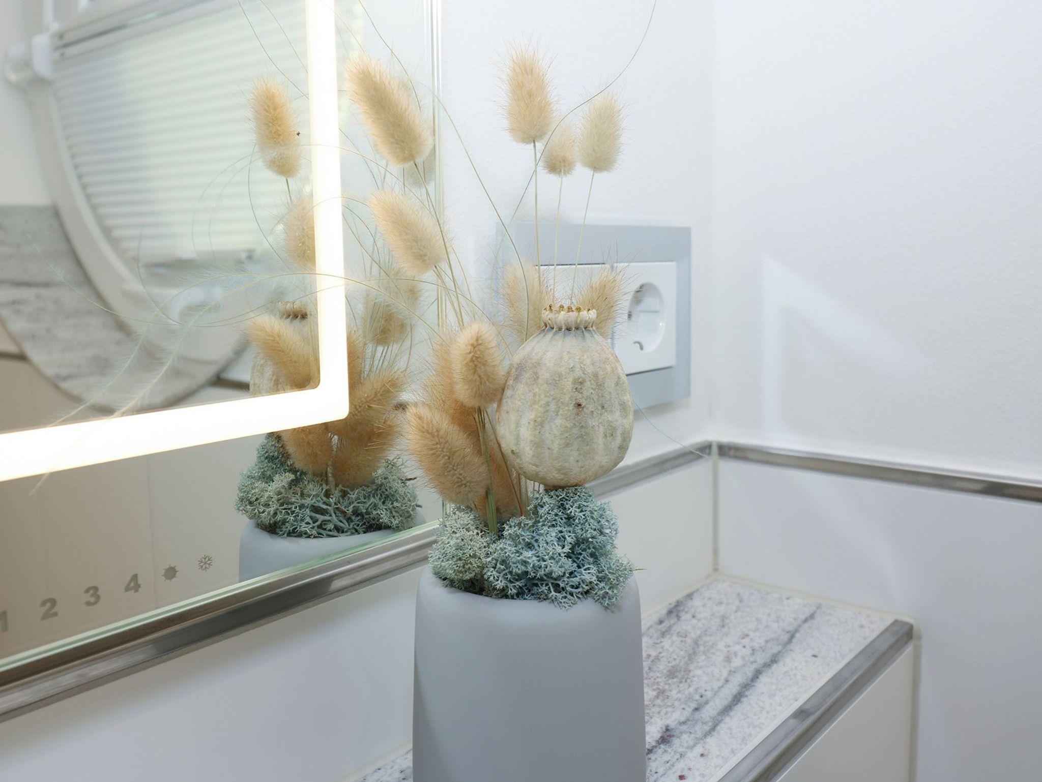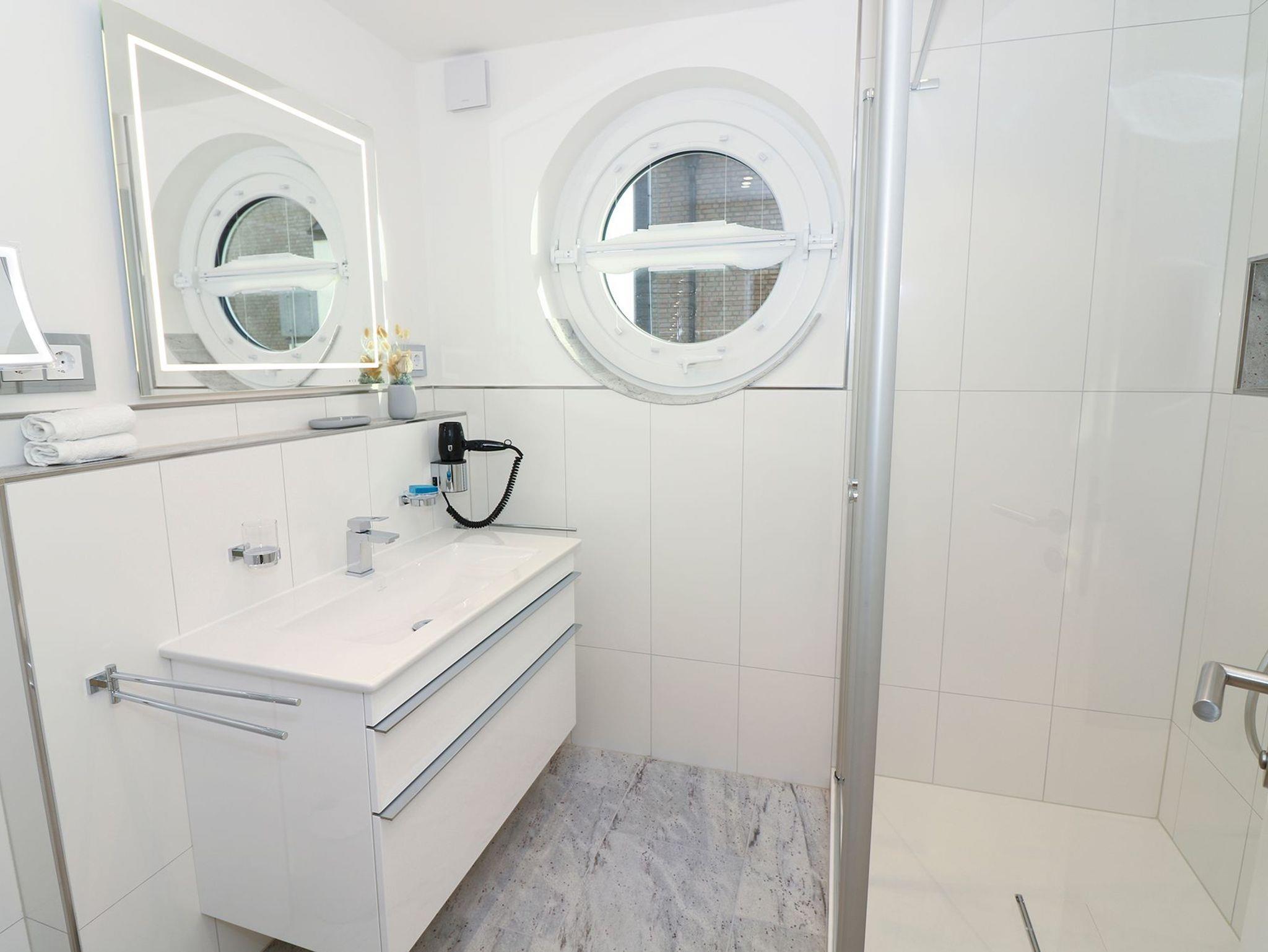 Wellnessbad: In Ihrem mit viel Liebe von Villeroy [&] Boch gestalteten Wohlfühlbad mit Bullaugen-Fenster lädt Sie eine Regendusche zum Erfrischen ein. Ein großer Waschtisch mit Unterschrank, WLAN-Radio, Handtuchheizkörper; beleuchteter Kosmetikspiegel und Haartrockner runden das Wohlfühlpaket ab. Waschmaschine und Trockner stehen Ihnen im Gemeinschaftskeller zur Verfügung und sind über einen Münzzähler zu bedienen.