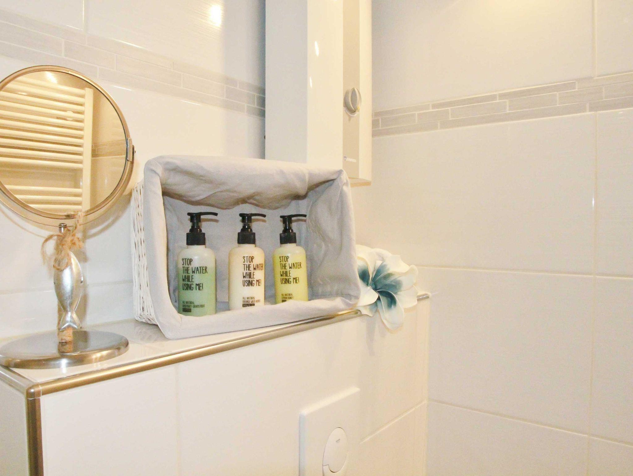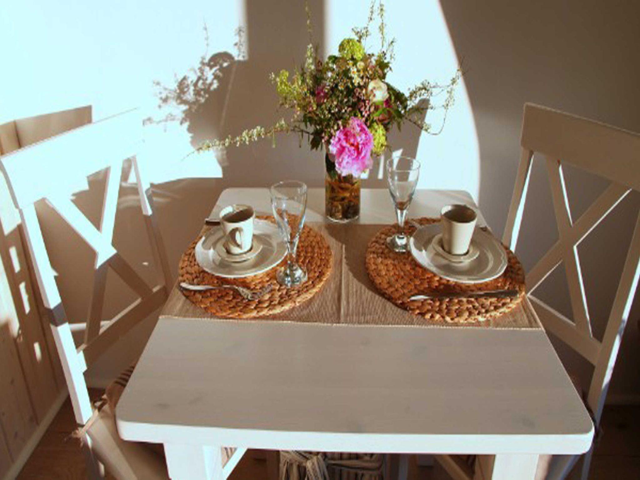 Das Badezimmer ist modern gestaltet und verfügt über einen Haartrockner, Badevorleger und Handtuchpaket. Helles Holz und sanfte Beleuchtung sorgen für eine warme Atmosphäre, während große Fenster den Raum mit natürlichem Licht fluten. Ein kleiner, aber feiner Esstisch bietet Platz für gemeinsame Mahlzeiten und die gepflegte Einrichtung sorgt für ein rundum angenehmes Wohngefühl.