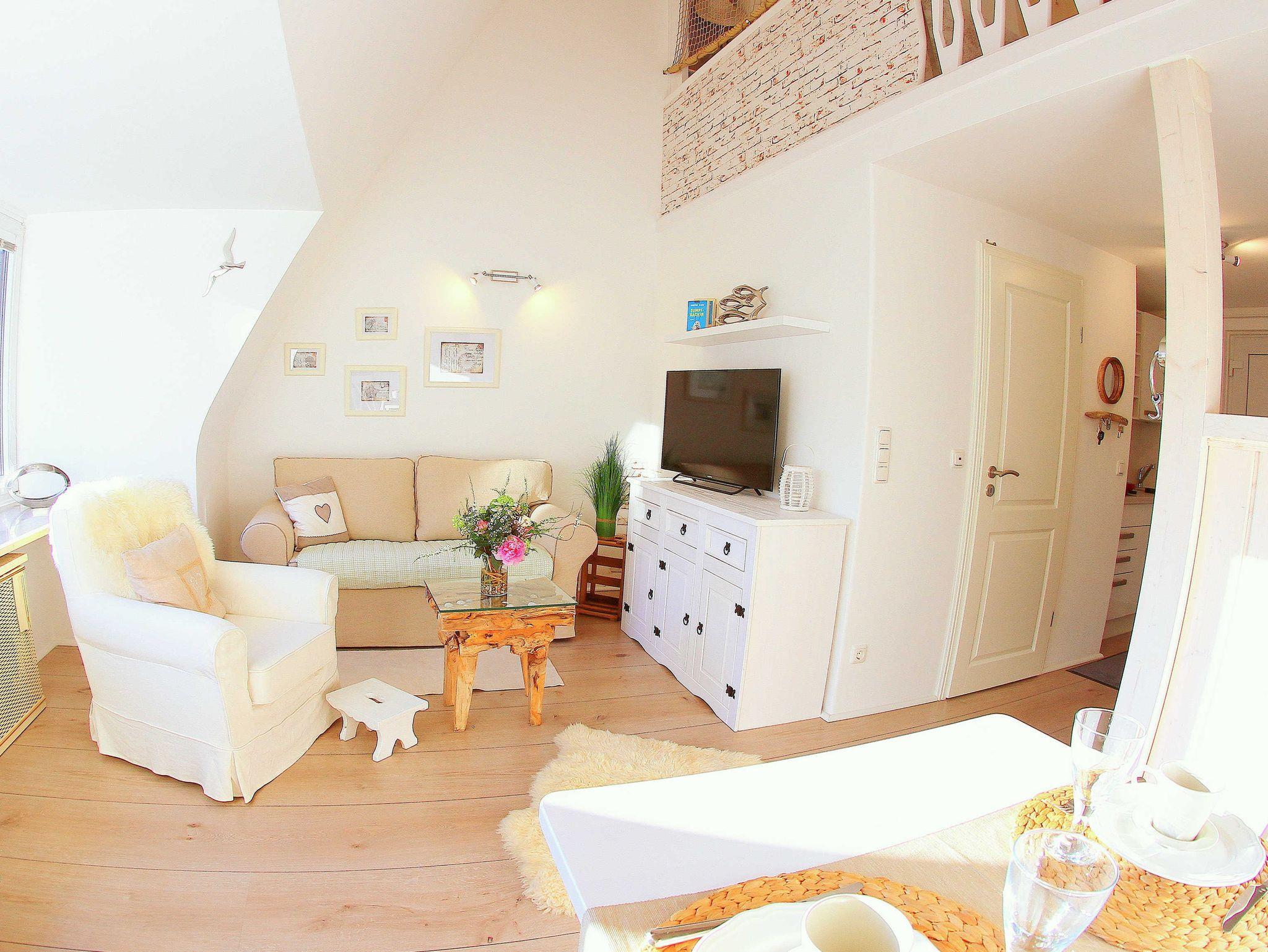 Wohnen in einem hellen und liebevoll eingerichtetes Nichtraucher-Appartement über offene zwei Ebenen. Gemütliche 1,5-Zimmer-Galeriewohnung (ca. 39 m²) in ruhiger Lage ? nur 2 Gehminuten vom Strand entfernt. Moderne Küche, offener Schlafbereich mit Doppelbett, WLAN, Parkplatz am Haus und saisonaler Strandkorb inklusive. Perfekt für Paare, die Erholung und Strandnähe suchen.