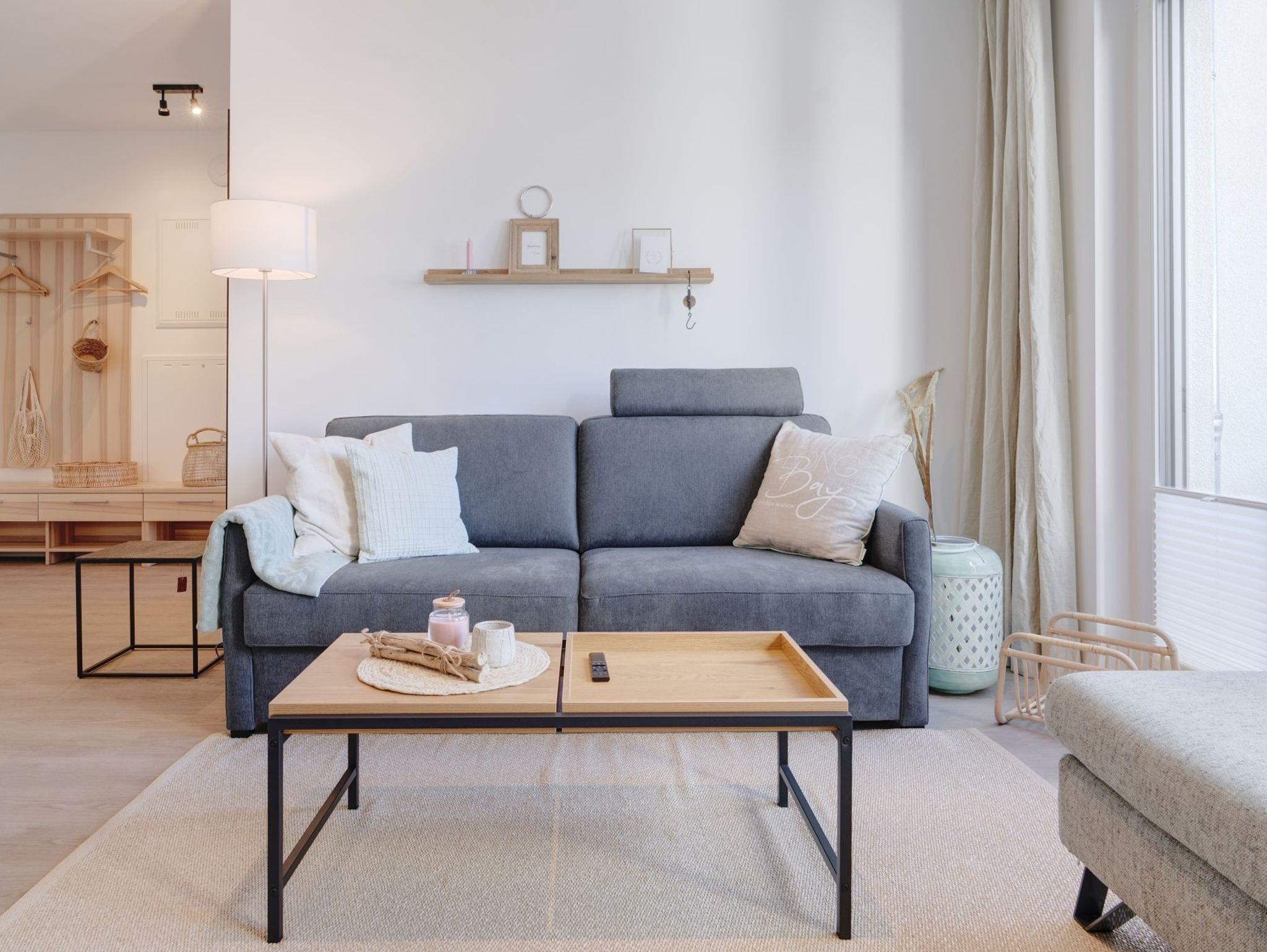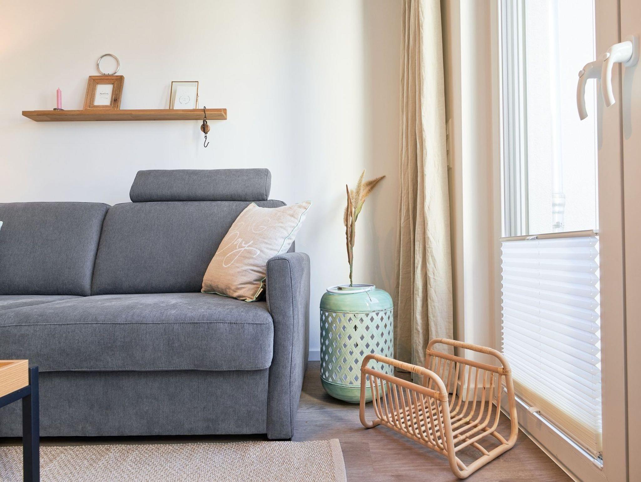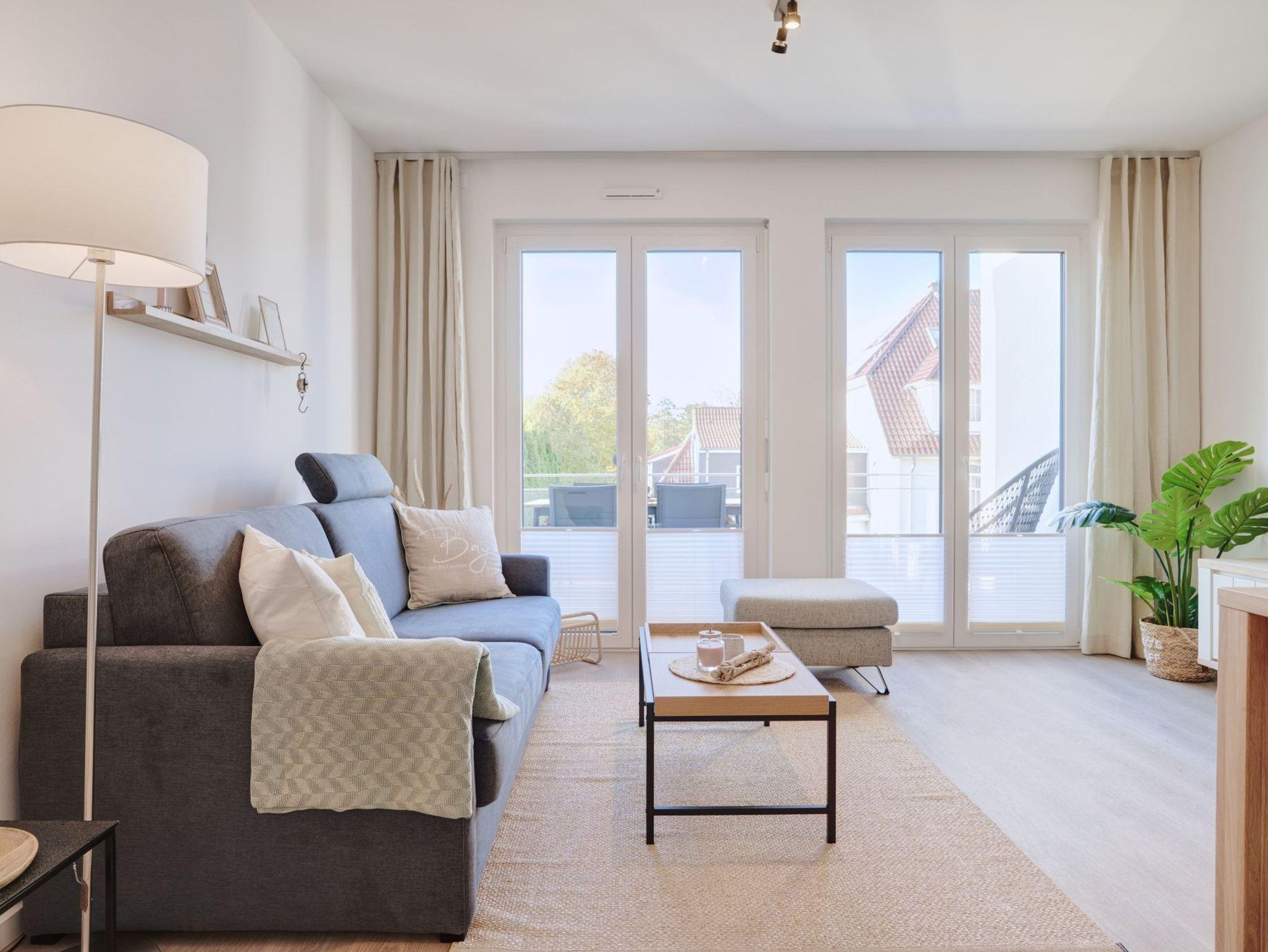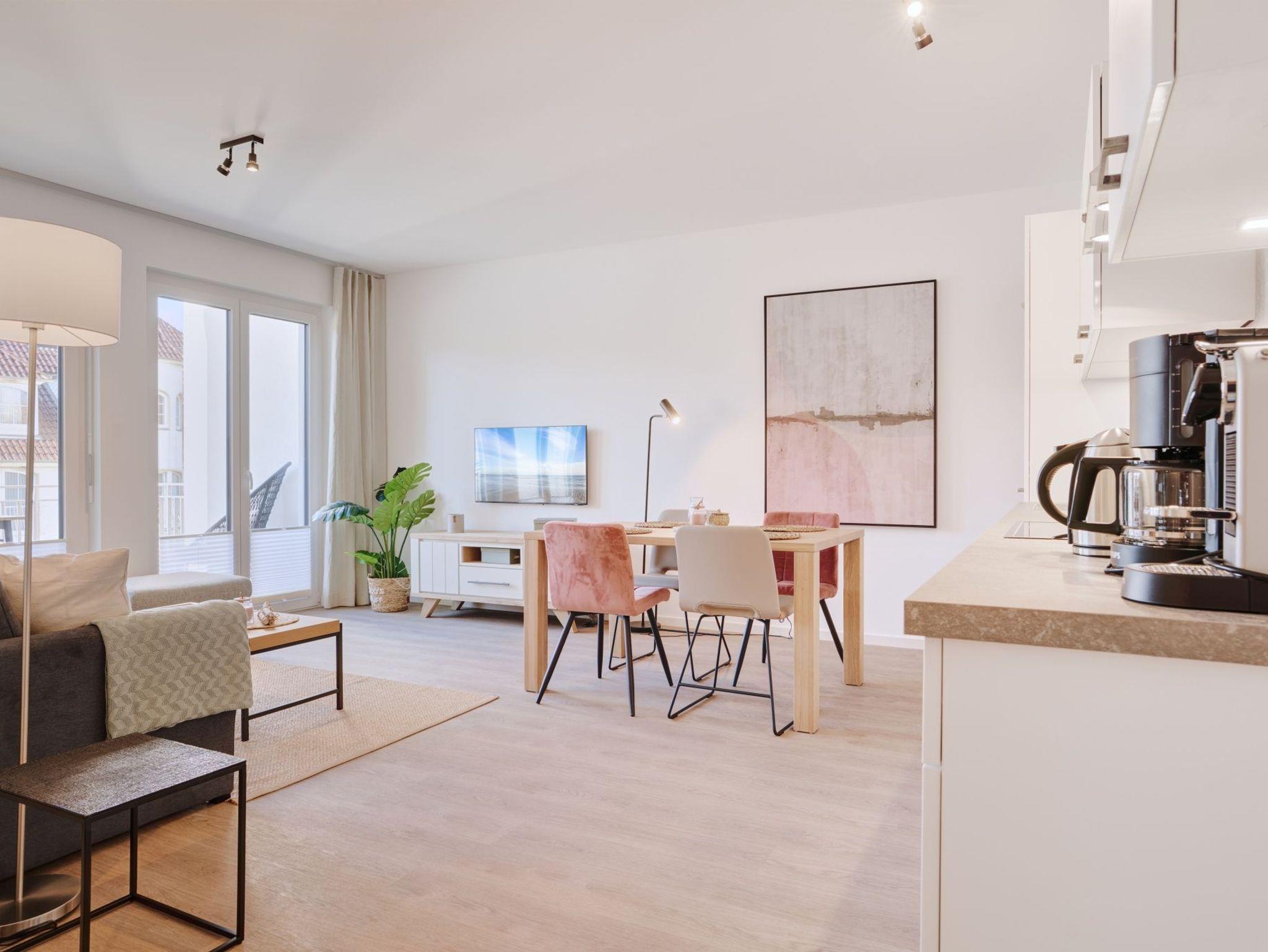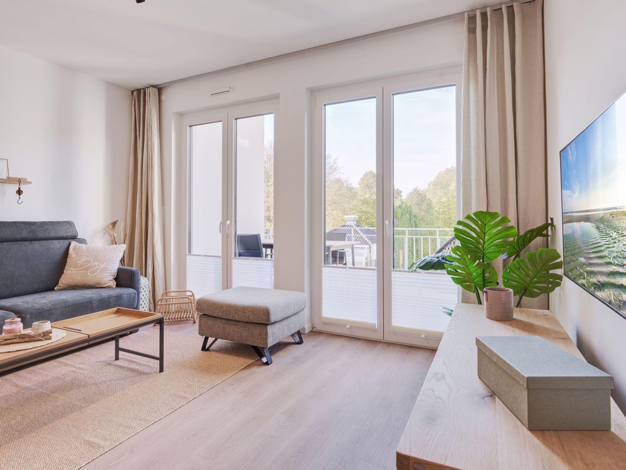 Die Ferienwohnung strahlt mit ihren bodentiefen Fenstern eine helle, behagliche Gemütlichkeit aus. Die Einbauküche im Wohn-Essbereich ist komplett ausgestattet und lässt keine Wünsche offen; Küchenzeile mit Backofen, Ceran-Kochfeld, Elektroherd,[nbsp] Geschirrspüler, Kühlschrank und Gefrierschrank, Filterkaffeemaschine, Nespresso-Maschine. Der Wohnbereich ist mit einem bequemen Sofa, einem Wohnzimmertisch, einem großen TV, Internetradio sowie einem Essbereich ausgestattet. Aus dem Wohnbereich gelangen Sie auf den herrlichen Sonnenbalkon nach Westen. Hier stehen Ihnen Tisch und Stühle sowie ein Relaxsessel zur Verfügung.