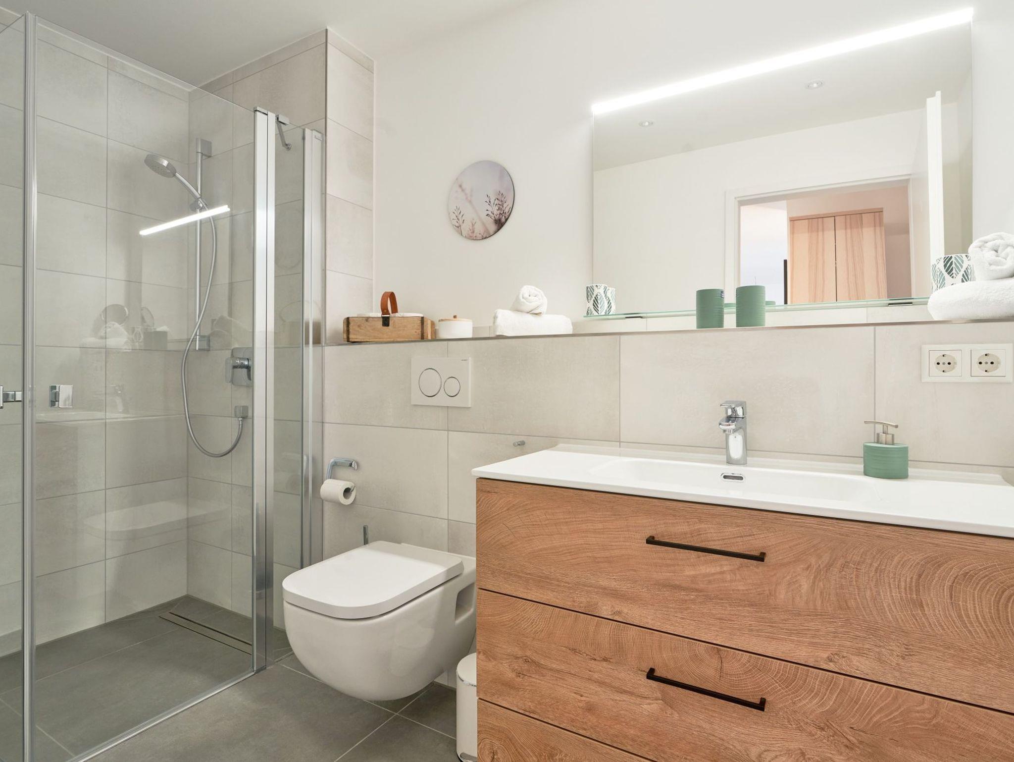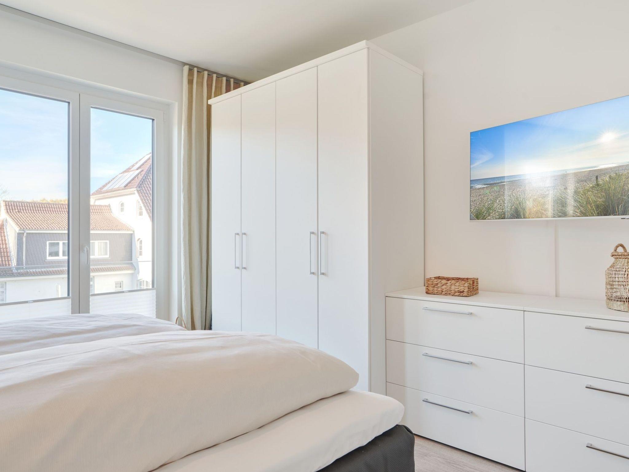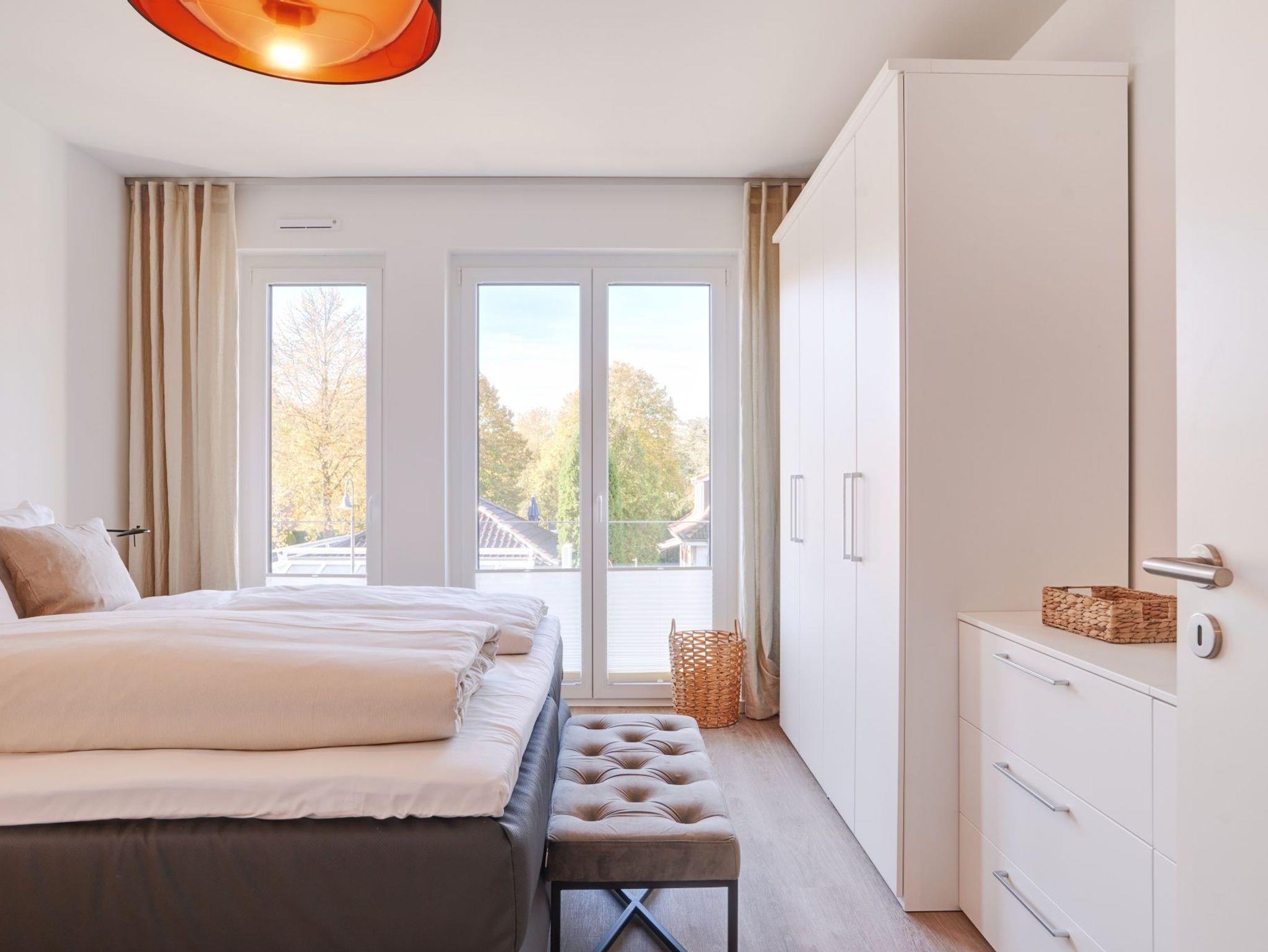 Das Schlafzimmer ist mit einem Boxspringbett (1,80mx2,00m) ausgestattet und verfügt über einen Kleiderschrank, 2 Nachttische sowie einen Wand-TV. Das Duschbad mit bodengleicher Dusche und Handtuchheizkörper, Fön, Kosmetikspiegel. Die ganze Wohnung ist mit einer Fußbodenheizung sowie mit einem Sicht- bzw. Lichtschutz an allen Fenstern und zusätzlichen elektrischen Rollläden ausgestattet.