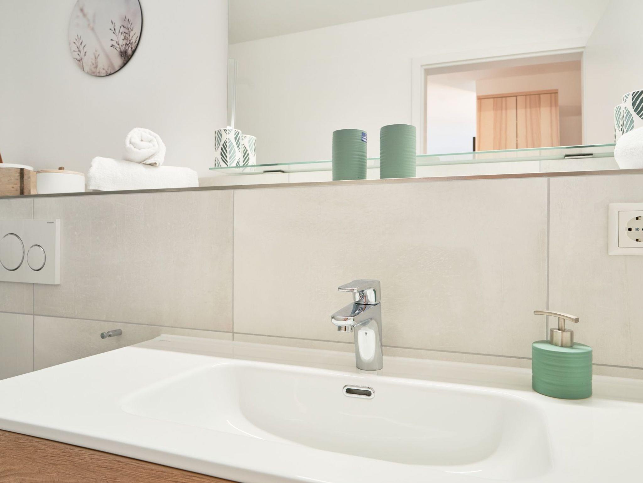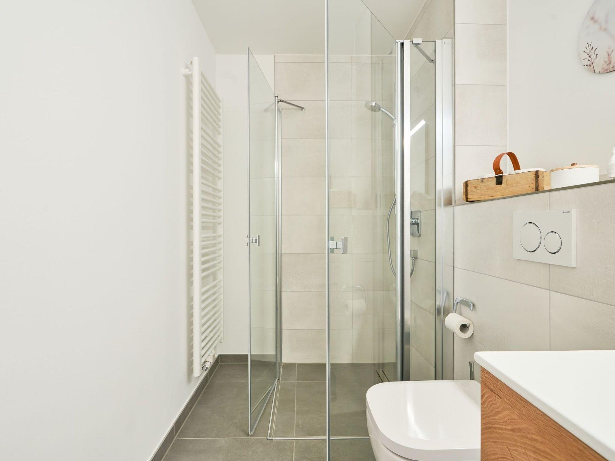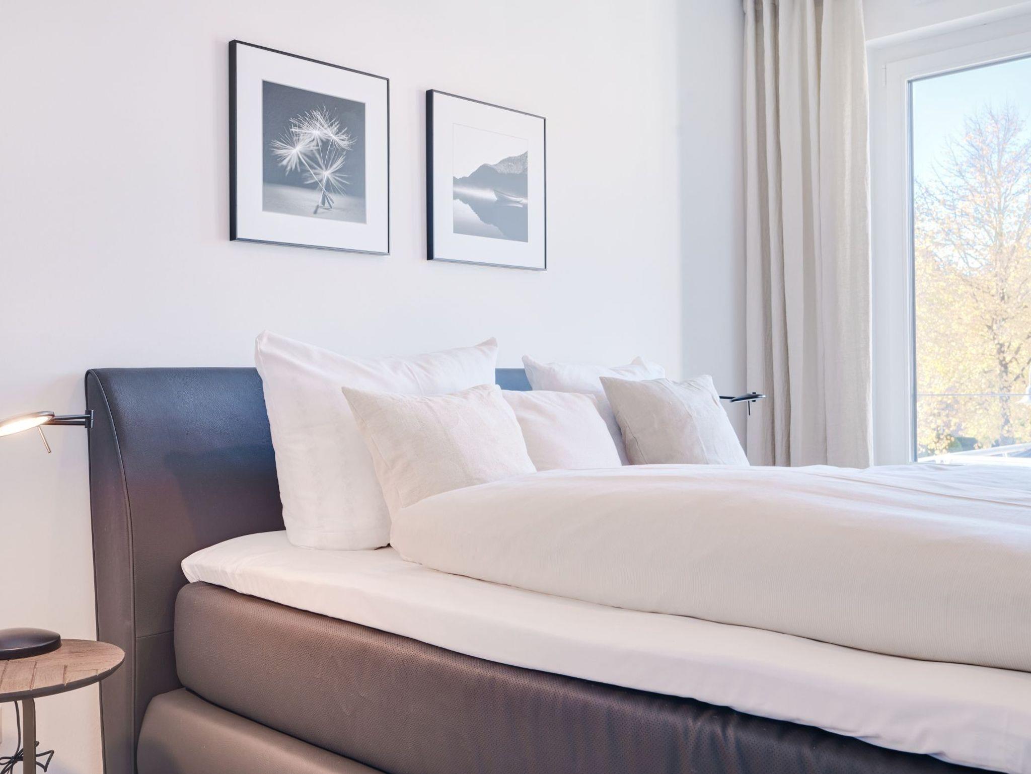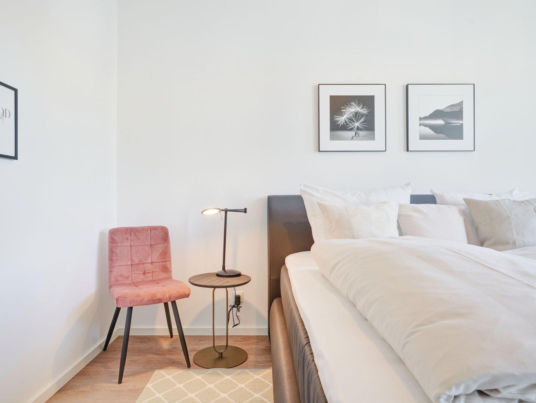Das Schlafzimmer ist mit einem Boxspringbett (1,80mx2,00m) ausgestattet und verfügt über einen Kleiderschrank, 2 Nachttische sowie einen Wand-TV. Das Duschbad mit bodengleicher Dusche und Handtuchheizkörper, Fön, Kosmetikspiegel. Die ganze Wohnung ist mit einer Fußbodenheizung sowie mit einem Sicht- bzw. Lichtschutz an allen Fenstern und zusätzlichen elektrischen Rollläden ausgestattet.
