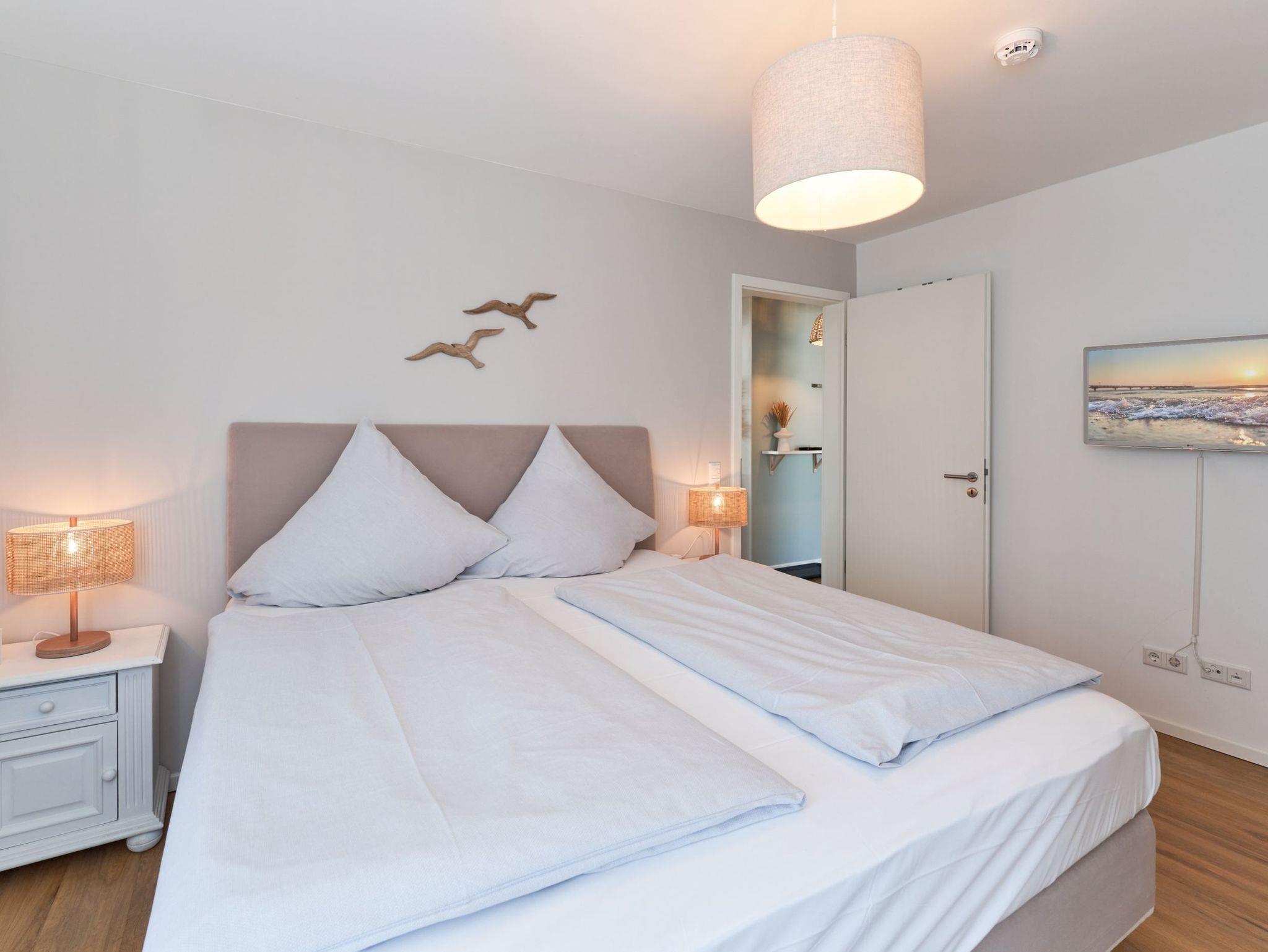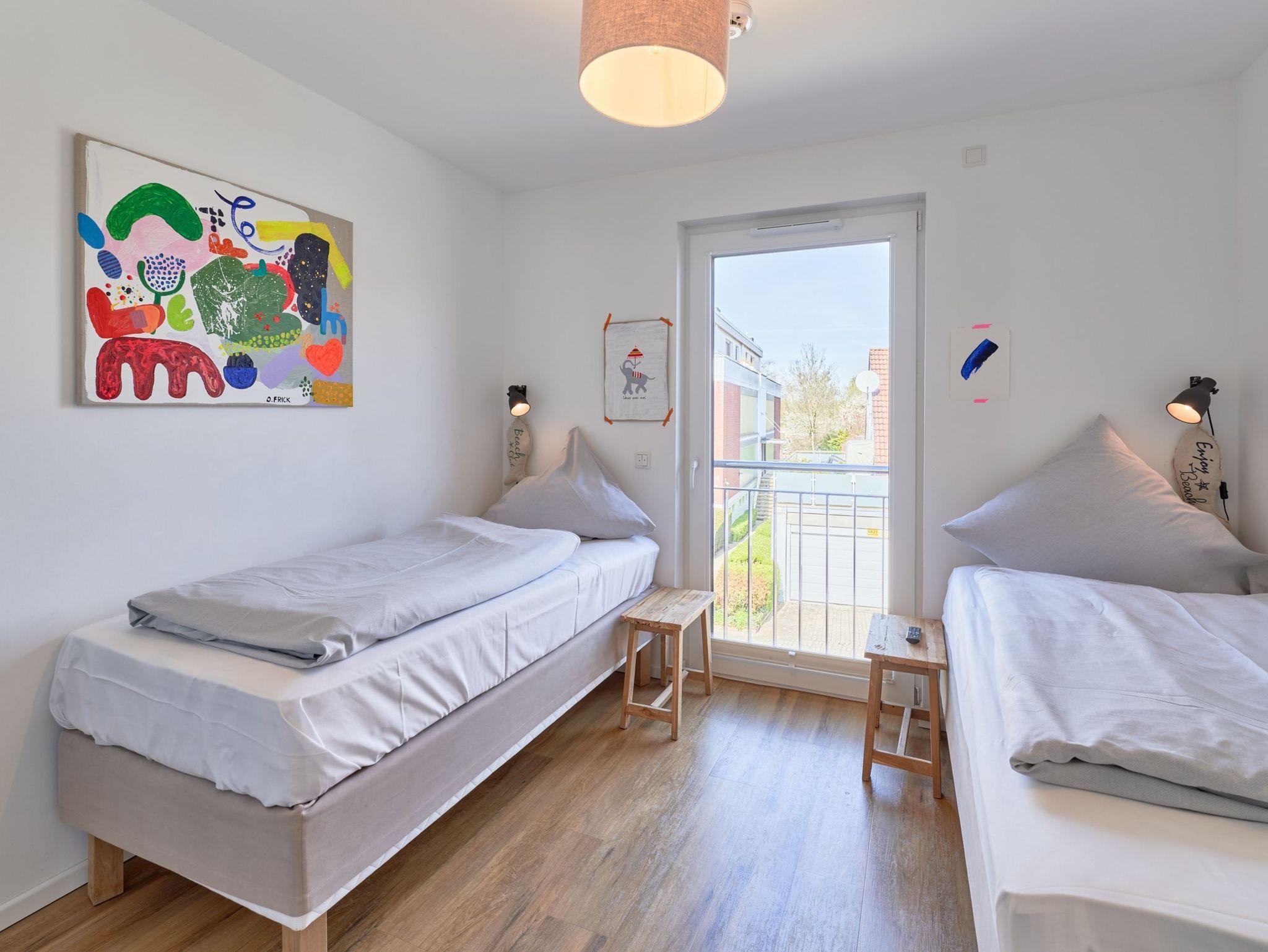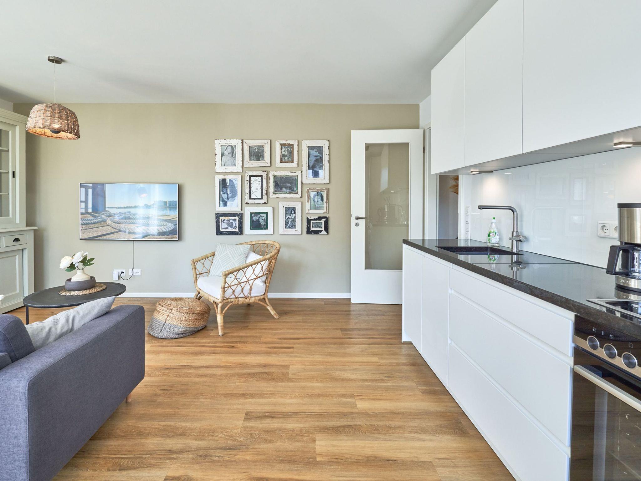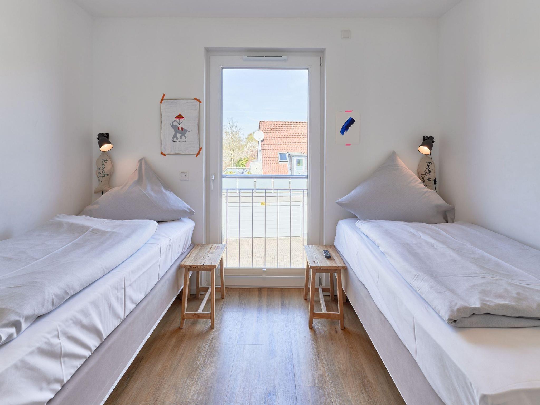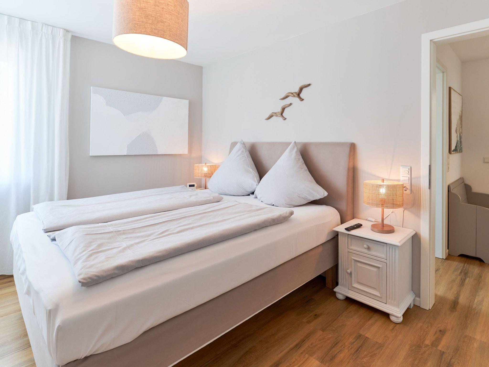 Genießen Sie Ihren Urlaub in dieser lichtdurchfluteten Ferienwohnung, die Ihnen mit ihren zwei geräumigen Schlafzimmern und dem großen Wohnzimmer mit integrierter Küche, großem Esstisch und gemütlicher Fernsehecke mit einer Bose-Musik-Station viel Raum zum Entspannen bietet. WLAN steht Ihnen kostenlos zur Verfügung. Der nach Südwesten ausgerichtete Balkon ist mit einer Liege sowie Tisch und Stühlen sowie einem Sonnenschutz ausgestattet. Im ersten Schlafzimmer steht ein bequemes Doppelbett, im 2. Schlafzimmer warten 2 Einzelbetten auf Sie. Beide Schlafzimmer sind mit Flachbildfernsehern ausgestattet. In allen Räumen sind elektrische Rollläden angebracht. Das helle Tageslichtbad verfügt über eine bodengleiche Dusche. Neben der Fußbodenheizung steht Ihnen hier ein Handtuchheizkörper zur Verfügung. Eine zur Wohnung gehörende Waschmaschine befindet sich im Keller.