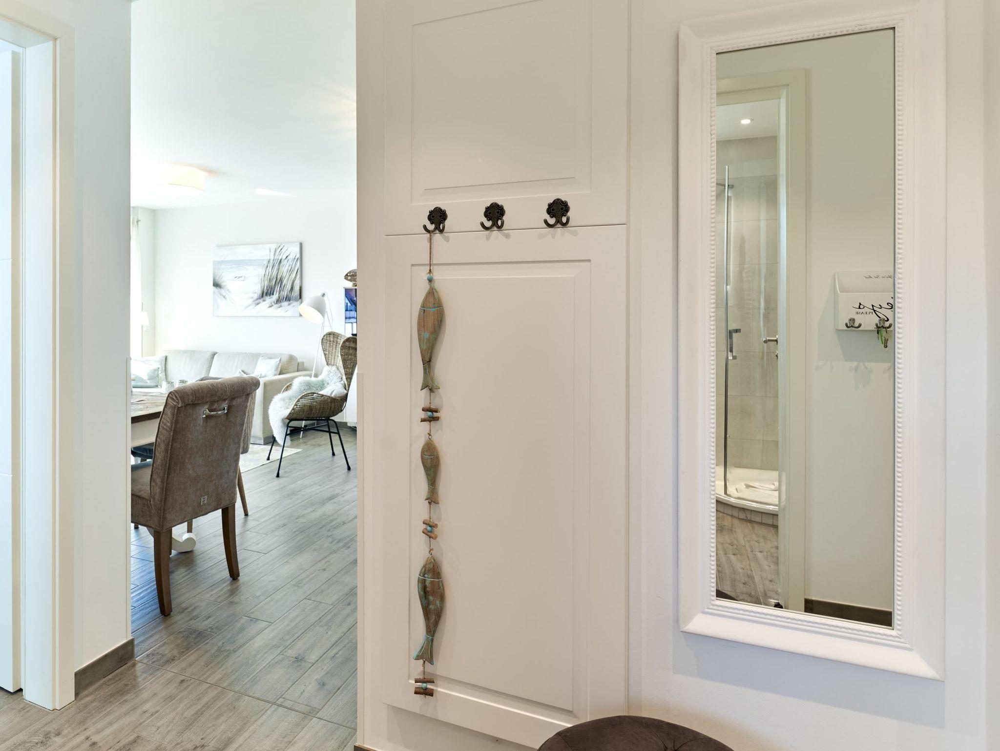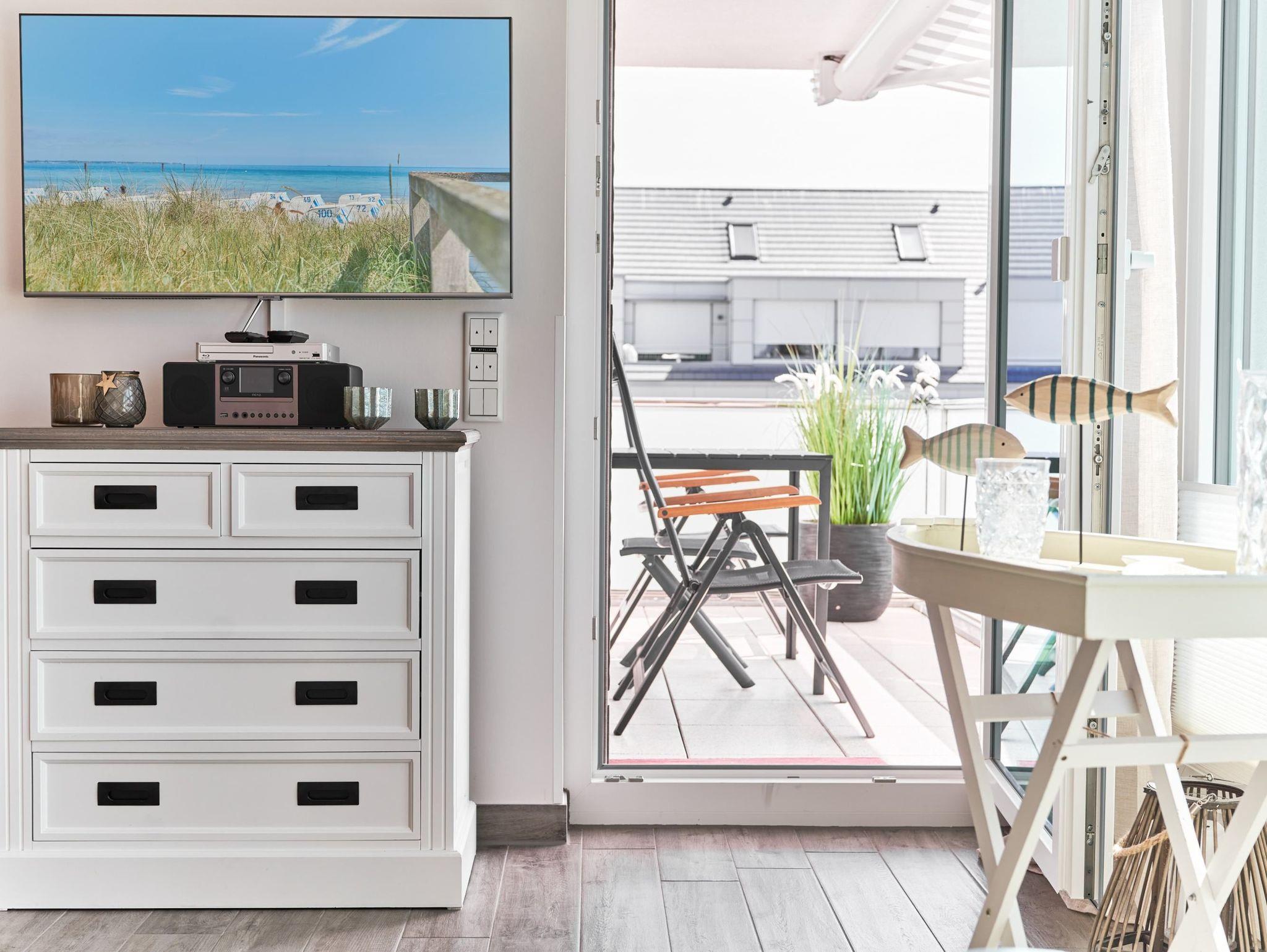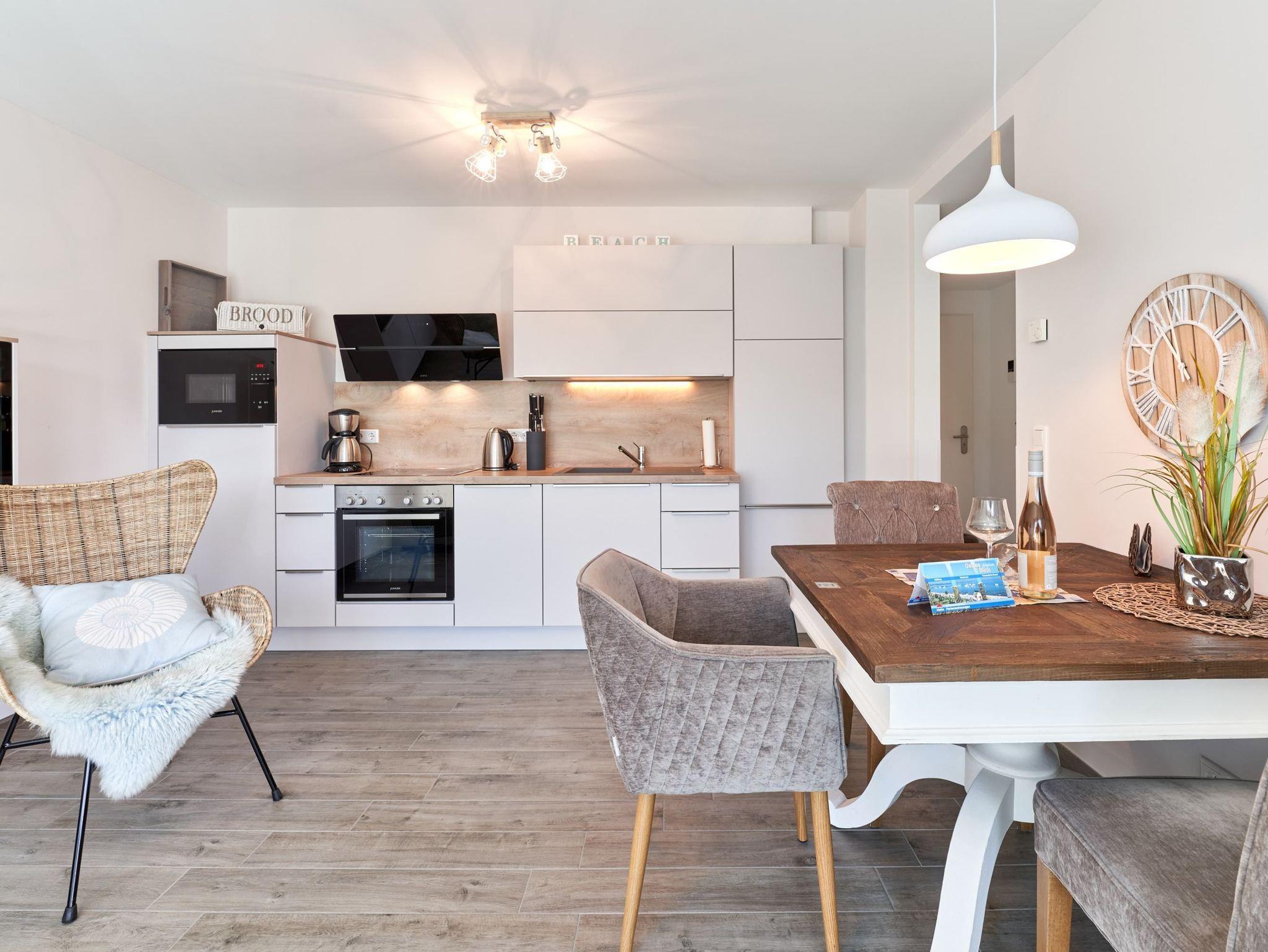 Die Ferienwohnung strahlt eine helle, behagliche Gemütlichkeit aus. Die offene Küche im Wohn-Essbereich ist komplett ausgestattet und lässt keine Wünsche offen; Küchenzeile mit Backofen, Ceran-Kochfeld, Elektroherd, Dunstabzug, Geschirr, Geschirrspüler, Kühlschrank incl. Gefrierfach, Mikrowelle, Filterkaffeemaschine, Pad-Kaffeemaschine, Toaster, Wasserkocher. Im Wohnbereich finden Sie alles, was zu einem Wohlfühlbereich gehört; ein Ecksofa, ausziehbar als Schlafmöglichkeit, Wohnzimmertisch (Coffee Table), TV SAT/Kabel, Blu-ray/CD-Player, Radio, TV-Board, Geschirrschrank, Esstisch mit 3 Stühlen, bodentiefe Fenster, elektrische Fensterrollläden. Das Schlafzimmer ist mit einem Boxspringbett (1,80 x 2,00m) ausgestattet und verfügt über einen Kleiderschrank, 2 Nachttische, TV SAT/KABEL, einen Spiegel sowie bodentiefe Fenster und Außenrollläden. Ein Tageslicht-Duschbad mit Dusche und Handtuchheizkörper, Radio, Fön, Kosmetikspiegel.