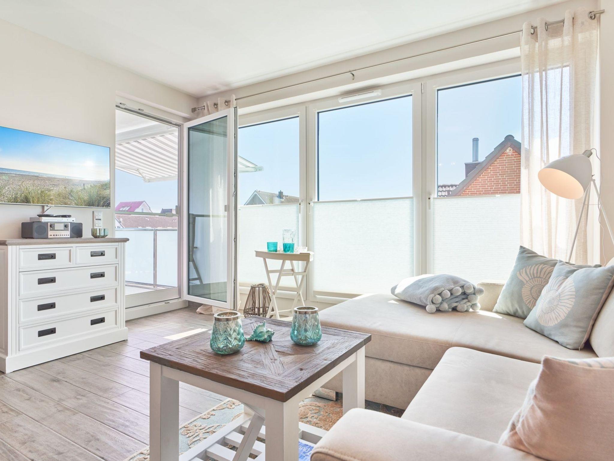 Tolle 2-Zimmer-Ferienwohnung im 2. OG, bequem mit dem Fahrstuhl zu erreichen. Südbalkon, Außenrollläden, kostenfreies WLAN, Tiefgaragenstellplatz mit E-Ladestation, (Durchfahrthöhe 2,00 m) Strandkorb am nahegelegenen Strand (saisonbedingt 15.05. ? 15.09.) inklusiv.