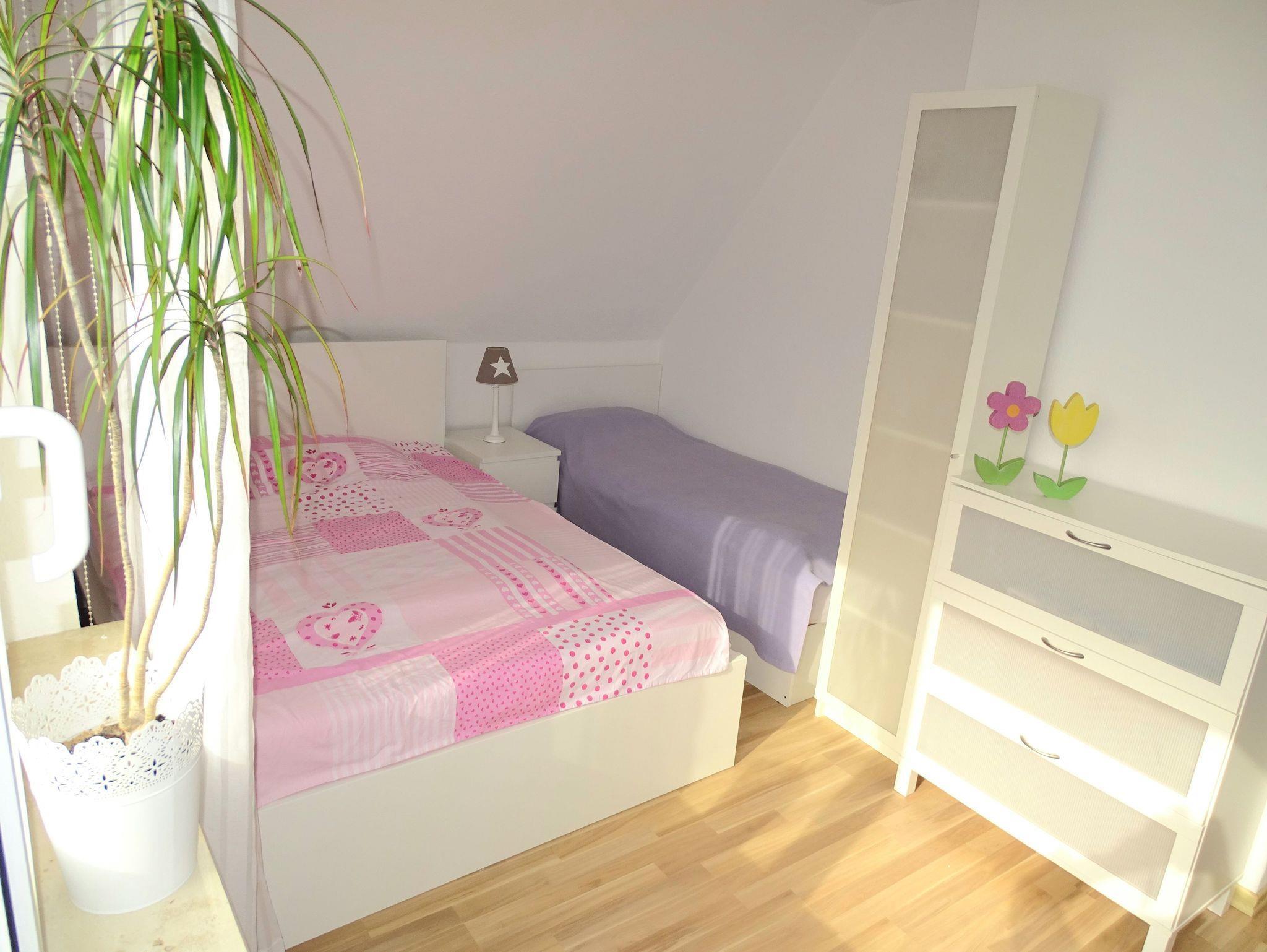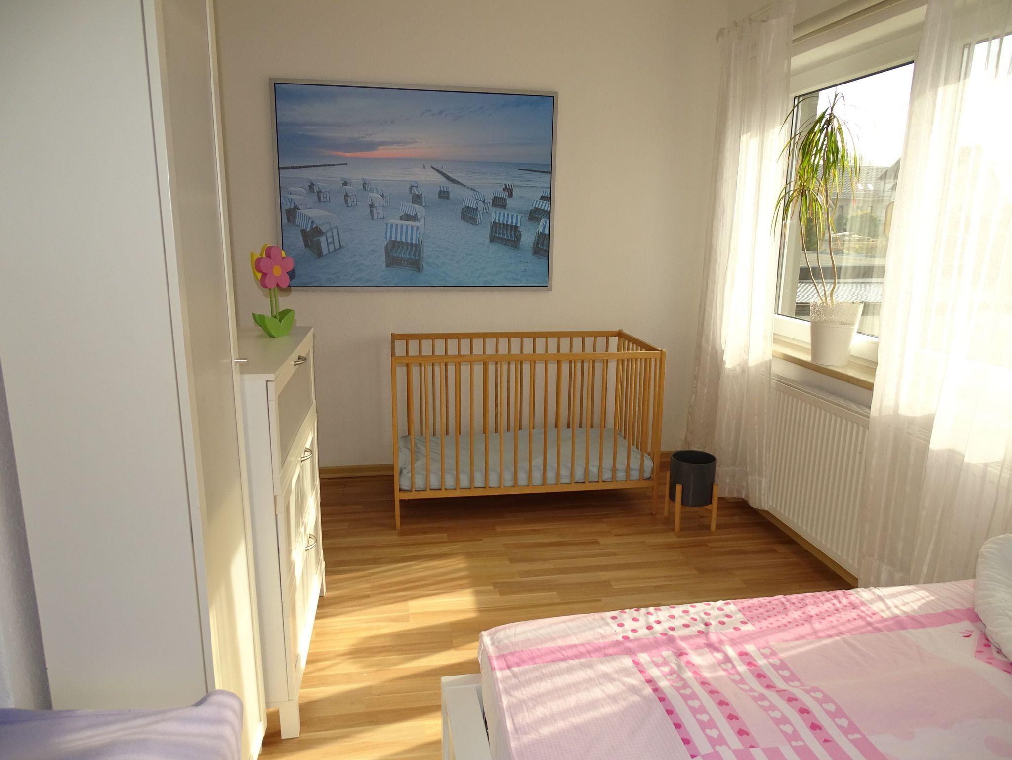 Ein Schlafzimmer ist mit einem Doppelbett (180x200m) eingerichtet. Im Kinderzimmer steht ein Bett (140 x200), ein Bett (90x200m) und ein Kinderbett mit Kinderstuhl, falls benötigt.