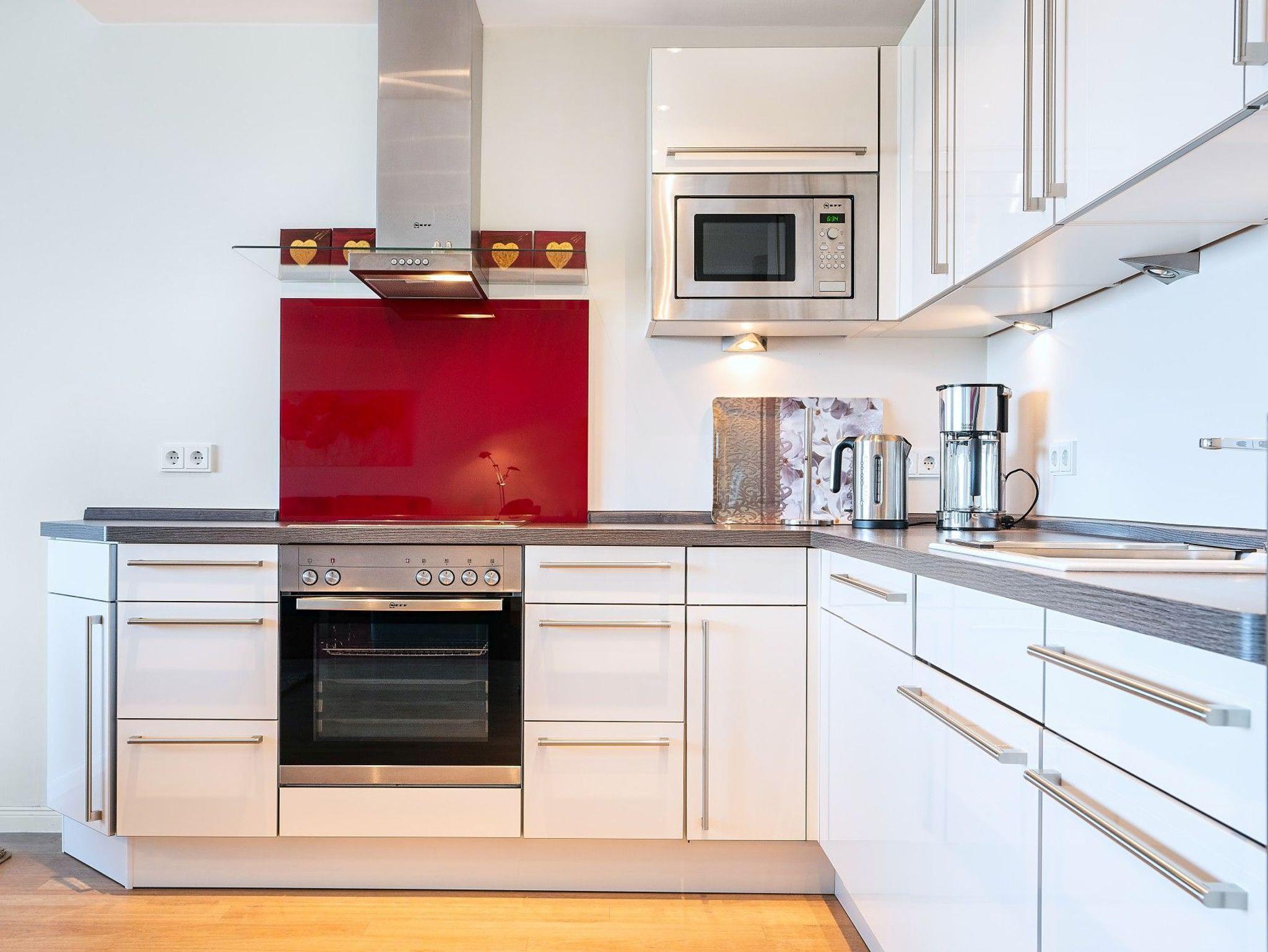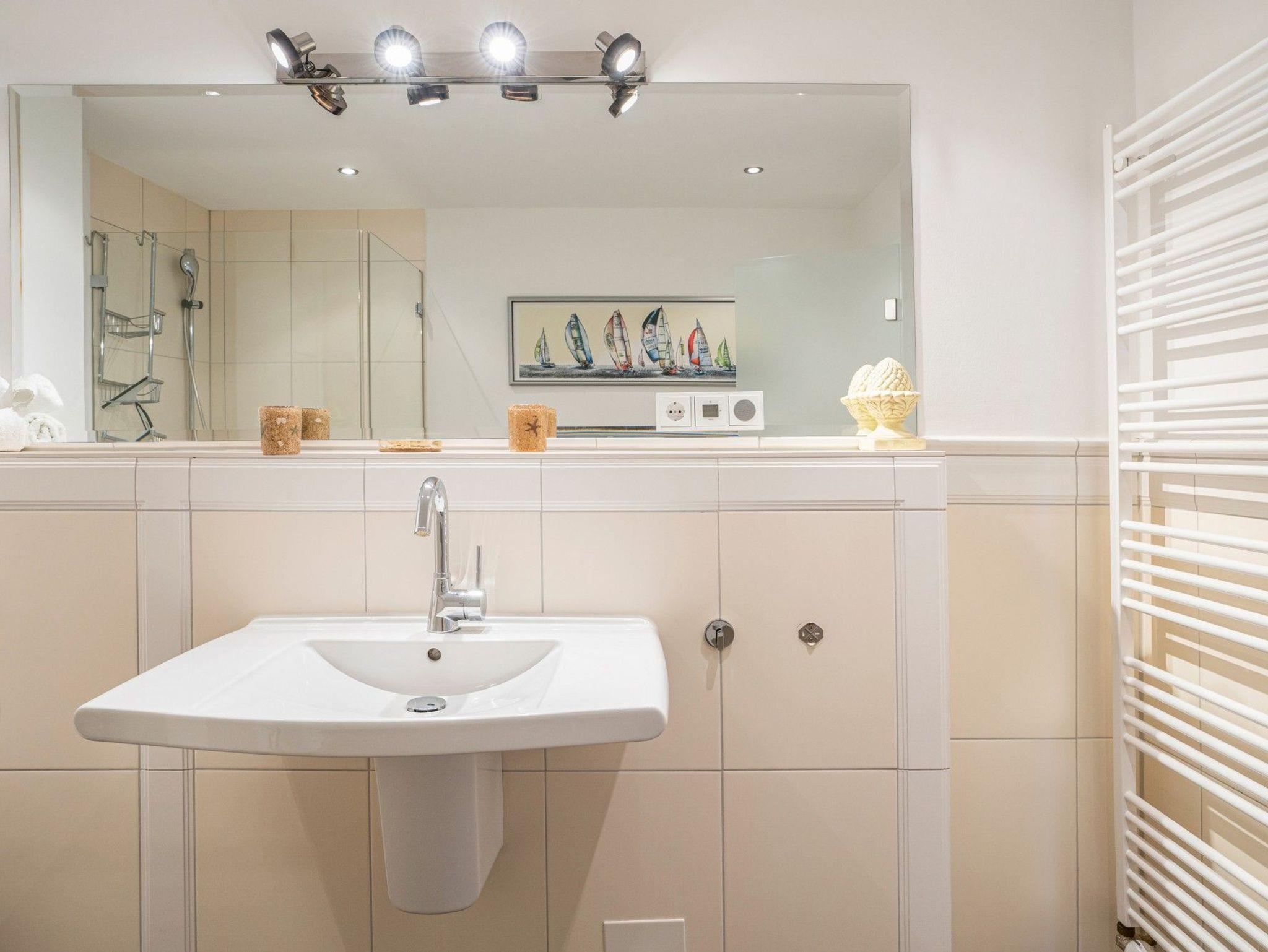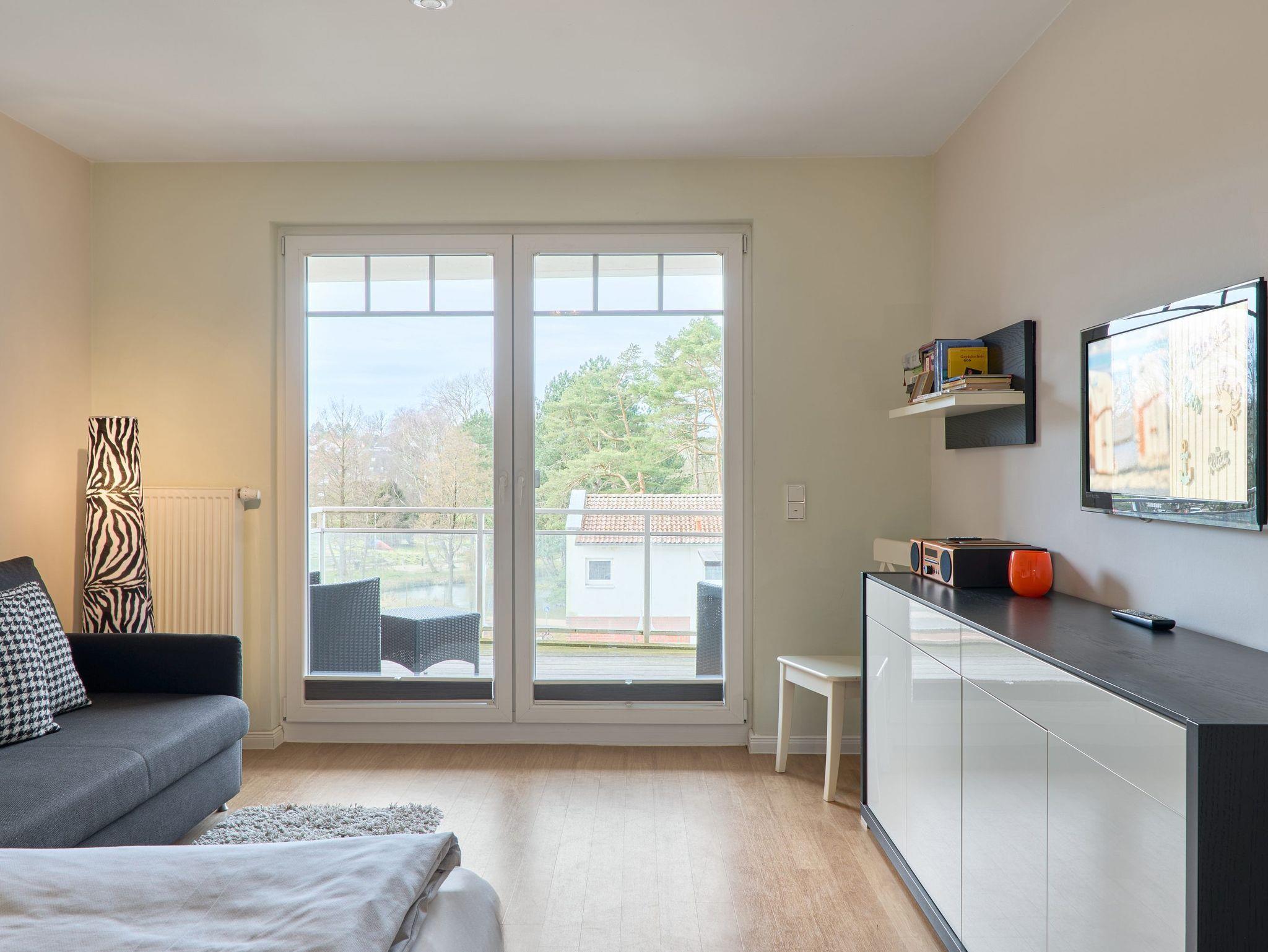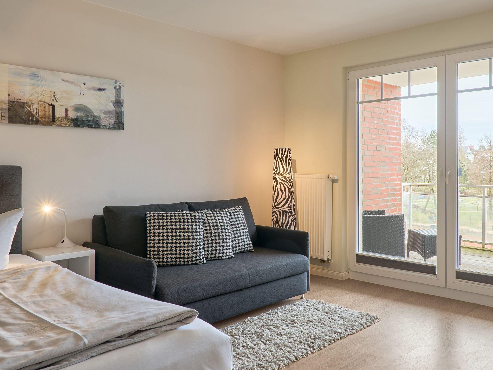 Der Wohn-Essbereich ist mit einem 2er- und einem 3er-Sofa sowie einem Sessel eingerichtet. Neben dem Flachbildfernseher, dem DVD-Player und einem CD-Player steht Ihnen selbstverständlich kostenloses WLAN zur Verfügung. Die helle Küche mit angrenzendem Esstisch ist komplett ausgestattet. Der großzügige Balkon mit Blick auf die Ostsee und mit Morgensonne ist windgeschützt und überdacht. Neben Tisch und Stühlen verfügt er über einen Sonnenschutz. Das erste Schlafzimmer ist mit einem Doppelbett (1,80 x 2,00m) und einem geräumigen Kleiderschrank sowie einem Flachbildfernseher ausgestattet. Das zweite Schlafzimmer verfügt über ein Boxspringbett (1,80 x 2,00m), ein Sideboard und ein Sofa, das schnell in ein Schlafsofa umgebaut werden kann. Auch hier ist ein Flachbildfernseher für Sie bereitgestellt. Ein nettes Extra ist hier sicher die Yamaha-Stereoanlage. Von beiden Schlafzimmern gelangen Sie auf den Balkon Richtung Kurpark, wo Sie die Nachmittagssonne bis in den Abend genießen können. Die Badezimmer verfügen über große Duschen und unterfahrbare Waschbecken. Diese Wohnung ist daher auch für Rollstuhlfahrer geeignet.
