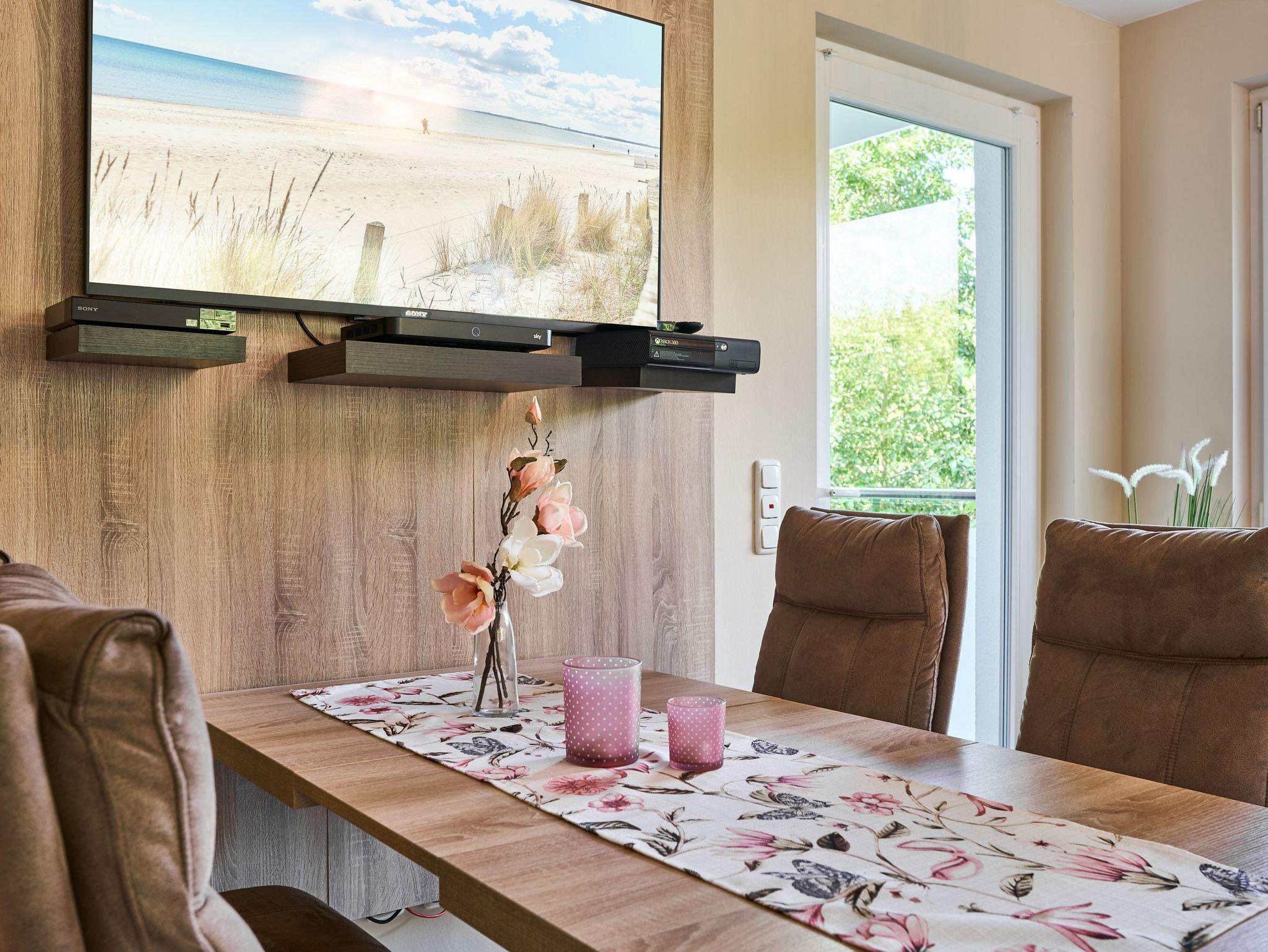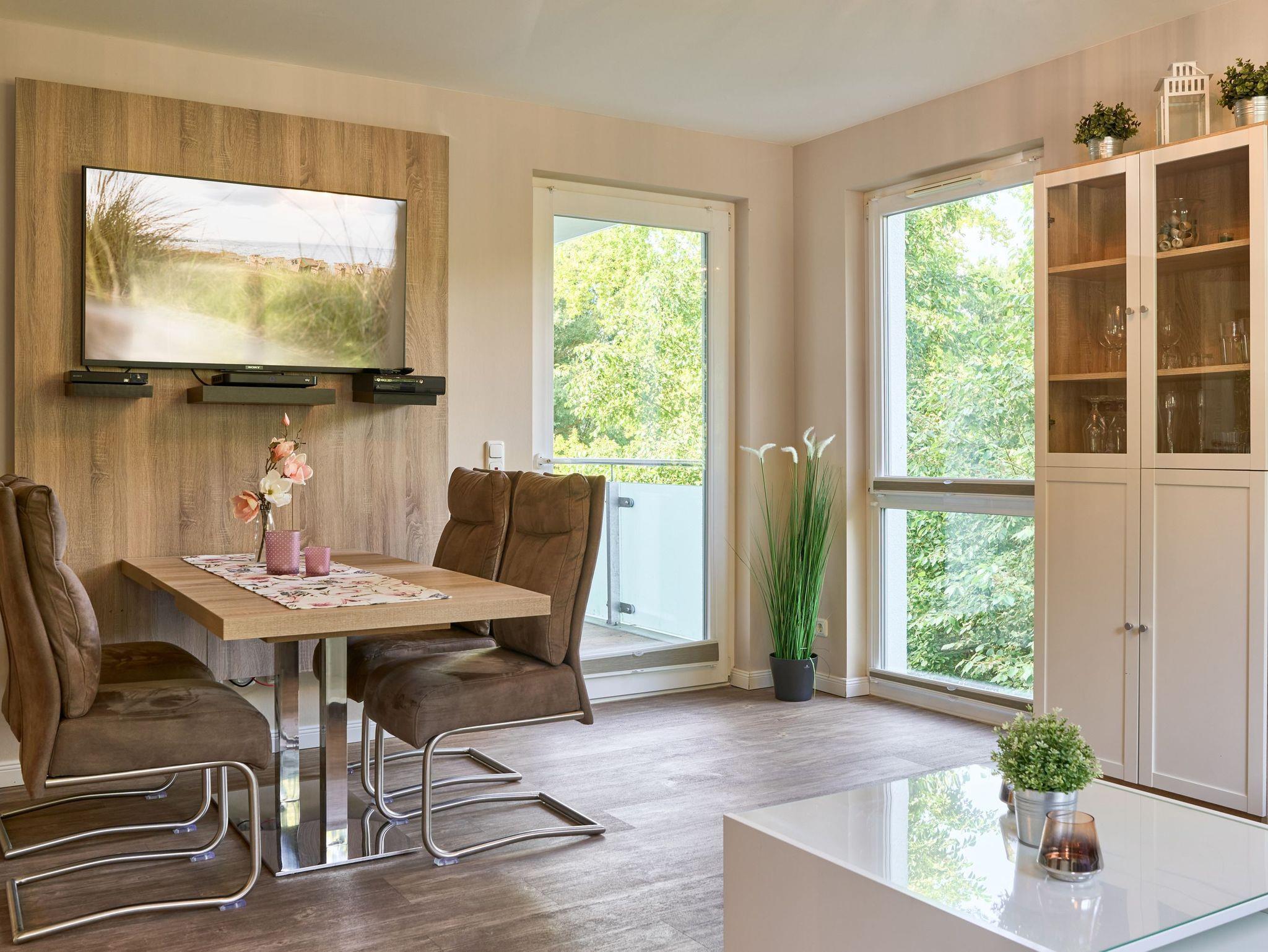 Diese Ferienwohnung bietet Ihnen einen gemütlichen Wohn-Essbereich mit einer Couch, die sich mit nur wenigen Handgriffen in ein bequemes Bett mit Kaltschaummatratze umwandeln lässt. Neben dem Flachbildfernseher und dem Blu-ray-Player steht Ihnen eine Stereoanlage zur Verfügung sowie Streaming Dienste wie Netflix und Amazon Prime (Anmeldung mit eigenem Account). Kostenloses WLAN ist selbstverständlich. Der Balkon ist mit Tisch und Stühlen ausgestattet. Die moderne Küche ist komplett ausgestattet. Es steht ein Kaffeeautomat mit Milchaufschäumer zur Verfügung. Ein besonderes Extra ist hier eine Eiswürfelmaschine. Das Schlafzimmer ist mit einem geräumigen Schrank, einem Boxspringbett (1,80 x 2,00m, durchgehender Topper) und einem großen Flachbildfernseher ausgestattet. Zur Verdunkelung sind Plissees angebracht. Das helle Tageslichtbad verfügt über eine bodentiefe Dusche, einen großen Spiegel und eine Waschmaschine. Neben der Fußbodenheizung ist hier ein zusätzlicher Handtuchheizkörper angebracht.
