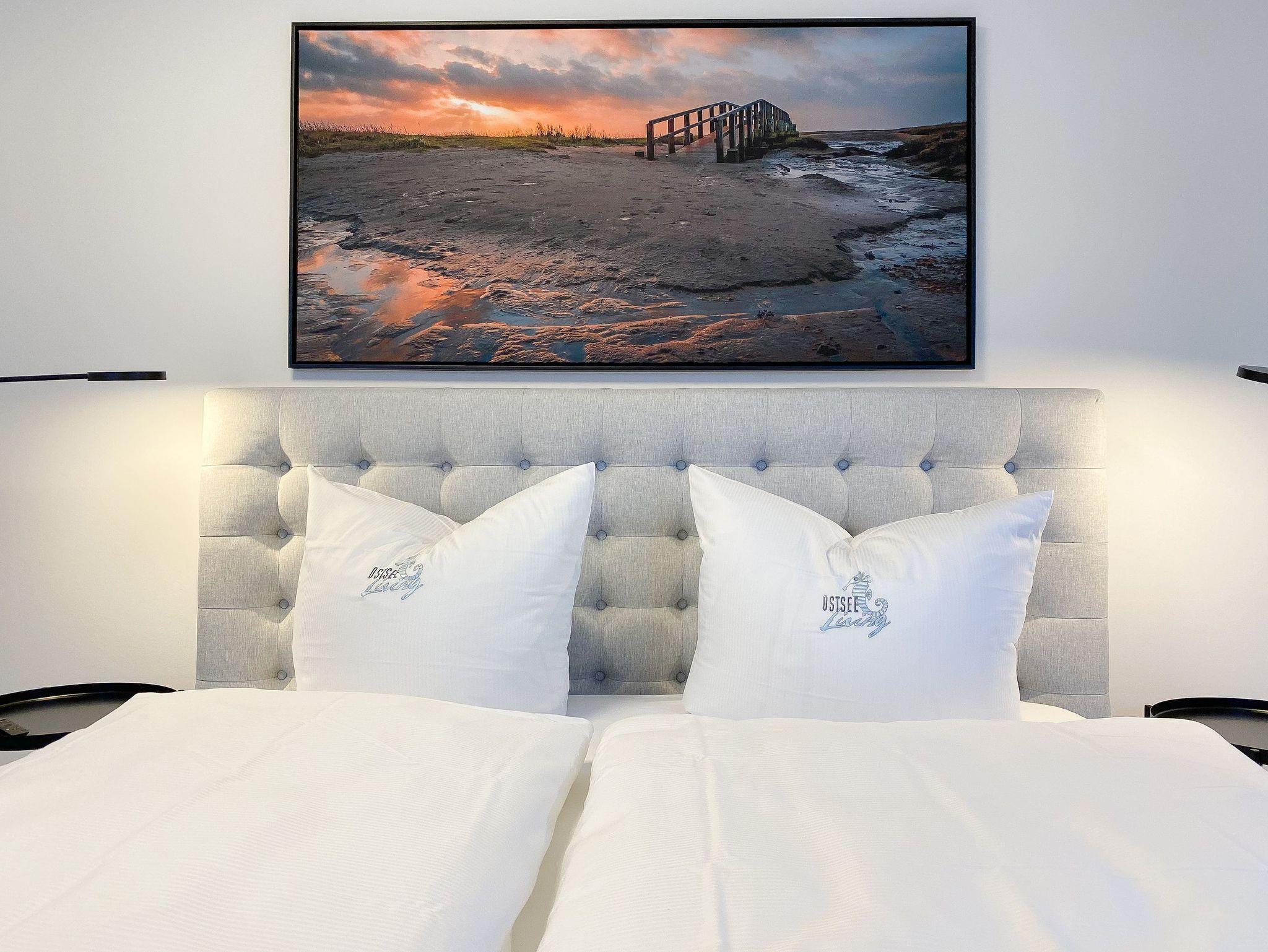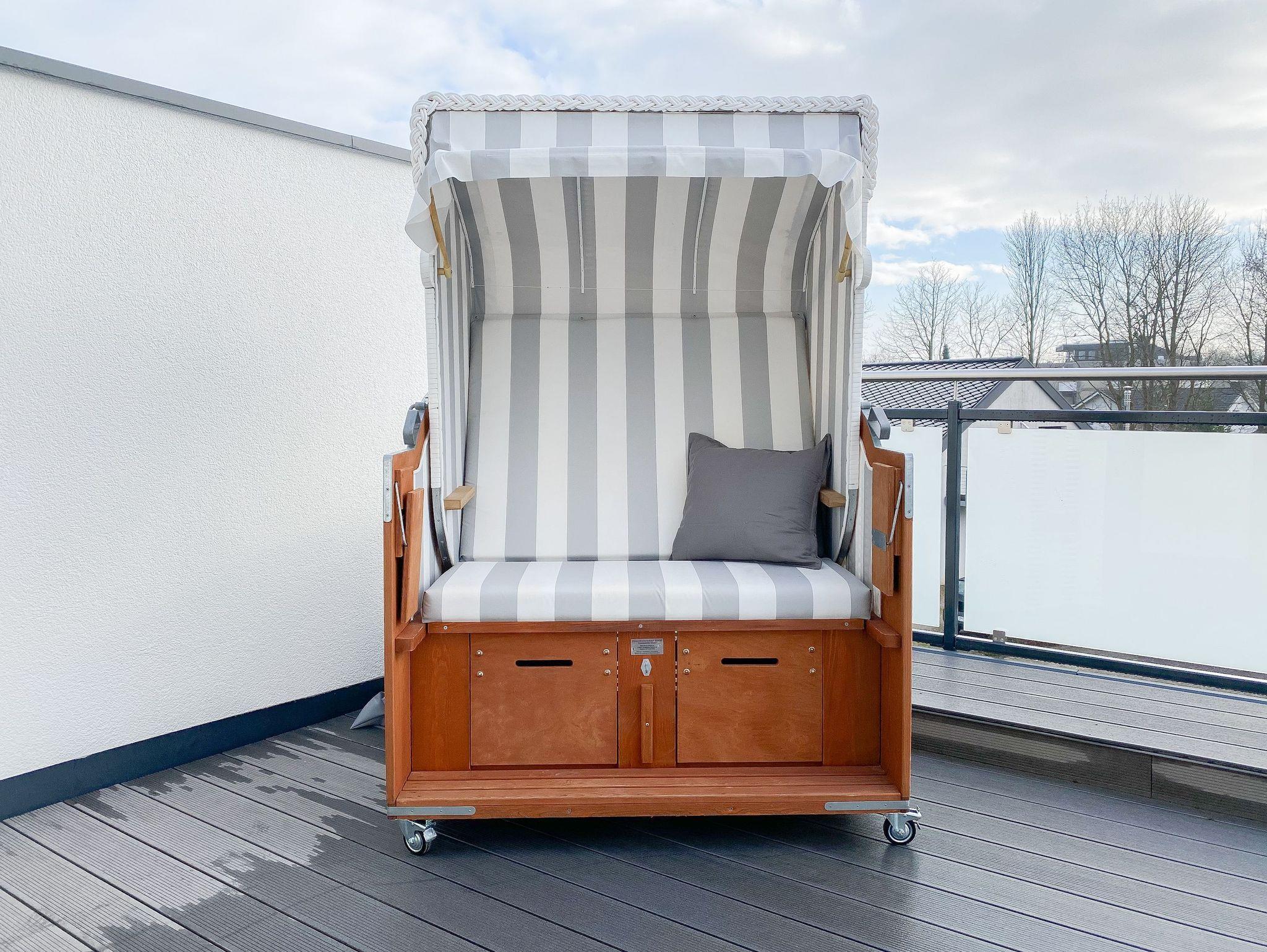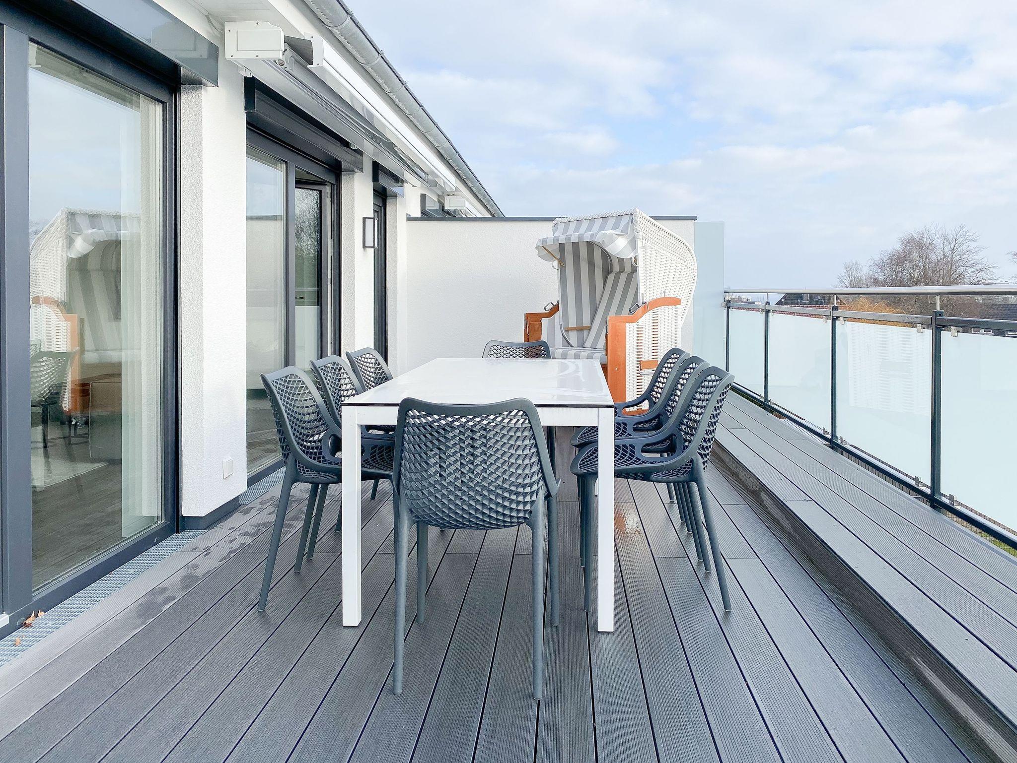Das Penthouse erstreckt sich über 2 Wohnebenen und bietet auf über 100 qm Wohnfläche ausreichend Raum für 4-6 Personen, um einen entspannten Urlaub zu verleben. Mittelpunkt der unteren Ebene ist der großzügig kombinierte Wohn- Essbereich mit Smart TV und Soundbar. Die anschließende Einbauküche, die dank bester Ausstattung keine Wünsche offen lässt, lädt zum gemeinsamen Kochen ein. Bodentiefe Fensterelemente sorgen für lichtdurchflutete Räumlichkeiten und bieten einen direkten Zugang auf die großzügig angelegte Dachterrasse, auf der Sie im Strandkorb sitzend die Sonne genießen und die Seele baumeln lassen können. Für Schatten sorgt die elektrische Markise und für gemeinsame Mahlzeiten steht eine Essgruppe mit ausreichend Platz für 8 Personen zur Verfügung. Über den Flur erreichen Sie das erste Schlafzimmer, ausgestattet mit einem Boxspringbett (180x200) und TV sowie ein geräumiges Bad mit Walk In Dusche, Fenster und integriertem Waschtrockner. Alle Fenster der unteren Ebene sind mit elektrischen Außenjalousien versehen. Auf der zweiten Wohnebene erwartet Sie ein weiteres Tageslichtbad mit Walk In Dusche und ein äußerst großes Schlafzimmer, ausgestattet mit einem Boxspringbett (180x200) und zwei Hockern, die zum Gästebett ausgezogen werden können. Die Fenster sind mit Black Out Plissees versehen und ein TV ist ebenfalls vorhanden.