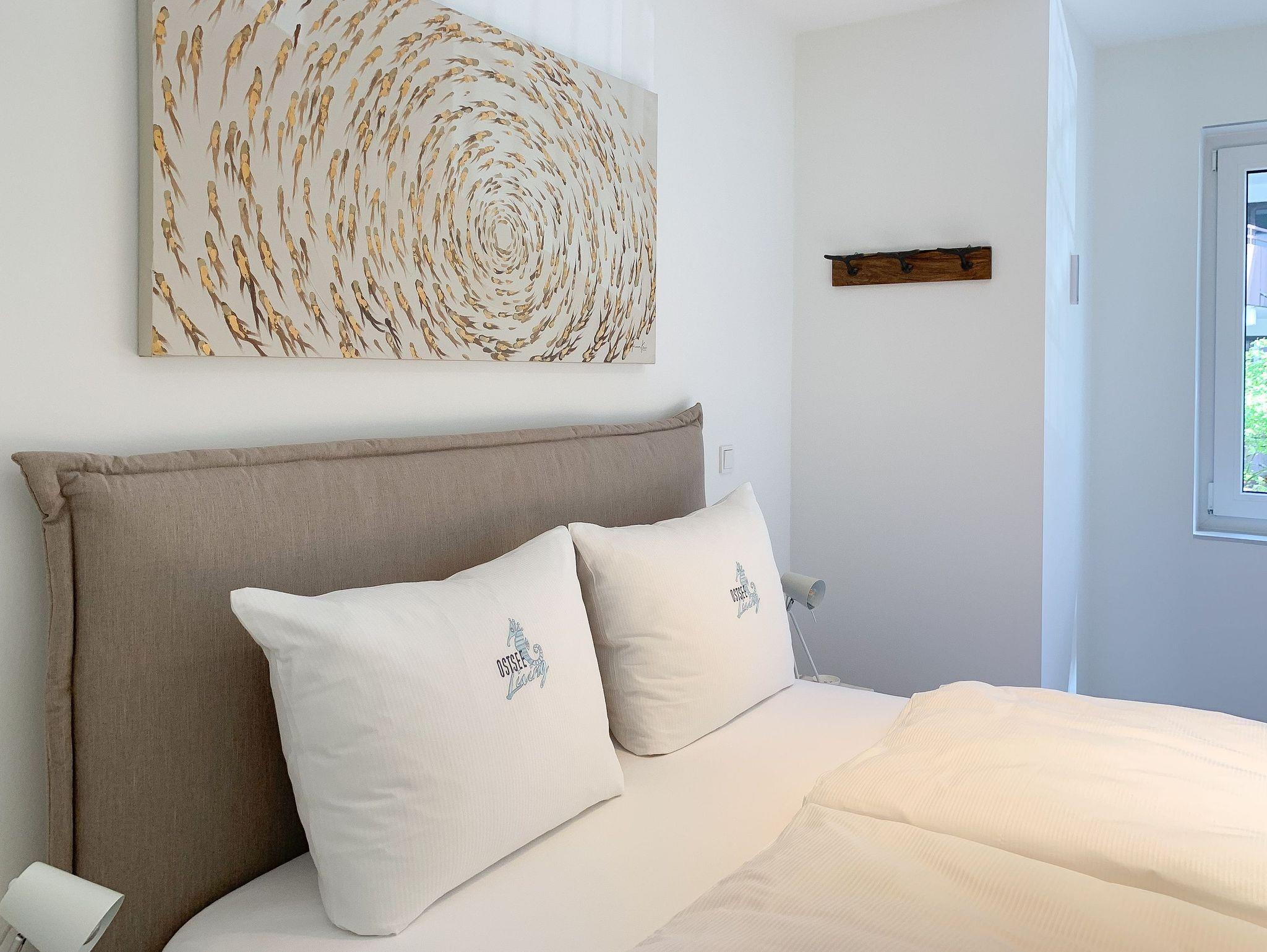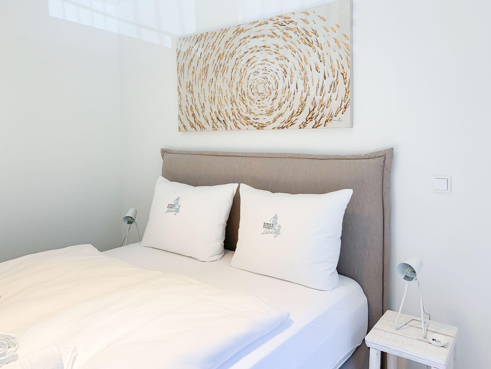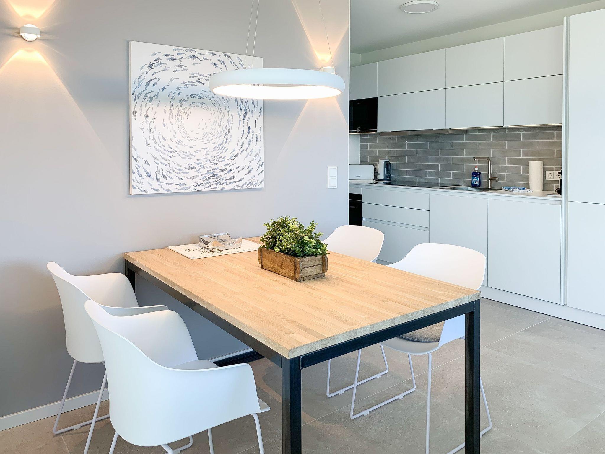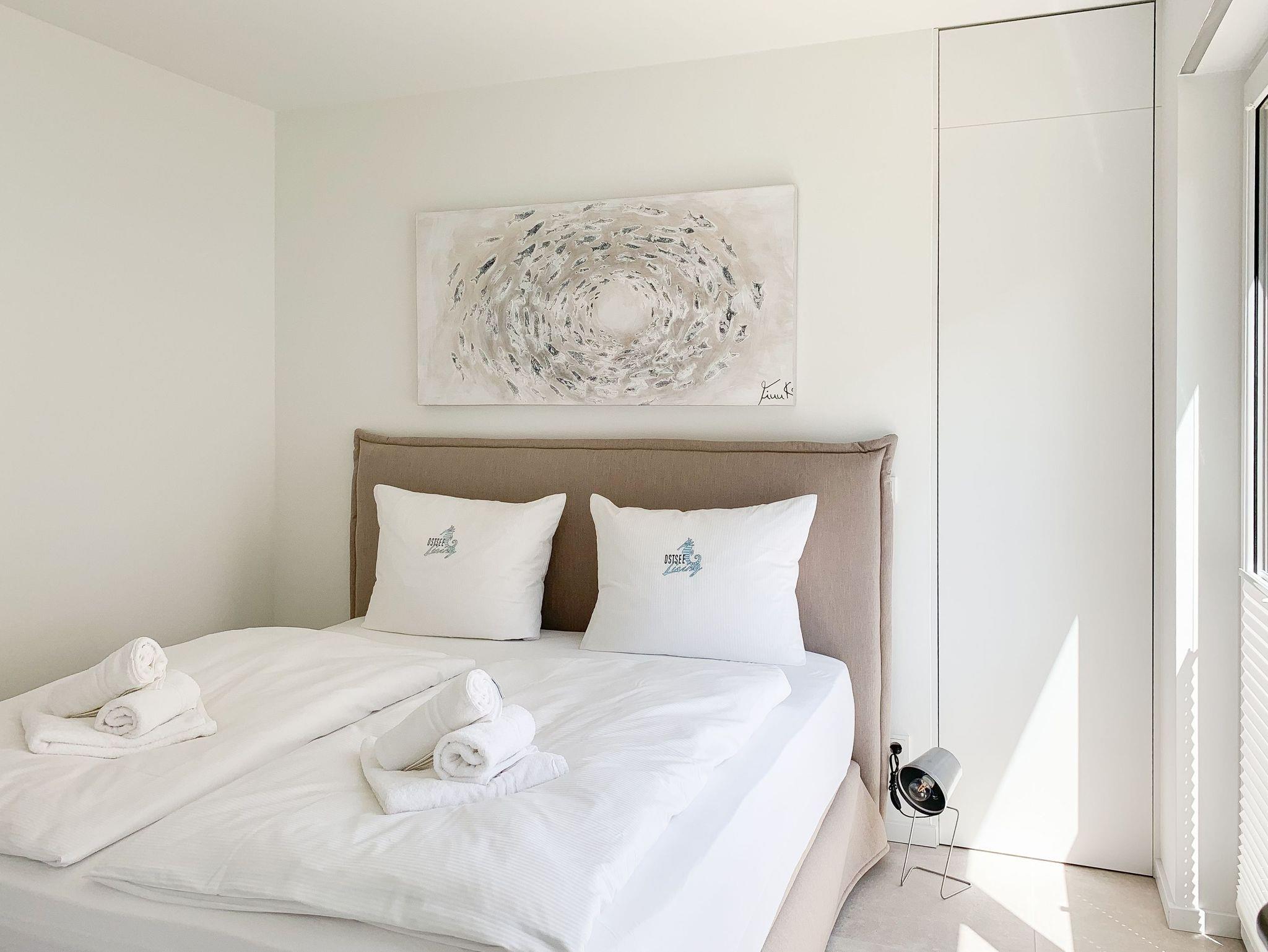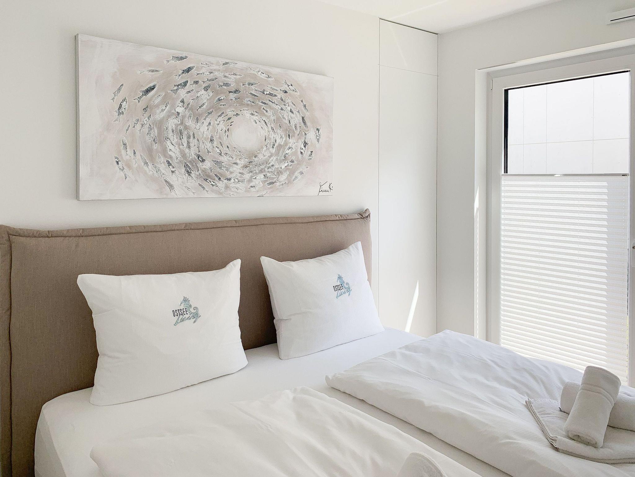 Mit zwei Schlafzimmern und zwei Duschbädern bietet die sehr hochwertig eingerichtete Ferienwohnung ausreichend Raum für vier Personen, um einen entspannten Urlaub zu verleben. Der herrliche Blick auf die Ostsee aus der Wohnung und von der großzügig angelegten Terrasse in Süd Ost Ausrichtung, machen dieses Objekt zu jeder Jahreszeit zu etwas Besonderem .Der großzügige Wohn- Essbereich mit riesigen Fensterflächen und die angrenzende Designküche, in bester Ausstattung mit hochwertigen Markengeräten, bilden den Mittelpunkt der Wohnung. Es stehen zwei TV, ein Sonos Bluetooth Lautsprecher, Radio und WLAN zur Verfügung. Die Wohnung ist mit einer Fußbodenheizung ausgestattet und alle Fenster sind mit elektrischen Außenjalousien versehen. Waschmaschine und Trockner sind im Flur der Wohnung in einem Einbauschrank untergebracht. Ein insgesamt exklusives Objekt mit entsprechendem Ambiente.