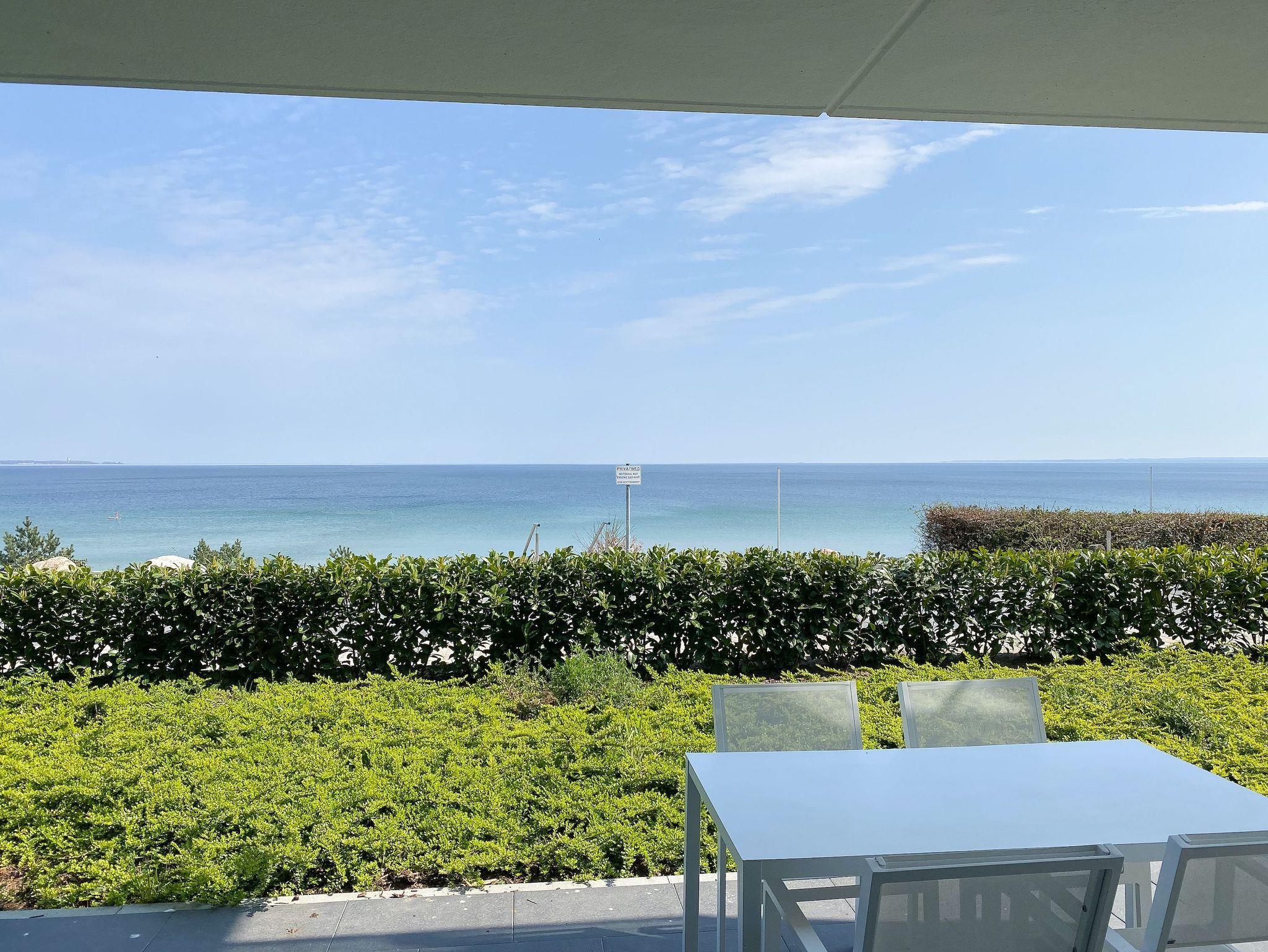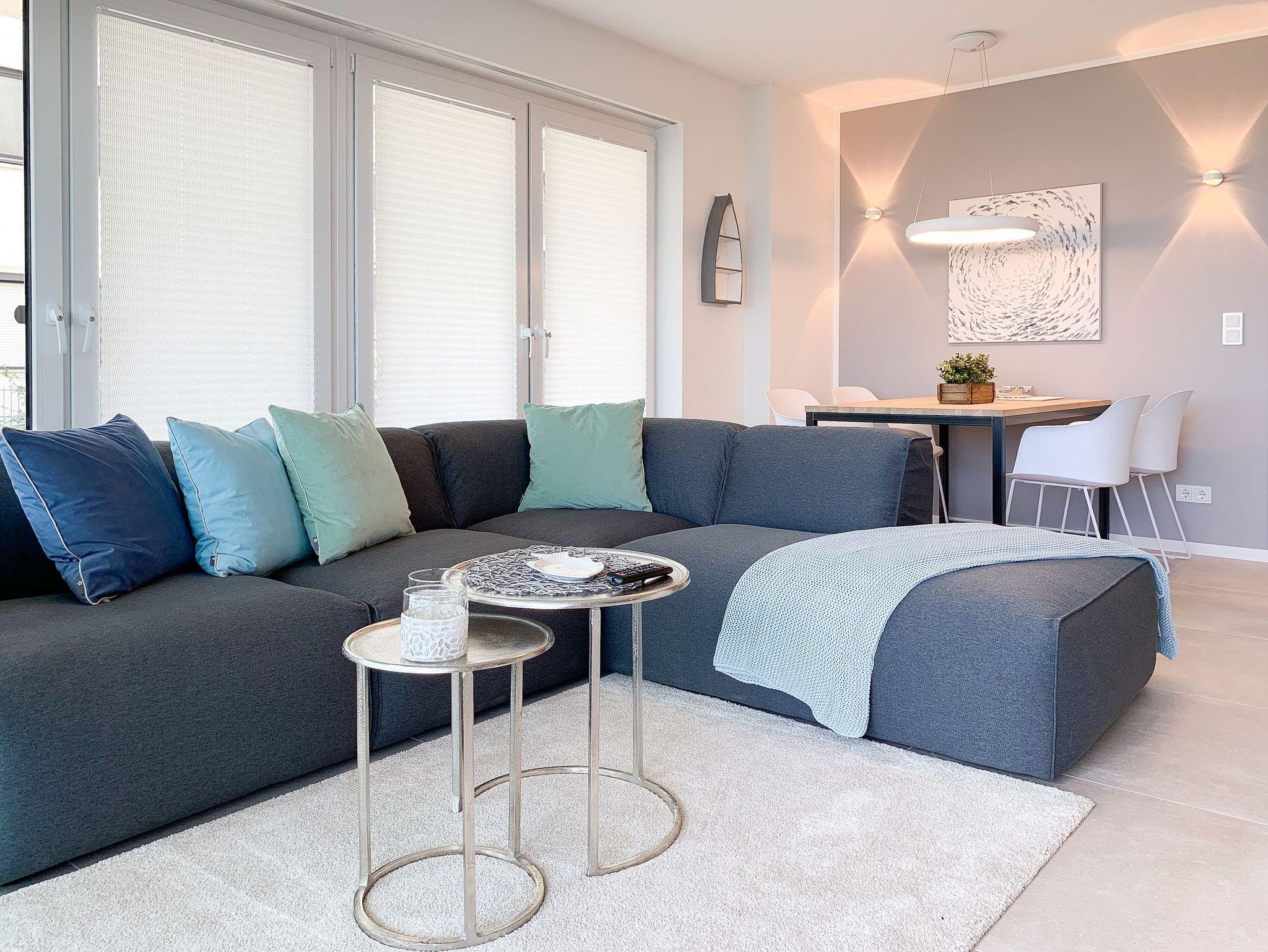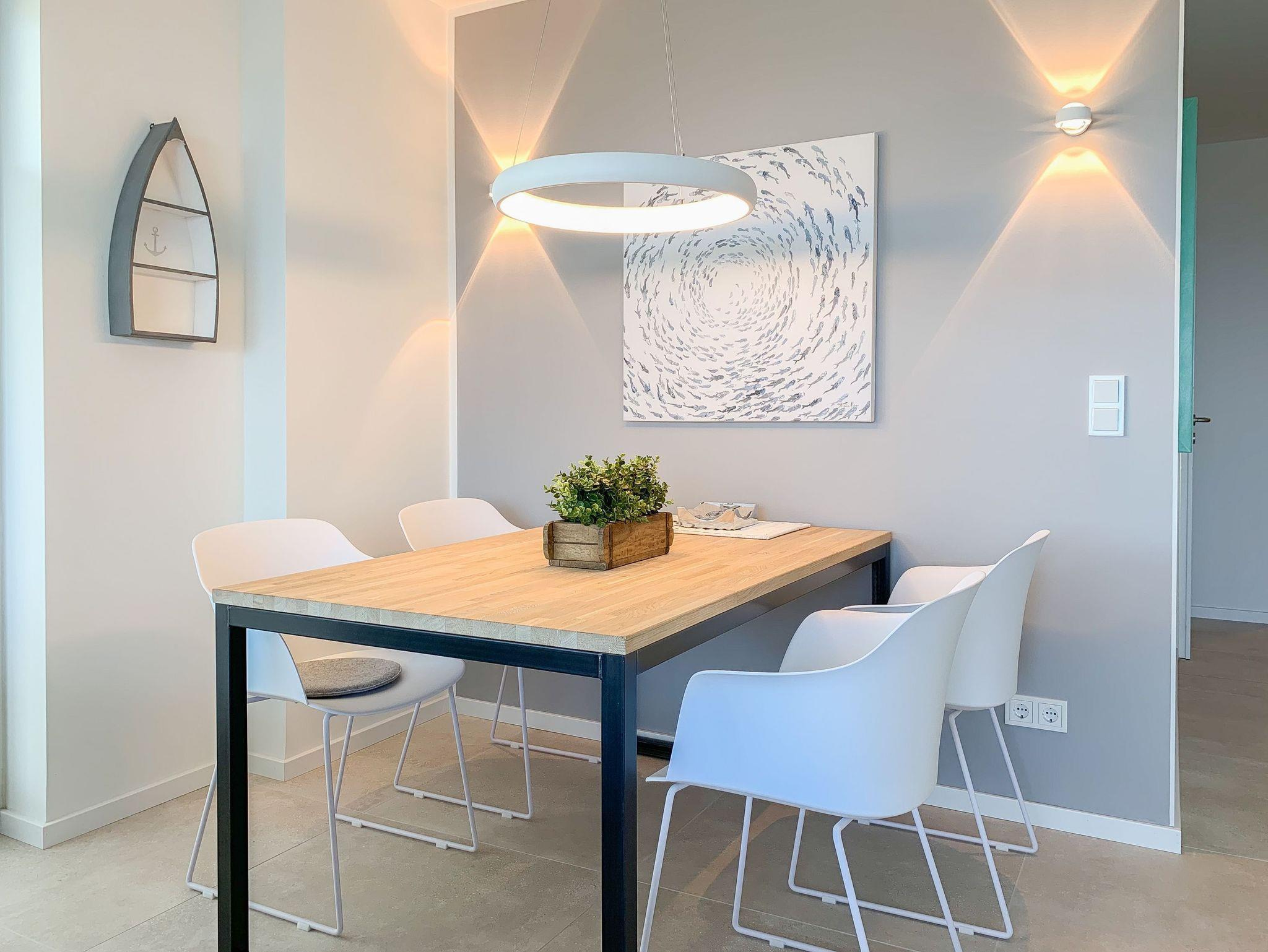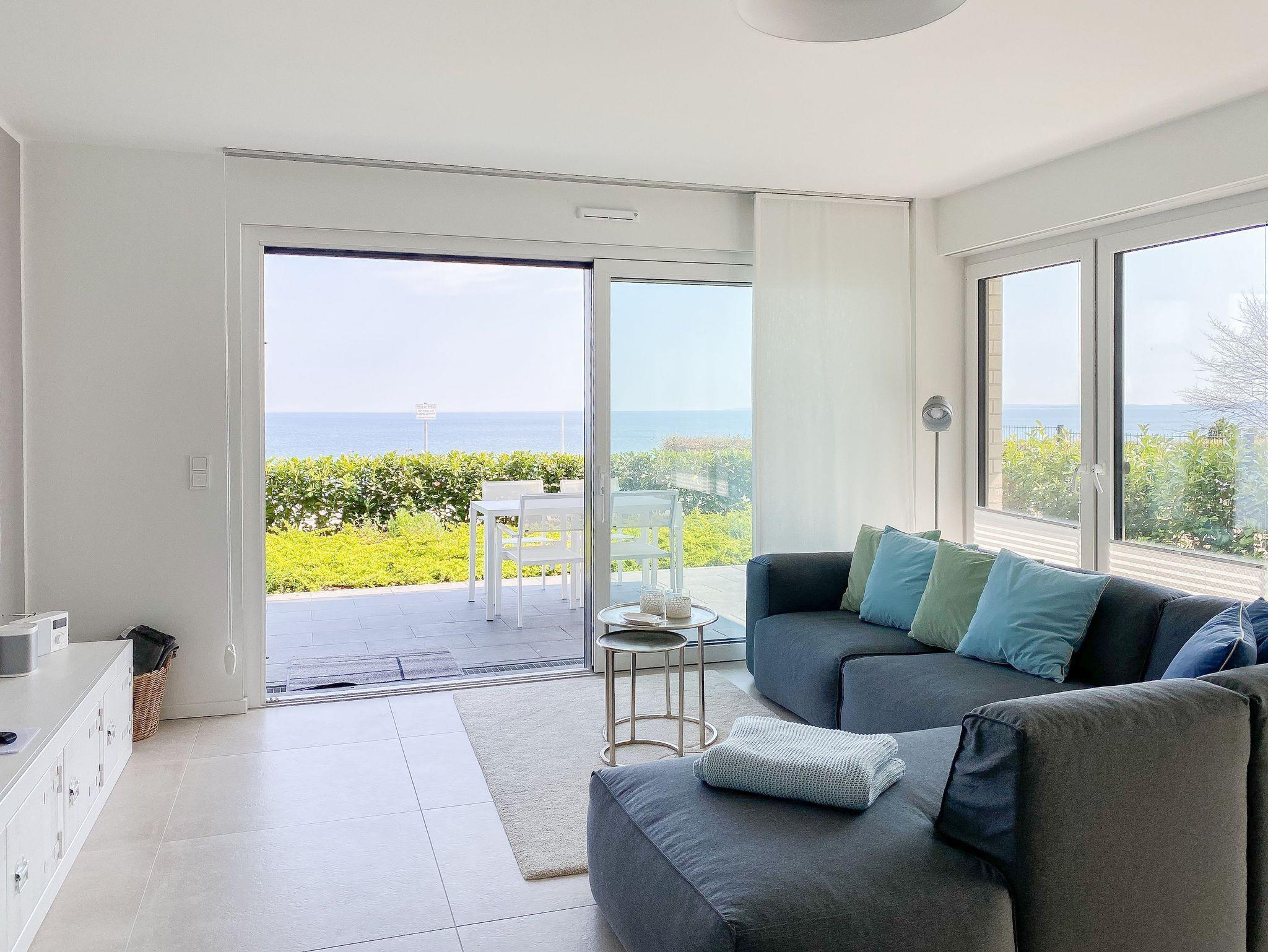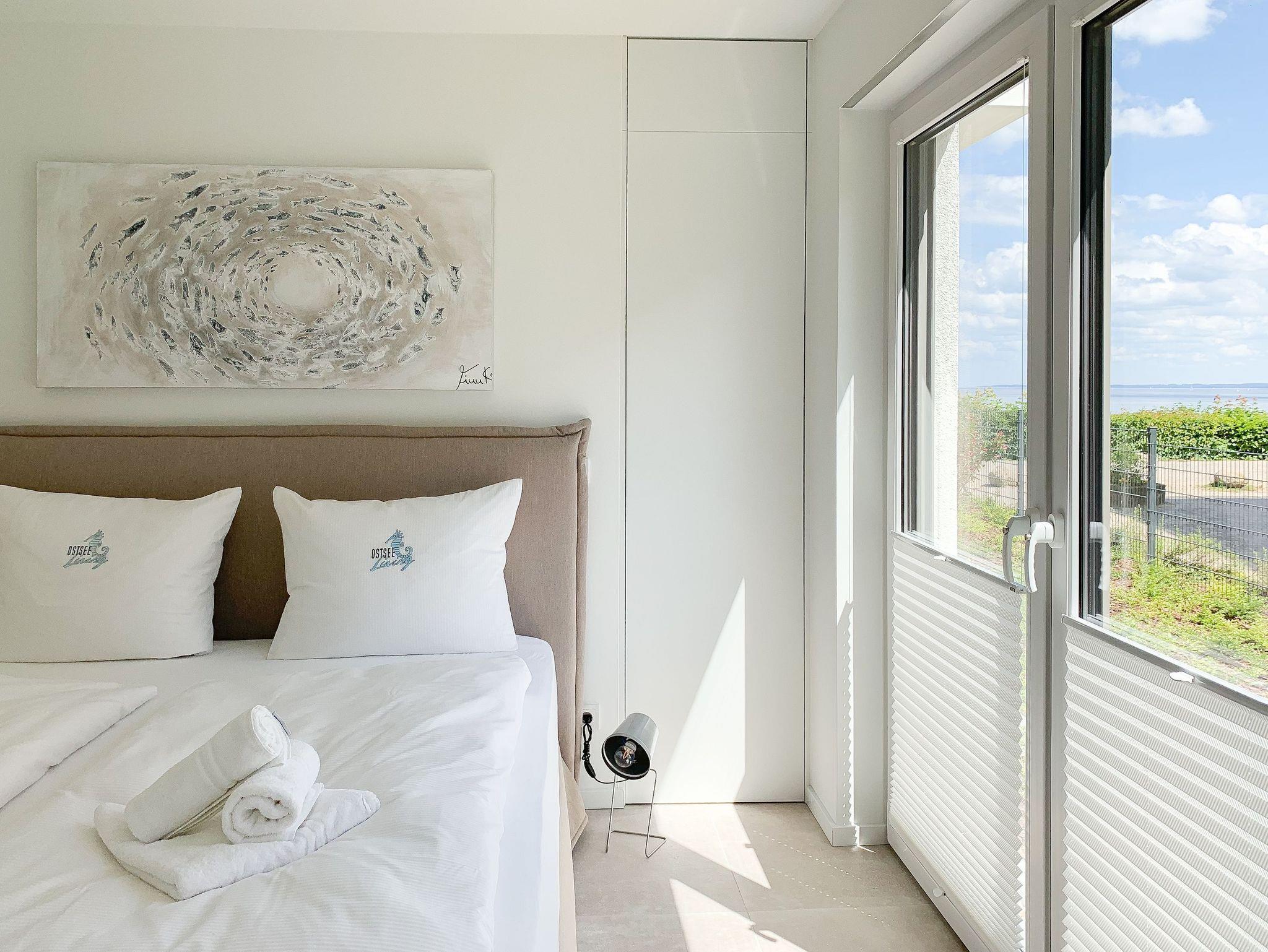 Mit zwei Schlafzimmern und zwei Duschbädern bietet die sehr hochwertig eingerichtete Ferienwohnung ausreichend Raum für vier Personen, um einen entspannten Urlaub zu verleben. Der herrliche Blick auf die Ostsee aus der Wohnung und von der großzügig angelegten Terrasse in Süd Ost Ausrichtung, machen dieses Objekt zu jeder Jahreszeit zu etwas Besonderem .Der großzügige Wohn- Essbereich mit riesigen Fensterflächen und die angrenzende Designküche, in bester Ausstattung mit hochwertigen Markengeräten, bilden den Mittelpunkt der Wohnung. Es stehen zwei TV, ein Sonos Bluetooth Lautsprecher, Radio und WLAN zur Verfügung. Die Wohnung ist mit einer Fußbodenheizung ausgestattet und alle Fenster sind mit elektrischen Außenjalousien versehen. Waschmaschine und Trockner sind im Flur der Wohnung in einem Einbauschrank untergebracht. Ein insgesamt exklusives Objekt mit entsprechendem Ambiente.