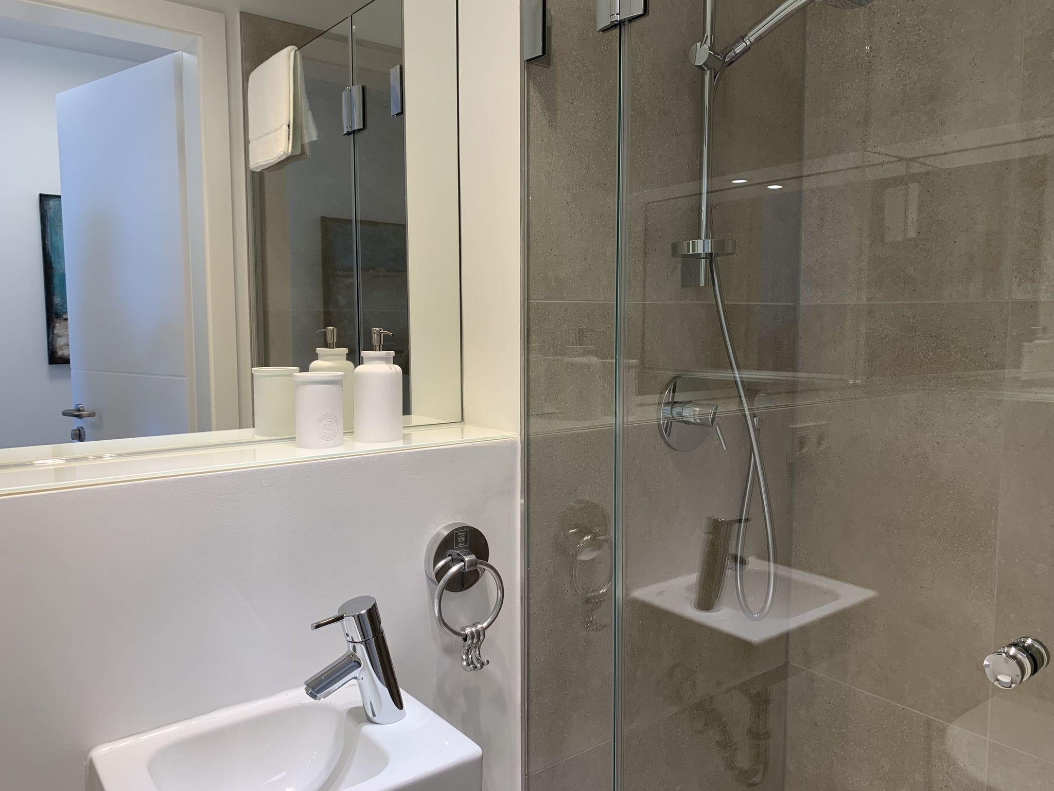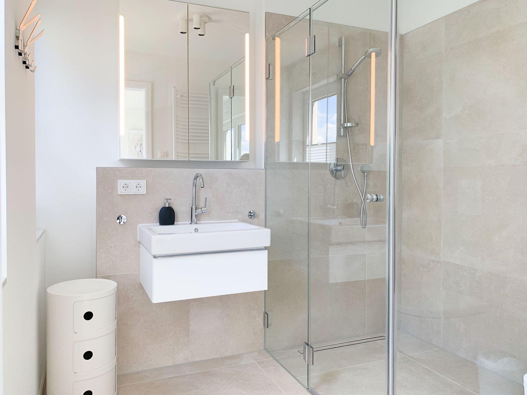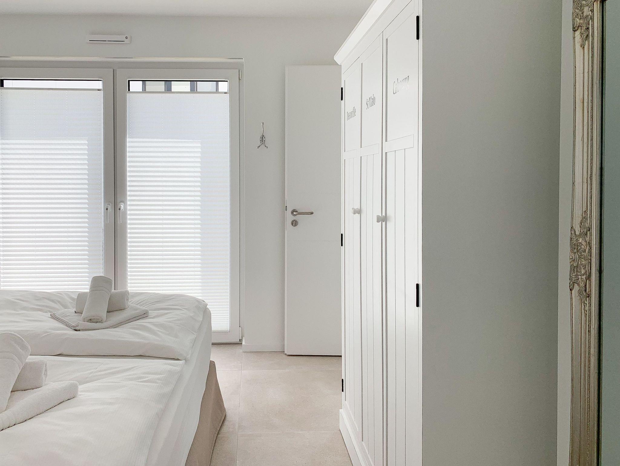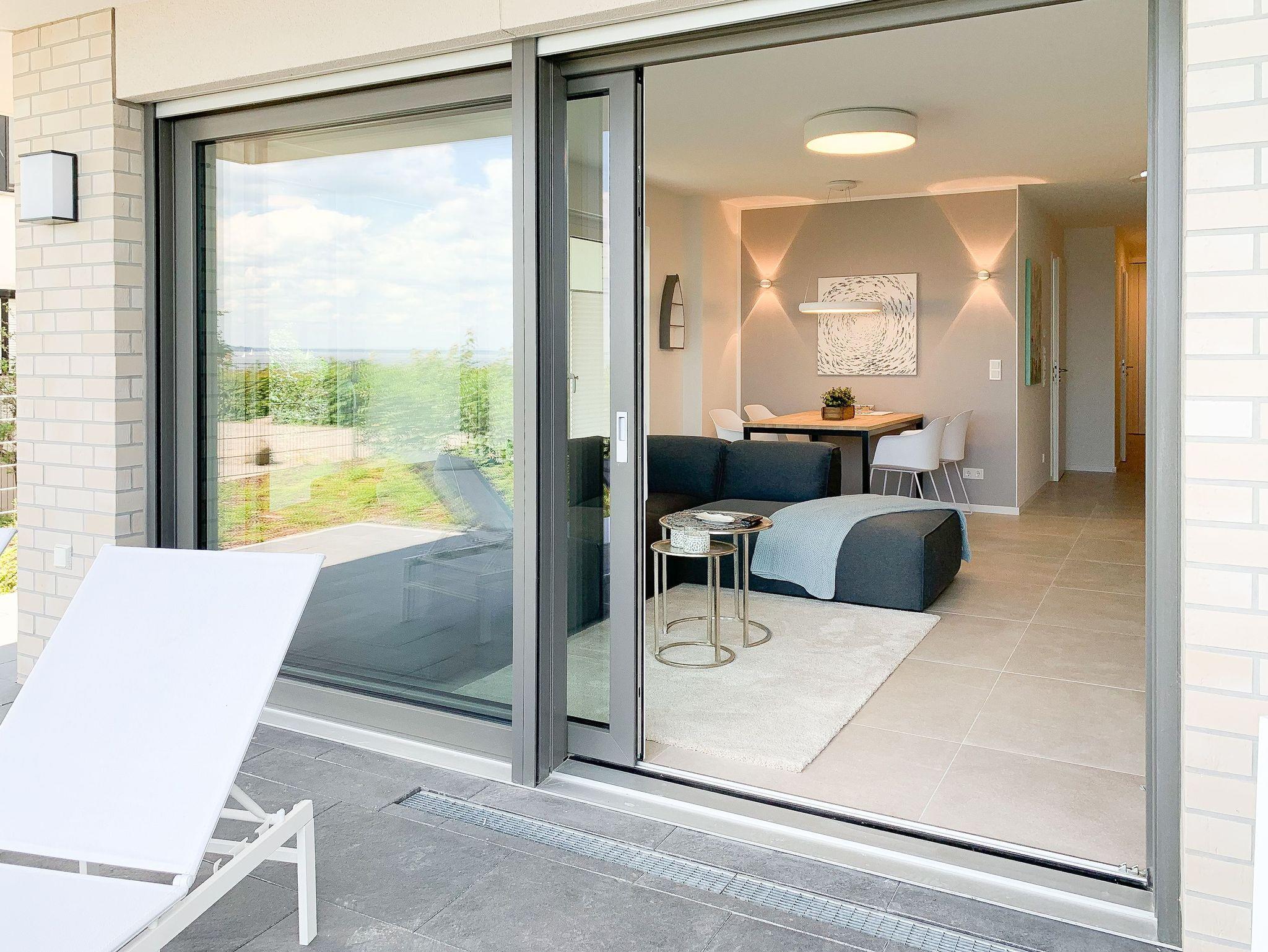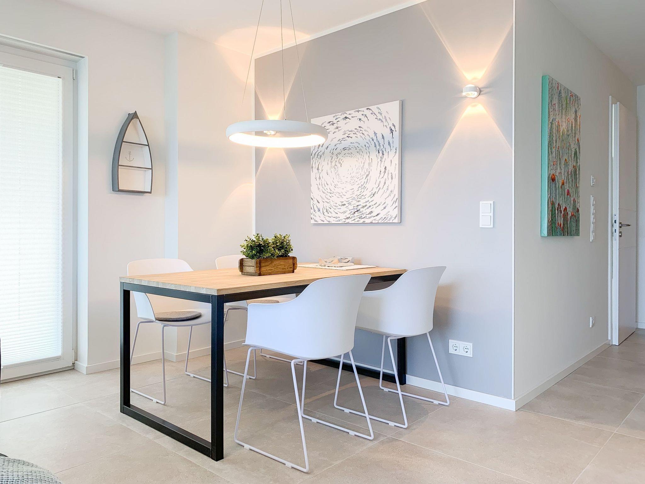 Mit zwei Schlafzimmern und zwei Duschbädern bietet die sehr hochwertig eingerichtete Ferienwohnung ausreichend Raum für vier Personen, um einen entspannten Urlaub zu verleben. Der herrliche Blick auf die Ostsee aus der Wohnung und von der großzügig angelegten Terrasse in Süd Ost Ausrichtung, machen dieses Objekt zu jeder Jahreszeit zu etwas Besonderem .Der großzügige Wohn- Essbereich mit riesigen Fensterflächen und die angrenzende Designküche, in bester Ausstattung mit hochwertigen Markengeräten, bilden den Mittelpunkt der Wohnung. Es stehen zwei TV, ein Sonos Bluetooth Lautsprecher, Radio und WLAN zur Verfügung. Die Wohnung ist mit einer Fußbodenheizung ausgestattet und alle Fenster sind mit elektrischen Außenjalousien versehen. Waschmaschine und Trockner sind im Flur der Wohnung in einem Einbauschrank untergebracht. Ein insgesamt exklusives Objekt mit entsprechendem Ambiente.