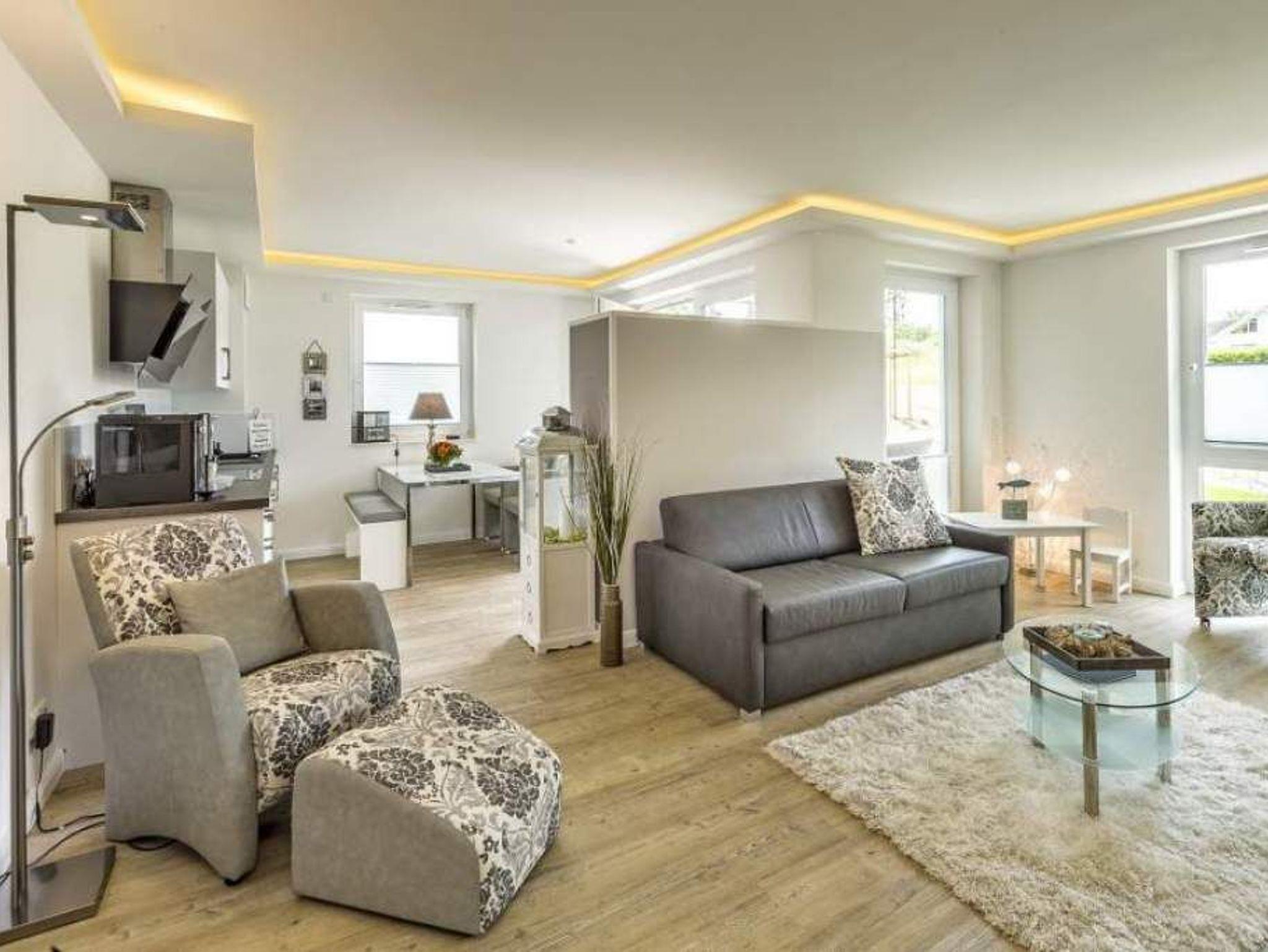 Die Ferienwohnung zum Wohlfühlen bietet Ihnen einen gemütlichen Wohnbereich mit Couch, Sessel und Kinderecke. Zusätzlich befindet sich hier ein bequemes Schrankbett (2,00 x 0,85m) für eine Person. Neben dem Flachbildfernseher und dem DVD-Player steht Ihnen eine Stereoanlage zur Verfügung. Kostenloses WLAN ist selbstverständlich.